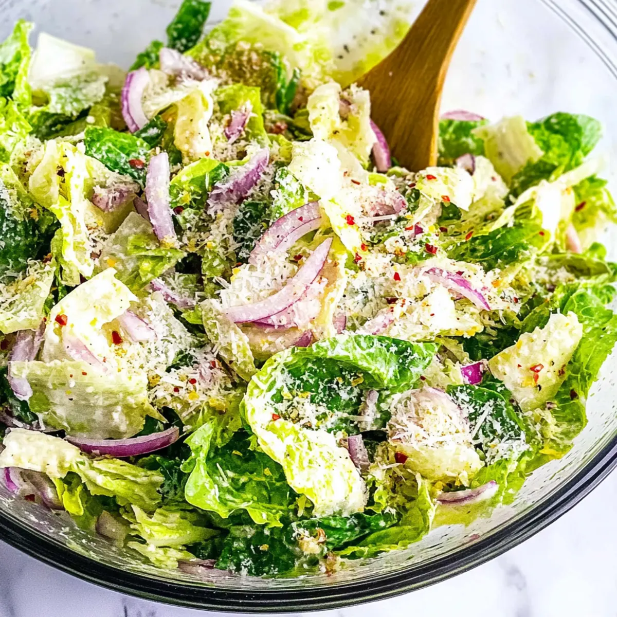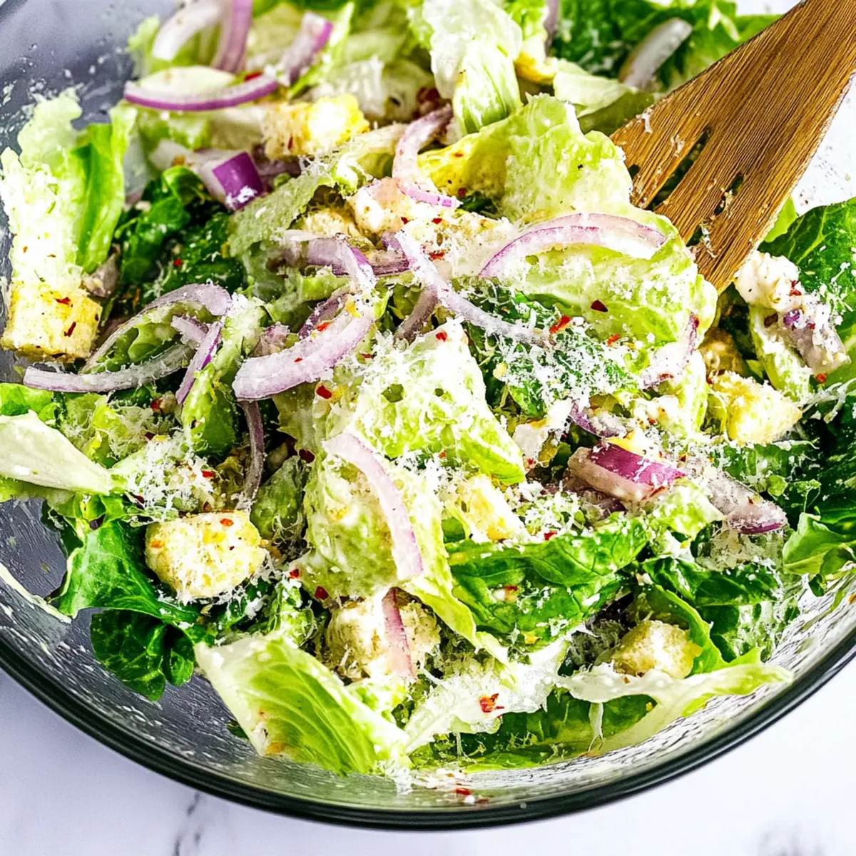 Take a large salad bowl and add 4 cups of chopped fresh romaine lettuce, making sure the leaves are crisp and clean. Next, incorporate 1/2 cup of grated parmesan cheese and 1/4 cup of thinly sliced red onion, creating a colorful blend. If you enjoy a little heat, sprinkle in 1/2 teaspoon of crushed red pepper flakes and gently combine all the ingredients for an even distribution.