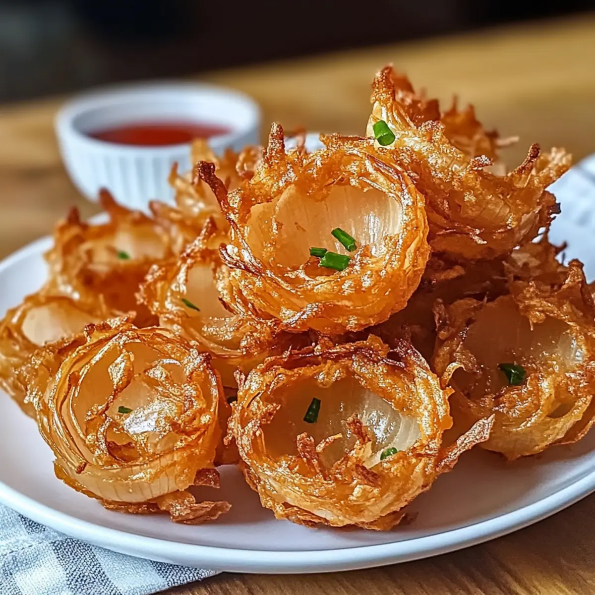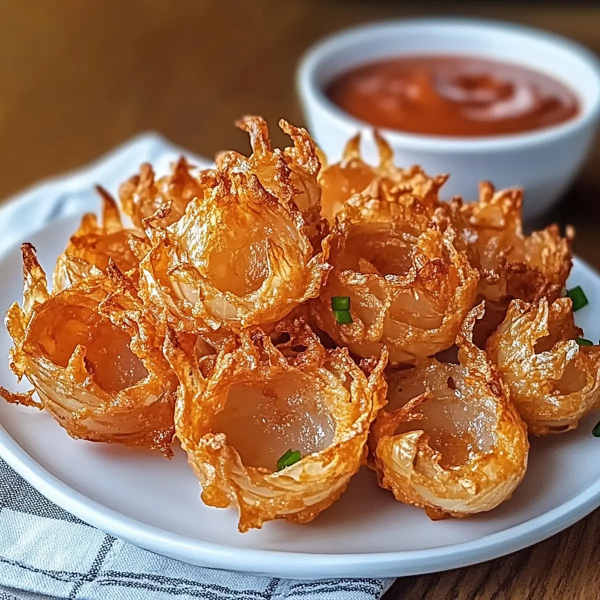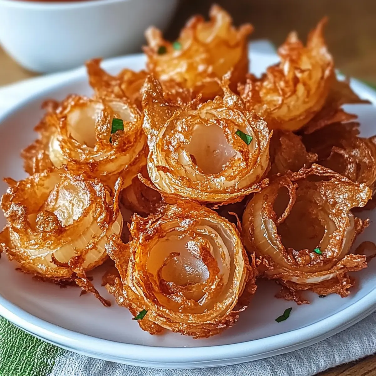 There’s something incredibly satisfying about transforming a humble onion into an impressive appetizer, isn’t there? With my Air Fryer Crispy Mini Blooming Onions, you’ll discover a delightful twist on a classic dish that’s both guilt-free and completely irresistible. Not only do these blooming beauties boast a lovely crunch, but they’re also remarkably easy to whip up, making them a fantastic choice for your next gathering. You can enjoy them as a fun snack or serve them as a unique side to your favorite meals—all with fewer calories than the traditional deep-fried version. Ready to impress your family and friends while indulging in a healthier alternative? Let’s dive into this recipe and enjoy some serious culinary magic! Why are these blooming onions so special? Guilt-Free Delight: These Air Fryer Crispy Mini Blooming Onions offer all the indulgence without the extra calories, making them a perfect choice for health-conscious snackers. Versatile Flavors: Feel free to customize! From spicy cayenne to herbal twists, you can make them your own. Quick and Easy: This recipe is designed for simplicity—whip them up in no time and impress your guests effortlessly. Crowd-Pleasing Appetizer: Whether served at a party or as a side, they’re sure to be a hit with family and friends alike. Pair them with a creamy dipping sauce, or enjoy alongside Crispy Cajun Shrimp with Creamy Sauce for a delightful feast! Air Fryer Crispy Mini Blooming Onions Ingredients For the Batter Buttermilk – Provides moisture for batter adhesion; substitute with milk mixed with lemon juice if needed. Flour – Creates the crispy coating; use gluten-free flour for a gluten-free option. Paprika – Adds color and a mild flavor; consider smoked paprika for extra depth. Garlic Powder – Enhances the savory profile for a richer taste. Onion Powder – Complements the onion flavor, making it more pronounced. Cayenne Pepper – Offers spice; adjust according to your heat preference. Salt & Pepper – Essential for seasoning and balancing the flavors. For the Onions Sweet Onions – Use Vidalia or Walla Walla; they offer a mild, sweet flavor ideal for blooming. To Prepare Cooking Spray/Oil – Assists in achieving a crispy exterior, ensuring those blooming onions come out perfectly golden. With these ingredients in hand, you’re all set to create delightful Air Fryer Crispy Mini Blooming Onions that are sure to impress! Step‑by‑Step Instructions for Air Fryer Crispy Mini Blooming Onions Step 1: Prepare Buttermilk Mixture In a mixing bowl, combine buttermilk or the milk and lemon juice mixture. Let it sit for about 5 minutes to thicken slightly; this will enhance adhesion for the batter. Having the buttermilk ready first ensures your Air Fryer Crispy Mini Blooming Onions have a flavorful base to cling to. Step 2: Prep Onions Peel two medium sweet onions, then carefully cut off the tops and bottoms to create a stable base. Using a sharp knife, make vertical cuts from the top down to form blooming petals—about 12-16 cuts per onion, ensuring not to cut through the base. This step is crucial for achieving the beautiful bloom effect when you cook them. Step 3: Mix Coating In another bowl, whisk together flour, paprika, garlic powder, onion powder, cayenne pepper, salt, and pepper. This marriage of spices will create a robust coating for your mini blooming onions. Ensure that the mixture is well combined, as this will provide an even crust that adds to the delightful crunchiness of the final dish. Step 4: Coat Onions Dip each prepared onion into the buttermilk mixture, letting any excess drip off before transferring to the flour mixture. Coat the onions evenly, ensuring every petal is covered with the seasoned flour. This step is vital for achieving the signature crispy texture of Air Fryer Crispy Mini Blooming Onions, so make sure they are well coated. Step 5: Preheat Air Fryer Preheat your air fryer to 380°F (190°C) for about 5 minutes. This step is essential for ensuring that the onions cook evenly and become delightfully crispy. While the fryer is heating, you can finalize your preparations and get ready to cook these tasty treats. Step 6: Arrange in Basket Place the coated onions in the air fryer basket, being careful not to overcrowd them. Giving each onion some space allows for better air circulation, leading to an even crisp in your Air Fryer Crispy Mini Blooming Onions. Position them upright to maximize the blooming effect. Step 7: Lightly Spray Before beginning the cooking process, lightly spray the tops of the onions with cooking spray or oil. This extra layer will aid in achieving a beautifully golden, crispy exterior. Make sure to coat them evenly for the best results; this will significantly enhance your Air Fryer Crispy Mini Blooming Onions. Step 8: Air Fry Cook the onions in the air fryer for 10-12 minutes. Be sure to shake the basket halfway through to ensure even browning on all sides. Keep an eye on them towards the end; they should be golden brown and crispy. This crucial step is what transforms your onions into a delicious appetizer. Step 9: Make Dipping Sauce While the onions are cooking, mix together mayonnaise, ketchup, horseradish sauce, lemon juice, and any preferred seasonings in a small bowl. This quick and easy dipping sauce will complement your Air Fryer Crispy Mini Blooming Onions perfectly, adding a tangy kick to the final dish. Step 10: Serve Once your blooming onions are perfectly crispy and golden, remove them from the air fryer and serve warm. Pair them with the prepared dipping sauce, and delight in the satisfying crunch and flavor of your homemade Air Fryer Crispy Mini Blooming Onions. Make Ahead Options These Air Fryer Crispy Mini Blooming Onions are perfect for busy home cooks looking to save time without sacrificing flavor! You can prep the onions and coat them in the seasoned batter up to 24 hours in advance, storing them in an airtight container in the refrigerator.