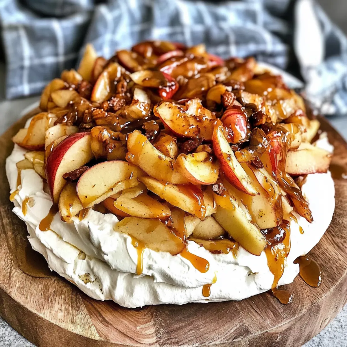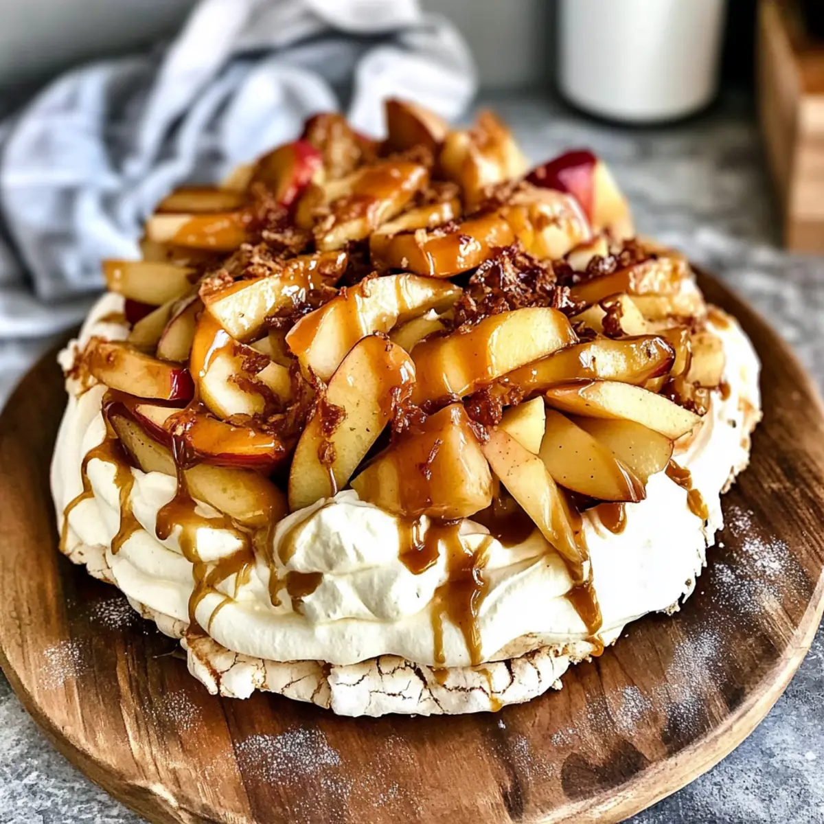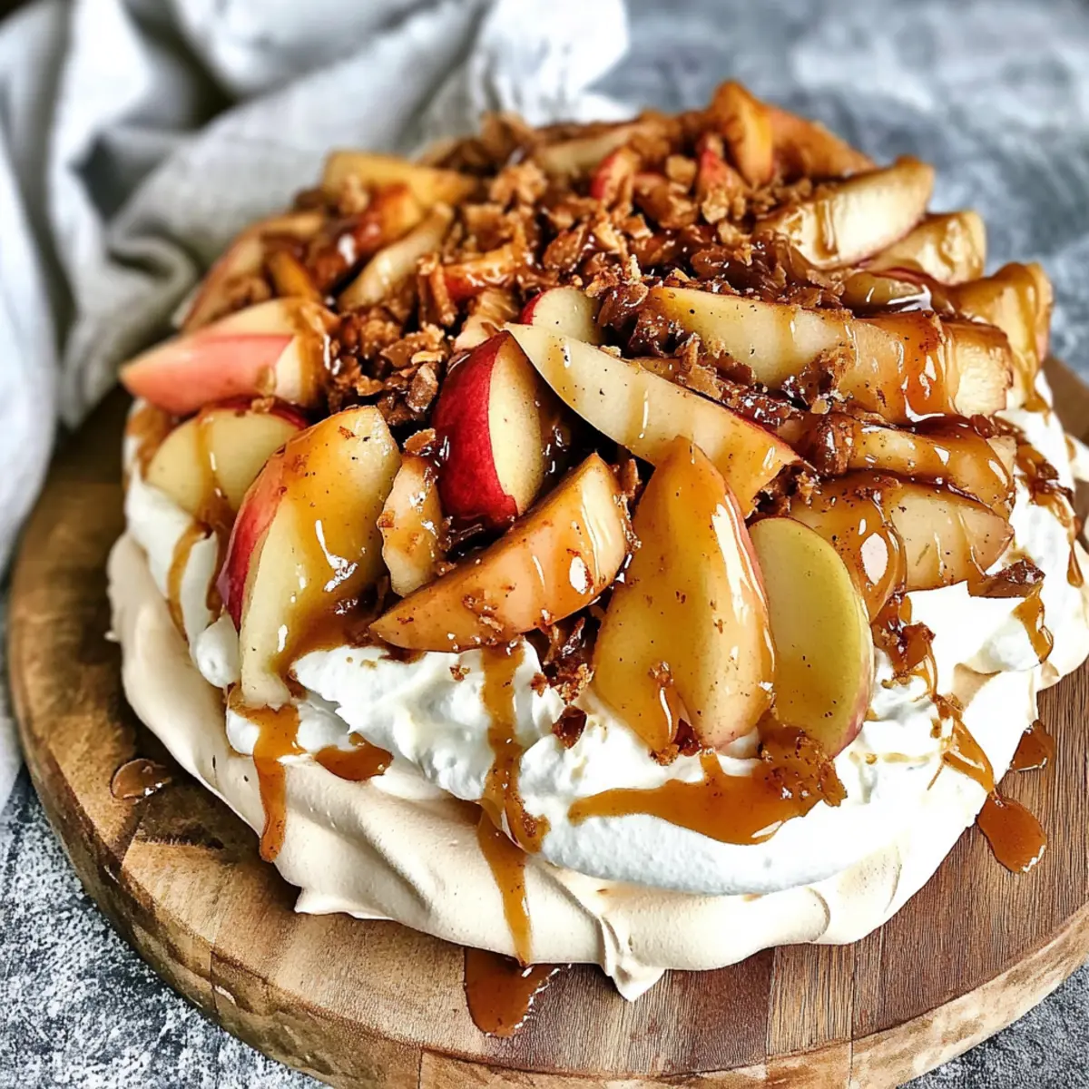 As autumn paints the world in warm hues, there’s a sweetness in the air that calls for celebration. This Autumn Pavlova with Apples, Maple Cream, and Salted Caramel is my go-to dessert that captures the essence of the season. Imagine sinking your spoon into a light, crisp meringue shell cradling fluffy maple-infused cream, followed by tender roasted apples, and a generous drizzle of luscious salted caramel. Not only is this dessert stunning to behold, but it also offers a delightful contrast between textures and flavors that will make your taste buds dance. What’s more, this pavlova can be effortlessly prepared in less than two hours, making it a fantastic option for those cozy gatherings with friends and family. Ready to transform your autumn festivities with this showstopper? Let’s dive into the recipe! Why is Autumn Pavlova a must-try? Delightful Fusion: This Autumn Pavlova combines crispy and chewy—perfect for those who crave texture in their desserts. Seasonal Splendor: Featuring maple cream and roasted apples, this dish truly embraces fall flavors. Eye-catching Presentation: The beautiful layers and toppings make it a stunning centerpiece for any gathering. Quick and Easy: Ready in under two hours, this dessert saves you time without compromising on taste. Versatile Delight: Swap in your favorite fruits or toppings; it’s adaptable to suit any palate. Whether you’re hosting a Friendsgiving or simply enjoying a cozy night in, this pavlova is the sweet treat to impress your guests! Autumn Pavlova Ingredients For the Meringue • Egg Whites – Essential for structure and volume in the meringue; ensure they are yolk-free for perfect peaks. • Confectioner’s Sugar – Sweetens and stabilizes the meringue; regular sugar can work but may alter the texture. • Cornstarch – Helps achieve a firmer texture in the meringue; no alternative necessary. • White Vinegar – Enhances stability of the meringue; lemon juice is a great alternative if you’re in a pinch. • Vanilla Extract – Adds depth of flavor; try almond extract for a delightful twist. For the Roasted Apples • Honeycrisp or Fuji Apples – Provide a perfect sweet-tart balance; feel free to substitute with any firm apple variety. • Butter – Adds richness and aids in caramelizing apples; coconut oil can substitute for a dairy-free version. • Pumpkin Pie Spice – Infuses seasonal flavor; if unavailable, a mix of cinnamon and nutmeg can do the trick. • Light Brown Sugar – Sweetens and caramelizes the roasted apples; granulated sugar can also be used if needed. For the Maple Cream • Heavy Cream – Whipped into a luxurious topping for the pavlova; use coconut cream for a dairy-free alternative. • Pure Maple Syrup – Sweetens the whipped cream with authentic flavor; agave syrup can be a suitable sundry substitute. • Salt – A pinch balances the sweetness; no alternative necessary here. For the Toppings • Salted Caramel Sauce – Adds a rich flavor contrast; feel free to use store-bought or your homemade version. • Chopped Pecans – Offers a delightful crunch on top; walnuts can replace them or omit for a nut-free version. This Autumn Pavlova with Apples, Maple Cream, and Salted Caramel is not just a treat for your taste buds, but a feast for the eyes as well! Enjoy crafting this delightful dessert! Step‑by‑Step Instructions for Autumn Pavlova with Apples, Maple Cream, and Salted Caramel Step 1: Roast the Apples Preheat your oven to 350°F (175°C) and prepare a baking dish. In a mixing bowl, combine melted butter, pumpkin pie spice, and light brown sugar. Toss sliced Honeycrisp or Fuji apples in this mixture until fully coated, then spread them evenly in the prepared dish. Roast for 30 minutes, stirring halfway through, until apples are tender and caramelized. Once done, cool the apples to room temperature. Step 2: Prepare the Meringue Lower the oven temperature to 280°F (140°C) and line a baking sheet with parchment paper. In a stand mixer, whip 4 large egg whites on high speed until stiff peaks form. Gradually add 1 cup of confectioner’s sugar while mixing, ensuring the sugar dissolves completely. Once mixed, gently fold in 1 teaspoon of cornstarch, 1 teaspoon of white vinegar, and 1 teaspoon of vanilla extract. Shape the meringue into a bowl-like structure on the parchment, then bake for 75 to 90 minutes, until firm and dry. Step 3: Make the Maple Cream While the meringue is baking, begin making the maple cream. In a separate bowl, whip 12 ounces of heavy cream until soft peaks start to form. Gradually drizzle in ¼ cup of pure maple syrup along with a pinch of salt as you continue to whip. Keep mixing until the cream reaches stiff peaks, ensuring it remains light and airy to complement the crispy meringue of the Autumn Pavlova. Step 4: Assemble the Pavlova Once the meringue has cooled completely, it’s assembly time for your Autumn Pavlova. Carefully spread the whipped maple cream over the meringue shell, creating a luscious layer. Next, evenly distribute the cooled roasted apples on top of the cream. Drizzle with salted caramel sauce, allowing it to pool beautifully over the apples, and finish by sprinkling chopped pecans for an added crunch. Serve immediately to enjoy the delightful contrast in textures! Autumn Pavlova with Apples Variations Embrace your culinary creativity with these delicious tweaks that enhance the flavor and texture of your pavlova! Roasted Pears: Swap apples for caramelized pears for a softer, sweeter fruit option that still captures autumn’s essence. Chocolate Drizzle: Instead of salted caramel, drizzle melted chocolate over the top for a rich and decadent twist that’s sure to please chocoholics. Berry Blend: Use mixed berries like raspberries and blueberries with a berry-infused whipped cream for a refreshing take that’s bright and tangy. Nuts Galore: Experiment with different nuts like walnuts or hazelnuts for varying flavors and textures; both 