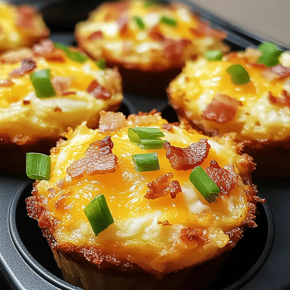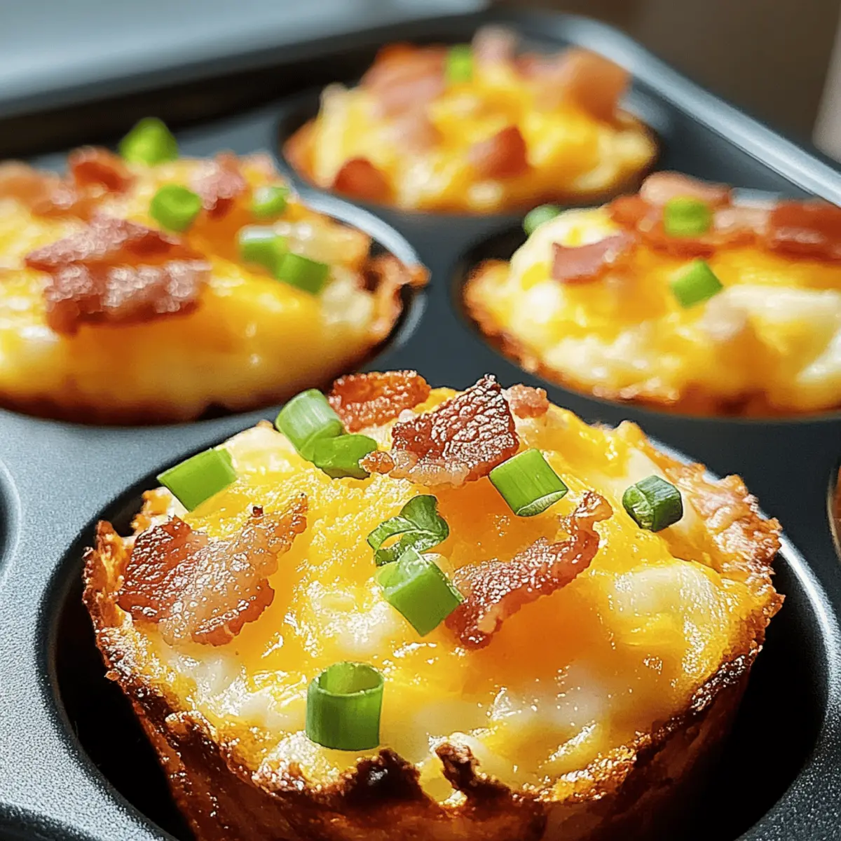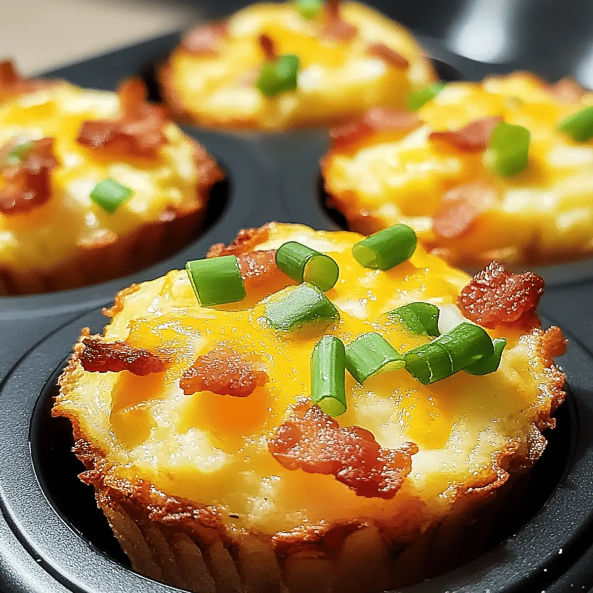 The aroma of sizzling bacon wafts through the kitchen, pulling you out of bed and urging you to start your day on a flavorful note. These Loaded Bacon and Egg Hash Brown Muffins are not only a tasty twist on your breakfast routine but also bring a warm, comforting vibe to your mornings. With a crispy hash brown base cradling fluffy eggs and melty cheddar, this recipe is perfect for those busy days when you need a wholesome meal in minutes. Best of all, they’re easily customizable—whether you prefer vegetarian options or gluten-free alternatives, there’s something here for everyone. Ready to transform your breakfast game and have a bite-sized delight waiting for you? Let’s dive in! Why are Bacon and Egg Muffins a Must-Try? Convenient Meal Prep: These Bacon and Egg Hash Brown Muffins are the perfect solution for busy mornings—make them in advance and enjoy all week long! Crispy and Creamy: Experience the delightful contrast of a crispy hash brown base paired with fluffy eggs and melted cheese that’s sure to satisfy all your cravings. Customizable Delight: Whether you’re a meat lover or prefer plant-based ingredients, these muffins can be easily tailored with your favorite add-ins, such as sautéed bell peppers or spinach. Crowd-Pleasing Flavor: Serve them during brunch gatherings or as a hearty family breakfast, and watch them disappear in no time—it’s a guaranteed hit! Family-Friendly: Kids and adults alike will love these muffins, making it a fantastic option for the whole family. Consider pairing them with a yogurt parfait for an extra special meal! Bacon and Egg Hash Brown Muffin Ingredients For the Muffin Base • Frozen Shredded Hash Browns – Essential for that crispy texture; ensure they are thawed and drained well. • Shredded Cheddar Cheese – Adds creaminess and a rich cheese flavor; substitute with dairy-free cheese to make it vegan. For the Filling • Cooked and Crumbled Bacon – Infuses savory flavor and crunchy goodness; can be swapped with turkey bacon or omitted for a vegetarian option. • Large Eggs – Provides structure and protein; for a lighter option, use egg whites instead. • Milk – Adds a hint of creaminess to the egg mixture; use non-dairy milk for a vegan twist. • Chopped Green Onions – Gives freshness and a pop of color; swap with finely chopped chives based on your taste. • Salt and Pepper – Key seasonings that enhance flavor; adjust according to dietary needs or preferences. For Baking • Cooking Spray – Ensures easy muffin removal; generously apply to prevent sticking. Step‑by‑Step Instructions for Bacon and Egg Hash Brown Muffins Step 1: Preheat the Oven Begin by preheating your oven to 375°F (190°C). While the oven heats up, take a moment to grease a 12-cup muffin tin generously with cooking spray. This step ensures that your delicious Bacon and Egg Hash Brown Muffins will pop out easily after baking, allowing you to savor every last bite without any sticking. Step 2: Prepare the Hash Brown Base In a large mixing bowl, combine the thawed hash browns with 1 cup of shredded cheddar cheese and half of the crumbled bacon. Mix these ingredients thoroughly until well incorporated. This mixture will form the crispy base of your muffins. Then, press this combination firmly into the bottom and sides of each muffin cup to create a strong structure. Step 3: Bake the Hash Brown Cups Place the muffin tin in the preheated oven and bake for 15 minutes. Keep an eye on them, looking for golden, crispy edges, which will tell you that the hash brown base is ready. Once they achieve that perfect hue, remove the muffin tin from the oven, giving the hash brown cups a moment to cool slightly. Step 4: Whisk the Egg Mixture While your hash brown cups are cooling, take a whisk and beat together the large eggs, milk, salt, pepper, and chopped green onions in a separate bowl. Make sure the mixture is well combined; it should have a smooth, creamy texture. This egg mixture will fill your delightful hash brown bases and add a fluffy goodness to the Bacon and Egg Hash Brown Muffins. Step 5: Fill the Hash Brown Cups Carefully fill each prepared hash brown cup with the egg mixture, pouring until each is about ¾ full. Be cautious not to overfill them, as the eggs will expand while cooking. The combination of the savory egg and the crispy hash brown will create an unforgettable flavor experience in each muffin. Step 6: Add Toppings and Bake Again To finish off your muffins, sprinkle the remaining shredded cheddar cheese and crumbled bacon evenly over the top of each filled cup. This step adds layers of flavor and makes your Bacon and Egg Hash Brown Muffins even more indulgent. Return the muffin tin to the oven and bake for an additional 12-15 minutes, or until the egg is set and the tops are golden. Step 7: Cool and Serve Once baked, remove the muffin tin from the oven and allow the Bacon and Egg Hash Brown Muffins to cool slightly for about 5 minutes. This cooling period will make them easier to remove. Afterward, gently lift each muffin from the tin and transfer to a serving platter. Serve warm and enjoy the delightful flavors together! Make Ahead Options These Bacon and Egg Hash Brown Muffins are a fantastic choice for meal prep, allowing you to savor delicious breakfasts without the morning rush! You can prepare the hash brown base and pre-fill the muffin cups with the egg mixture up to 24 hours in advance. To maintain quality, simply cover the muffin tin with plastic wrap and refrigerate. When you’re ready to bake, just add the cheese and bacon on top and pop them in a preheated oven for 12-15 minutes. This makes for easy, no-fuss breakfasts throughout the week—just as tasty and fluffy as when made fresh! Expert Tips for Bacon and Egg Hash Brown Muffins Thaw Thoroughly: Ensure hash browns are completely thawed and excess moisture is drained; soggy bases make the muffins less appealing. Optimal Greasing: Generously spraying the muffin tin