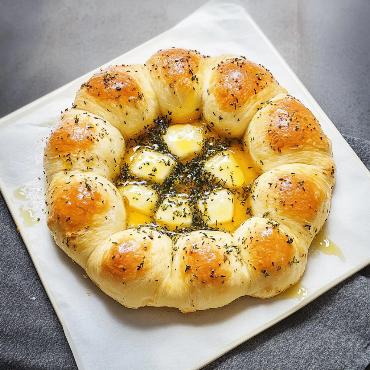 Melt the unsalted butter in a small saucepan over low heat. Once melted, remove it from the heat and stir in the finely chopped flat-leaf parsley, rosemary, thyme, lemon zest, crushed red pepper flakes, and kosher salt. This fragrant herb mixture will infuse your wreath with mouthwatering flavor, ensuring every bite of the Baked Brie Wreath is a taste sensation.