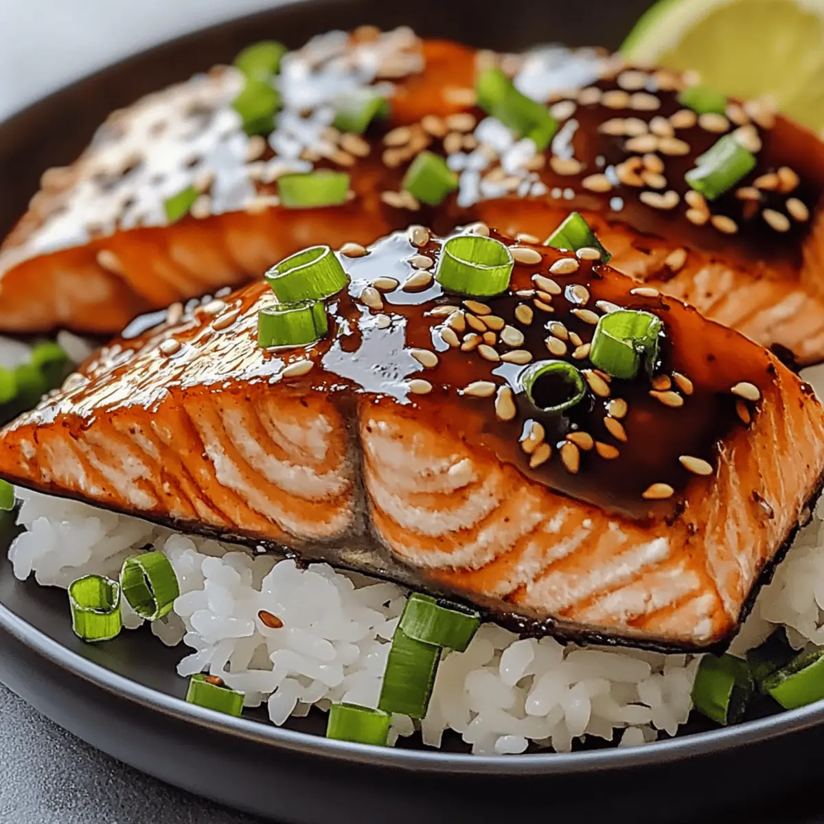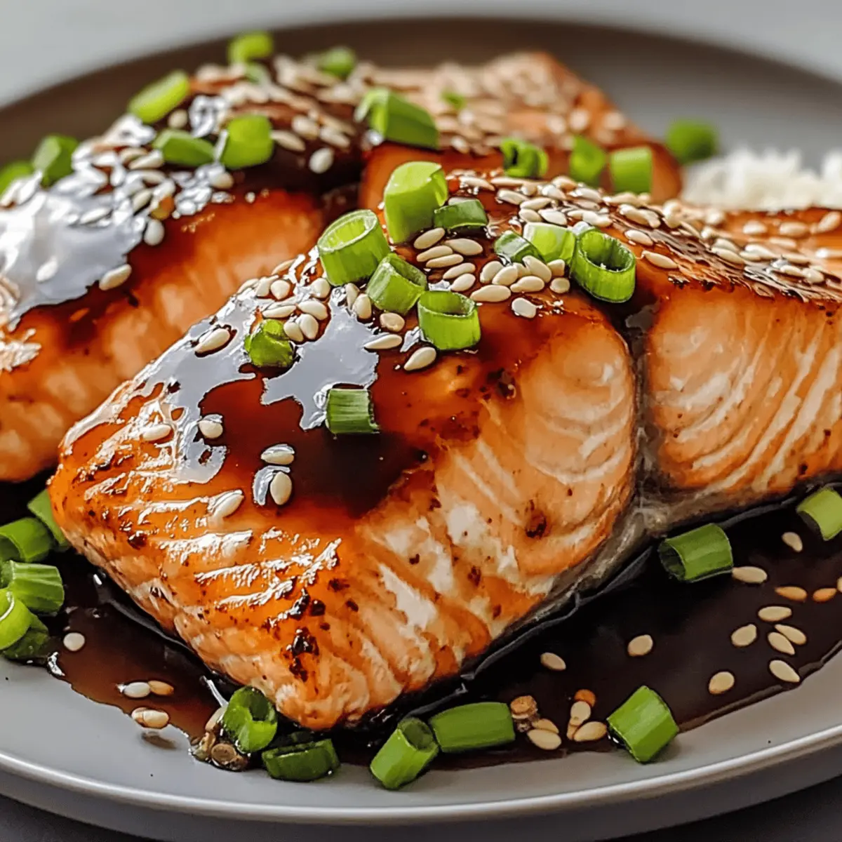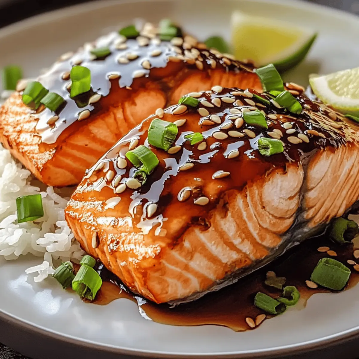 As I pulled the warm, honey-glazed Baked Teriyaki Salmon from the oven, the air filled with a mouthwatering aroma that instantly conquered my thoughts of takeout. This 30-minute delight is not only a quick and easy weeknight meal but also brings a burst of joy to the dinner table, perfect for families or busy professionals. With its tender salmon fillets smothered in a sweet and savory teriyaki sauce, this dish offers a comforting escape from the ordinary. Plus, it’s a gluten-free option for those needing dietary alternatives. Ready to make mealtime a little more exciting? Let’s dive into this recipe together! Why is this recipe a must-try? Quick and Easy: In just 30 minutes, you can serve a flavorful dish that rivals your favorite restaurant meals. Heavenly Glaze: The sweet and savory teriyaki sauce, combined with honey and garlic, creates a luscious coating that will have everyone asking for seconds. Healthy and Nutritious: Packed with omega-3 fatty acids, this salmon dish is not only delicious but also a wise choice for health-conscious eaters. Versatile Pairing: Serve it with steamed jasmine rice or colorful stir-fried vegetables for a complete meal, making it a fantastic option for any weeknight dinner. Gluten-Free Option: Easily adapt this recipe with gluten-free substitutes, allowing everyone at the table to enjoy without worry, just like in our Honey Sriracha Salmon dish. With so many reasons to love it, this Baked Teriyaki Salmon is bound to become a staple in your home cooking repertoire! Baked Teriyaki Salmon Ingredients • Get ready to create this delightful dish! For the Salmon Salmon Fillets – Choose the freshest fillets for the best flavor and texture. For the Marinade Teriyaki Sauce – Adds the dish’s signature sweet and savory flavor; use gluten-free soy sauce for a gluten-free option. Honey – Enhances the sweetness and creates a glossy glaze; maple syrup is a perfect alternative. Soy Sauce – Boosts umami flavor; tamari works well for a gluten-free option. Garlic (minced) – Adds aromatic depth; fresh garlic is recommended for a stronger flavor. Ginger (grated) – Provides warmth and spice; always opt for fresh ginger for better taste. Sesame Oil – Contributes a nutty aroma; can be omitted for a lighter profile. Black Pepper – Adds a subtle heat to the marinade; adjust to your personal taste. For Garnish Sesame Seeds – Optional garnish that gives a delightful crunch; feel free to skip if you prefer. Green Onions (chopped) – Adds freshness and color as an optional garnish. This Baked Teriyaki Salmon recipe is not only simple but also gratifying, making any weeknight dinner feel special! Step‑by‑Step Instructions for Baked Teriyaki Salmon Step 1: Preheat the Oven Begin by preheating your oven to 400°F (200°C). This high temperature is essential for achieving the perfect caramelization on your Baked Teriyaki Salmon. While the oven heats up, grab a medium-sized mixing bowl to prepare your marinade. The warm air will create a lovely aroma that fills your kitchen with anticipation. Step 2: Prepare the Marinade In the mixing bowl, whisk together the teriyaki sauce, honey, soy sauce, minced garlic, grated ginger, sesame oil, and a dash of black pepper until smooth and well combined. The mixture should be glossy and fragrant, signaling that all flavors are blending beautifully. This delightful marinade will enhance the salmon’s natural flavor while adding that signature sweet and savory taste. Step 3: Marinate the Salmon Place the salmon fillets in a shallow baking dish, making sure they are skin-side down for even cooking. Pour the prepared marinade over the fillets, ensuring they are thoroughly coated. Allow the salmon to marinate for at least 15 minutes—this will infuse all those delicious teriyaki flavors into the fish. If you have extra time, you can let it sit for up to 30 minutes for an even bolder taste. Step 4: Bake the Salmon Once marinated, carefully transfer the baking dish to the preheated oven. Bake the salmon for about 15 minutes, or until the fish turns opaque and flakes easily with a fork. The teriyaki glaze should be bubbling slightly, indicating that it has caramelized beautifully. Keep an eye on it to avoid overcooking; the salmon should remain moist and tender. Step 5: Garnish and Serve After baking, remove the dish from the oven and let the Baked Teriyaki Salmon rest for a few minutes. You can then sprinkle sesame seeds and chopped green onions over the top for added crunch and color. This final touch elevates the dish’s presentation, making it inviting for your family or guests. Serve it hot alongside steamed rice and vibrant vegetables for a complete meal. Step 6: Enjoy Your Meal As you sit down to enjoy your creation, take a moment to appreciate the enticing aroma that fills the air. This Baked Teriyaki Salmon is a delightful showcase of flavors, seamlessly balanced to provide a quick yet satisfying dinner option. With each bite, you’ll savor the glossy teriyaki glaze harmonizing perfectly with the flaky salmon, making it a dish everyone will remember! What to Serve with Baked Teriyaki Salmon Elevate your dinner experience by pairing this flavorful dish with delightful sides that complement its sweet and savory notes. Steamed Jasmine Rice: The fluffy rice absorbs the teriyaki glaze beautifully, making every bite a harmonious blend of flavors. Stir-Fried Vegetables: Bright, colorful veggies provide a crunchy contrast to the tender salmon, adding freshness to your meal. Add a hint of garlic for extra aroma! Cucumber Salad: A refreshing salad with a tangy dressing cleanses the palate, balancing the richness of the salmon and enhancing your dining experience. Quinoa Pilaf: This nutritious grain mixes well with herbs and spices and is an excellent gluten-free option that complements the main dish. Miso Soup: A warm, umami-rich soup pairs wonderfully with salmon, offering comforting flavors that transport you straight to a 
