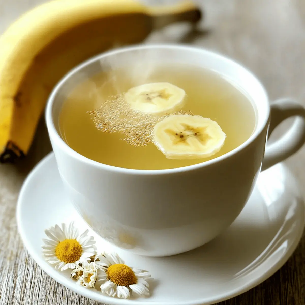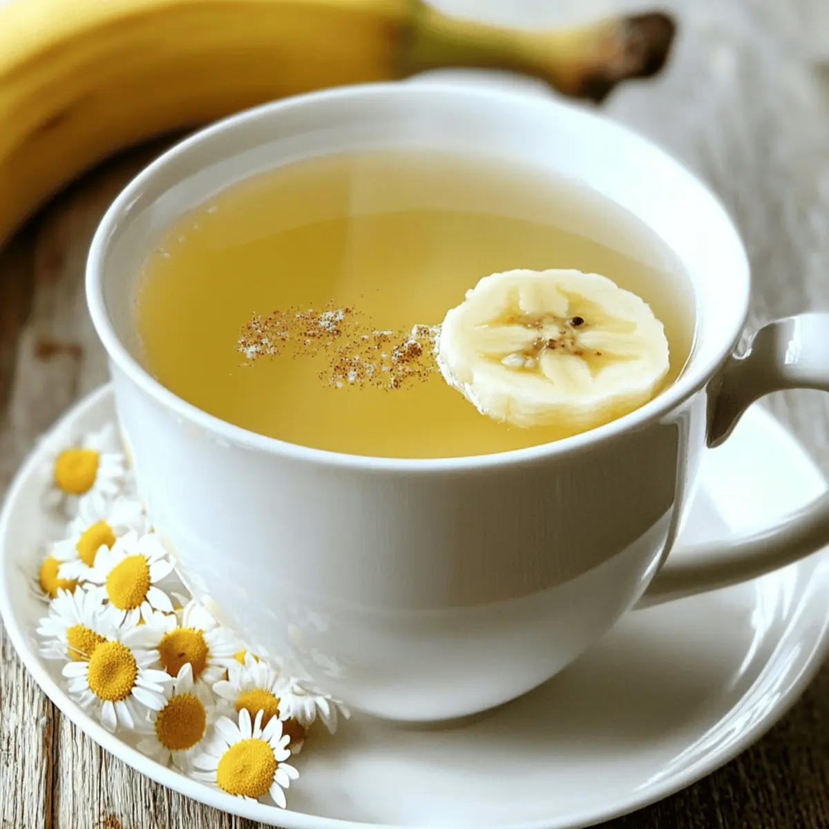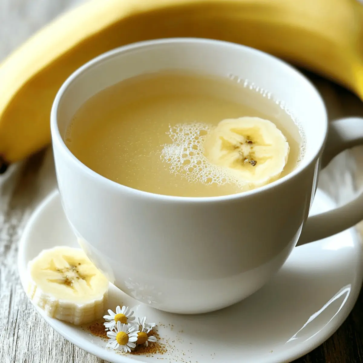 As the sun sets and the day begins to fade, there’s nothing quite like a comforting cup of tea to soothe the soul. Enter Banana Chamomile Tea—an enchanting blend that combines the natural sweetness of ripe bananas with the delicate floral notes of chamomile. This delightful herbal tea isn’t just a quick fix; it’s a warm embrace in a mug that helps you wind down after a hectic day. With a few simple ingredients, this soothing beverage becomes your go-to sleep aid, making it an easy addition to your nighttime routine. Want to switch things up? Feel free to explore optional flavor enhancers like vanilla or a sprinkle of cinnamon—each sip can be uniquely yours. Ready to brew a cup of tranquility? Let’s dive into this cozy recipe! Why Is Banana Chamomile Tea So Special? Comforting and Calming: This tea combines the soothing qualities of chamomile with the natural sweetness of banana, creating a drink that not only relaxes but also delights the senses. Quick and Easy: With just a few simple ingredients and minimal prep time, you can brew a cup of tranquility after a long day. Versatile Options: Whether you want to enhance your tea with honey, vanilla, or even a dash of cinnamon, it’s easy to customize each cup to your taste. Perfect for Any Occasion: This herbal tea isn’t just for bedtime; it’s an excellent choice for cozy gatherings or as a warming treat on chilly evenings. Health Benefits Galore: Packed with potassium and magnesium, this tea can help relax your muscles and promote better sleep, making it a fantastic addition to your evening routine. If you love creative beverages, consider trying out some other delightful options like Cottage Cheese Banana or Banana Oatmeal Pancakes to enhance your banana experience! Banana Chamomile Tea Ingredients For the Base • Banana – provides natural sweetness and is packed with magnesium and potassium that help relax muscles; ripe bananas are preferred for maximum sweetness. • Dried Chamomile Flowers – offers calming properties, traditionally used as a gentle sedative; can substitute with chamomile tea bags. • Filtered Water – acts as the base for the tea, crucial for the infusion process. For Sweetening • Raw Honey (optional) – adds additional sweetness, perfect for those who enjoy a sweeter taste; substitute with maple syrup or agave nectar for vegan options. • Vanilla Extract (optional) – enhances the flavor with a subtle sweetness; a pinch adds a dessert-like quality to the tea. For Flavor Enhancement • Ground Cinnamon (optional) – provides warmth and depth to the flavor profile. • Fresh Ginger (optional) – adds a hint of spice, beneficial for digestive health. • Coconut Milk (optional) – can be added for creaminess, enhancing the overall texture. Brew yourself a calming cup of this Banana Chamomile Tea and let the soothing flavors whisk you away to a peaceful night! Step‑by‑Step Instructions for Banana Chamomile Tea Step 1: Boil Water Begin by heating 2 cups of filtered water in a medium saucepan over medium-high heat. Bring the water to a rolling boil, watching for small bubbles to form on the surface, which typically takes about 5–7 minutes, depending on your stove. Be patient, as this is the crucial base for your soothing Banana Chamomile Tea. Step 2: Simmer Banana Once the water is boiling, slice 1 medium ripe banana into thin rounds and carefully add them to the pot. Reduce the heat to low and let the banana simmer for about 5 minutes. You’ll notice the water will take on a light yellow hue as the sweetness from the banana infuses, filling the air with a delightful aroma. Step 3: Add Chamomile After the banana has simmered, it’s time to introduce the chamomile. Stir in 2 tablespoons of dried chamomile flowers (or 2 chamomile tea bags) into the pot. Keep the heat low and allow the flavors to meld for another 5 minutes, covering the pot with a lid to trap the steam and enhance the infusion process. Step 4: Strain the Mixture Once the tea has steeped, remove the pot from the heat. Carefully pour the mixture through a fine-mesh strainer into two mugs, discarding the banana slices and chamomile flowers. Notice the beautiful golden color of your freshly brewed Banana Chamomile Tea, signaling it’s ready for the next step. Step 5: Sweeten Your Tea Now that your tea is ready, personalize it to your taste! Add a spoonful of raw honey or your chosen sweetener, stirring gently to dissolve completely. If desired, incorporate optional flavor enhancers like a splash of vanilla extract or a sprinkle of ground cinnamon for an added depth of flavor. Step 6: Enjoy Warm Serve the Banana Chamomile Tea warm, taking a moment to embrace the soothing aroma before sipping. This comforting beverage is perfect for unwinding after a long day, helping you ease into a peaceful night. Sit back, relax, and let the calming flavors wrap you in tranquility. Expert Tips for the Best Banana Chamomile Tea Perfect Temperature: Let the boiled water cool for 2-3 minutes before adding chamomile. This prevents bitterness, ensuring a smoother taste in your banana chamomile tea. Banana Prep: For a burst of flavor, slice bananas a day in advance and store them in the fridge. This makes your preparation quick and easy! Flavor Experimentation: Don’t hesitate to try different sweeteners like agave nectar or maple syrup for a vegan twist, allowing your banana chamomile tea to shine. Steeping Time: Ensure you steep chamomile for the full 5 minutes to capture its calming properties; this enhances the soothing effect of your tea. Health Alert: Always consult your doctor regarding chamomile’s interactions with medications. It can enhance sedation and might not be suitable for everyone. Make Ahead Options These delightful cups of Banana Chamomile Tea are perfect for meal prep enthusiasts seeking a soothing, hassle-free solution for busy weeknights! You can slice the ripe banana up to 24 hours in advance and store it in the refriger