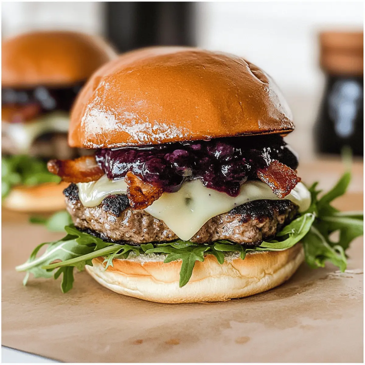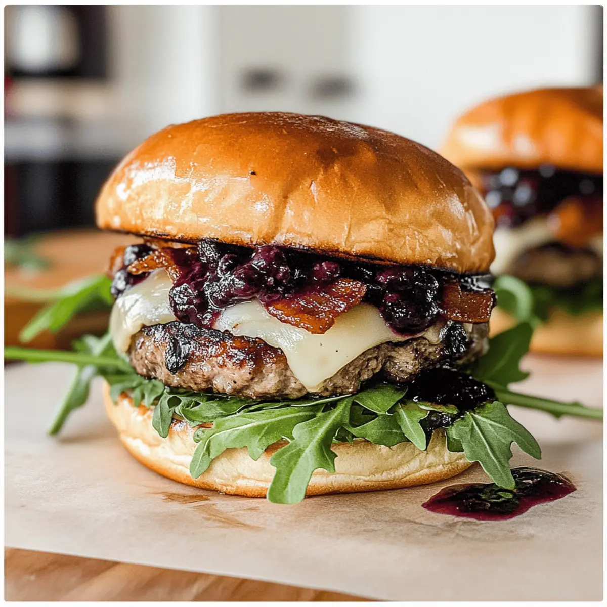 Start with toasted brioche buns, layering a generous handful of arugula on the bottom half. Place the cooked burger patty with melted cheese on top, followed by a spoonful of the blueberry sauce and crispy bacon strips. Spread the Basil Garlic Aioli on the top bun, then close the burger and prepare to serve, allowing the vibrant layers to shine.