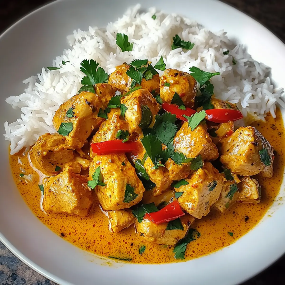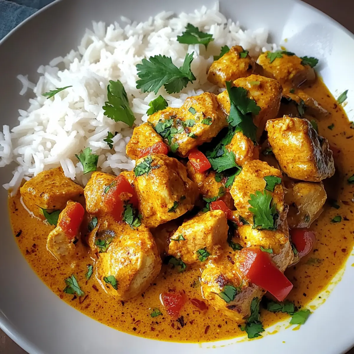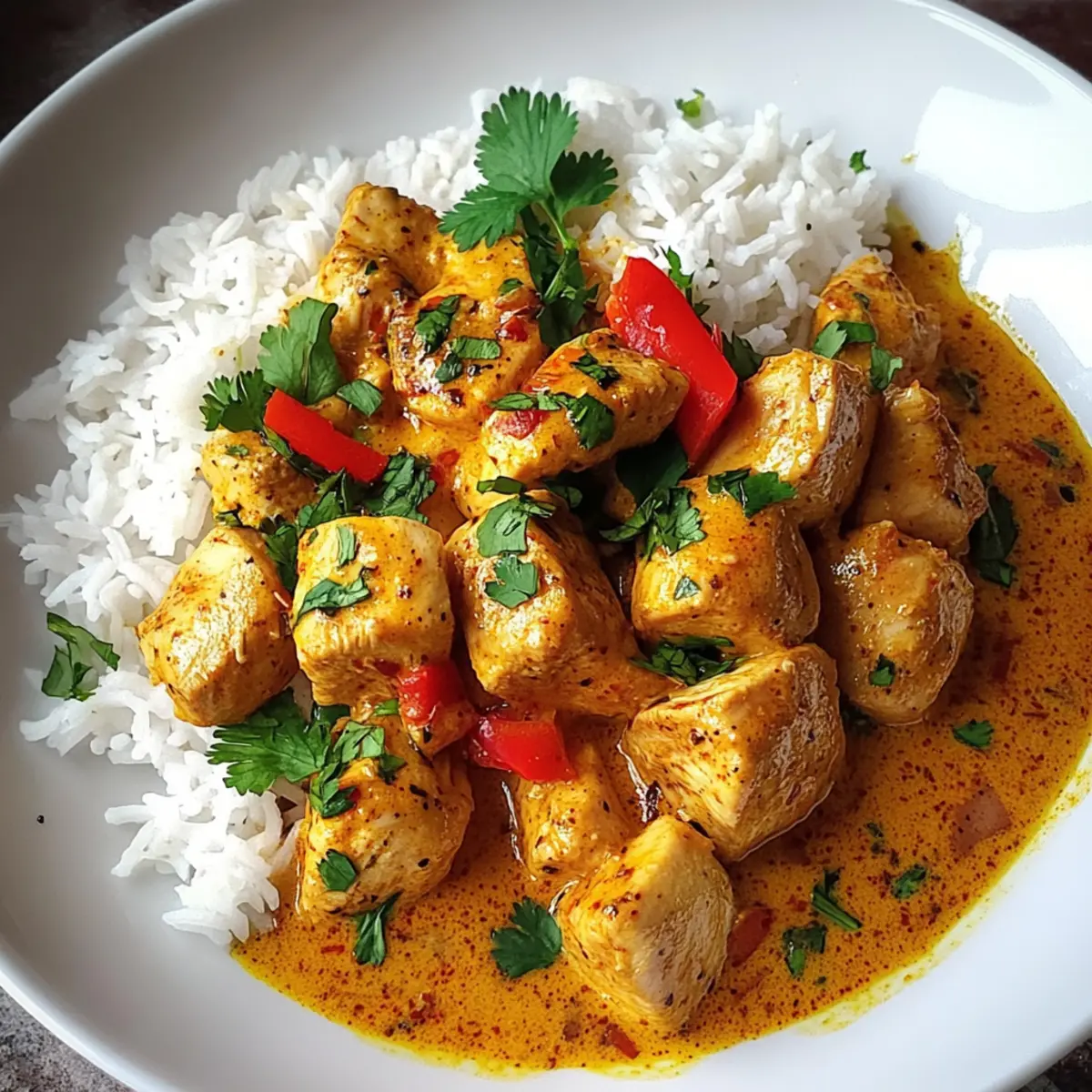 As I stirred the creamy sauce in my skillet, the tantalizing aroma of Brazilian Coconut Chicken wafted through the kitchen, instantly transporting me to a sun-kissed beach in Brazil. This comforting one-pan meal is not only a feast for the senses but also a lifesaver for busy weeknights. With tender chicken simmered in luscious coconut milk, accented by zesty lime and fragrant cilantro, it’s a delightful balance that warms the soul. Best of all, this dish comes together in a snap, making it an effortless choice for impressing family and friends alike. Are you ready to add a touch of tropical goodness to your dinner table? Why is Brazilian Coconut Chicken a Must-Try? Easy Preparation: This dish is a one-pan wonder, meaning fewer pots to wash and less time spent in the kitchen. Flavor Explosion: Infused with creamy coconut milk and zesty lime, this recipe delivers a burst of tropical flavors that won’t leave you wanting. Versatile Serving Options: Serve it over steamed rice for an unforgettable comfort meal or pair with fresh veggies for a colorful, balanced dinner. Perfect for Gatherings: Impress your guests with a dish that’s both exotic and approachable; everyone will be asking for seconds! Brilliantly Kid-Friendly: With a mild flavor profile, this Brazilian Coconut Chicken is sure to please even the pickiest eaters in your family. Get ready to enjoy a fabulous homemade meal with minimal effort! Brazilian Coconut Chicken Ingredients For the Chicken • Chicken Breast (1.5 lbs, cubed) – Provides lean, tender protein that absorbs the sauce’s rich flavors; for extra juiciness, consider using chicken thighs. For the Aromatics • Olive Oil (2 tablespoons) – Serves as the cooking medium to sauté aromatics and brown the chicken gently. • Onion (1 medium, chopped) – Adds savory sweetness and body to the sauce when sautéed. • Garlic (3 cloves, minced) – Offers aromatic notes that enhance the dish’s flavor profile. For the Spices • Ground Cumin (1 teaspoon) – Brings warm, earthy undertones that enhance the creaminess of the coconut milk. • Paprika (1 teaspoon) – Adds depth of flavor and color to the sauce. • Cayenne Pepper (1/2 teaspoon, optional) – Provides a gentle kick; can be adjusted based on desired spice levels. • Salt and Pepper – Essential seasonings to balance flavors. For the Sauce • Coconut Milk (1 can, 14 ounces) – The star ingredient, lending a luscious creaminess and tropical sweetness to the dish. • Diced Tomatoes (1 can, 14 ounces, drained) – Introduces acidity and texture to the sauce. • Lime Juice (1 tablespoon) – Adds bright acidity, cutting through the richness and providing freshness. • Fresh Cilantro (1/4 cup, chopped + extra for garnish) – Adds a refreshing finish and vibrant color to the dish. For Serving • Steamed Rice (for serving) – The perfect canvas to soak up the rich sauce, enhancing the overall meal experience. This Brazilian Coconut Chicken recipe is sure to become a favorite in your household! Step‑by‑Step Instructions for Brazilian Coconut Chicken Step 1: Heat the Oil In a large skillet, heat 2 tablespoons of olive oil over medium-high heat until shimmering, about 1-2 minutes. Ensure the oil is hot enough to cook the chicken effectively. A gentle sizzle when ingredients are added will confirm you’re ready for the next step! Step 2: Sauté the Onion Add 1 chopped medium onion to the skillet and sauté until translucent, approximately 3-4 minutes. Stir occasionally to avoid burning. The onion should become soft and slightly golden, filling your kitchen with a fragrant aroma that hints at the delicious Brazilian Coconut Chicken to come. Step 3: Add the Garlic and Spices Now stir in 3 minced garlic cloves, 1 teaspoon of ground cumin, 1 teaspoon of paprika, and ½ teaspoon of cayenne pepper (if using). Cook for about 1 minute until fragrant. The spices will bloom and release their flavors into the oil, creating a delicious foundation for your dish. Step 4: Brown the Chicken Introduce 1.5 lbs of cubed chicken breast into the skillet. Allow the chicken to brown undisturbed for 1 minute before stirring. Continue cooking for an additional 5-7 minutes, stirring occasionally, until all sides are golden brown. The chicken should be cooked through, and its enticing aroma will fill your kitchen. Step 5: Season the Chicken Once browned, season the chicken with salt and pepper to taste. This step enhances the flavors of the Brazilian Coconut Chicken. Give it a quick stir to ensure the seasoning is evenly distributed across the chicken pieces. Step 6: Combine with Coconut Milk Pour in 1 can of coconut milk, stirring gently to combine. Bring the mixture to a gentle simmer over medium heat. The coconut milk will create a creamy base that envelops the chicken, transforming the skillet into a tropical flavor paradise. Step 7: Add Tomatoes and Lime Juice Add 1 can of drained diced tomatoes and 1 tablespoon of lime juice into the skillet. Stir well to incorporate everything. The tomatoes will add a vibrant color and slight acidity to balance the richness of the coconut milk, enhancing the overall flavor of the Brazilian Coconut Chicken. Step 8: Simmer the Sauce Reduce the heat to low and cover the skillet partially with a lid. Allow everything to simmer for 15-20 minutes, stirring occasionally. During this time, the chicken will cook thoroughly, and the sauce will thicken to a creamy consistency, making it the perfect complement to your serving. Step 9: Finish with Fresh Cilantro Once cooked, stir in ¼ cup of chopped fresh cilantro. Taste and adjust seasoning if needed, bringing a fresh, herbaceous note to the Brazilian Coconut Chicken. The cilantro will brighten the dish, creating a delightful finish of color and flavor. Step 10: Serve and Enjoy Serve the Brazilian Coconut Chicken hot over a bed of steamed rice. Garnish with additional cilantro for a fresh touch. The rich, creamy sauce will soak into the rice, offer