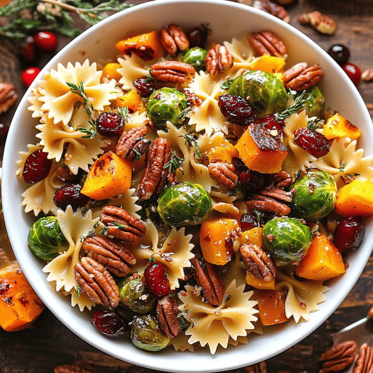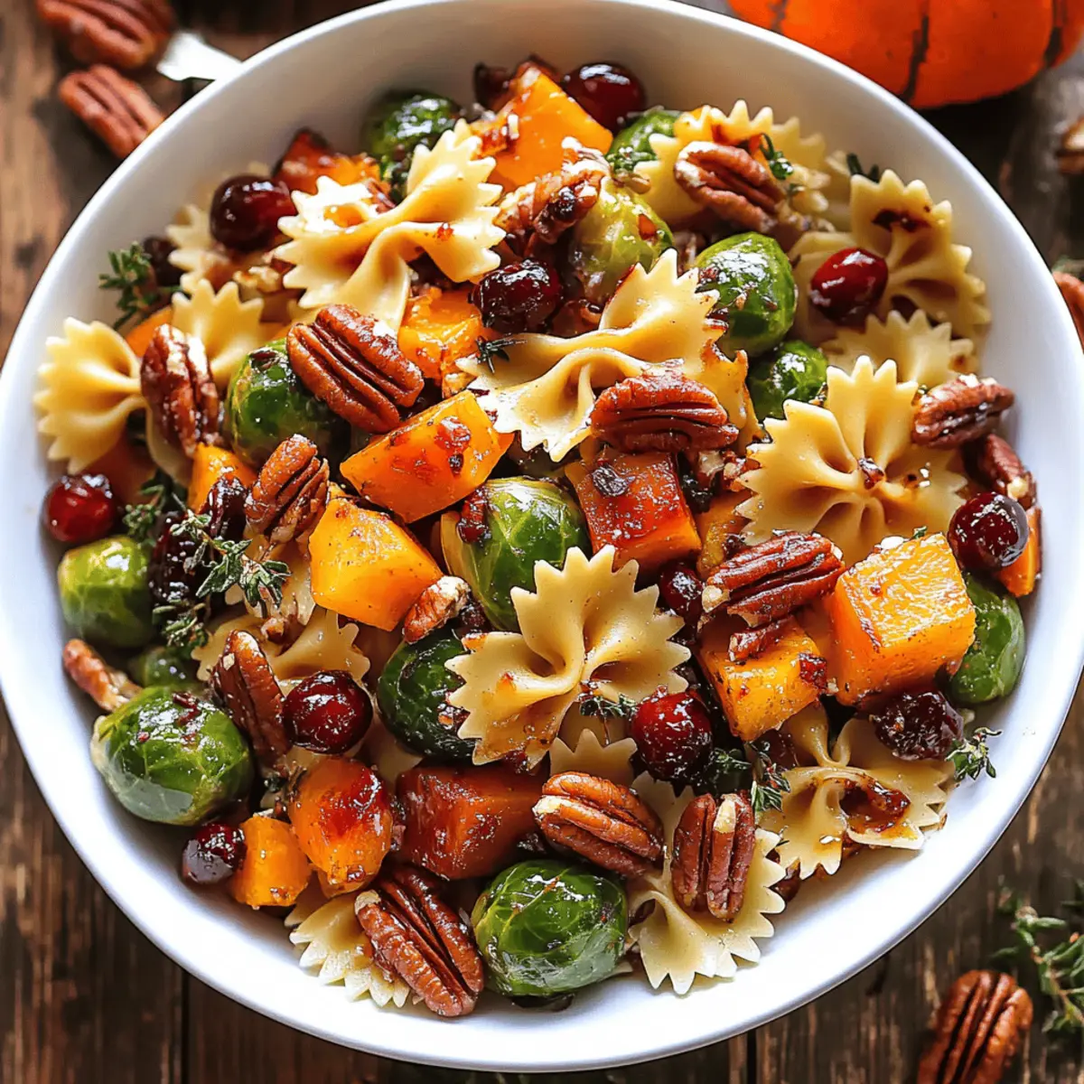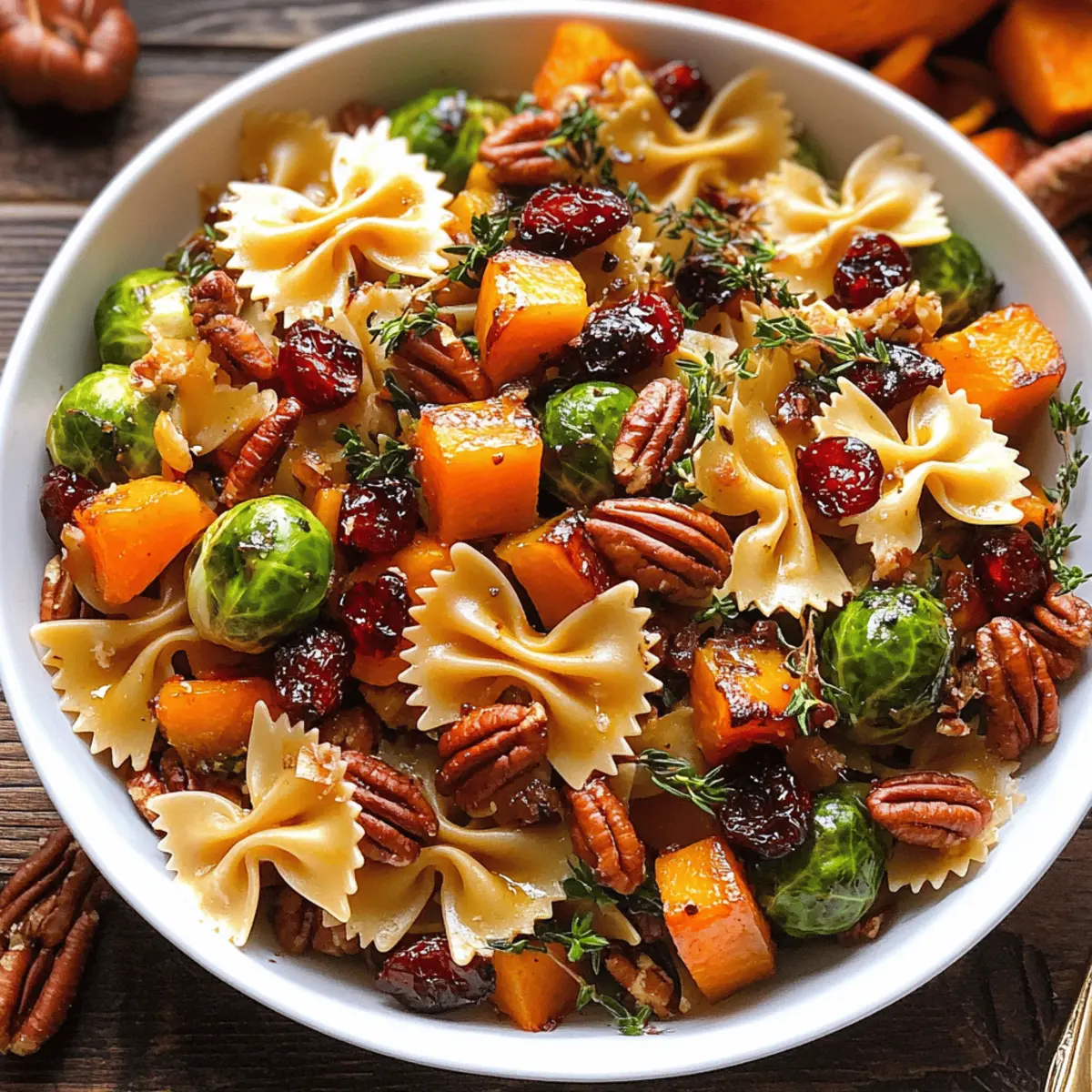 As the leaves turn golden and the air carries the scent of cinnamon, I find comfort in warm, hearty dishes that capture the essence of fall. One such treasure in my recipe box is the Butternut Squash Pasta Salad with Brussels Sprouts, Pecans, and Cranberries. This delightful salad is not only a stunning centerpiece for your Thanksgiving table but also a quick and wholesome vegetarian dish that can brighten any meal. Imagine tender bow-tie pasta tossed with roasted Brussels sprouts, sweet butternut squash, crunchy pecans, and tart cranberries, all lightly kissed by spices reminiscent of autumn. This dish brings together textures and flavors that not only satisfy your palate but also nourish the body—perfect for those cozy nights when comfort food is calling. Curious how to whip up this festive delight? Let’s dive into the ingredients and steps that will elevate your fall cooking! Why Is This Salad a Fall Favorite? Colorful Vibrance: This Butternut Squash Pasta Salad is a feast for the eyes, featuring brilliant hues of orange, green, and red that embody the season’s charm. Hearty & Satisfying: The combination of roasted vegetables and pasta is both filling and comforting, making it perfect for any fall gathering or cozy weeknight dinner. Nutty Crunch: With toasted pecans, each bite delivers a delightful crunch that beautifully contrasts with the tender squash and pasta. Versatility Galore: This dish can serve as a standout side for holiday meals or as a light main course. For more protein, consider pairing it with roasted chicken or chickpeas. Easy Make-Ahead: Perfect for busy hosts, you can prepare this salad a day ahead. Just add the dressing and nuts right before serving for that fresh, crisp texture. Seasonal Delight: Capture the essence of autumn with every bite, making this salad a must-have for Thanksgiving tables and seasonal gatherings alike! Butternut Squash Pasta Salad Ingredients For the Salad • Brussels Sprouts – A savory addition to enhance flavor and texture, trimmed and halved for even roasting. • Butternut Squash – Provides a natural sweetness and hearty substance, peeled, seeded, and cut into 1-inch cubes. • Pasta (Farfalle) – Acts as the salad’s base, offering structure; feel free to use gluten-free pasta if needed. • Pecan Halves – Adds a delightful crunch and nutty flavor; can be toasted for deeper taste, or substitute with walnuts. • Dried Cranberries – Introduces a tart contrast to the sweetness of squash; raisins can be a quick substitute. For Roasting • Olive Oil – Essential for roasting veggies, enhancing flavors; can be swapped with avocado oil for a different twist. • Salt – Elevates overall taste; adjust the amount to fit your preference. • Ground Cinnamon – Offers warmth and seasonal spice, crucial for that autumn flavor profile. • Maple Syrup – Adds a touch of natural sweetness; honey or agave syrup can be used as alternatives. For the Dressing • Balsamic Vinegar/Glaze – Enhances the flavors beautifully; opt for lemon juice for a lighter, brighter taste. • Extra Virgin Olive Oil – An optional dressing base that enriches the salad. This Butternut Squash Pasta Salad with Brussels Sprouts, Pecans, and Cranberries is not just a dish; it’s a delightful experience that captures the flavors of fall! Step‑by‑Step Instructions for Butternut Squash Pasta Salad with Brussels Sprouts, Pecans, and Cranberries Step 1: Preheat the Oven Begin by preheating your oven to 400°F (200°C). Line two baking sheets with parchment paper to ensure easy cleanup. As the oven warms, gather your Brussels sprouts and butternut squash, preparing for the roasting process that will bring out their natural sweetness and enhance their flavors in the Butternut Squash Pasta Salad. Step 2: Roast the Brussels Sprouts In a mixing bowl, toss the halved Brussels sprouts with 2 tablespoons of olive oil and a generous pinch of salt until they are well-coated. Spread the sprouts evenly on one of the prepared baking sheets. Roast in the preheated oven for 20-25 minutes, turning halfway through, until they are golden and charred around the edges—this adds a delightful depth of flavor. Step 3: Roast the Butternut Squash While the Brussels sprouts are roasting, prepare the butternut squash. In a separate bowl, combine the cubed squash with another 2 tablespoons of olive oil, along with maple syrup and ground cinnamon. Toss until the squash is well-coated, then spread it in a single layer on the second baking sheet. Roast alongside the Brussels sprouts for about 20-25 minutes or until fork-tender and caramelized. Step 4: Cook the Pasta As your vegetables roast, bring a large pot of salted water to a boil. Add the bow-tie pasta and cook according to the package instructions until al dente, usually about 8-10 minutes. Once cooked, drain the pasta, rinse it under cold water to stop the cooking process, and set it aside to cool slightly, ensuring it remains fresh for the Butternut Squash Pasta Salad. Step 5: Toast the Pecans In a small skillet over medium heat, add the pecan halves and toast them for about 5 minutes, stirring occasionally. Keep an eye on them to avoid burning; they’re ready when fragrant and golden. Once toasted, remove them from the heat and let them cool, as this will add a delightful crunch to your Butternut Squash Pasta Salad. Step 6: Combine the Ingredients In a large mixing bowl, combine the roasted Brussels sprouts, butternut squash, drained pasta, toasted pecans, and dried cranberries. Gently toss all the ingredients together until well mixed, allowing the flavors to marry beautifully. The colorful medley truly embodies the essence of autumn, setting the stage for your Butternut Squash Pasta Salad. Step 7: Dress the Salad Finally, drizzle your salad with your choice of dressing—balsamic vinegar, balsamic glaze, or a sprinkle of maple syrup. Add a splash of extra virgin olive oil if you prefer a creamier texture. Toss the sal