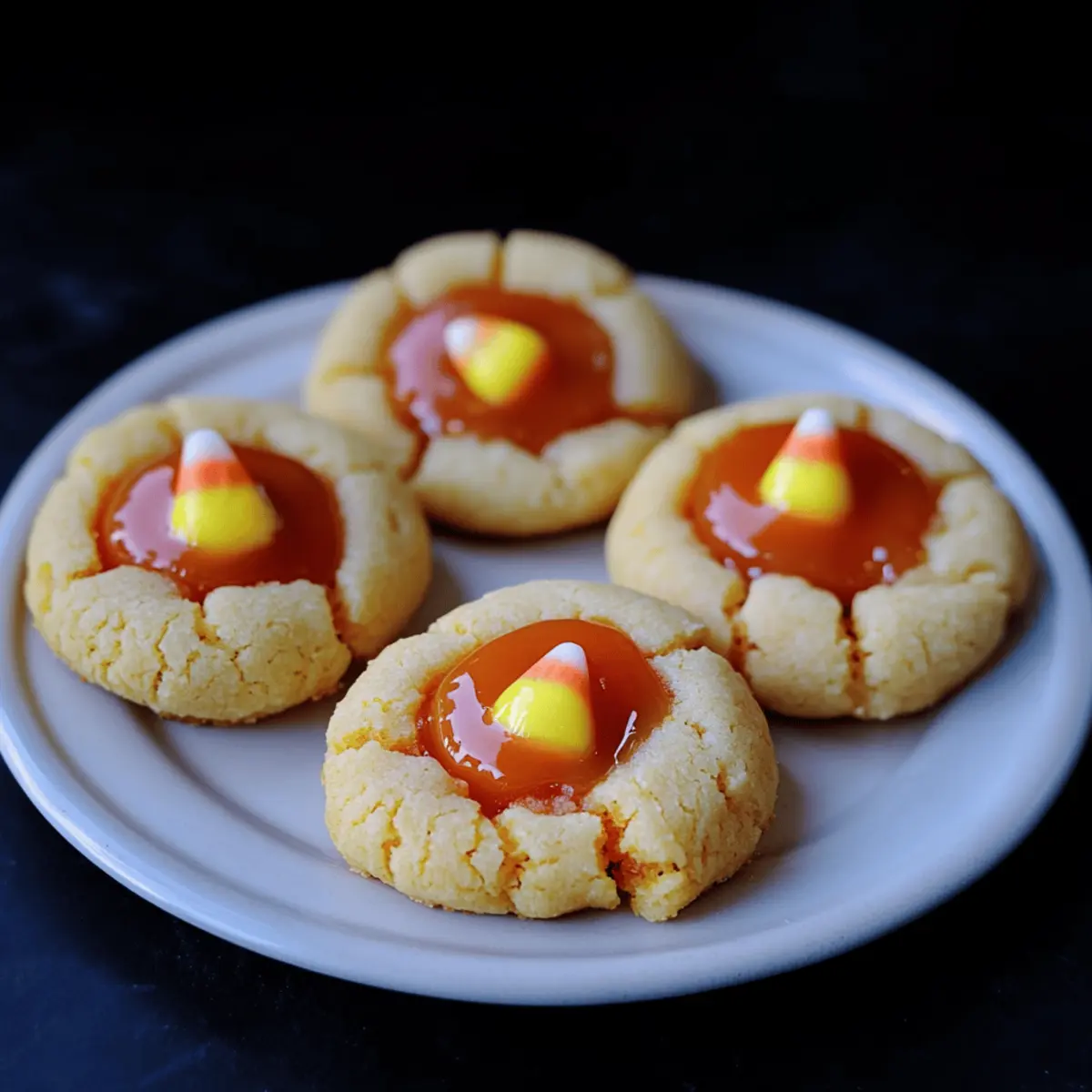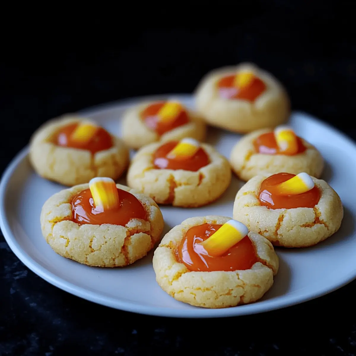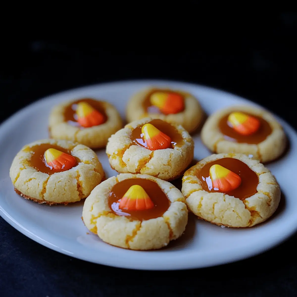 The air is crisp, and the scent of autumn leaves fills the atmosphere—it’s officially Halloween season! What better way to celebrate than with festive Candy Corn Caramel Thumbprint Cookies? These playful cookies, with their soft vanilla shortbread base and rich candy corn-flavored caramel centers, are a delightful twist on a classic favorite. Not only are they a feast for the eyes, boasting bright seasonal colors, but they’re also a wonderful addition to any gathering, perfect for impressing friends or delighting trick-or-treaters. With a quick prep time and a unique flavor profile, these cookies will be a hit whether you’re hosting a party or simply indulging in some homemade comfort. Are you ready to bring a little bit of Halloween magic into your kitchen? Let’s dive into this deliciously spooky recipe! Why You’ll Love These Cookies Festive Fun: These cookies are the perfect celebration of Halloween, combining nostalgic candy corn flavors with a buttery shortbread base. Easy to Make: The process is simple and approachable for bakers of any skill level, making them a must-try for your seasonal baking. Colorful Delight: The vibrant orange and yellow hues provide a visual appeal that will impress friends and add joy to any gathering. Versatile Treat: Serve them at your Halloween party or as a special snack for trick-or-treaters; either way, their crowd-pleasing taste will have everyone coming back for more! Quick Prep Time: With an easy preparation and bake time, you’ll have these delicious treats ready in no time—perfect for last-minute fixes or festive surprises. Pairing Suggestion: Enjoy with a glass of warm cider or milk, just like you would with these Brown Butter Cookies, for a delightful autumn treat! Candy Corn Caramel Thumbprint Cookie Ingredients For the Cookie Base • Unsalted Butter – Provides richness and texture; make sure it’s at room temperature for easier creaming. • Powdered Sugar – Adds a touch of sweetness and contributes to the light, airy texture of the cookies. • Vanilla Extract – Enhances flavor with its delightful aroma, bringing warmth to the cookie base. • All-Purpose Flour – Forms the cookie structure; no substitutes would maintain the ideal texture. • Orange Food Gel – Gives a festive appearance, making these cookies pop with Halloween color. • Yellow Food Gel – Enhances the vibrancy of the cookie dough, adding a playful touch. For the Caramel Filling • Candy Corn – The star ingredient that infuses the caramel with an authentic candy corn flavor; a must-have for these cookies! • Heavy Cream – Used to create the caramel filling; substitute with any cream of similar fat content if needed. • Granulated Sugar – Essential for creating the caramel; superfine sugar works best for a smooth consistency. • Unsalted Butter (for caramel) – Adds a silky smoothness to the caramel, enhancing its richness. • Light Corn Syrup – Helps prevent crystallization, ensuring your caramel stays perfectly gooey. • Water – Assists in dissolving the sugar, key to achieving the right caramel texture. For the Garnish • Mini Candy Corn – An optional decorative touch that adds extra fun and festive flair on top of the cookies. Step‑by‑Step Instructions for Candy Corn Caramel Thumbprint Cookies Step 1: Preheat the Oven Begin your cookie-making adventure by preheating your oven to 350°F (175°C). While the oven heats, line your baking sheets with parchment paper for easy cleanup and to prevent sticking. This initial step sets the stage for baking delicious Candy Corn Caramel Thumbprint Cookies to perfection. Step 2: Cream the Butter and Sugar In a stand mixer, combine softened unsalted butter and powdered sugar. Beat them on medium speed until the mixture becomes light and fluffy, usually about 3-4 minutes. This step is crucial as it incorporates air, which gives your cookies a delightful texture. Don’t rush this; a well-creamed mixture leads to better cookies! Step 3: Incorporate Vanilla Extract Once your butter and sugar are fluffy, gently mix in the vanilla extract until fully combined. The warm aroma will fill your kitchen, bringing a comforting essence to your Candy Corn Caramel Thumbprint Cookies. Ensure the vanilla is evenly distributed before moving on to the next step. Step 4: Add the Flour Gradually add in the all-purpose flour, mixing on low speed until just combined. Stop mixing as soon as you see no dry flour; overmixing can lead to tough cookies. The dough should be soft and slightly sticky, a perfect foundation for the whimsical caramel center that awaits. Step 5: Color the Dough To achieve that festive Halloween look, divide your dough in half. Add orange food gel to one half and yellow food gel to the other, mixing until both portions are well colored with vibrant hues. This step not only enhances visual appeal but also adds a fun element to your Candy Corn Caramel Thumbprint Cookies. Step 6: Shape the Cookies Using your hands, roll the colored dough into 1-inch balls and place them on the prepared baking sheets, spacing them about 2 inches apart. With your thumb, gently press into the center of each ball, creating a well for the caramel filling. This key step shapes the thumbprint feature of your cookies. Step 7: Bake the Cookies Place the baking sheets in the preheated oven and bake for 14-16 minutes, or until the cookie edges are set and just lightly golden. Keep an eye on them; they should still look soft. If the indentations have puffed up, you can gently re-indent them right after baking to maintain their thumbprint shape. Step 8: Prepare the Caramel Filling While the cookies bake, start on your caramel. In a saucepan, heat the heavy cream and candy corn over medium heat until the candy corn melts, then strain the mixture to remove any solids. Combine this creamy mixture with unsalted butter and a pinch of salt, stirring until melted and smooth—a luscious filling for your cookies. Step 9: Make t
