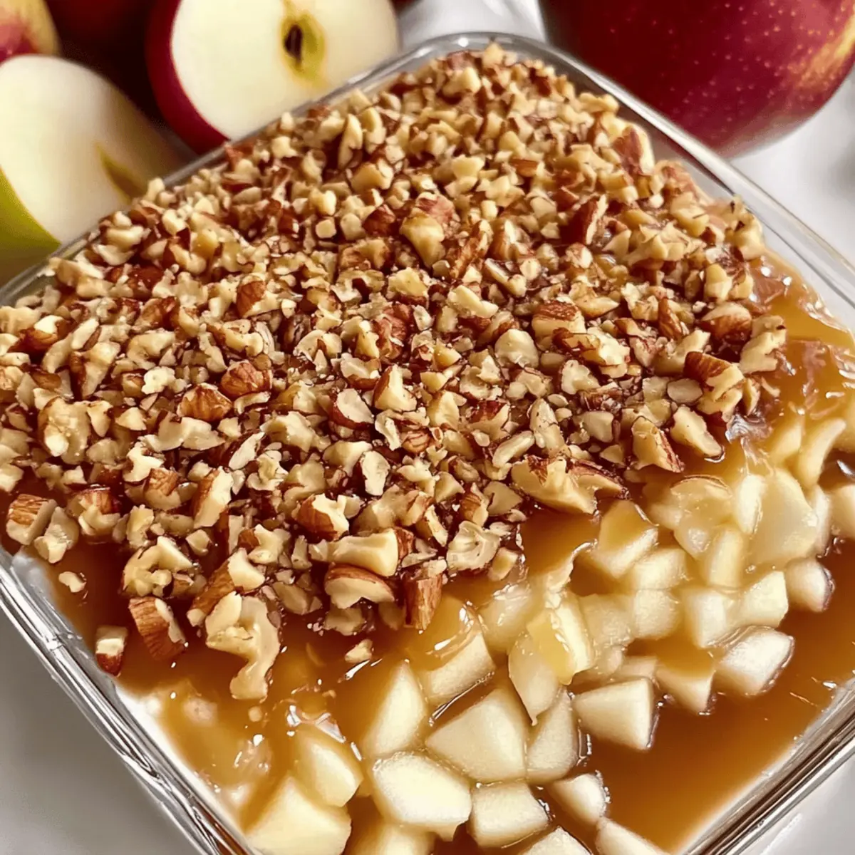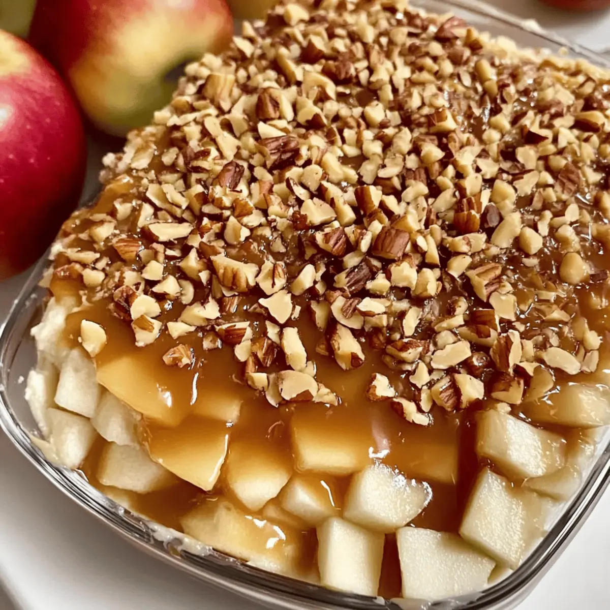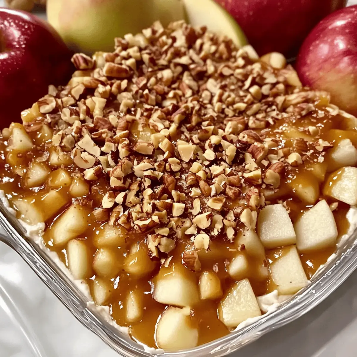 As the leaves turn golden and the air gets crisp, nothing warms a gathering quite like the aroma of the season. That’s precisely why I gravitate towards my Ultimate Caramel Apple Cheesecake Dip; this isn’t just a dip—it’s an invitation to cozy up and enjoy life’s sweetest moments. With its creamy base and rich caramel drizzle, it’s delightfully easy to make and can be tailored for lighter diets or even turned vegan. Trust me, it’ll have your friends begging for the recipe. Whether you’re hosting a harvest celebration or a simple family get-together, this dish is all about bringing people together around something delicious. Are you ready to dive into this indulgent experience? Let’s whip up this treat and make your next gathering unforgettable! Why is this dip a fall favorite? Irresistible flavor: The combination of creamy cheese and sweet caramel creates a decadent experience that delights the taste buds. Effortlessly simple: With just a few ingredients and minimal prep, even novice chefs can create this show-stopping dessert. Customizable options: Whether you prefer a low-fat version or want to explore vegan alternatives, this recipe fits every dietary need and keeps everyone happy. Crowd pleaser: Ideal for any gathering, this dip pairs perfectly with a variety of dippers, ensuring everyone finds their favorite way to enjoy it. Fall traditions: Embrace the spirit of the season with a dessert that reflects classic autumn flavors, making it a cherished addition to family celebrations. Serve alongside other favorites like Peach Cobbler Cheesecake for a true dessert spread! Caramel Apple Cheesecake Dip Ingredients For the Dip • Cream Cheese – Provides a creamy, rich base; low-fat cream cheese can lighten it up. • Whipped Topping – Adds lightness and fluffiness; homemade whipped cream works too. • Powdered Sugar – Sweetens the dip, balancing the tanginess of cream cheese. • Caramel Sauce – Gives a rich, buttery flavor; can be store-bought or homemade. For the Topping • Apples – Adds freshness and crunch; Granny Smith or Honeycrisp are recommended for their tartness. • Crushed Pecans – Enhances texture and nutty flavor for garnish; omit for nut allergies. For Serving • Dippers – Options include graham crackers, pretzels, or extra apple slices for a delightful experience. Get ready to savor this mouthwatering Caramel Apple Cheesecake Dip, a staple for any fall gathering! Step‑by‑Step Instructions for Caramel Apple Cheesecake Dip Step 1: Beat the Cream Cheese In a large mixing bowl, use an electric mixer to beat 8 ounces of cream cheese on medium speed until it becomes smooth and creamy, about 2-3 minutes. Scrape down the sides of the bowl as needed to ensure even mixing. The cream cheese should be completely soft and free of lumps for a perfect base for your Caramel Apple Cheesecake Dip. Step 2: Mix in the Powdered Sugar Add 1 cup of powdered sugar to the creamy mixture and continue to beat on low speed until it is fully incorporated, approximately 1-2 minutes. The mixture should become thick and sweet, balancing the tanginess of the cream cheese. Take a moment to taste the mix; it should be sweet but not overpowering, enhancing the dip’s overall flavor. Step 3: Fold in the Whipped Topping Gently fold in 8 ounces of whipped topping into the cream cheese and sugar mixture using a spatula. Be careful not to deflate the mixture too much; a light and fluffy texture is key! This will take 1-2 minutes as you want to preserve the airiness that contributes to the delightful creaminess of the Caramel Apple Cheesecake Dip. Step 4: Spread the Filling Transfer the cheesecake mixture to a shallow serving dish or bowl, using the spatula to spread it evenly across the bottom. Create smooth edges for an enticing presentation. The cream cheese layer should be about an inch thick, providing a great platform for the caramel and toppings to shine in your delicious dip. Step 5: Drizzle with Caramel Sauce Generously drizzle store-bought or homemade caramel sauce over the top of the cream cheese layer, using about ½ cup. The caramel should glisten and create an inviting look, running down the sides of the cheesecake mixture. This step enhances the flavor profile of your Caramel Apple Cheesecake Dip, adding a rich and buttery touch. Step 6: Add the Toppings Sprinkle one diced apple (preferably Granny Smith or Honeycrisp for tartness) evenly over the caramel layer, followed by a handful of crushed pecans, if using. The apples should provide a fresh crunch, and the pecans will add a delightful nuttiness, finishing off your dip visually and texturally. Step 7: Chill Before Serving Cover the dish with plastic wrap and chill the Caramel Apple Cheesecake Dip in the refrigerator for at least 30 minutes. This allows the flavors to meld beautifully and the mixture to set slightly, making it easier to scoop. You’ll notice a perfect firm yet creamy consistency when ready to serve at your gathering! Expert Tips for Caramel Apple Cheesecake Dip Choose the Right Apples: Select tart apples like Granny Smith or Honeycrisp to balance the sweetness of the dip. Avoid overly soft apples as they won’t provide the ideal crunch. Whip It Light: For a fluffy texture, gently fold the whipped topping into the cream cheese mix. Avoid over-mixing, which can deflate the air you’ve created. Chill Time Matters: After preparing, allow the dip to chill for at least 30 minutes. This rest period enhances flavor and texture, making your Caramel Apple Cheesecake Dip even more delicious. Customizable Garnishes: Feel free to swap out pecans for other toppings like toffee bits or crushed graham crackers for varied texture. This keeps the dip exciting for every gathering. Make Ahead Tips: If prepping in advance, store the cream cheese layer separately; add caramel and toppings just before serving to keep everything fresh and appealing. How to Store and Freeze Caramel Apple Cheesecake Dip Refrigerato