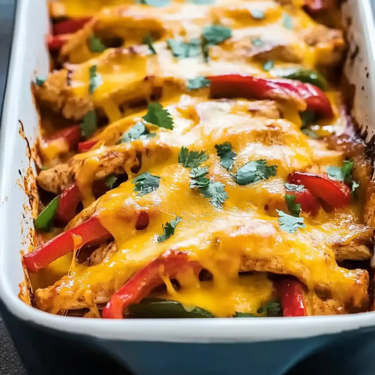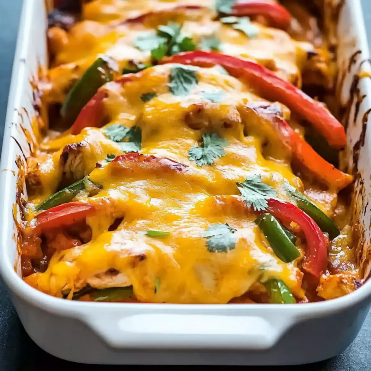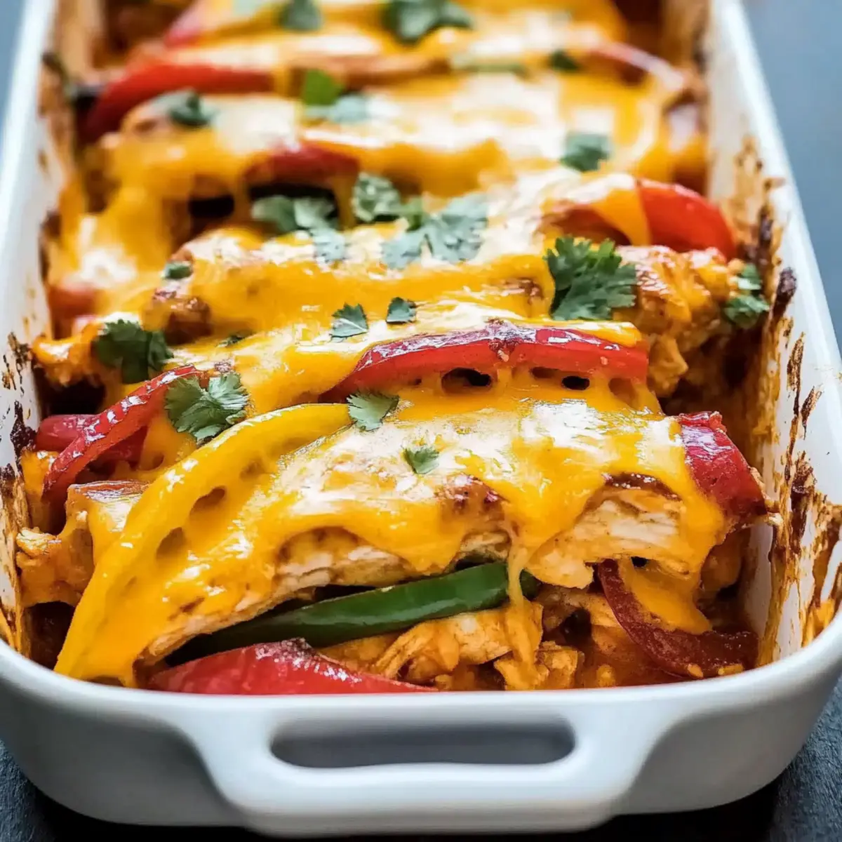 As I tossed together colorful bell peppers and juicy chicken, the aroma whisked me away to bustling street markets in Mexico. This Cheesy Chicken Fajita Casserole is my favorite comfort food twist on the classic fajitas we all love. Not only is it a delightful way to gather friends and family around the table, but its adaptability makes it even more appealing. With minimal preparation, you can create a dish that’s not only hearty and satisfying but also offers the flexibility to accommodate gluten-free or lower-calorie diets. Are you ready to transform your weeknight dinners into delicious feasts? Let’s dive into this savory experience that’s sure to impress everyone at your table! Why is this dish a crowd-pleaser? Vibrant Flavors: Bursting with the zest of bell peppers and seasoned chicken, this dish will transport your taste buds to a fiesta! Easy to Prepare: With simple steps, even novice cooks can whip up this satisfying casserole. Perfect for busy weeknights! Customizable Options: Swap in your favorite veggies or proteins—try using quinoa instead of rice for a lighter option, or make it vegetarian with black beans. Cheesy Goodness: Oozing with melted cheese, this casserole holds comfort food status that everyone craves. Pair it with warm tortillas for an extra touch! Make-Ahead Friendly: Prepare it ahead of time for easy baking just before dinner. It’s great for family gatherings or meal prepping! Health-Conscious: Adapt it for gluten-free diets or reduce calories by substituting ingredients, like using Greek yogurt in place of sour cream. It’s all about enjoying comfort food that fits your lifestyle! Cheesy Chicken Fajita Casserole Ingredients For the Casserole • Chicken Breast – a lean protein source that keeps the dish hearty and filling. • Olive Oil – enhances flavor and aids in cooking the chicken evenly. • Bell Peppers – offers sweetness and vibrant color; mix different colors for visual appeal. • Yellow Onion – provides a natural sweetness that balances the flavors beautifully. • Garlic – adds aromatic depth; fresh is best, but powdered works in a pinch. • Diced Tomatoes with Green Chilies – adds moisture and a hint of spice; use canned for convenience. • Fajita Seasoning – this spice blend creates the dish’s signature flavor; opt for homemade for a fresh twist. • Cheddar Cheese – delivers creamy richness; swap for low-fat cheese to lighten up. • Mozzarella Cheese – adds that delightful stretchiness; feel free to mix with other cheeses. • Sour Cream – tangy addition that enhances creaminess; Greek yogurt can be a healthier alternative. • Cooked Rice – for substance; substitute with quinoa for a nutritious twist. • Salt and Pepper – classic seasonings to customize taste according to preference. Optional Toppings • Fresh Cilantro – adds a pop of color and fresh flavor; use as a garnish before serving. • Sliced Jalapeños – for an extra kick, add fresh or pickled jalapeños if you like some heat. This Cheesy Chicken Fajita Casserole is adaptable to many tastes and preferences—why not let your creativity shine? Enjoy crafting this delicious dish! Step‑by‑Step Instructions for Cheesy Chicken Fajita Casserole Step 1: Preheat the Oven Begin by preheating your oven to 375°F (190°C). This ensures that your Cheesy Chicken Fajita Casserole will bake evenly and reach the perfect temperature for melting the cheese. While the oven heats, gather your ingredients for a smooth cooking experience. Step 2: Sauté the Chicken Heat a tablespoon of olive oil in a large skillet over medium-high heat. Add your chicken strips and cook them for about 5-7 minutes, stirring occasionally, until they are golden brown and cooked through. Once done, remove the chicken from the skillet and set it aside, letting the aroma fill your kitchen. Step 3: Cook the Vegetables In the same skillet, add another splash of olive oil if needed, then toss in the sliced bell peppers and chopped yellow onion. Sauté these colorful veggies for about 4-5 minutes until they soften and become tender. This combination not only bursts with flavor but also adds vibrancy to your casserole. Step 4: Add Garlic Stir in the minced garlic and let it cook for about 1 minute until fragrant. This quick addition elevates the flavors, giving your Cheesy Chicken Fajita Casserole that aromatic touch that makes home-cooked meals so special. Step 5: Combine Chicken and Spices Return the cooked chicken to the skillet, followed by the diced tomatoes with green chilies. Sprinkle in the fajita seasoning and stir everything together so that the chicken and vegetables are coated with the spice blend. Cook for an additional 2-3 minutes to meld the flavors beautifully. Step 6: Incorporate Rice Once the mixture is well combined, stir in the cooked rice, ensuring all ingredients are evenly distributed. Remove the skillet from heat; the warmth will help the flavors blend perfectly. Transfer this delicious mixture into a greased 9×13 inch baking dish, ready for layering. Step 7: Layer with Sour Cream and Cheese Spread a layer of sour cream over the chicken and rice mixture—this adds creaminess to your casserole. Next, top generously with shredded cheddar and mozzarella cheese. The combination of cheeses will create that ooey-gooey texture that everyone loves in a casserole. Step 8: Bake to Perfection Place the casserole in the preheated oven and bake for 20-25 minutes. Watch closely as you see the cheese melt and bubble, creating a golden crust on top. This visual cue means that your Cheesy Chicken Fajita Casserole is nearly ready to serve! Step 9: Cool and Serve Once baked, remove the casserole from the oven and let it cool slightly for about 5-10 minutes. This resting time allows the flavors to settle perfectly and makes serving easier. If desired, garnish with fresh cilantro before digging in to enjoy this comforting dish with family and friends. What to Serve with Cheesy Chic