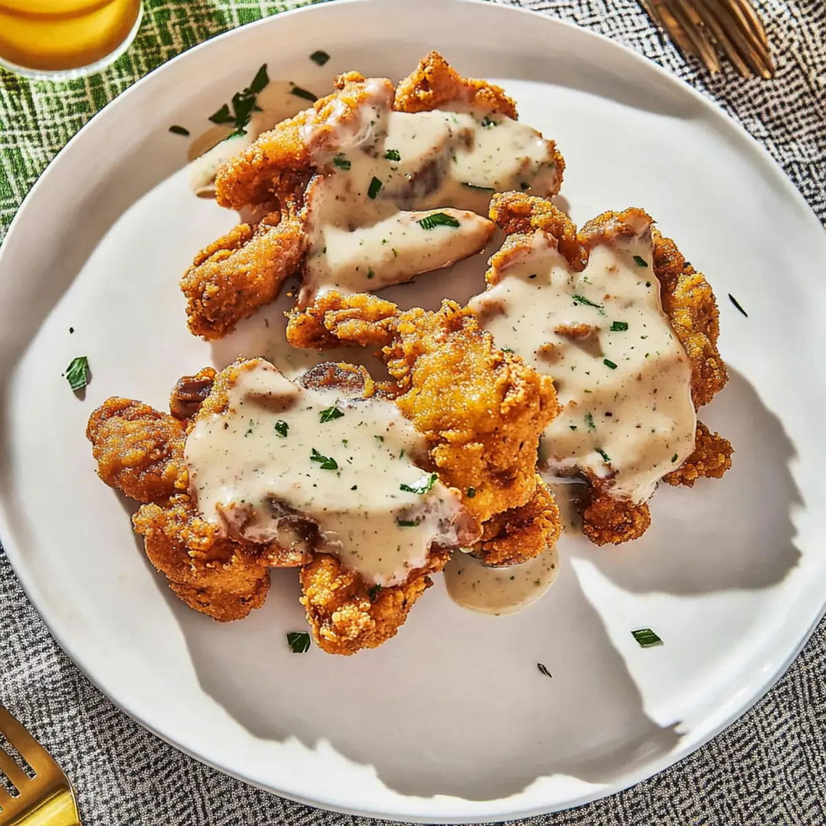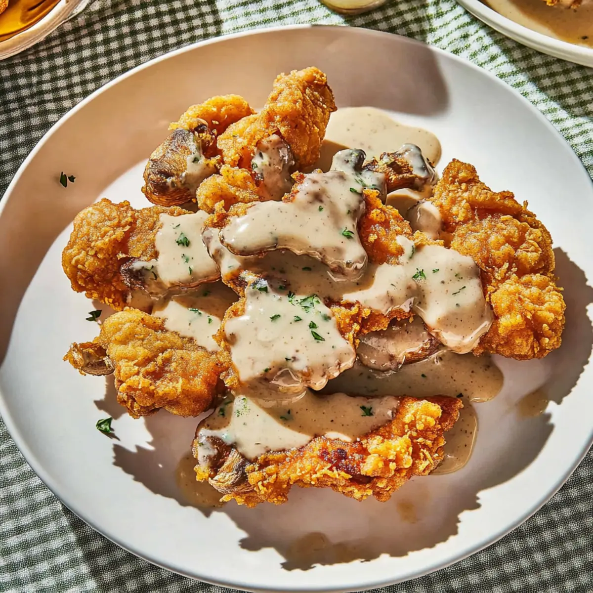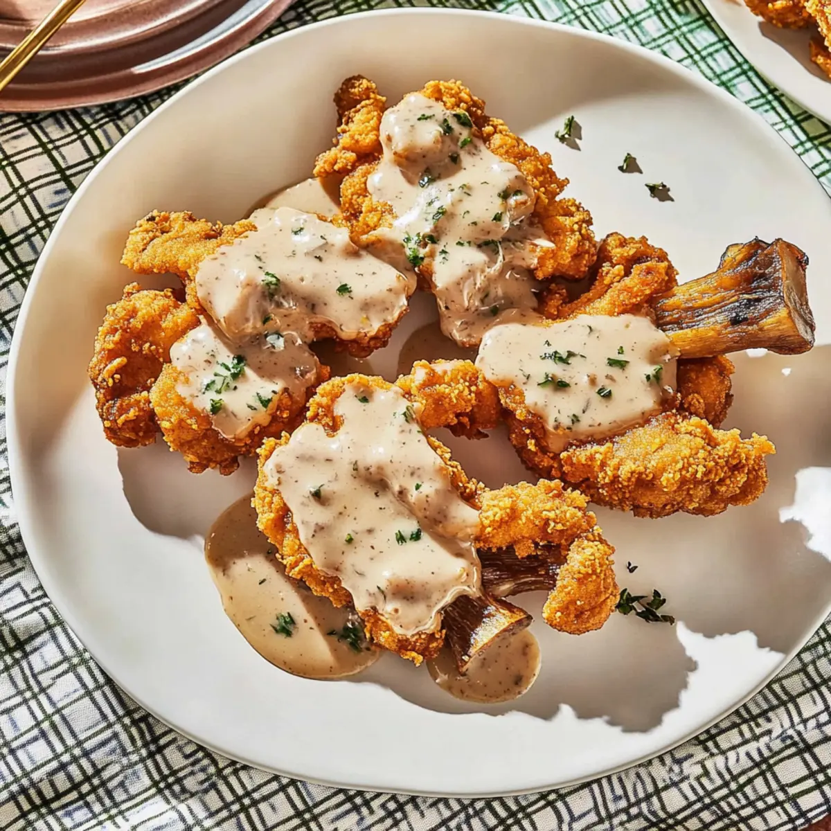 As I was flipping through my collection of cherished family recipes, a memory washed over me—weeknight dinners filled with laughter, comfort, and the irresistible aroma of Chicken-Fried Mushrooms & Gravy wafting through the air. This vegetarian twist on a Southern staple makes for a creamy, indulgent experience, featuring crispy oyster mushrooms that satisfy cravings and evoke nostalgia. It’s an enchanting option for those busy nights when you’re craving comfort food without the fuss. Best of all, this dish comes together in just 30 minutes, making it a quick weeknight meal that even the most novice cooks can master. Are you ready to whip up this indulgent creation and impress your loved ones? What Makes This Recipe a Must-Try? Indulgent, this Chicken-Fried Mushrooms & Gravy is a crispy revelation that redefines comfort food! Quick and Easy, it requires just 30 minutes, making it perfect for busy weeknights. Vegetarian Delight, the meaty oyster mushrooms offer a satisfying twist without sacrificing flavor. Rich Gravy, this luscious sauce elevates the dish, providing a creamy finish that’s simply irresistible. Crowd-Pleasing Comfort, it’s sure to impress friends and family, leaving everyone asking for seconds. Versatile Options, with simple substitutions, explore unique flavors and manage dietary preferences with ease. Enjoy it with a side of mashed potatoes or even as a topping for a hearty salad! Chicken-Fried Mushrooms & Gravy Ingredients • Dive into comfort with these essential ingredients for your Chicken-Fried Mushrooms & Gravy! For the Mushrooms Oyster Mushrooms – These are your main ingredient, offering a wonderful texture and umami flavor; substitute with portobello for a meatier experience. Cremini Mushrooms – Boosts the gravy’s flavor profile; feel free to increase the amount of oyster mushrooms if desired. For the Coating All-Purpose Flour – Provides the crispy outer layer you love; gluten-free flour works well for a gluten-free option. Cornstarch – Helps achieve extra crunch; can reduce the amount of flour for a lighter coating. Sweet Paprika – Adds warmth and vibrant color; switch to smoked paprika for a deeper, earthy flavor. Garlic Powder – Intensifies the savory taste; fresh garlic can be a lovely substitute. Onion Powder – Complements the dish’s savory elements; optional if preferred. Turmeric – Gives a touch of color and earthiness; curry powder can be used for an alternative twist. Kosher Salt – Essential for enhancing overall flavor; use regular salt with an adjusted quantity. Freshly Ground Black Pepper – Elevates the dish with subtle heat and depth. For the Buttermilk Mixture Unsweetened Almond Milk – Forms the base for homemade buttermilk; other non-dairy milks can also be used effectively. Apple Cider Vinegar – Creates that characteristic buttermilk tang; lemon juice is a good substitute. For Frying and Garnishing Vegetable Oil – Necessary for frying; choose any neutral oil of your preference. Flaky Sea Salt – Perfect for finishing touches; sprinkle over just before serving. Vegan Butter – Adds richness to your gravy; can be replaced with regular butter as needed. Clove Garlic – Fresh aromatics meshing beautifully into your gravy. Chopped Chives – Use these for garnishing, offering fresh flavor and a pop of color. Now that you have all the ingredients ready, let’s transform your kitchen into a place of comforting indulgence! Step‑by‑Step Instructions for Chicken-Fried Mushrooms & Gravy Step 1: Prepare Buttermilk In a medium bowl, combine 1 cup of unsweetened almond milk with 1 tablespoon of apple cider vinegar. Stir well and let it sit for about 5-10 minutes until it curdles and thickens. This homemade buttermilk is essential for coating the oyster mushrooms, giving them a flavorful base that will help the crispy coating adhere beautifully. Step 2: Prepare Coating Mixture In a separate large bowl, whisk together 1 cup of all-purpose flour, 1/4 cup of cornstarch, 1 tablespoon of sweet paprika, 1 teaspoon of garlic powder, 1 teaspoon of onion powder, 1/2 teaspoon of turmeric, 1 teaspoon of kosher salt, and freshly ground black pepper to taste. Ensure all ingredients are well combined, creating a smooth and uniform coating mixture that will give your Chicken-Fried Mushrooms a delightful crunch. Step 3: Coat Mushrooms Take the oyster mushrooms, dipping each piece first in the buttermilk mixture, ensuring they are fully submerged. Then, dredge the mushrooms in the prepared flour mixture, pressing lightly to coat them thoroughly. This step is crucial for achieving maximum crispiness and flavor, so take your time to ensure a good, even coating on all sides. Step 4: Heat Oil In a large frying pan, heat about 1 cup of vegetable oil over medium-high heat. Allow the oil to reach a shimmering point, which usually takes about 5 minutes. To test if it’s ready, drop a small amount of the coating mixture into the oil; if it sizzles immediately, it’s perfect for frying your Chicken-Fried Mushrooms. Step 5: Fry Mushrooms Carefully add the coated oyster mushrooms in batches to the hot oil, making sure not to overcrowd the pan. Fry each side for about 5-7 minutes, or until they turn golden brown and crispy. Once cooked, use a slotted spoon to transfer the mushrooms to a paper towel-lined plate, allowing any excess oil to drain off for a perfectly crispy finish. Step 6: Make Gravy In the same frying pan, reduce the heat to medium and add 2 tablespoons of vegan butter. Once melted, add 1 cup of chopped cremini mushrooms and 2 cloves of minced garlic. Cook until the mushrooms are softened, about 3-4 minutes. Slowly whisk in 1/4 cup of flour, cooking for about 1 minute, then gradually add 1 cup of almond milk, stirring continuously until the gravy thickens, which should take about 5 minutes. Step 7: Serve On a serving platter, arrange the crispy Chicken-Fried Mushrooms and generously drizzle over the rich gravy. For a pop of fre