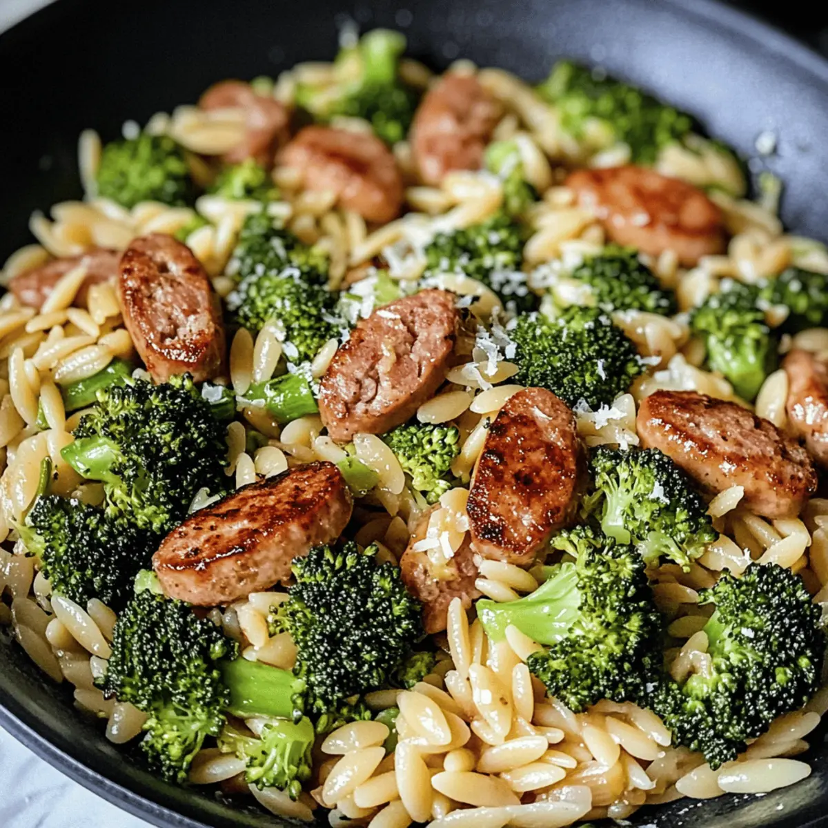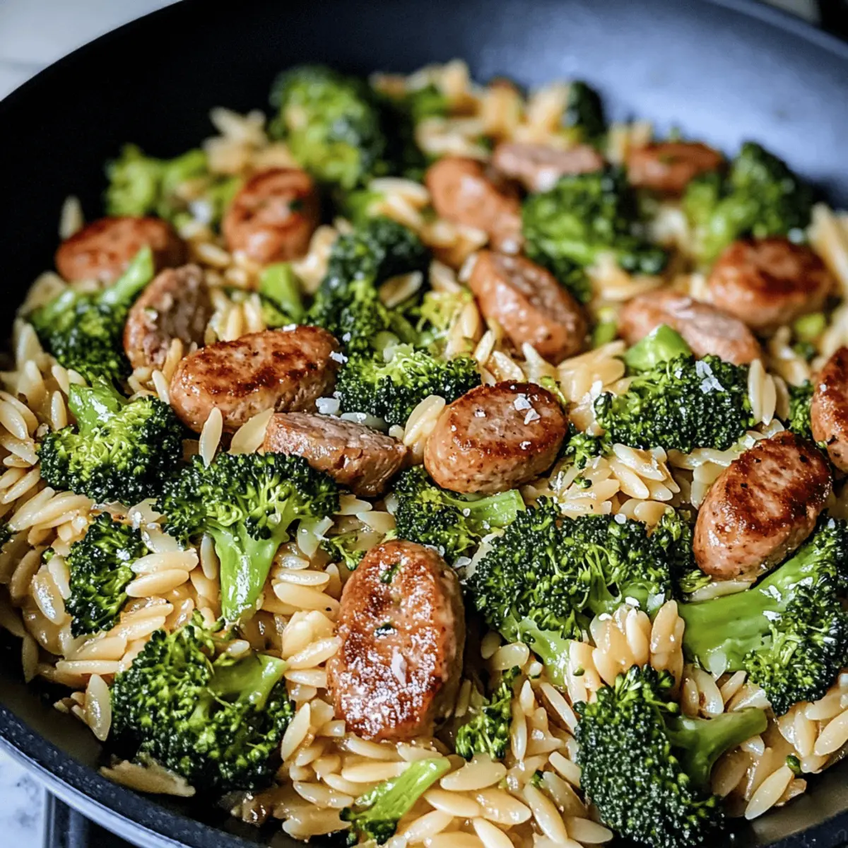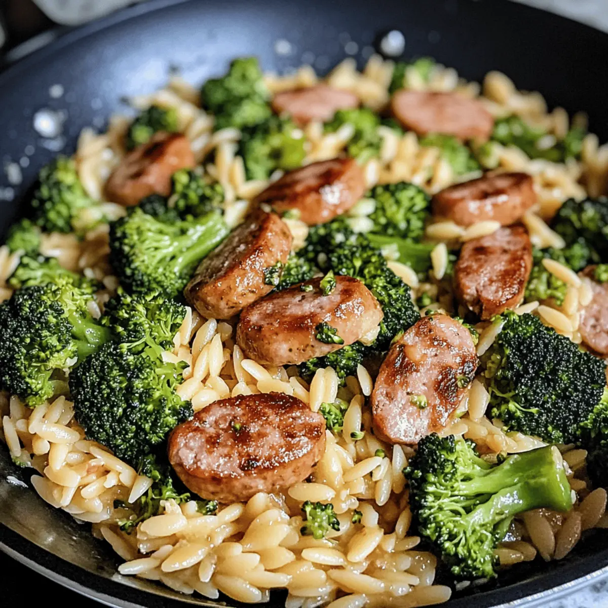 As the sun sets and the aroma of sautéing garlic wafts through the kitchen, I find myself eagerly anticipating dinner. Tonight, I’m whipping up a vibrant Chicken Sausage, Broccoli, and Orzo Skillet—a one-pan meal that offers both speed and flavor without compromising on comfort. In just 30 minutes, this delightful dish combines juicy chicken sausage, tender orzo, and nutritious broccoli into a satisfying experience that’s sure to please everyone at the table. With its versatility for meal prep and the ability to accommodate various taste preferences, this recipe is bound to become a favorite in your weeknight rotation. Have you ever imagined how easy it can be to create a wholesome meal with just one skillet? Let’s dive into the details! Why Choose This One-Pan Meal? Simplicity at Its Finest: This Chicken Sausage, Broccoli, and Orzo Skillet requires minimal prep and cleanup, making it ideal for busy weeknights or meal prep planning. Flavor Explosion: The juicy chicken sausage paired with fresh broccoli and tender orzo brings a medley of flavors that tantalize the taste buds, satisfying both comfort food cravings and healthy eating. Versatile and Customizable: With variations including Mediterranean or Vegetarian options, this dish accommodates various dietary needs, making it perfect for serving family and friends with different tastes. Quick and Convenient: Ready in just 30 minutes, you can enjoy a wholesome meal without the wait, allowing more time to unwind after a long day. Crowd-Pleaser: This hearty skillet meal is a hit with both kids and adults, ensuring that dinner is something everyone can get excited about, perfect for pairing with a simple arugula salad or crusty bread. Experience how easy weeknight cooking can be with this delicious recipe that surely won’t disappoint! Chicken Sausage, Broccoli, and Orzo Skillet Ingredients • Gather everything you need for this delicious one-pan meal! For the Skillet Chicken Sausage – Provides lean protein and rich flavor; pre-cooked variety is best for convenience. Orzo Pasta – Serves as the pasta base, cooking quickly to create a hearty texture; substitute with small pasta shapes or rice if unavailable. Broccoli – Adds color, nutrients, and a slight crunch; fresh is preferred, but frozen works with a bit of adjustment. Onion – Offers sweetness and depth of flavor when sautéed. Garlic – Adds aromatic flavor and enhances overall taste. Chicken Broth – Provides moisture and depth; can be replaced with vegetable broth for a vegetarian version. Olive Oil – Used for sautéing, adds richness. Italian Seasoning – Enhances flavor profile; may be tailored to taste preferences. Red Pepper Flakes (optional) – Adds a hint of heat for those who like a little spice. Parmesan Cheese – Adds creaminess and savory depth to the Chicken Sausage, Broccoli, and Orzo Skillet. Lemon Juice – Brightens the dish with acidity; enhances flavors. Salt and Black Pepper – Essential for seasoning. Fresh Parsley (for garnish) – Adds freshness and a pop of color to your meal. Step‑by‑Step Instructions for Chicken Sausage, Broccoli, and Orzo Skillet Step 1: Sauté Sausage Heat a large skillet over medium heat and add a drizzle of olive oil. Once hot, add the sliced chicken sausage and cook for about 3-4 minutes until golden brown on the edges. Stir occasionally to ensure even cooking, then remove the sausage from the skillet and set it aside, leaving the flavorful bits in the pan. Step 2: Aromatics In the same skillet, add a bit more olive oil if necessary and toss in the diced onion. Sauté for 2-3 minutes until the onion becomes translucent and fragrant. Stir in the minced garlic along with Italian seasoning and a pinch of red pepper flakes if desired. Cook for an additional 30 seconds, allowing the aromatic flavors to bloom. Step 3: Toast and Cook Orzo Now, stir in the orzo, coating it in the oil and allowing it to toast for 1-2 minutes. This step enhances the flavor and texture of the pasta. Then, pour in the chicken broth, bring it to a simmer, and cover the skillet. Let it cook for about 8 minutes until the orzo is tender and most of the liquid has been absorbed. Step 4: Add Broccoli & Sausage After the orzo has cooked, uncover the skillet and fold in the broccoli florets along with the previously sautéed chicken sausage. Cover again and cook for an additional 4-5 minutes, allowing the broccoli to steam until it’s tender-crisp while the sausage heats through. Keep an eye on it, ensuring the broccoli maintains its vibrant green color. Step 5: Finish Remove the skillet from heat and stir in freshly grated Parmesan cheese and lemon juice for a bright, creamy finish. Taste your Chicken Sausage, Broccoli, and Orzo Skillet and season with salt and black pepper to your liking. For a final touch, garnish with freshly chopped parsley, adding a pop of color and freshness to your delightful one-pan meal. What to Serve with Chicken Sausage, Broccoli, and Orzo Skillet Creating a memorable meal is easy when you have the perfect pairings to complement your skillet dish. Crusty Garlic Bread: The crispy exterior and soft inside make this a wonderful addition, perfect for soaking up the creamy flavors. Simple Arugula Salad: Tossed with lemon vinaigrette, this salad adds a peppery freshness that balances the richness of the skillet. Roasted Sweet Potatoes: Their natural sweetness and caramelization contrast beautifully with the savory sausage, creating a delightful flavor profile. Lemon Herb Couscous: Light and zesty, this side dish echoes the lemon you used in the skillet while adding a fluffy texture to your meal. Red Wine or Sparkling Water: A glass of red wine enhances the savory aspects of the dish, while sparkling water adds a refreshing touch for varied guests. Cheesy Garlic Stuffed Mushrooms: These can serve as delightful appetizers, their richness pairing wonderfully with the hearty orzo and sausage. With these pairings, you can easil
