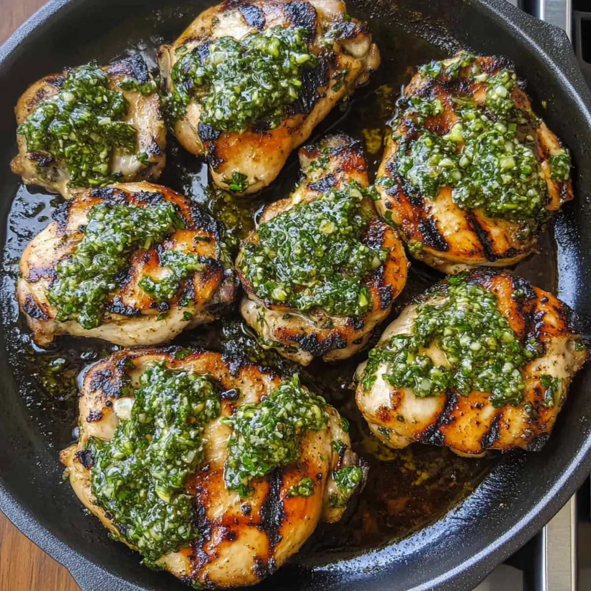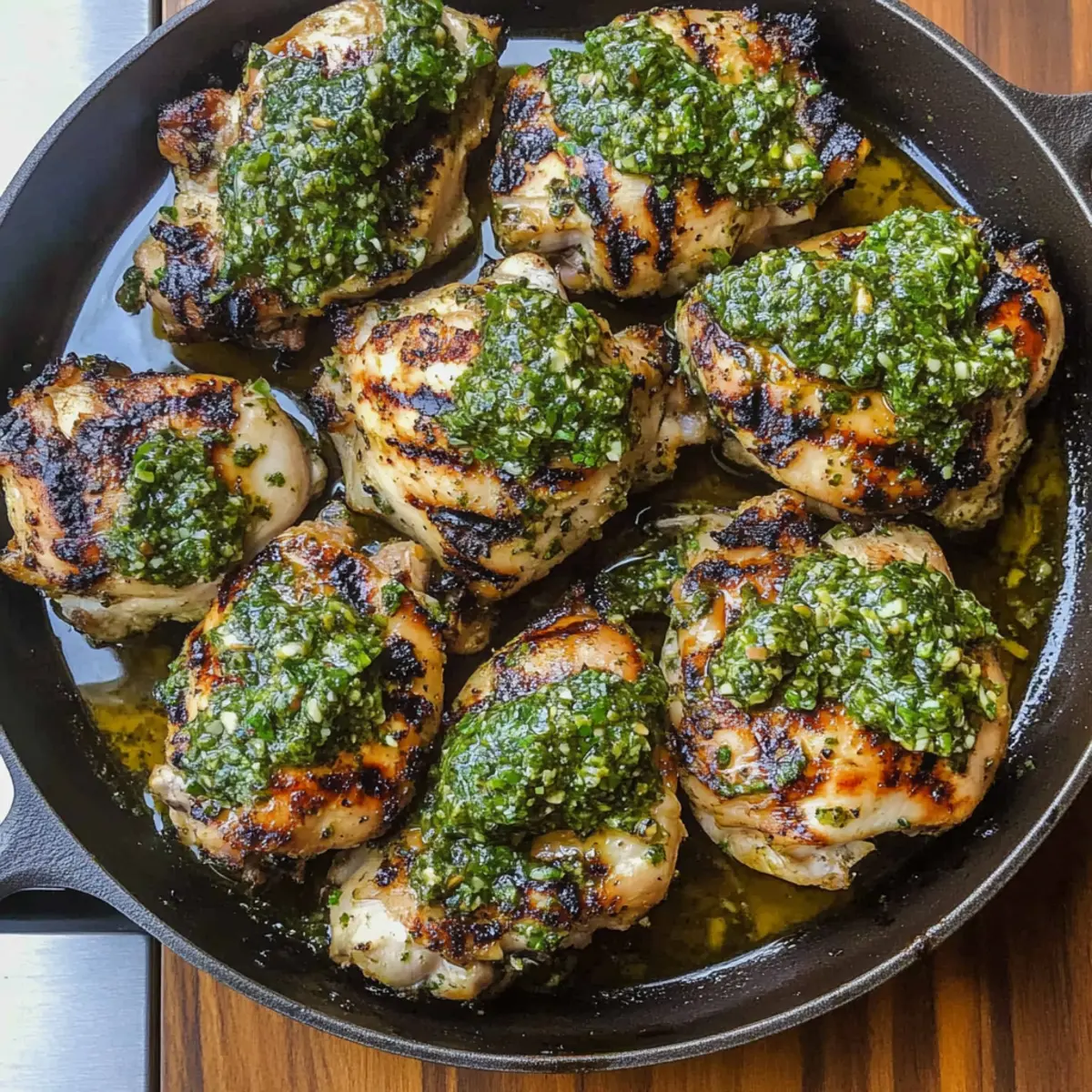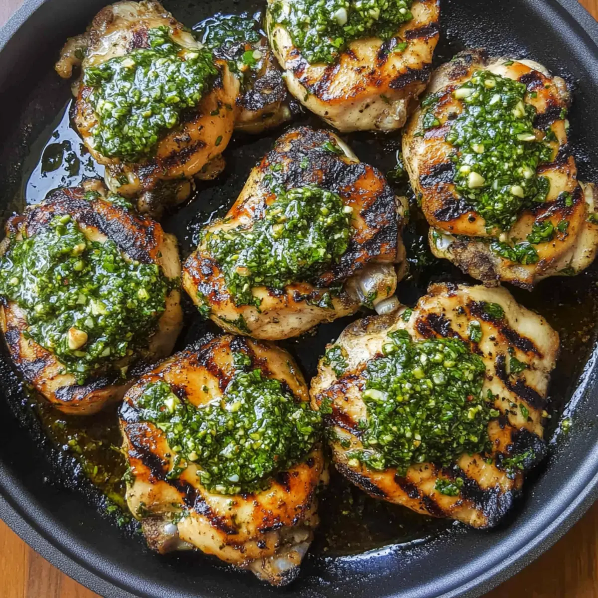Chimichurri Chicken is a flavorful dish featuring juicy grilled chicken thighs topped with a vibrant chimichurri sauce.