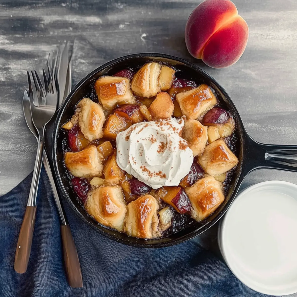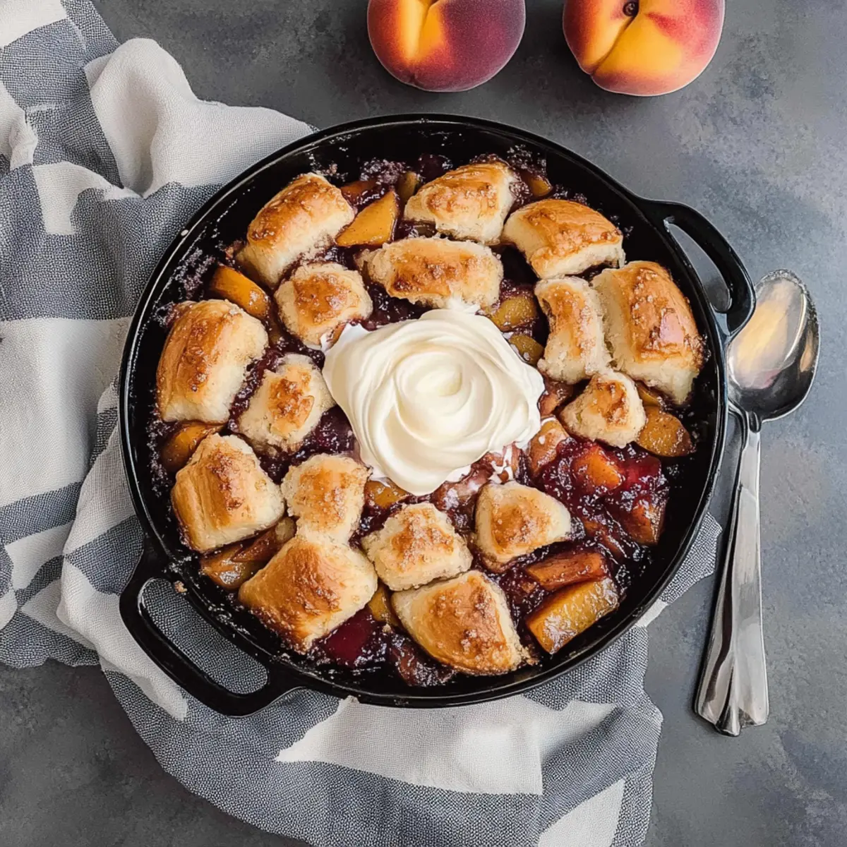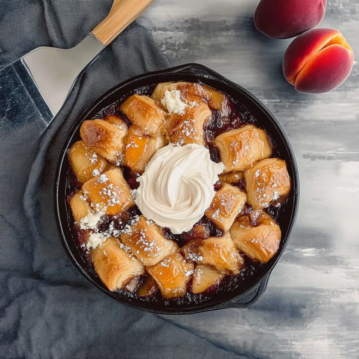 As the sun rises higher and the warm days stretch on, there’s nothing quite like the aroma of fresh peaches wafting through the kitchen. This is the essence of my Cinnamon Roll Peach Cobbler, blending the sweetness of ripe, juicy peaches with the soft, gooey delight of cinnamon rolls. It’s a simple recipe that guarantees satisfaction and minimal fuss, making it an instant favorite for summer brunches or cozy family desserts. With its irresistible, crowd-pleasing qualities and the added bonus of using wholesome, fresh fruit, this dish becomes an easy go-to whenever I want to impress without stressing. So, are you ready to bring a slice of summer to your table? Why is this Peach Cobbler a Must-Try? Juicy Freshness: Utilizing ripe peaches gives this cobbler a burst of natural sweetness that store-bought desserts can’t match. Effortless Delight: The straightforward method makes it an easy addition to your brunch spread or as a cozy family dessert. Irresistible Aroma: Imagine filling your home with the warm, inviting scents of cinnamon and peaches—perfect for gatherings! Versatile Treat: Feel free to swap peaches with other fruits like berries or apples to keep things exciting, as suggested in my Peach Cobbler Cheesecake. Crowd-Pleasing: With its rich flavors and comforting textures, this dish is bound to impress guests at any summer occasion! Cinnamon Roll Peach Cobbler Ingredients For the Filling Peaches – Fresh, sliced peaches provide juiciness and natural sweetness; use ripe peaches for best flavor; canned peaches can be substituted if drained. Brown Sugar – Adds rich sweetness and a slight molasses flavor; substitute with granulated sugar if unavailable. Granulated Sugar – Enhances the sweetness, balancing the tartness of peaches; can be replaced with a sugar alternative; adjust to taste. Cornstarch – Acts as a thickener for the peach juices; use all-purpose flour as an alternative if necessary. Vanilla Extract – Infuses the dish with warm aromatic notes; use pure vanilla for best results; imitation can be an alternative. Cinnamon – Provides warm spice, complementing the peaches and rolls; consider nutmeg or pumpkin spice for a different flavor profile. Kosher Salt – Enhances overall flavor without making it salty; regular salt can be substituted; reduce the amount slightly. Nutmeg & Cardamom – These spices add complexity and warmth; adjust or omit based on personal preference. Lemon Juice – Brightens the flavor and balances sweetness; vinegar can be substituted in small amounts if lemon is not available. For the Cobbler Cinnamon Rolls – Use store-bought raw cinnamon rolls for convenience; homemade rolls can be used for a more personalized touch. Unsalted Butter – Adds richness and depth of flavor; margarine can serve as a substitute, but adjust salt accordingly. Pecans – Optional for added crunch and nutty flavor; omit if nut-free or use other nuts like walnuts. For the Frosting Cream Cheese Frosting – A rich topping made from cream cheese and confectioners’ sugar for sweetness; opt for whipped cream or vanilla ice cream as an alternative topping if desired. Step‑by‑Step Instructions for Cinnamon Roll Peach Cobbler Step 1: Preheat the Oven Begin by preheating your oven to 350°F (175°C). This temperature ensures that your Cinnamon Roll Peach Cobbler bakes evenly and achieves that delightful golden-brown crust. As the oven warms up, you can prepare the peach filling, allowing flavors to meld beautifully. Step 2: Prepare the Peach Filling In a large bowl, combine the fresh, sliced peaches with brown sugar, granulated sugar, cornstarch, vanilla extract, cinnamon, kosher salt, nutmeg, cardamom, and lemon juice. Mix thoroughly until the peaches are well-coated and the sugars dissolve. Let this delicious mixture sit for about 10 minutes to enhance the flavors and create a syrupy base for your cobbler. Step 3: Assemble the Cobbler Pour the peach mixture into a cast iron skillet or a baking dish, ensuring an even layer. Cut the store-bought cinnamon rolls into quarters and scatter them over the peach filling, creating a lovely topping. If using, sprinkle toasted pecans atop the cinnamon rolls and dot with small pieces of unsalted butter for added richness and flavor. Step 4: Bake Until Golden Place your assembled Cinnamon Roll Peach Cobbler in the preheated oven, then bake for 40–45 minutes. Watch as the cinnamon rolls puff up and turn a beautiful golden brown, while the peach juices bubble around the edges. The cobbler is done when the rolls are golden and the filling is sizzling. Step 5: Make the Cream Cheese Frosting While the cobbler bakes, prepare the cream cheese frosting. In a medium bowl, beat together cream cheese and unsalted butter until smooth and fluffy, around 3 minutes. Gradually mix in powdered sugar and vanilla extract, adjusting the consistency with a pinch of salt if necessary. Set aside to let the flavors blend. Step 6: Serve the Cobbler Once the cobbler is finished baking and has cooled slightly, serve it warm. Drizzle a generous amount of cream cheese frosting on top or enjoy it with a scoop of vanilla ice cream for a rich and indulgent experience. Your inviting Cinnamon Roll Peach Cobbler is now ready to be savored with friends and family! Expert Tips for Cinnamon Roll Peach Cobbler Ripe Peaches: Use peaches that are slightly soft to ensure a juicy and flavorful filling. Avoid overripe or hard peaches, as they won’t cook well. Prevent Sogginess: If you prefer a firmer cobbler, let the peach mixture sit for a shorter time after mixing. This keeps excess moisture from making the cinnamon rolls soggy. Adjust Sweetness: Since peach sweetness can vary, taste the filling before baking and adjust sugars as needed. You want a balanced mix with the cinnamon roll sweetness. Perfect Bake Time: Keep an eye on the cobbler during baking. If the tops of the cinnamon rolls brown too quickly, cover loosely with foil to prevent burning while the