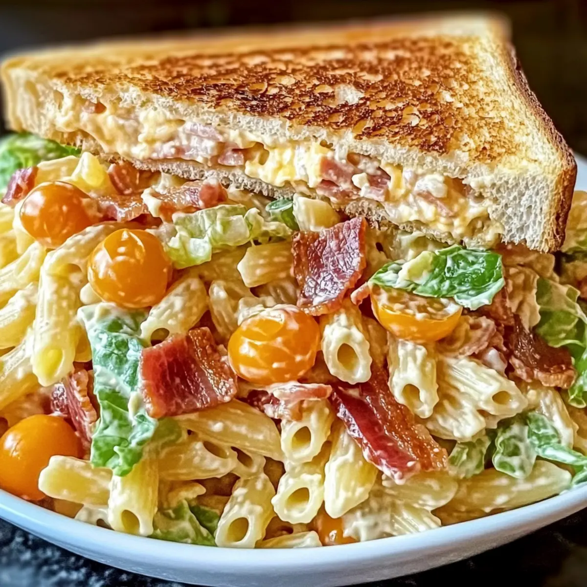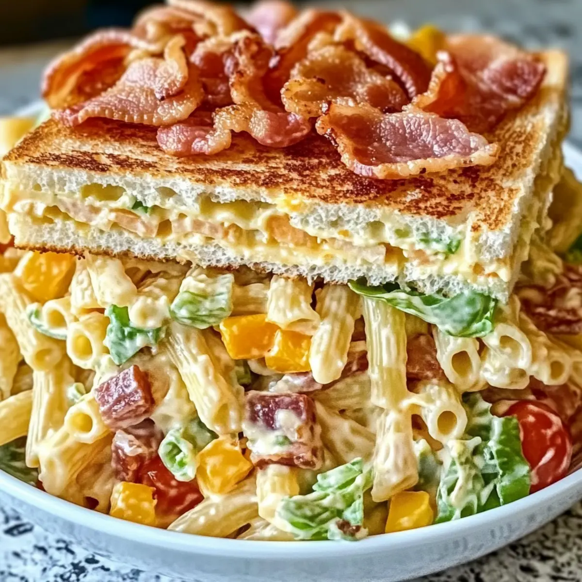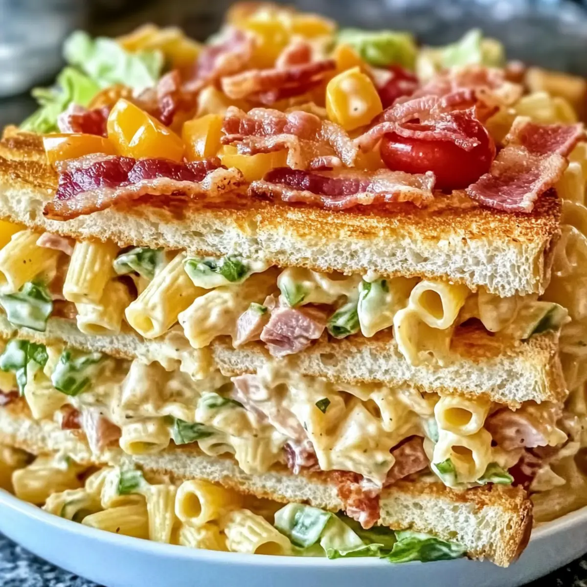 The first bite of summer is a delightful explosion of flavors in this Creamy Club Sandwich Pasta Salad. Imagine savory turkey mingling with crispy bacon, fresh lettuce, and juicy tomatoes, all nestled within perfectly cooked tri-color rotini. This recipe isn’t just a fun twist on a classic; it’s your go-to dish for outdoor gatherings and busy weeknight dinners alike. With its make-ahead convenience and crowd-pleasing charm, this pasta salad becomes the ultimate meal solution for anyone on the hunt for versatile, satisfying dishes. As vibrant as it is delicious, this salad not only fills your plate but also warms your heart. What delicious variations will you try to customize your own version? Why is this salad a must-try? Versatile enough to suit any occasion: Whether it’s a summer BBQ or a casual family dinner, this salad shines brightly on any table. Make-Ahead friendly: Prepare it in advance, making it a perfect option for busy weeks or entertaining guests. Crowd-Pleaser appeal: With its mouthwatering flavors and stunning presentation, everyone will want seconds! Plus, it’s easily customizable to cater to different dietary needs or preferences. Pair it with a refreshing Fruit Salad Refreshing or a savory grilled dish, and you’ve got a meal that’s sure to impress! Club Sandwich Pasta Salad Ingredients Get ready to dive into a world of flavors with this delicious Club Sandwich Pasta Salad! For the Pasta Tri-Color Rotini Pasta – Provides fun shapes and visual appeal; feel free to swap for whole-grain or gluten-free pasta for dietary needs. For the Salad Base Lettuce (Romaine/Green Leaf) – Adds freshness and crunch; you can substitute with baby spinach for extra nutrients. Tomatoes (Cherry or Diced) – Brings bursts of juicy flavor; grape tomatoes work well for a sweeter touch. Bacon (Cooked and Crumbled) – Gives a savory crunch; turkey bacon or a plant-based alternative is excellent too. Turkey (Deli Slices, Chopped) – Adds heartiness and protein; consider using ham or even chicken for variety. Ham (Deli Slices, Chopped) – Boosts flavor and protein; it’s optional if you want a lighter version. Cheddar Cheese (Cubed) – Contributes creaminess and flavor depth; feel free to try a dairy-free cheese as a substitute! For the Dressing Creamy Ranch Dressing (Homemade or Store-bought) – Ties everything together with rich flavors; Greek yogurt mixed with ranch seasoning is a lighter alternative. With this super easy selection of ingredients, you’re set to create a crowd-pleasing dish that’s as customizable as it is delicious. Enjoy your cooking adventure! Step‑by‑Step Instructions for Club Sandwich Pasta Salad Step 1: Cook the Pasta Bring a large pot of salted water to a boil and add the tri-color rotini pasta. Cook according to package instructions until al dente, typically 8-10 minutes. Once cooked, drain the pasta in a colander and rinse it with cold water to halt the cooking process. Set aside to cool completely before combining with the other ingredients. Step 2: Prepare the Salad Base In a spacious mixing bowl, combine the cooled pasta with chopped romaine lettuce, halved cherry tomatoes, crumbled bacon, chopped turkey, and diced ham. Toss gently to ensure the ingredients are evenly distributed, creating a colorful base for your Club Sandwich Pasta Salad. The combination of textures and flavors will enhance the dish dramatically. Step 3: Make the Dressing In a separate bowl, whisk together the creamy ranch dressing with a splash of mayonnaise until smooth and well combined. Taste the dressing and adjust the seasoning as desired. This creamy mixture will add a rich flavor that unites the ingredients in your pasta salad. Make sure it is well-blended for a consistent coating. Step 4: Combine Salad and Dressing Pour the prepared dressing over the pasta salad ingredients in the mixing bowl. Use a large spoon or spatula to gently toss everything together, ensuring that each piece is evenly coated with the creamy dressing. This step is crucial for melding the flavors of your Club Sandwich Pasta Salad, resulting in a harmonious dish. Step 5: Chill and Serve Cover the mixing bowl with plastic wrap or transfer the salad to an airtight container. Chill in the refrigerator for at least 30 minutes to allow the flavors to meld beautifully. When ready to serve, present your vibrant Club Sandwich Pasta Salad in a large platter or clear bowl to showcase its colorful ingredients, enticing everyone at the table. Make Ahead Options These Club Sandwich Pasta Salad preparations are perfect for busy home cooks! You can cook the tri-color rotini pasta and combine it with all the salad ingredients up to 24 hours in advance, allowing the flavors to blend beautifully. However, to maintain the crispness of the lettuce and prevent it from wilting, it’s best to dress the salad just before serving. For an even easier solution, you can portion the ingredients into individual containers without dressing, which will keep well in the refrigerator for up to 3 days. When ready to enjoy, simply add your creamy ranch dressing, toss gently, and you’ll have a delicious dish that tastes just as fresh and vibrant, perfect for any gathering! How to Store and Freeze Club Sandwich Pasta Salad Fridge: Store leftovers in an airtight container for up to 3 days. This ensures the flavors stay fresh while keeping the ingredients crisp. Freezer: It’s not recommended to freeze this salad, as the creamy dressing and fresh ingredients may not maintain the desired texture upon thawing. Serving: When ready to serve, toss the salad again to revive the freshness before enjoying. Dress it just before serving to prevent wilting. Make-Ahead: Feel free to prepare the Club Sandwich Pasta Salad ahead of time for busy days, but store the dressing separately until serving to maintain the integrity of the salad. Expert Tips for Club Sandwich Pasta Salad Chill Time Matters: Allow the salad to chill for at least 30 min
