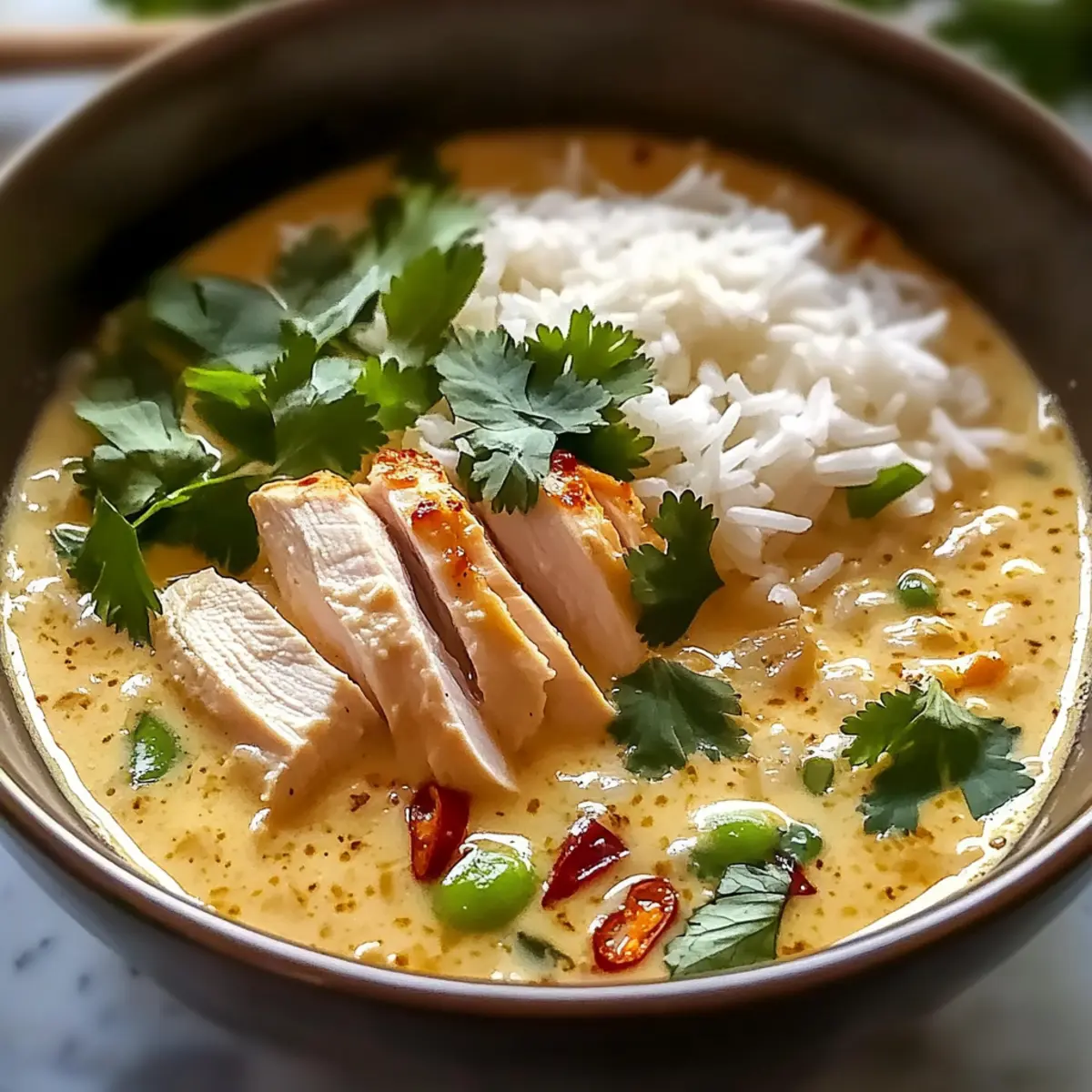 For busy home cooks, this Coconut Chicken Brothy Rice is a dream come true! You can marinate the boneless chicken thighs in a blend of coconut milk, curry powder, and spices up to 24 hours in advance—this not only infuses the chicken with delicious flavors but also ensures it stays tender when cooked. The jasmine rice can be prepared a day ahead and refrigerated; just reheat it with a splash of water to maintain its fluffy texture. To serve, simply simmer the marinated chicken in the broth and add the warmed rice; you’ll have a comforting meal ready in no time without sacrificing any quality!
