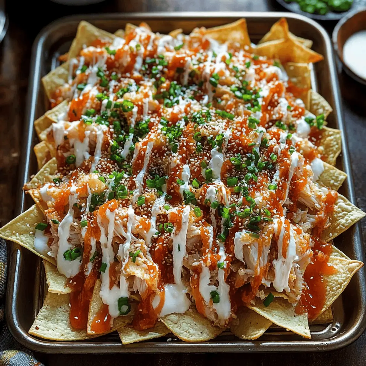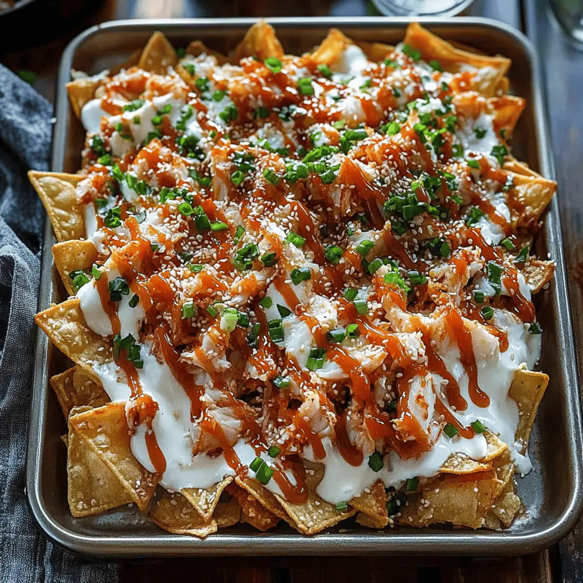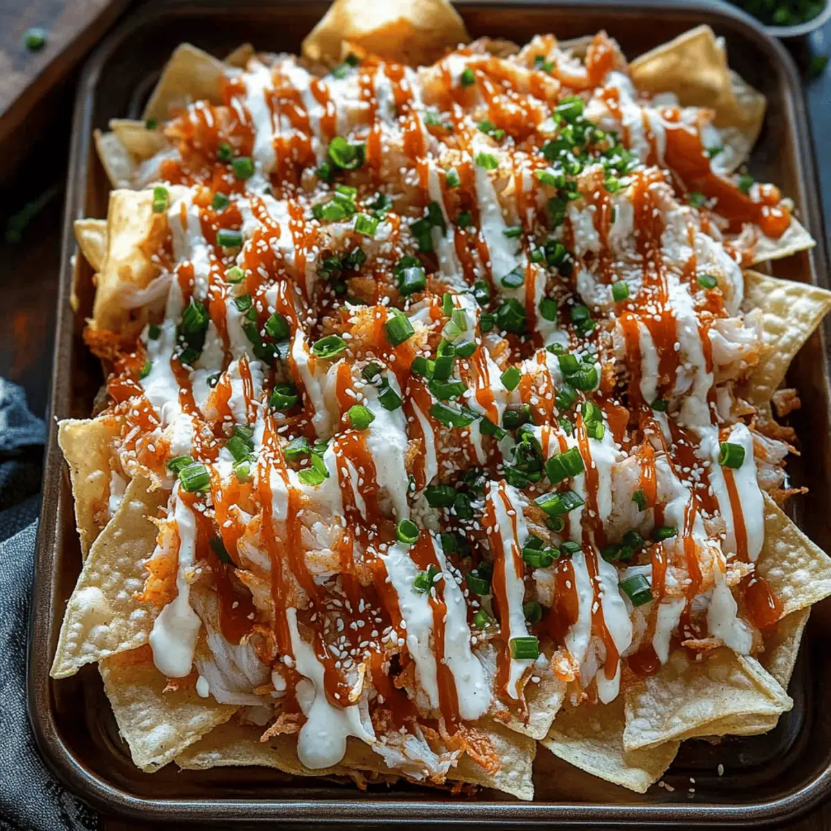 You know that moment when your snack cravings collide with your love for gourmet flavors? That’s where these Crab Rangoon Nachos come in—a delightful fusion appetizer that elevates traditional nachos to new heights. With a base of crispy homemade wonton chips and a creamy crab filling that’s impossibly easy to whip up, this dish is perfect for sharing at game day gatherings or a cozy night in. Not only do these nachos deliver that satisfying crunch, but they also cater to diverse tastes, making them a crowd-pleaser for every palate. Ready to impress your friends and family with a tantalizing twist on an old favorite? Let’s dive into this scrumptious recipe! Why are Crab Rangoon Nachos irresistible? Flavor Explosion: The combination of savory crab, creamy cheese, and sweet chili sauce creates a delightful burst of flavors with every bite. Unique Twist: These nachos reimagine a classic favorite, merging beloved crab rangoon elements with the shareable nature of nachos. Customizable: Feel free to experiment! Add spicy jalapeños or swap in your favorite cheeses for a touch of personality. Quick to Make: With simple steps and easy-to-find ingredients, even novice cooks can impress their guests effortlessly. Perfect for Any Occasion: From game day to casual gatherings, these nachos appeal to both adventurous foodies and traditionalists alike. Don’t forget to check out our Shrimp Crab Bomb for more exciting fusion ideas! Crab Rangoon Nachos Ingredients • Dive into this easy, fusion appetizer! For the Wonton Chips Wonton wrappers – Serve as the crispy base for these nachos; you can also use store-bought tortilla chips if you’re in a hurry. Vegetable oil – Essential for frying or baking the wonton chips to achieve that perfect crunch. Garlic powder – Infuses the chips with a savory depth that’s hard to resist. Salt – Enhances the flavor of the wonton chips, ensuring every bite is tasty. For the Crab Filling Cream cheese – This creamy base adds richness to the filling; make sure it’s softened for smooth mixing. Imitation crab meat – Offers that signature crab flavor; real crab meat can elevate your dish, or substitute with finely chopped mushrooms or water chestnuts for a vegetarian option. Green onions – Introduces a fresh, mild onion flavor that brightens up the filling. Soy sauce – Adds an umami kick and saltiness to the flavor profile. Worcestershire sauce – Enhances complexity in the filling, making it irresistibly tasty. Ground ginger – Brings warmth and a touch of spice to the mix. White pepper – Provides subtle heat without being overwhelming. For the Toppings Shredded mozzarella cheese – Melts beautifully for a gooey cheese layer on top of the nachos. Shredded cheddar cheese – Adds a sharp flavor that perfectly complements the creamy filling. Sweet chili sauce – Drizzle on top for a sweet and spicy finish that ties everything together. Sesame seeds – Optional, but they add a delightful crunch and visual flair to the dish. Let’s embark on this delectable journey of homemade Crab Rangoon Nachos that’s sure to impress your guests and satisfy those snack cravings! Step‑by‑Step Instructions for Crab Rangoon Nachos Step 1: Prepare Wonton Chips Start by cutting your wonton wrappers into triangles or squares to create a base for your Crab Rangoon Nachos. Toss the pieces in a bowl with vegetable oil, garlic powder, and a sprinkle of salt for flavor. Make sure each piece is evenly coated to enhance crispiness during baking. Step 2: Bake Chips Preheat your oven to 375°F (190°C). Spread the seasoned wonton wrappers in a single layer on a baking sheet, ensuring they don’t overlap. Bake them for 5-7 minutes until they turn golden brown and crunchy. Keep an eye on them; remove when crispy, and let them cool to maintain their texture. Step 3: Make Crab Filling In a mixing bowl, combine the softened cream cheese with chopped imitation crab meat, chopped green onions, soy sauce, Worcestershire sauce, garlic powder, ground ginger, and white pepper. Stir until the mixture is smooth and creamy, making sure to adjust the flavors according to your taste. This filling will be the star of your Crab Rangoon Nachos. Step 4: Assemble Nachos Lower the oven temperature to 350°F (175°C). On a baking sheet, layer your crispy wonton chips. Spoon generous dollops of the crab filling over the chips, then sprinkle a blend of shredded mozzarella and cheddar cheese on top. This creates the gooey, cheesy goodness everyone loves in nachos. Step 5: Bake Nachos Place the assembled nachos in the oven and bake for 5-7 minutes or until the cheese is fully melted and bubbly. Watch closely for that perfect melt, and remove them from the oven when you see golden cheese stretching from the nachos! Step 6: Finish & Serve Drizzle your creation with sweet chili sauce and garnish with extra chopped green onions and sesame seeds, if desired. These Crab Rangoon Nachos are best enjoyed immediately while they’re hot and cheesy, making them the ultimate crowd-pleasing appetizer for any gathering. What to Serve with Crab Rangoon Nachos? Elevate your meal experience with delicious pairings that complement the savory goodness of these crispy, creamy nachos. Spicy Chicken Wings: These flavorful wings add a kick that contrasts beautifully with the creaminess of the nachos. Garlic Butter Edamame: A light and refreshing side that provides a satisfying crunch, enhancing the overall texture of your spread. Crisp Salad with Sesame Dressing: A fresh salad balances the richness of the nachos, offering a burst of flavor and color on the plate. Creamy Avocado Dip: Smooth and rich, this dip adds another layer of creaminess and a refreshing twist that pairs wonderfully. Mango Salsa: Sweet and tangy, this salsa livens up the flavor profile and brings a tropical vibe to the table. Coconut Rice: Soft and fluffy, coconut rice adds a subtle sweetness that complements the savory nachos, making each bite