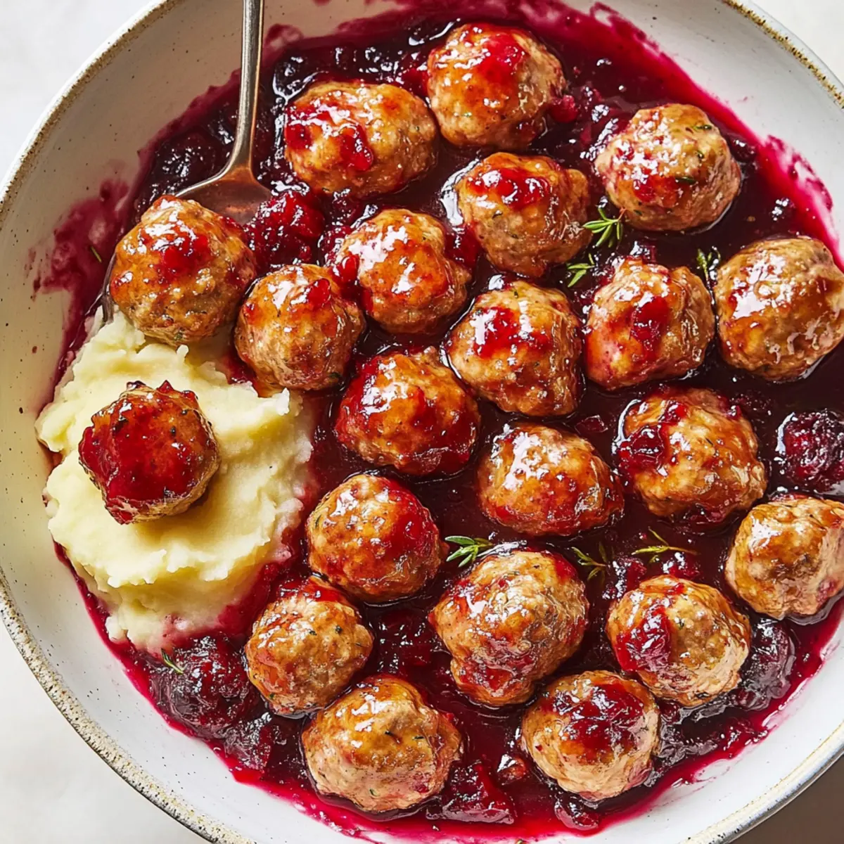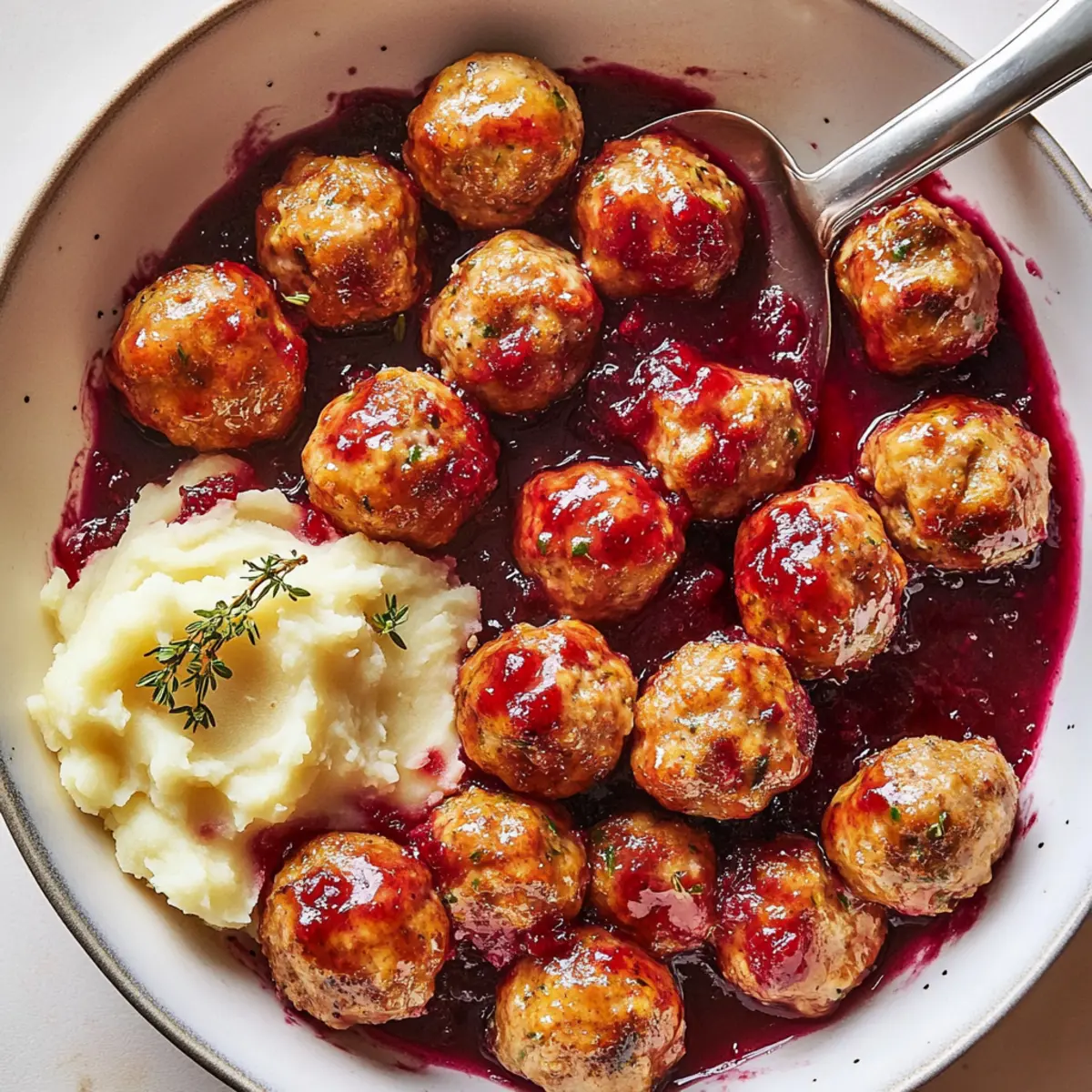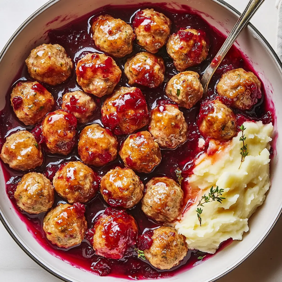 As the leaves begin to change and a crispness fills the air, nothing signals autumn quite like the warm embrace of a hearty meal. Enter my Savory-Sweet Cranberry-Glazed Turkey Meatballs—an easy, healthy dish that pairs lean turkey with a vibrant cranberry glaze. Not only are these meatballs a delicious way to celebrate the season, but they are also quick to prepare, making weeknight dinners a breeze for any busy home chef. Picture these tender meatballs generously coated in a sweet-tangy glaze, served alongside fluffy mashed potatoes, creating a cozy meal perfect for chilly evenings. Are you ready to elevate your fall dining experience with a touch of sweet nostalgia? Let me guide you through this delightful recipe! Why are Turkey Meatballs so Special? Unique Flavor Profile: The combination of turkey and cranberry creates a deliciously unexpected twist that celebrates autumn flavors. Quick & Simple: With straightforward instructions, these meatballs are a breeze to whip up, perfect for those busy weeknights. All-in-One Meal: Served with fluffy mashed potatoes, this recipe offers a balanced dinner in one hearty dish, delighting the whole family. Healthy Twist: Lean turkey keeps this dish light and lower in calories, ensuring you can enjoy a guilt-free meal. Versatile Options: Feel free to experiment by swapping turkey with lean beef or chicken, or add nuts for an extra crunch, just like in my Italian Meatballs Savory recipe. Ready to indulge in this cozy delight? Let’s get cooking! Cranberry-Glazed Turkey Meatballs Ingredients Get ready to savor a dish that blends comfort and flavor sensationally! For the Meatballs • Large Egg – Binds the mixture together; essential for maintaining moisture. • Finely Chopped Yellow Onion – Adds sweetness and moisture; try shallots as a substitute if you’re out. • Whole-Fat Greek Yogurt – Keeps meatballs juicy; sour cream works in a pinch. • Chopped Fresh Thyme Leaves – Provides earthy flavor; dried thyme can substitute but reduce the amount. • Chopped Fresh Sage Leaves – Infuses a classic herbaceous note; use half the amount of dried sage if needed. • Worcestershire Sauce – Enhances depth and umami; coconut aminos are a great soy-free alternative. • Kosher Salt – Elevates the flavor; you may use regular table salt, but do so sparingly. • Freshly Ground Black Pepper – Adds a mild kick; swap in white pepper for a different flavor profile. • Ground Turkey (94% lean) – Main protein source that keeps the dish healthy; ground chicken makes for a tasty substitute. • Panko Bread Crumbs – Gives a light texture to meatballs; you can substitute with regular bread crumbs, adjusting the amount slightly. For the Glaze • Canned or Homemade Cranberry Sauce – The star of the dish, providing sweetness; homemade is preferred for maximum flavor. • Apple Cider Vinegar – Balances the glaze with acidity; white wine vinegar can be used if necessary. • Pure Maple Syrup – Adds sweetness; feel free to swap with honey or agave syrup. • Whole Grain Mustard – Infuses tang and depth; yellow mustard is an acceptable alternative if you’re in a bind. • Finely Grated Orange Zest – Adds a bright citrus note; lemon zest can be a refreshing substitute. • Extra-Virgin Olive Oil – Essential for cooking; avocado oil can be used in its place. For Serving • Mashed Potatoes – Complements the meatballs beautifully; fluffiness is a must for a cozy meal! Now that you’re set with the ingredients, let’s roll up our sleeves and get cooking! Step‑by‑Step Instructions for Cranberry-Glazed Turkey Meatballs Step 1: Preheat the Oven Begin by preheating your oven to 400°F (200°C), ensuring it’s hot enough to cook the meatballs evenly and create a delicious texture. As the oven heats, line a baking sheet with parchment paper to prevent sticking and make cleanup a breeze later on. Step 2: Mix the Meatball Ingredients In a large mixing bowl, vigorously combine the large egg, finely chopped yellow onion, whole-fat Greek yogurt, chopped fresh thyme, chopped fresh sage, Worcestershire sauce, kosher salt, and freshly ground black pepper. Mix well until the ingredients create a cohesive blend, which will take about 2-3 minutes, ensuring each ingredient is well incorporated. Step 3: Incorporate the Turkey and Panko Gently fold in the ground turkey (94% lean) and panko bread crumbs to the mixture, being careful not to overwork it. This step is crucial for keeping your cranberry-glazed turkey meatballs tender. Mix just until everything is evenly distributed, which should take no more than a minute. Step 4: Shape the Meatballs With clean hands, take small amounts of the mixture and roll them into 1-inch meatballs, placing them on the lined baking sheet as you go. Aim for consistency in size to ensure even cooking, and you should be able to yield about 20 meatballs. Step 5: Bake the Meatballs Once shaped, place the baking sheet in the preheated oven and bake the meatballs for approximately 20 minutes, or until they are golden brown and cooked through. A meat thermometer should read at least 165°F (74°C) in the center of the meatballs to ensure they are safe to eat. Step 6: Prepare the Cranberry Glaze While the meatballs are baking, prepare the cranberry glaze by combining the canned or homemade cranberry sauce, apple cider vinegar, pure maple syrup, whole grain mustard, and finely grated orange zest in a medium saucepan. Stir continuously over medium heat until the mixture comes to a gentle simmer, allowing the flavors to meld for about 5 minutes. Step 7: Coat the Meatballs Once the meatballs are finished baking, remove them from the oven and transfer them to a large bowl. Pour the warm cranberry glaze over the meatballs and gently toss until they are fully coated in the luscious sauce. This step enhances the cranberry-glazed turkey meatballs’ flavors and visual appeal. Step 8: Serve and Enjoy For a cozy meal, serve the cranberry-gl