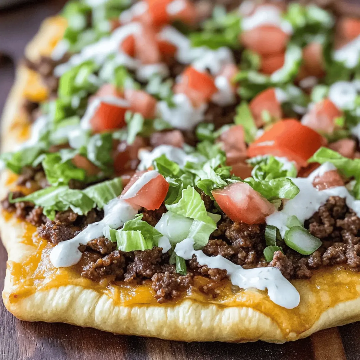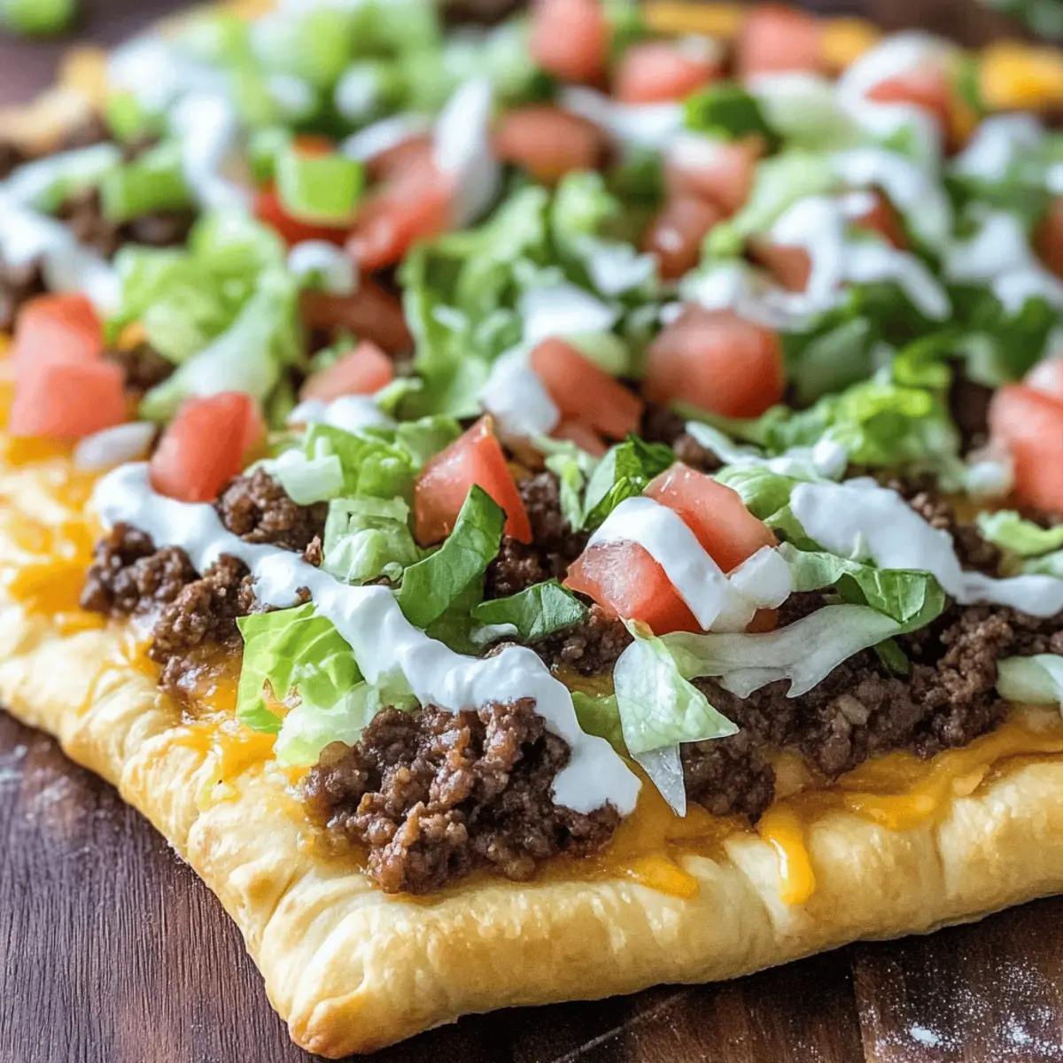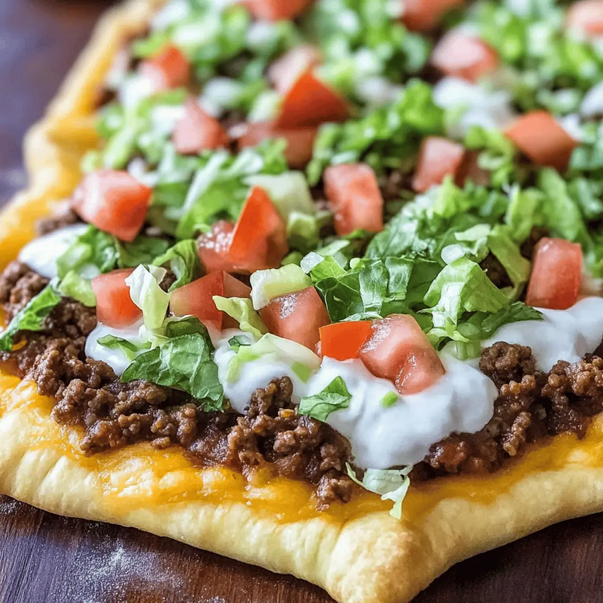 As the aroma of spices mingles with the warmth of freshly baked dough, I’m transported to my favorite taco joint, but without the long wait. This Quick & Easy Crescent Roll Taco Pizza embodies that cherished Tex-Mex vibe, making it the perfect family-friendly meal. With a flaky, buttery crust and layers of seasoned beef, creamy sauces, and colorful veggies, it truly redefines weeknight dinners. Not only is this recipe a lifesaver for busy evenings, but it’s also completely customizable to suit every palate—whether you’re looking to spice things up with jalapeños or keep it classic with just cheese and lettuce. Curious to see how this delightful twist comes together? Let’s dive into this satisfying taco pizza adventure! Why is Crescent Roll Taco Pizza a Must-Try? Unmatched Convenience: This recipe is perfect for busy weeknights, taking just 30 minutes from prep to plate. Flavor Explosion: Each bite offers a delightful mix of savory beef and zesty taco seasoning, all on a buttery crescent crust. Customizable Goodness: Add your favorite toppings; think spicy jalapeños or refreshing avocado! Family-Friendly: Everyone in the family will love this fun twist on traditional pizza—perfect for picky eaters! Simple Ingredients: With ingredients you probably have on hand, this is an easy, satisfying meal solution. For an extra kick, consider pairing it with Shrimp Tacos Mango for a full Tex-Mex experience! Crescent Roll Taco Pizza Ingredients Creating this delicious Crescent Roll Taco Pizza is a breeze with these simple ingredients! For the Crust Crescent Rolls – Perfect for a quick and flaky pizza base; store-bought options save time. For the Filling Ground Beef (80/20 blend) – Offers hearty protein and a robust flavor; turkey or plant-based options work well too. Taco Seasoning Mix – Infuses essential spices to capture that delightful Tex-Mex flavor; homemade seasoning can be a great alternative. Refried Beans – Adds a creamy layer and enhances fiber; consider black beans for a different texture. For the Sauce Sour Cream & Mayonnaise – Combines to make a tangy sauce; substitute mayonnaise with Greek yogurt for a lighter touch. Ranch Dressing Mix – Elevates the creamy flavor; feel free to skip or use a homemade ranch mix if preferred. For the Toppings Shredded Mexican Cheese Blend – Melts beautifully, bringing creaminess to each bite; you can swap with cheddar or a dairy-free alternative. Tomatoes, Lettuce, Green Onions, Black Olives – Freshen up the pizza with your favorite veggies; customize to match your family’s preferences! Now that you have all the ingredients ready, let’s get cooking and assemble our tasty Crescent Roll Taco Pizza! Step‑by‑Step Instructions for Crescent Roll Taco Pizza Step 1: Preheat the Oven Begin by preheating your oven to 375°F (190°C). While the oven heats up, prepare a large rimmed baking sheet by greasing it lightly with cooking spray or olive oil. This step is crucial to prevent the crescent roll crust from sticking, ensuring easy removal once baked to golden perfection. Step 2: Prepare the Crust Unroll the crescent rolls carefully and place them on the greased baking sheet, pinching the seams together to form one cohesive crust. Once shaped, brush a little olive oil over the top for added flavor and shine. Bake the crust in the preheated oven for 11-13 minutes, until it turns golden and starts to puff up; then let it cool completely. Step 3: Cook the Beef In a skillet over medium heat, brown the ground beef until fully cooked, about 6-8 minutes, breaking it up with a spatula. Once cooked through, drain any excess grease and return the beef to the pan. Sprinkle taco seasoning over the meat, add a splash of water, then simmer for about 5 minutes until the mixture thickens. Allow it to cool for a few minutes. Step 4: Mix the Sauce In a medium-sized bowl, combine the sour cream, mayonnaise, and ranch dressing mix. Stir well until the mixture is smooth and creamy. This tangy sauce will add a nice contrast to the savory flavors of the Crescent Roll Taco Pizza, enhancing every bite with its richness. Step 5: Assemble the Pizza Once the crescent roll crust has cooled, spread a layer of refried beans evenly across the surface, creating a creamy base. Next, top it with the seasoned ground beef mixture, spreading it out evenly to cover the beans. This will serve as the hearty foundation of your Crescent Roll Taco Pizza. Step 6: Add the Sauce and Toppings Spread the creamy sauce uniformly over the beef layer, ensuring every corner is coated. Then, sprinkle a generous layer of shredded Mexican cheese blend on top. Finally, add your desired toppings such as chopped tomatoes, crisp lettuce, sliced green onions, and black olives for a burst of freshness and color. Step 7: Serve and Enjoy Once you’ve added all your toppings, slice your delightful Crescent Roll Taco Pizza into squares. Serve it warm, and watch as your family delights in this fun, customizable dinner. For an extra touch, consider serving with salsa or guacamole on the side! What to Serve with Crescent Roll Taco Pizza? Elevate your meal experience by complementing this delightful Crescents Roll Taco Pizza with these delicious side dishes and treats. Creamy Guacamole: A refreshing dip that adds a rich, velvety texture and balances out the savory flavors of the pizza. Zesty Coleslaw: The crunch and tang from coleslaw bring a perfect contrast to the soft, buttery crust, enhancing every bite. Serve the pizza with a side of pico de gallo for a burst of freshness. The juicy tomatoes and crisp onions will cut through the richness beautifully. Spanish Rice: A warm, flavorful, and slightly spiced rice dish that pairs nicely with the Tex-Mex flavor of the pizza. Chips and Salsa: Crispy tortilla chips with your favorite salsa add an extra crunch, making it a fun and interactive meal. Sweet Corn Salad: The sweet, juicy pops of corn offer a delightful contrast to the hearty pizza, adding fr