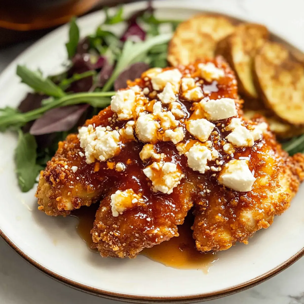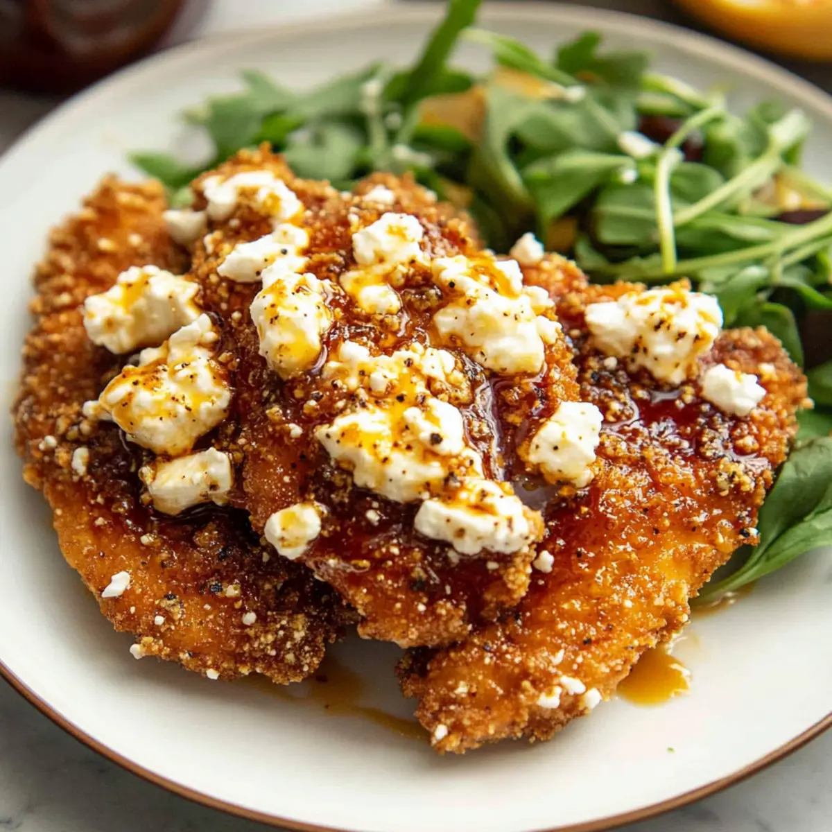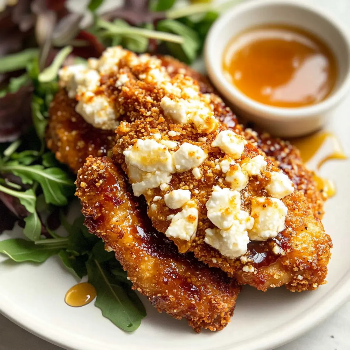 As I stood in my kitchen, the enticing aroma of crispy chicken began to fill the air—nothing beats that moment when everything starts to come together! This Crispy Hot Honey Feta Chicken is not just a meal; it’s a flavorful adventure. The magic lies in the combination of spicy, sweet, and salty elements that will have everyone at the table begging for seconds. With a delightfully crispy coating and creamy feta that perfectly complements the sticky hot honey drizzle, this dish is a true crowd-pleaser and easily one for busy weeknights. Plus, it’s a fantastic way to elevate your comfort food game while keeping things simple and family-friendly. Curiosity piqued? Let’s dive into the steps of creating this irresistible dish! Why is this chicken so irresistible? Crispy Texture: The chicken is fried to perfection, providing a satisfying crunch that contrasts beautifully with creamy feta. Flavor Explosion: Sweet hot honey gets a kick from spicy elements, creating a symphony of taste in every bite. Quick & Easy: Ready in under 30 minutes, this dish is perfect for busy weeknights! Crowd-Pleasing: Whether it’s family dinner or entertaining friends, everyone will love it—pair it with a simple salad or potato wedges for a complete meal. Versatile: Easily customize by adjusting spice levels or substituting feta with goat cheese for a twist. Trust me, once you try this Crispy Hot Honey Feta Chicken, you’ll have a new go-to recipe! Crispy Hot Honey Feta Chicken Ingredients • Dive into this delightful recipe with all the ingredients you’ll need to make your chicken truly outstanding! For the Hot Honey Sauce Honey – Provides sweetness to balance the heat; substitute with agave syrup for a vegan option. Hot Sauce – Adds tangy heat; use Frank’s or Cholula, adjusting for your preferred spice level. Chili Flakes – Contributes spiciness to the hot honey; feel free to add more if you love a kick! For the Chicken Chicken Breasts – The main protein source for a satisfying meal that everyone will love. Paprika – Enhances flavor and brings a beautiful color to the chicken. Salt – Essential for elevating the overall taste. Onion Powder – Adds a savory depth to the seasoning mix. Garlic Powder – Complements onion powder with an extra layer of flavor. Dried Oregano – Infuses herbaceous notes that brighten the dish. Black Pepper – Introduces a mild heat that enhances the flavor. Cayenne Pepper – Packs in an extra punch for those who crave spice. Plain Flour – Coats the chicken for a firm and crispy crust. Eggs – Binds the breadcrumbs to the chicken, ensuring a delightful coating. Panko Breadcrumbs – Guarantees an airy, crunchy texture that’s irresistible. Vegetable Oil – For frying; make sure it’s hot for that perfect crisp! Feta Cheese – A creamy topping that perfectly pairs with hot honey, enhancing every bite. With these ingredients at hand, you’re just a step away from creating an unforgettable Crispy Hot Honey Feta Chicken that will warm your heart and tantalize your taste buds! Step‑by‑Step Instructions for Crispy Hot Honey Feta Chicken Step 1: Prepare the Hot Honey Sauce In a small saucepan, combine honey, hot sauce, and chili flakes over low heat. Stir gently until heated through, allowing the flavors to meld for about 5 minutes. Once it’s aromatic and well blended, remove from heat and let it cool slightly. Your hot honey sauce is now ready to elevate your Crispy Hot Honey Feta Chicken! Step 2: Slice the Chicken Take your chicken breasts and, using a sharp knife, slice them horizontally to create 4 even pieces. Aim for about ½ inch thickness for uniform cooking; this will help ensure each piece fries up crispy and delicious. Set your chicken aside on a clean plate, ready to be seasoned and breaded. Step 3: Mix the Seasoning In a medium bowl, combine paprika, salt, onion powder, garlic powder, oregano, cayenne pepper, and black pepper. Mix these spices well to ensure the flavors are evenly distributed. This aromatic blend will enhance your chicken, so don’t skip this step! Set the mixture aside for the next stage of prepping your Crispy Hot Honey Feta Chicken. Step 4: Set Up the Breading Stations Create a seasoned breading station by placing flour mixed with half of your seasoning in one shallow bowl, beaten eggs in a second bowl, and Panko breadcrumbs mixed with the remaining seasoning in a third. This organized setup will streamline the coating process and help you achieve that crispy texture in no time. Step 5: Dredge the Chicken Now it’s time to bread your chicken! Take each piece of chicken, dredge it first in the flour mixture, ensuring it’s coated thoroughly, then dip it into the beaten eggs, allowing any excess to drip off. Finally, coat the chicken evenly in the Panko breadcrumbs, pressing gently to adhere. Place the breaded chicken on a tray and repeat for all pieces. Step 6: Fry the Chicken In a large skillet, heat vegetable oil over medium-high heat until hot; about 350°F is ideal. Once the oil is shimmering, gently add the breaded chicken pieces, frying them for 3–4 minutes on each side or until golden brown and crispy. Utilize tongs to turn the chicken carefully, ensuring an even and delightful crust forms. Step 7: Add the Feta and Broil Once the chicken is perfectly fried, sprinkle crumbled feta cheese generously over each piece while they’re still hot. Preheat your broiler and transfer the chicken to the oven, broiling for 2–3 minutes until the feta is bubbly and lightly golden. Keep a close eye to prevent burning, as broilers can be quite intense! Step 8: Drizzle with Hot Honey and Serve Finally, remove the chicken from the oven and generously drizzle the warm hot honey sauce over the top of each piece. Serve your Crispy Hot Honey Feta Chicken right away with your choice of sides, like a fresh salad or some crispy potato wedges, for a complete and satisfying meal. Enjoy! Make Ahead Options These Crispy Hot Honey Feta