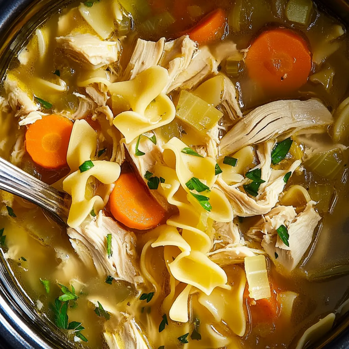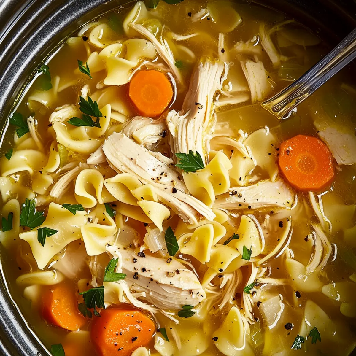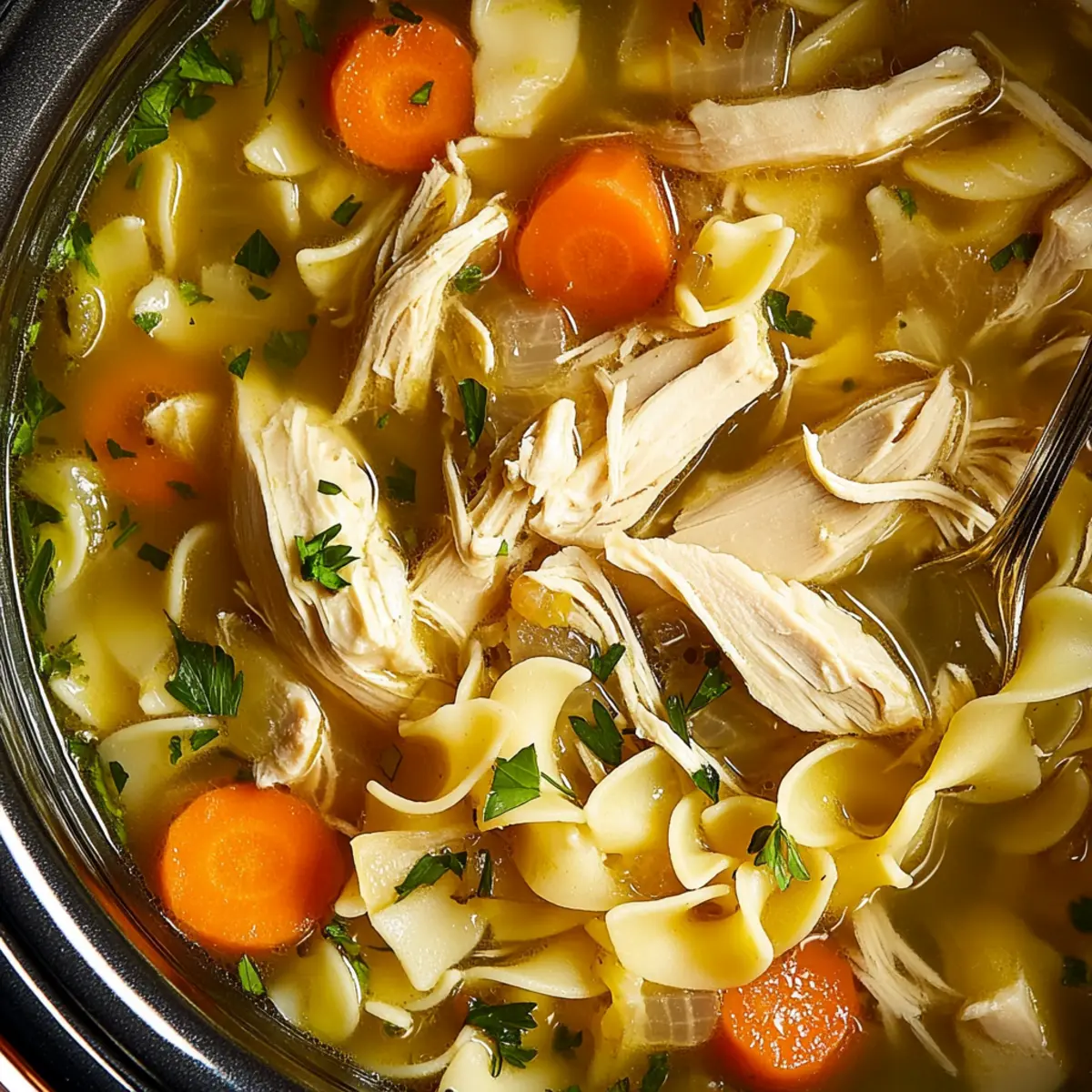 As the leaves begin to fall and the air cools down, there’s nothing quite like the sound of a simmering pot on the stove to envelop your home in cozy warmth. That’s when I turn to my beloved Slow Cooker Chicken Noodle Soup, a dish that has become my go-to for nourishing comfort food. With minimal prep, this recipe invites you to enjoy tender chicken and vibrant vegetables that meld together in a rich broth, making it perfect for those busy weeknights. Whether you’re looking for a warm hug in a bowl or a dish that brings everyone to the table, this soup ticks all the boxes. Plus, it’s a fantastic make-ahead meal that freezes like a dream! Are you ready to dive into cozy soup season? Let’s get cooking! Why is this soup so comforting? Heartwarming, there’s nothing quite like the aroma of Slow Cooker Chicken Noodle Soup wafting through your home. Effortless prep means you can toss everything in and let the magic happen while you gather your loved ones. Hearty, with tender chicken and vibrant veggies, this dish warms you from the inside out. Flexible to your taste, swap in turkey for a holiday twist or add spinach for an extra nutrient boost. Plus, it’s a time-saver that you can easily freeze for those busy nights—perfect for a comforting meal without the fuss! Crock-Pot Chicken Noodle Soup Ingredients For the Soup Base • Boneless, skinless chicken breasts – The perfect protein base requiring no pre-cooking, making it simple to shred once tender. • Large yellow onion – This adds a luscious sweetness; using a smaller amount can tone it down if desired. • Carrots (3, peeled and sliced) – They bring a natural sweetness and lovely color; fresh pairs best with this soup. • Celery ribs (2, thinly sliced) – Offers a nice crunch and distinct flavor; feel free to substitute with green beans if you prefer. • Garlic cloves (5, finely chopped) – Elevates the taste beautifully; fresh garlic will make your soup sing. • Thyme sprigs (2) – Imparts an earthy note to the broth; you can use 1/2 teaspoon of dried thyme in a pinch. • Rosemary sprigs (1) – Adds aromatic depth; replace it with 1/4 teaspoon of dried rosemary for convenience. • Bay leaf (1) – Enhances flavor but remember to remove it before serving. • Unsalted butter (3 Tbsp) – Contributes richness; olive oil is a great health-conscious swap. • Kosher salt (4 tsp) – Essential for flavor enhancement; adjust this based on your taste preferences. • Freshly ground black pepper (1 tsp) – Adds a warm kick; adjust according to your heat tolerance. • Low-sodium chicken broth (8 cups) – The liquid base of the soup; low-sodium helps you control salt levels. For the Noodles • Wide egg noodles (8 oz) – Provide that comforting, hearty texture; cook them separate to avoid mushiness in leftovers. For Garnishing • Finely chopped fresh parsley – Adds a pops of color and fresh flavor before serving. This Crock-Pot Chicken Noodle Soup is not just easy to make; it’s designed to be your gateway into a warm and cozy mealtime experience! Step‑by‑Step Instructions for Crock-Pot Chicken Noodle Soup Step 1: Prepare the Ingredients In your slow cooker, place the boneless, skinless chicken breasts along with chopped onions, sliced carrots, thinly sliced celery, and finely chopped garlic. Add the thyme and rosemary sprigs, along with a bay leaf for added flavor. To enrich the broth, toss in unsalted butter, kosher salt, and freshly ground black pepper. Stir gently to combine all the ingredients, ensuring the chicken is nestled among the veggies. Step 2: Start Cooking Cover the slow cooker and set it to High, allowing the mixture to cook for 2 hours. During this time, the chicken will become tender and fragrant while the vegetables soften. You’ll know it’s ready when the chicken is easily shredded with a fork. Keep the lid closed to maintain optimal heat, letting the flavors meld beautifully. Step 3: Add Chicken Broth After 2 hours, carefully open the slow cooker lid and pour in 8 cups of low-sodium chicken broth. Stir to incorporate the broth with all the other ingredients. Close the lid again and continue cooking on High for an additional 30 minutes. The soup will come to a delightful simmer, and the aromas will fill your kitchen with cozy warmth. Step 4: Shred the Chicken Once the cooking time is up, remove the chicken breasts from the slow cooker. Using two forks, shred the chicken into bite-sized pieces. Return the shredded chicken back to the Crock-Pot, discarding the thyme, rosemary, and bay leaf. Give it a gentle stir to evenly distribute the chicken throughout the soup, enhancing the comforting texture of your Crock-Pot Chicken Noodle Soup. Step 5: Cook the Noodles Next, add 8 ounces of wide egg noodles to your slow cooker. Cover the pot again and let the noodles cook on High for about 20 minutes, or until they are al dente. Keep an eye on them; they should be tender but still slightly firm to the bite, reassuring you of that perfect comfort food consistency. Step 6: Serve and Garnish Once the noodles are done, stir the soup one last time. Ladle the hearty Crock-Pot Chicken Noodle Soup into bowls and finish it off with a sprinkle of finely chopped fresh parsley. This will add a burst of vibrant color and freshness to each serving, making it even more inviting. Now you’re ready to serve a dish that embodies warmth and love! Variations & Substitutions for Crock-Pot Chicken Noodle Soup Feel free to get creative with your Crock-Pot Chicken Noodle Soup! With these delightful swaps and tweaks, you can make this recipe uniquely yours. Turkey Swap: Replace chicken with turkey for a delicious post-holiday version that brings a new twist to the classic. This hearty option is perfect for using up leftovers! Gluten-Free Noodles: Use gluten-free pasta in place of egg noodles for a dietary-friendly version that doesn’t compromise on comfort. Your soup will still be warm and inviting! Veggie Boost: Ad