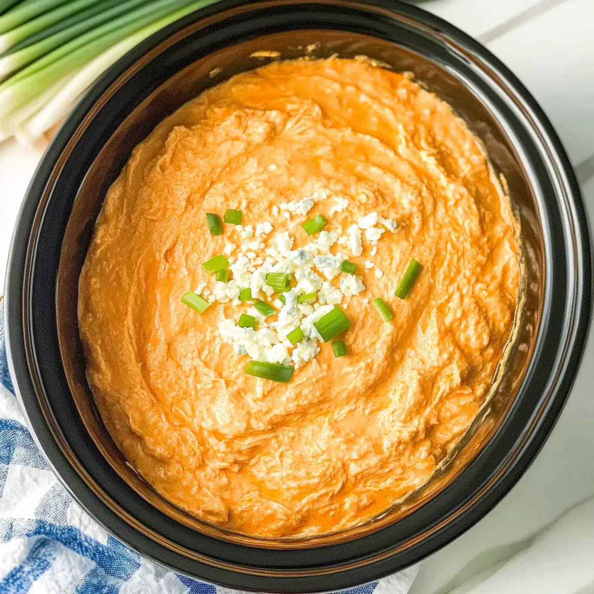 5. Once cooking is complete, stir and optionally top with crumbled blue cheese and sliced scallions before serving with dippers.