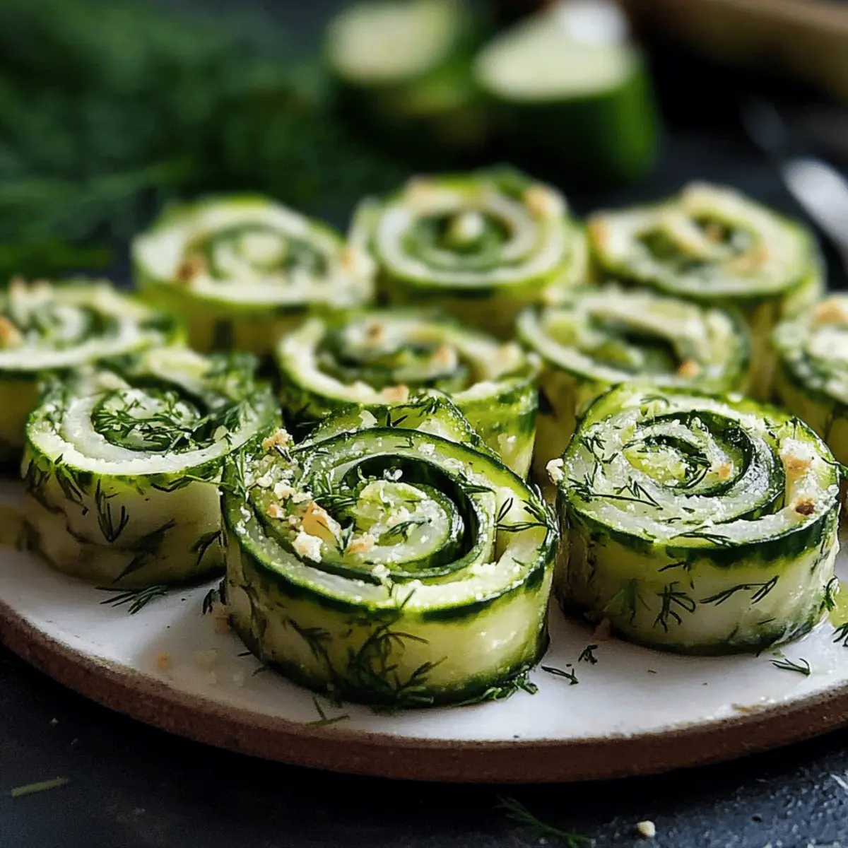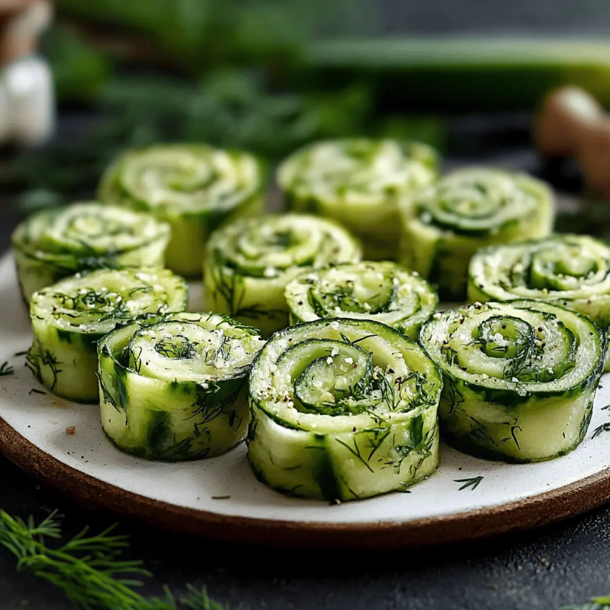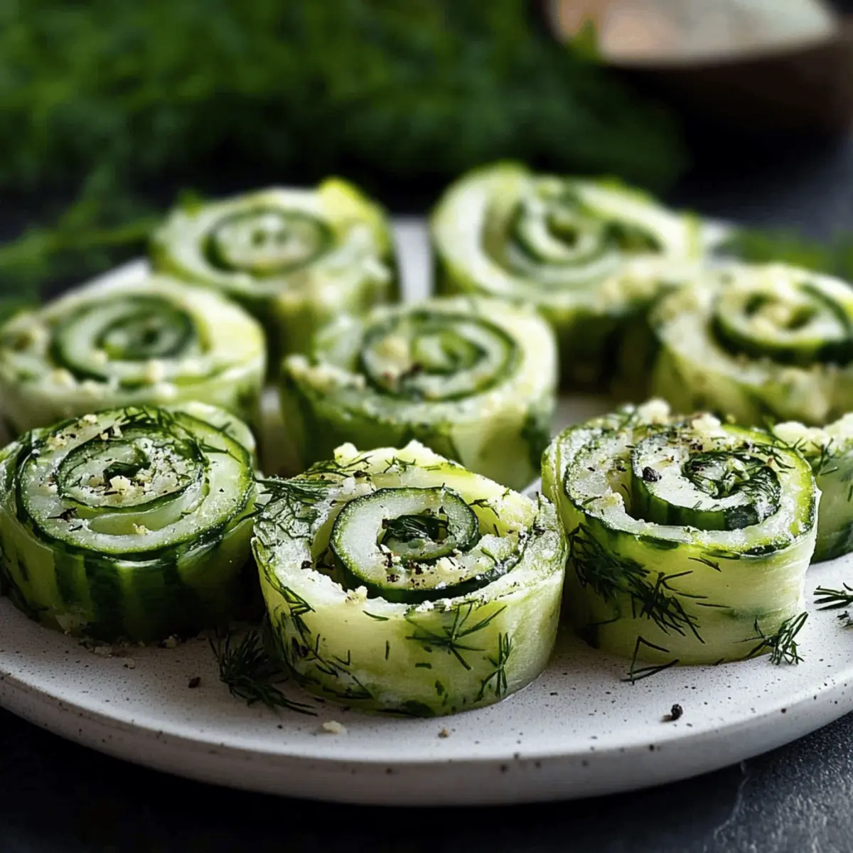 As I was flipping through my recipe notebook, I stumbled upon a delightful creation that instantly transported me to sunny picnics and vibrant gatherings: Cucumber and Dill Pinwheels. These easy-to-make appetizers are not just visually stunning—they also provide a refreshing burst of flavor that’s perfect for anyone looking to move away from fast food. Lightweight and customizable, these pinwheels come together effortlessly, making them a breeze for busy weeknights or last-minute gatherings. Picture this: crisp cucumbers enveloped in a creamy herb filling, all wrapped in soft tortillas, ready to impress your family and friends. Intrigued? Let’s dive into how to create this delicious and nutritious bite! Why Are These Pinwheels Perfect for You? Light and Healthy: Cucumber and dill pinwheels are the ultimate guilt-free delight that satisfy your cravings without weighing you down. Packed with vitamins and hydration, they are perfect for a refreshing snack or elegant appetizer. Effortlessly Customizable: Whether you prefer vegetarian options or want to add proteins like smoked salmon, the variations are endless, catering to all tastes. Quick Preparation: With just a few simple steps, you can whip these up in no time, making them ideal for those hectic weeknights or impromptu gatherings. Appealing Presentation: Their vibrant colors and bite-sized elegance make them not just a treat for the taste buds but also a feast for the eyes, guaranteed to wow your guests. Chill and Serve: Prepare these a day in advance and simply chill them! This time-saving tip allows you more freedom to enjoy your gathering stress-free. For more easy and delightful recipes, check out my Cajun Pasta Shrimp and Garlic Parmesan Skillet for your next meal! Cucumber and Dill Pinwheels Ingredients • Let’s gather what you need for these delightful bites! For the Filling Cream Cheese – Adds a creamy texture; use vegan cream cheese for a dairy-free option. Dry Ranch Seasoning – Provides an extra flavor depth; can substitute with Italian seasoning for a different taste. Fresh Dill – Imparts a refreshing, herbaceous flavor; fresh dill is brighter while dried is more potent. For the Wrap Flour Tortillas – Serve as the wrap around the filling; corn tortillas can be used for gluten-free variants. Cucumber – Adds crunch and moisture; peel and remove seeds to reduce bitterness and prevent sogginess. These ingredients come together beautifully in your Cucumber and Dill Pinwheels, creating a scrumptious treat that will be loved by all! Step‑by‑Step Instructions for Cucumber and Dill Pinwheels Step 1: Prepare the Fillings Begin by finely chopping fresh dill using a sharp knife to release its aromatic oils. Next, wash and peel a cucumber, then slice it thinly, ensuring uniform pieces for an even crunch in your Cucumber and Dill Pinwheels. In a medium bowl, mix softened cream cheese with dry ranch seasoning until you achieve a smooth, creamy texture, which should take about 1-2 minutes. Step 2: Assemble the Tortillas Lay out your flour tortillas on a clean surface or a large cutting board. Carefully spread an even layer of the cream cheese mixture across each tortilla, leaving a small border around the edges to prevent overflow. This creamy base will provide a delightful contrast to the crisp cucumbers. Aim for a thin layer, as thickness can make rolling difficult. Step 3: Add the Fresh Ingredients Sprinkle the finely chopped dill generously over each tortilla, followed by a neat layer of the thin cucumber slices. This ensures that every bite of your Cucumber and Dill Pinwheels is bursting with flavor and crunch. Feel free to adjust the amount of dill to suit your taste preferences, as it can vary in potency based on freshness. Step 4: Roll the Pinwheels Starting from one end, carefully roll each tortilla tightly into a log shape, ensuring that the fillings stay nestled within the tortilla. Use your fingers to hold the filling in as you roll, preventing any spills. Once rolled, the filled tortillas should feel snug but not overly tight, which could cause them to burst open when sliced. Step 5: Wrap and Chill Once rolled, wrap each pinwheel tightly in plastic wrap to maintain its shape and freshness. Place the wrapped pinwheels in the refrigerator, allowing them to chill for at least one hour. This step helps the fillings meld together and makes slicing easier, resulting in beautiful, clean edges when you’re ready to serve. Step 6: Slice and Serve After chilling, carefully unwrap the pinwheels and place them on a cutting board. Using a sharp knife, slice each log into bite-sized pieces, about 1 to 1.5 inches thick for an elegant presentation. Arrange the sliced pinwheels on a serving platter, showcasing their vibrant colors and textures, ready to impress your guests at your next gathering with these delightful Cucumber and Dill Pinwheels. How to Store and Freeze Cucumber and Dill Pinwheels Fridge: Keep these tasty Cucumber and Dill Pinwheels tightly wrapped in plastic wrap. They stay fresh for up to 3 days, retaining their delightful crunch and flavor. Make-Ahead: Feel free to prepare the pinwheels a day in advance. Just ensure they’re in the fridge until you’re ready to serve, allowing for easy entertaining. Freezer: For longer storage, you can freeze rolled but uncut pinwheels. Wrap them tightly in plastic and place in a freezer-safe bag for up to 2 months. Thaw in the fridge before slicing. Reheating: It’s best to enjoy these pinwheels cold. Avoid reheating, as it can compromise the texture of the cucumbers and tortillas, especially after freezing. What to Serve with Refreshing Cucumber and Dill Pinwheels These vibrant bites are perfect for light, sunny gatherings, ready to complement the colors and flavors of your table. Creamy Tzatziki Sauce: This cool, yogurt-based dip brings a refreshing taste that pairs beautifully with the crispness of cucumber. Colorful Veggie Platter: A medley of fresh vegetables 