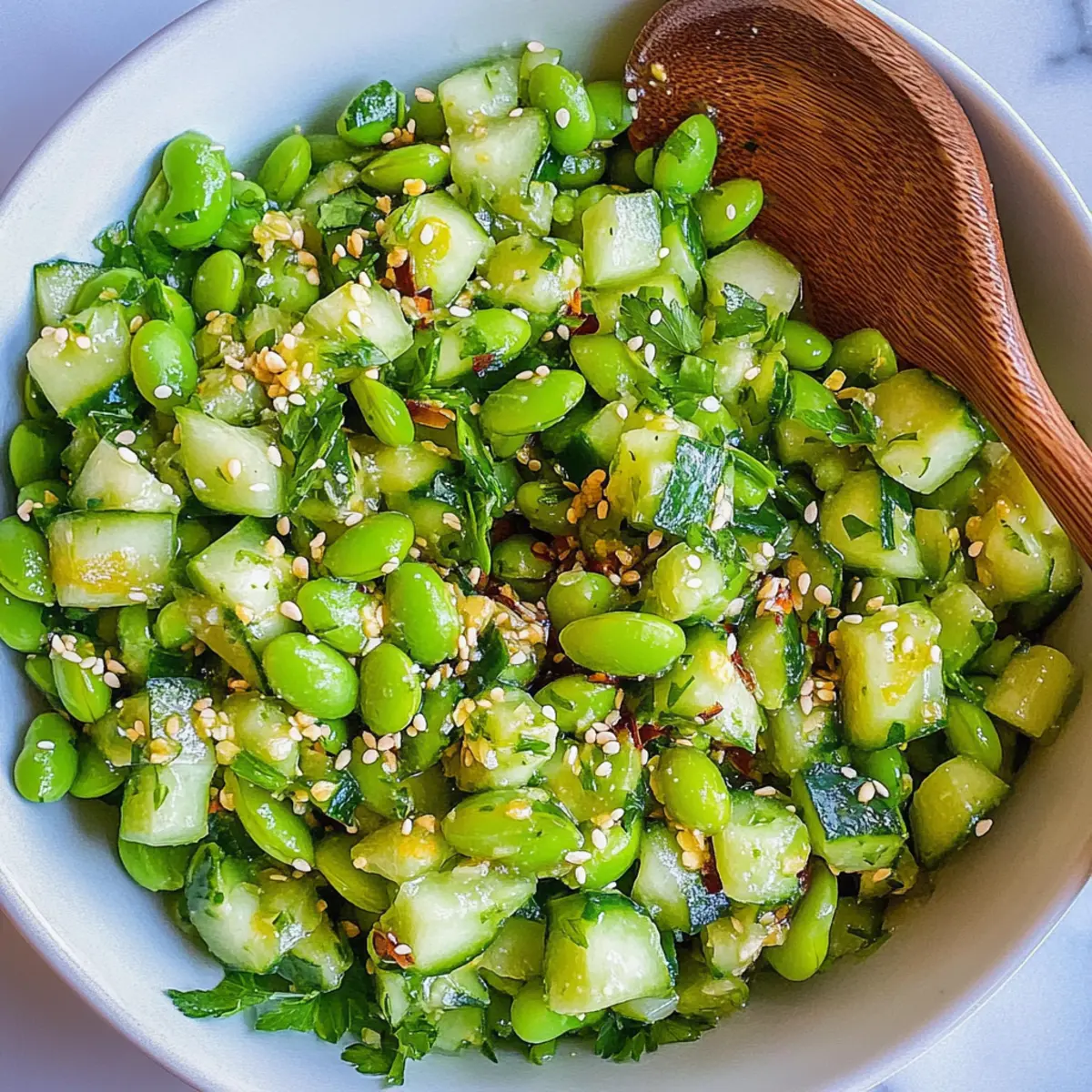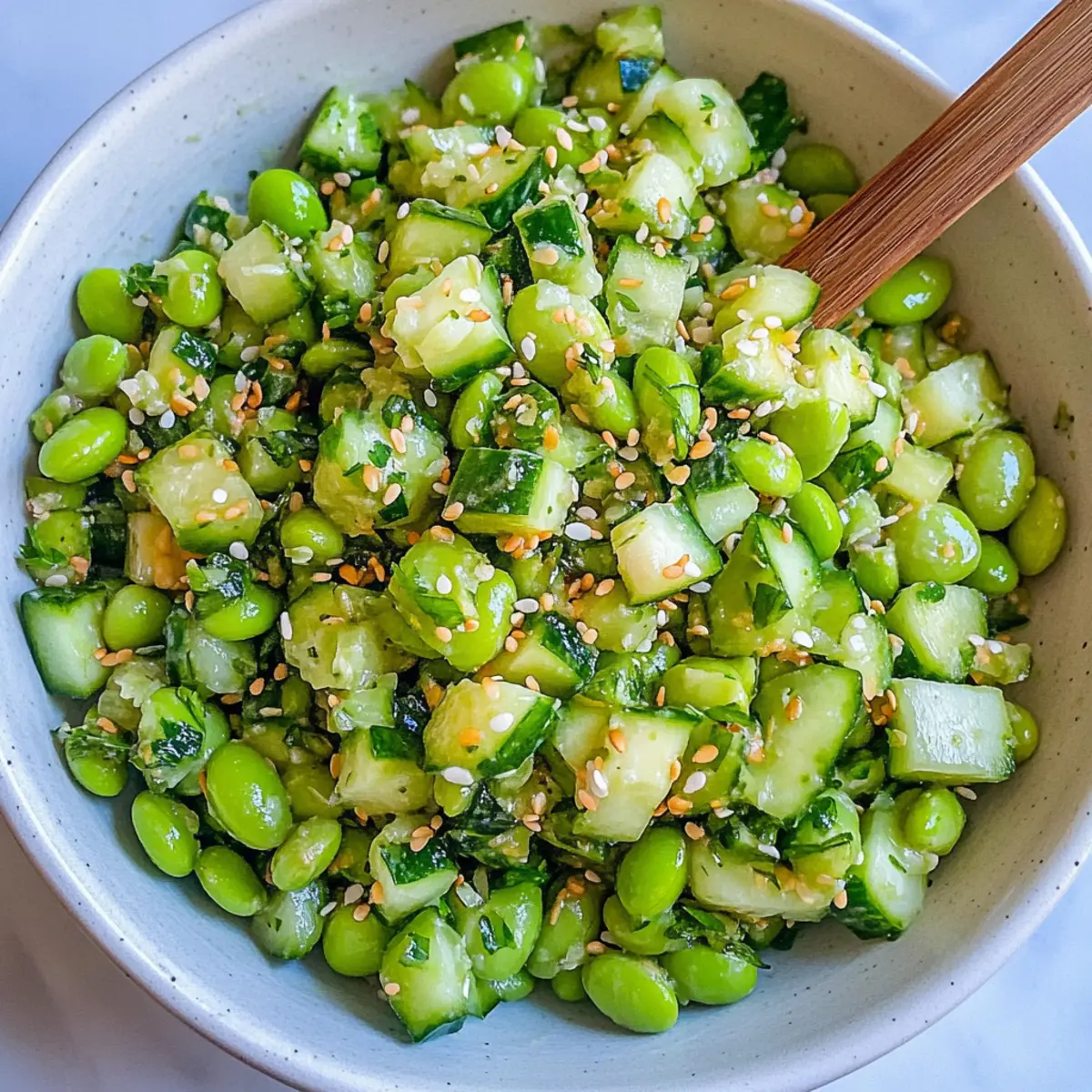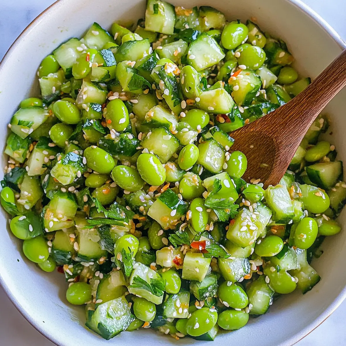 As summer days beckon us to cool off, my mind drifts to light, refreshing dishes that elevate any gathering. Enter the Cucumber Edamame Salad—a true celebration of crisp cucumbers and protein-packed edamame. This vibrant salad not only brings a burst of color to your table, but it’s also an effortless choice for those busy potluck days. With quick prep time and a zesty Asian-inspired dressing, it’s a delightful alternative to heavier dishes that often steal the show. Plus, it’s a health-conscious vegan and gluten-free option that’s sure to please any crowd! Intrigued by how this unexpected combination can shine at your next summer soirée? Let’s dive into the deliciousness! Why is this salad the perfect choice? Vibrant Colors: The mix of bright cucumbers and green edamame creates an eye-catching dish that’s perfect for presentations at gatherings. Health Benefits: Packed with protein and fiber, this salad is a nutritious choice that maintains a low-calorie profile, making it ideal for health-conscious eaters. Quick & Easy: With minimal prep time, you can whip this up in under 20 minutes, making it a go-to for busy weeknights or last-minute potlucks. Customizable: Feel free to explore variations; add colorful bell peppers or swap edamame for chickpeas to suit dietary preferences. Crowd-Pleaser: This salad’s refreshing flavors and unique dressing will captivate any audience, ensuring it’s a hit at summer parties. Looking for more refreshing options? Consider making a Fruit Salad Refreshing for an extra touch! Cucumber Edamame Salad Ingredients • Dive into flavor with this delightful Cucumber Edamame Salad! Cucumbers – These base vegetables add a refreshing crunch and hydration; English cucumbers are great for less seeds and better texture. Edamame – A source of protein and texture in the salad; substitute with chickpeas for a soy-free option. Fresh Herbs (e.g., cilantro, parsley) – Brighten the dish with these flavorful additions; feel free to use your favorite herbs based on availability. Oil – A neutral oil like vegetable oil serves as the base for the dressing, while olive oil can add an extra flavor boost. Rice Vinegar – This provides acidity to balance the flavors of the salad; apple cider vinegar is a good substitute if needed. Tamari – Opt for this gluten-free option to add umami flavor; soy sauce works well if you don’t have tamari on hand. Sesame Oil – This enhances aroma and taste; go for toasted sesame oil to add depth to the dressing. Maple Syrup – Adds a touch of sweetness; feel free to substitute with honey or omit it entirely based on preference. Garlic – Minced for aromatic flavor; adjust the quantity to suit your taste. Ginger – Freshly grated ginger gives a lovely zing; you can use ground ginger if you’re in a pinch. Chili Crunch – Adds heat and texture; sriracha or spicy chili oil can be used as alternatives, or omit it for a milder dish. Salt – Essential for enhancing flavor; adjust the amount based on your personal taste. By adding these fresh ingredients to your next gathering, you’re sure to impress with this easy-to-make Cucumber Edamame Salad! Step‑by‑Step Instructions for Cucumber Edamame Salad Step 1: Prepare the Vegetables Begin by washing 2 medium English cucumbers thoroughly under running water. Chop the cucumbers into bite-sized pieces and place them in a large mixing bowl. If using frozen edamame, cook it according to package instructions, then cool and shell the beans before adding them to the bowl with cucumbers. Step 2: Make the Dressing In a small mixing bowl, whisk together ¼ cup neutral oil, 3 tablespoons rice vinegar, 2 tablespoons tamari (or soy sauce), and 1 tablespoon toasted sesame oil. Add 1 tablespoon maple syrup, 2 minced garlic cloves, and 1 tablespoon freshly grated ginger. For a touch of heat, mix in a teaspoon of chili crunch. Ensure the dressing is well combined and emulsified, and set aside. Step 3: Toss Together Pour the freshly made dressing over the chopped cucumbers and cooked edamame. Use a spatula to gently toss the mixture together, ensuring each piece of cucumber and edamame is coated in the dressing. This step helps meld the flavors together beautifully, so make sure to mix thoroughly. Step 4: Chill & Serve Allow the Cucumber Edamame Salad to sit for at least 10-15 minutes at room temperature. For even better flavor, refrigerate for about 30 minutes to let the salad marinate and the flavors develop. Serve chilled or at room temperature, garnished with fresh herbs of your choice for an extra touch. What to Serve with Cucumber Edamame Salad? Bringing the perfect sides to complement your light and refreshing Cucumber Edamame Salad can elevate your meal into a delightful feast. Grilled Chicken Skewers: Juicy and smokey, these skewers bring a hearty protein contrast that balances the salad’s lightness. Quinoa Pilaf: A nutty and fluffy side, quinoa adds a chewy texture and earthy flavor that highlights the freshness of the salad. Fresh Corn on the Cob: Sweet and buttery, corn enhances the vibrant summer vibe while offering a satisfying crunch. Chilled Soba Noodles: With a light dressing, these noodles mirror the salad’s flavors while providing a comforting yet cool addition to the meal. Toasted Garlic Bread: The buttery garlic notes of this bread elevate your dining experience, offering a warm and savory contrast to the cool salad. Sparkling Water with Lime: A refreshing drink that quenches thirst while complementing the salad, adding a zesty finish that invites every bite. Fruit Sorbet: Delightfully sweet and icy, this dessert is perfect for a light finish after your meal, cleansing the palate beautifully. Thai Spring Rolls: These colorful rolls are filled with fresh veggies and herbs, tying in the Asian-inspired flavors of the salad and adding an enjoyable textural contrast. Mango Chutney: A sweet and spicy condiment that brings a delightful tang to your table, balancing the 
