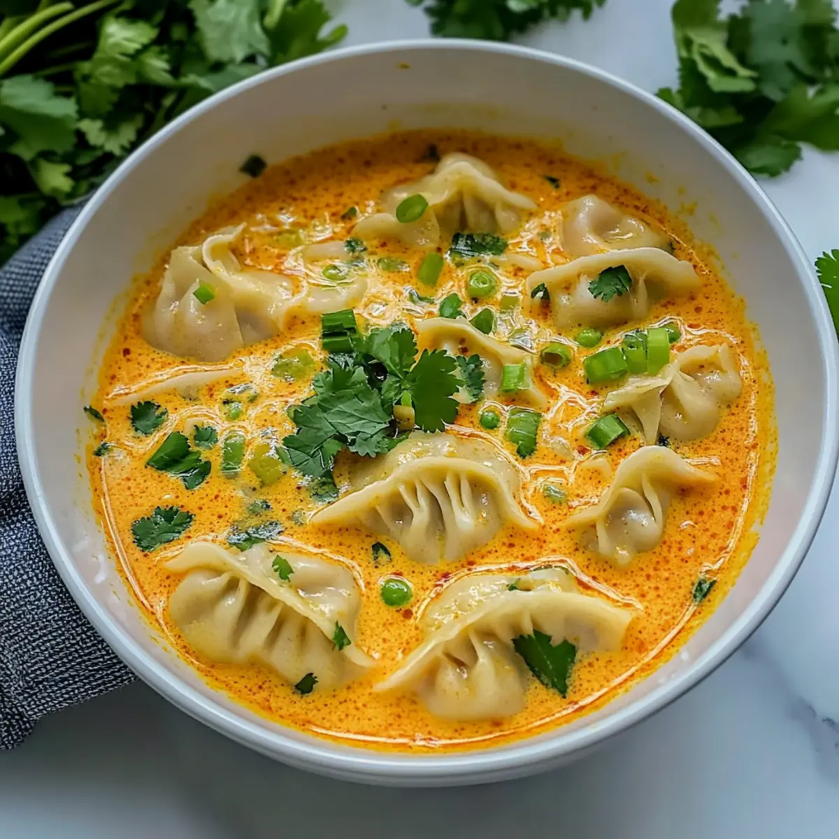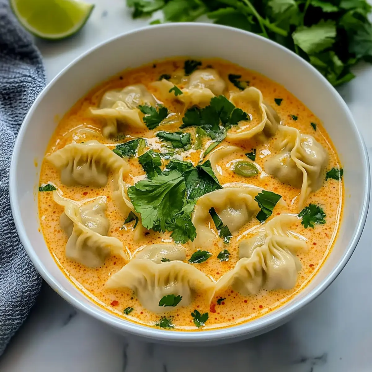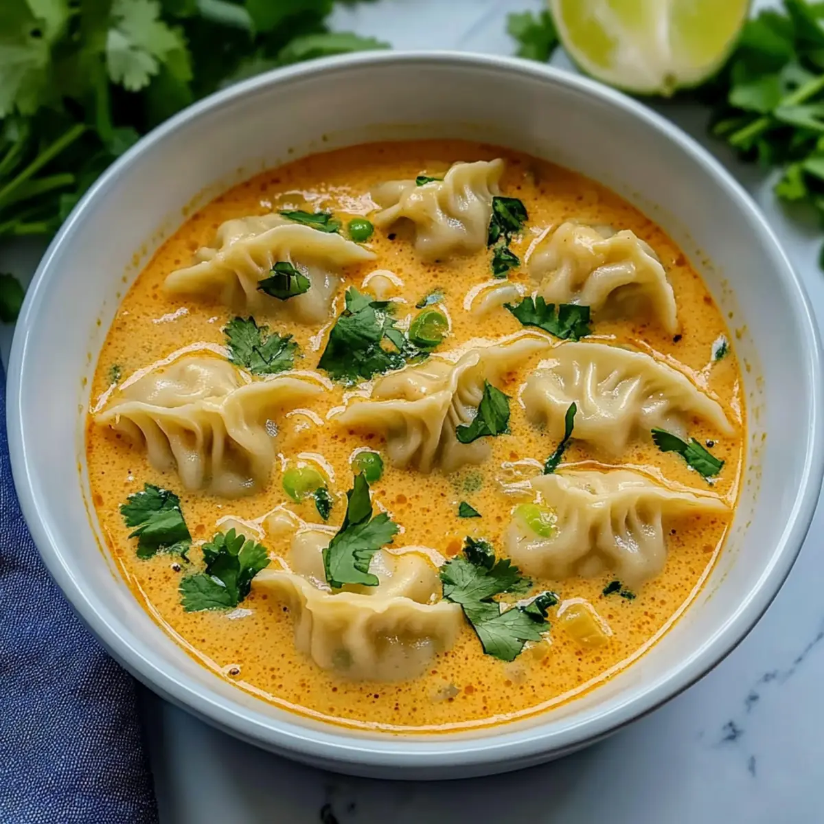 As the sun sets and temperatures dip, there’s nothing quite like a warm, aromatic bowl of soup to wrap you in comfort. Enter my Cozy Thai Curry Dumpling Soup—a delightful fusion of tender dumplings immersed in a velvety coconut curry broth that speaks to the heart of Asian-inspired cuisine. Not only is this dish a breeze to whip up in under 30 minutes, making it perfect for busy weeknights, but it’s also easily adaptable based on your pantry’s contents or personal cravings. Want a vegetarian option? Swap in some vegetable dumplings instead! Every bite offers a satisfying mix of warmth and spice, coaxing smiles from anyone gathered around the table. What’s your favorite way to serve up a cozy soup? Why Is This Soup a Must-try? Comforting Heat: Each spoonful of this cozy Thai curry dumpling soup brings a warming sensation, perfect for chilly evenings. Quick and Easy: With just 30 minutes of cook time, this meal fits seamlessly into your busy schedule without sacrificing flavor. Adaptable Ingredients: Tailor it to your taste—swap chicken for vegetable dumplings, or use any vegetables you have on hand for a personalized touch. Savory Depth: The combination of coconut milk and fish sauce lends a creamy richness that will delight your taste buds, while the fresh herbs brighten every bowl. Crowd-pleaser: Whether it’s a family dinner or a gathering of friends, this soup is sure to bring everyone together, just like a warm hug in a bowl. If you enjoy these comforting flavors, don’t forget to check out Cabbage Soup Comforting for another delightful dish! Curry Dumpling Soup Ingredients For the Broth • Oil – Use a neutral oil like vegetable or canola for sautéing the aromatics. • Onions – Provides a savory base flavor; shallots can substitute for a sweeter touch. • Thai red curry paste – This key ingredient brings vibrant spice; adjust based on your heat preference. • Ginger – Adds warming spice; fresh is best, but ground ginger works in a pinch. • Lemongrass (optional) – Enhances flavor complexity; fresh or dried works well. • Garlic – Essential for aroma; fresh is preferred, but garlic powder can do in a bind. • Chicken broth – Acts as the liquid base; vegetable broth is perfect for a vegetarian option. • Coconut milk – Adds creaminess and richness—light coconut milk is a great lower-calorie choice. • Fish sauce – Provides umami depth; soy sauce can substitute for a vegetarian twist. • Sugar – Balances flavors; brown sugar or coconut sugar can be used as alternatives. For the Dumplings • Dumplings – Use store-bought for convenience; opt for chicken or vegetable based on preference. For the Greens • Spinach – Adds color and nutrients; kale can be a hearty substitute. • Green onions & cilantro – Fresh garnishes that enhance aroma and taste; feel free to switch out for your favorite herbs. • Lime – A squeeze of lime adds a burst of acidity and freshness to the soup. Each ingredient plays a crucial role in creating this delightful Curry Dumpling Soup that warms both the heart and soul; let’s get cooking! Step‑by‑Step Instructions for Curry Dumpling Soup Step 1: Sauté Aromatics Heat 1 tablespoon of oil in a 4 to 5-quart soup pot over medium heat until it shimmers, about 2 minutes. Add 1 chopped onion, stirring frequently for about 5 minutes until softened and translucent. This flavorful base will set the stage for your cozy Curry Dumpling Soup. Step 2: Incorporate Spices Stir in 2 tablespoons of Thai red curry paste, 1 tablespoon of grated ginger, and 2 minced garlic cloves (along with optional lemongrass). Cook, stirring constantly for 1 to 2 minutes, until the mixture becomes fragrant and the oil begins to glisten. This fragrant blend infuses the broth with warmth and zest. Step 3: Create the Broth Increase the heat to medium-high and pour in 4 cups of chicken broth and 1 can of coconut milk. Stir well and bring the mixture to a low boil—watch for gentle bubbles forming at the surface. Once boiling, reduce the heat to low, allowing the soup to simmer while you prepare the dumplings. Step 4: Add Flavor Enhancers Mix in 1 tablespoon of fish sauce and 1 teaspoon of sugar into the simmering broth, stirring to combine. Taste and adjust seasoning as needed—this step adds depth and balances the flavors in your Curry Dumpling Soup beautifully, enhancing its savory profile. Step 5: Cook the Dumplings Gently add your store-bought dumplings to the pot, making sure they are evenly distributed in the broth. Simmer according to the package instructions, usually around 4-6 minutes, until the dumplings float and are cooked through. Be careful not to stir too vigorously, so they maintain their shape. Step 6: Add Greens Once the dumplings are tender, turn off the heat and fold in 2 cups of fresh spinach, along with a handful of chopped green onions and cilantro. Let the greens sit in the warm soup for a minute to wilt, enhancing the vibrant color of your comforting Curry Dumpling Soup. Step 7: Brighten with Lime Cut a lime in half and squeeze the juice from one half into the soup, stirring gently to incorporate the tartness. This final touch brightens the flavors, adding a refreshing contrast to the richness of the coconut milk, making your soup even more delightful. Step 8: Serve and Enjoy Ladle the warm Curry Dumpling Soup into bowls, garnishing with extra green onions and cilantro if desired. Serve hot, perhaps alongside jasmine rice or rice noodles for a fulfilling meal, and enjoy the cozy warmth that envelops you with each blissful spoonful. Curry Dumpling Soup Variations & Substitutions Feel free to experiment and make this cozy soup your own—it’s all about what makes your taste buds sing! Vegetarian Dumplings: Swap chicken dumplings with vegetable dumplings for a delicious vegetarian-friendly option. Let the flavors from the broth truly shine through! Curry Paste Switch: Try using different curry pastes like green or yell