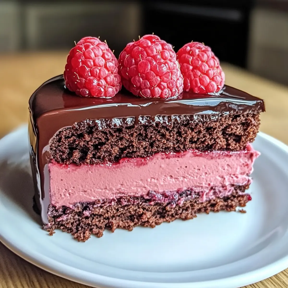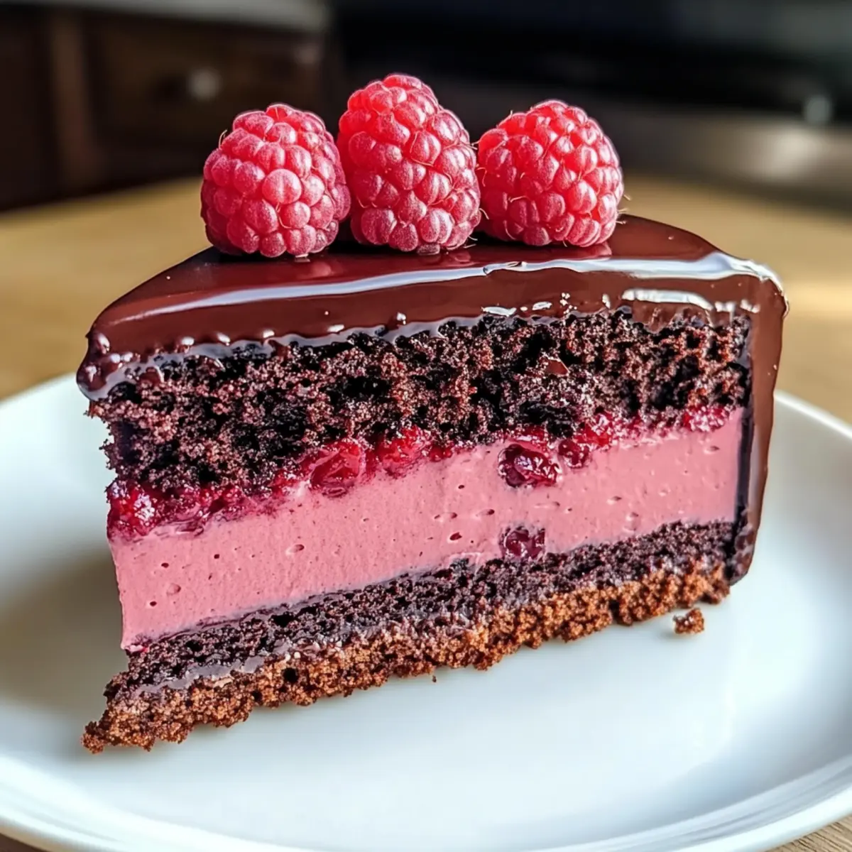 Experience the rich blend of dark chocolate and tart raspberries in this Dark Chocolate Raspberry Mousse Cake, perfect for special occasions.