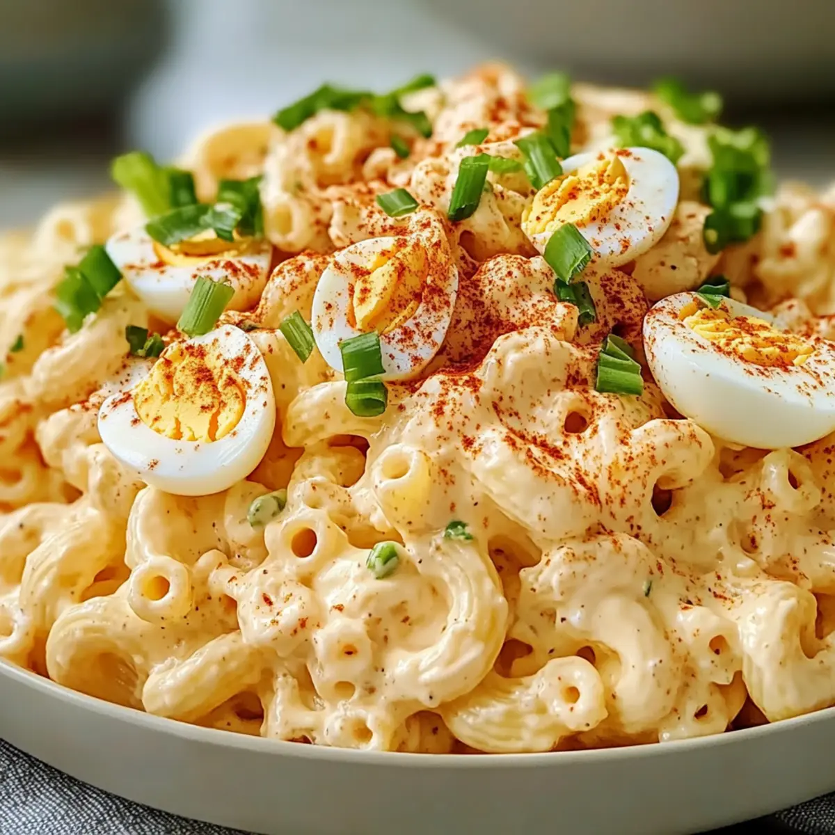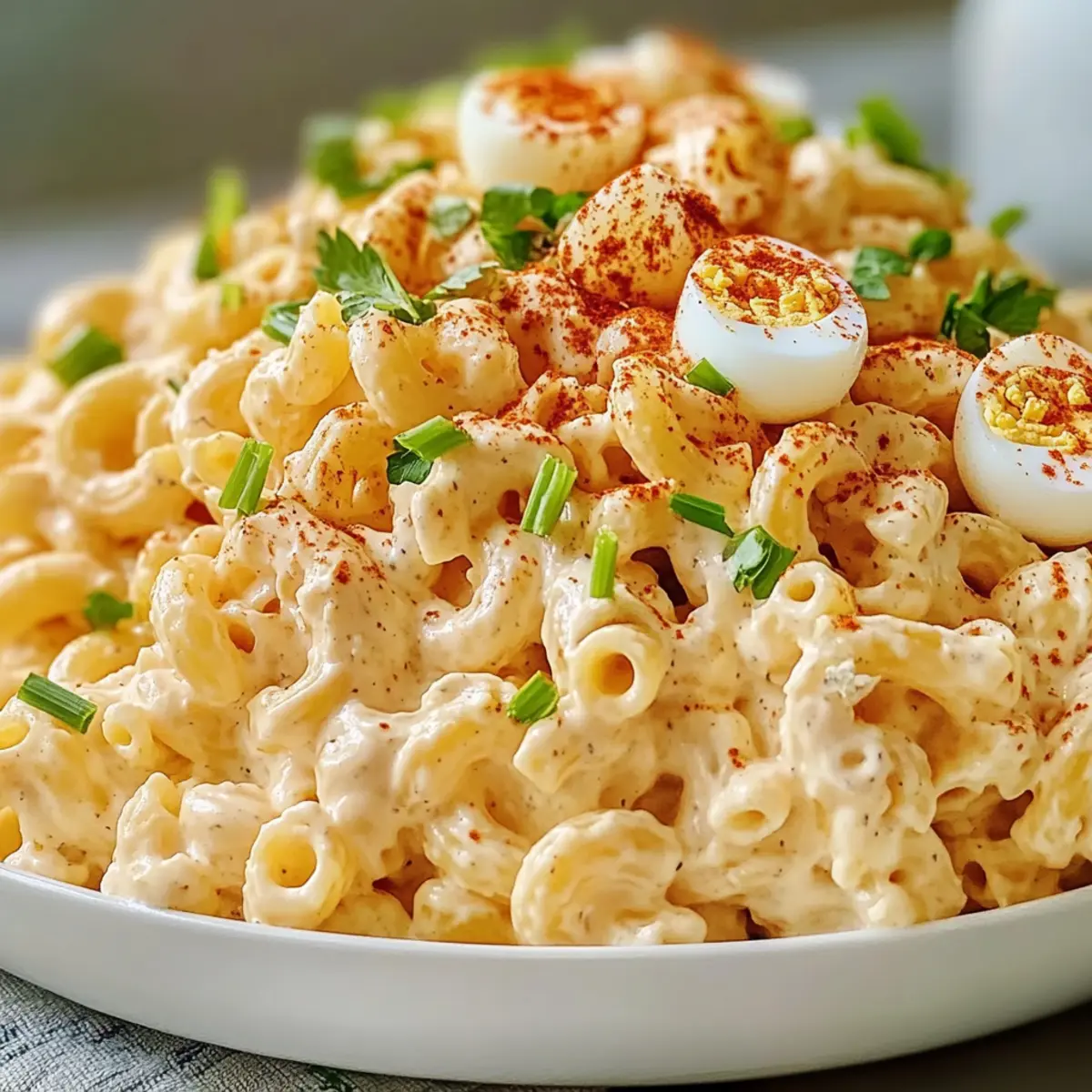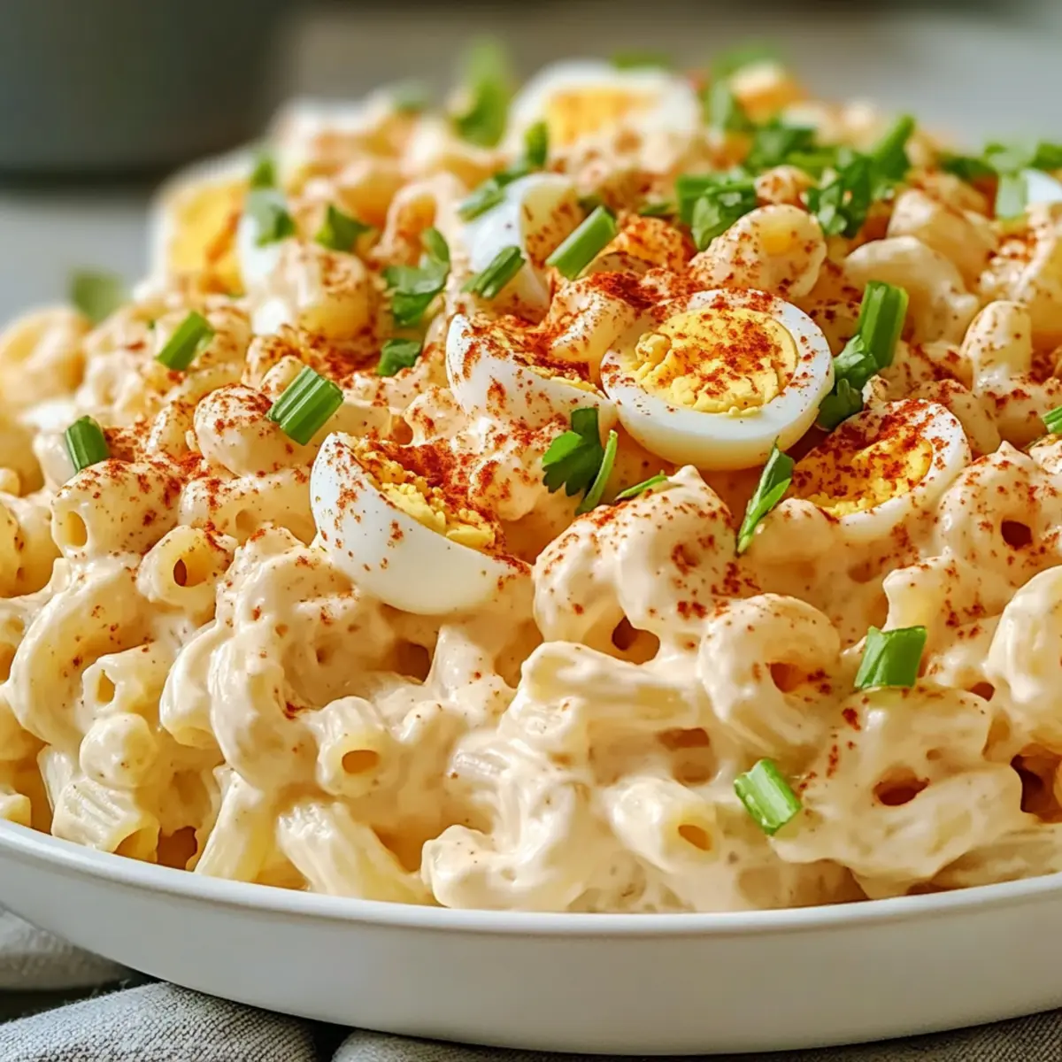 As I crunched into my first bite of this creamy Deviled Egg Macaroni Salad, a wave of nostalgia washed over me. It’s that familiar taste—like a warm hug from a childhood summer picnic—but with a delightful twist that leaves my taste buds dancing. Perfect for potlucks, barbecues, or simple family dinners, this salad is not just a dish; it’s a comforting companion to any meal. What I adore most is its quick prep time, allowing me to whip up a crowd-pleasing side without a fuss. And let’s not forget, this salad is as versatile as it is delicious. You can customize it to suit your tastes or dietary needs, making it suitable for everyone at the table. Ready to elevate your next gathering with this irresistibly tangy recipe? Let’s dive in! Why is this salad a must-try? Creamy, dreamy goodness: This Deviled Egg Macaroni Salad combines the rich, familiar flavors of deviled eggs with the satisfying texture of macaroni, resulting in a dish loved by all. Effortless preparation: With simple steps and minimal fuss, it’s a breeze to make, letting you focus on enjoying your gathering without spending hours in the kitchen. Crowd-pleaser: Perfect for potlucks and picnics, this salad appeals to all ages, ensuring there are no leftovers! Versatile options: Feel free to personalize this salad by adding your favorite veggies or even swapping out the dressing for a lighter alternative, such as Greek yogurt. Make ahead magic: Prepare it a day in advance for flavors that meld beautifully and a hassle-free serving experience. Don’t forget to check out delicious side options like Fruit Salad Refreshing for your next get-together! Deviled Egg Macaroni Salad Ingredients For a creamy delight! For the Pasta • Elbow Macaroni – A classic choice that provides structure; feel free to substitute with rotini or shells for fun shapes. For the Dressing • Large Eggs – Essential for that creamy deviled egg flavor; using older eggs makes peeling easier. • Mayonnaise – Binds everything together with creaminess; Greek yogurt is a light alternative! • Yellow Mustard – Infuses a tangy flavor that elevates the dish. • Apple Cider Vinegar – Adds a zing to balance the richness of the dressing. • Paprika – For depth of flavor and a pop of color in your salad. • Sugar – Balances the acidity and brings a hint of sweetness. • Salt & Black Pepper – Key seasonings that enhance all the flavors. For the Crunch • Celery – Adds a refreshing crunch that keeps things interesting. • Red Onion – Provides a savory bite; scallions can be used for a milder flavor. • Dill Pickles/Sweet Relish – Essential for that tangy kick, reminiscent of classic deviled eggs. This Deviled Egg Macaroni Salad is perfect for your next picnic or potluck, offering a creamy, refreshing taste that’s bound to impress! Step‑by‑Step Instructions for Deviled Egg Macaroni Salad Step 1: Cook the Macaroni In a large pot, bring salted water to a rolling boil over high heat. Add elbow macaroni and cook according to package instructions until al dente, usually about 8-10 minutes. Drain the macaroni in a colander and rinse briefly under cold water to stop the cooking process; then let it cool completely before combining with other ingredients. Step 2: Boil the Eggs While the macaroni cools, gently place large eggs in a saucepan and cover with cold water. Bring the water to a boil over medium heat, then cover the pot and remove it from heat. Let the eggs sit for 10-12 minutes; once done, carefully transfer them to an ice bath for about 5-10 minutes to cool, which ensures easy peeling later. Step 3: Prepare the Dressing In a mixing bowl, whisk together creamy mayonnaise, yellow mustard, apple cider vinegar, paprika, sugar, salt, and black pepper until smooth and well combined. The mixture should be velvety and uniformly colored, providing a flavorful dressing that will coat the macaroni and other ingredients. Step 4: Chop the Ingredients Peel the cooled eggs and chop them into bite-sized pieces, ensuring some texture remains for added interest. Next, finely chop the celery, red onion, and dill pickles or sweet relish. These crunchy elements will enhance the overall texture and flavor of the Deviled Egg Macaroni Salad. Step 5: Combine Ingredients In the bowl with the prepared dressing, gently fold in the chopped eggs, celery, red onion, and pickles. Once these ingredients are evenly mixed, add the cooled macaroni, carefully folding to coat everything in the tangy dressing. Aim for a harmonious blend without overmixing to maintain texture. Step 6: Chill and Serve Cover the bowl with plastic wrap and refrigerate the Deviled Egg Macaroni Salad for at least 1 hour; this chilling time allows the flavors to meld beautifully. When ready to serve, garnish with a sprinkle of paprika or fresh herbs like chives or parsley for an appealing touch before filling your serving bowl or individual portions. Make Ahead Options These Tangy Deviled Egg Macaroni Salad is perfect for busy home cooks seeking to save time! You can prepare the macaroni and the dressing up to 24 hours in advance, allowing the flavors to blend beautifully. Simply cook the macaroni as instructed, cool it completely, and store it in an airtight container in the refrigerator. For the dressing, mix mayonnaise, mustard, vinegar, paprika, sugar, salt, and pepper ahead of time and keep it refrigerated as well. When it’s time to serve, chop the boiled eggs, celery, and red onion, fold everything together, and refrigerate for an hour to let those delicious flavors meld. This way, you’ll enjoy a fuss-free serving with just as much fresh taste! How to Store and Freeze Deviled Egg Macaroni Salad Fridge: Keep leftovers in an airtight container for up to 3 days. Stir before serving to refresh the flavors and creaminess of the Deviled Egg Macaroni Salad. Make-Ahead: You can prepare this salad a day in advance. Just ensure it’s well-covered to maintain freshness in the refrige