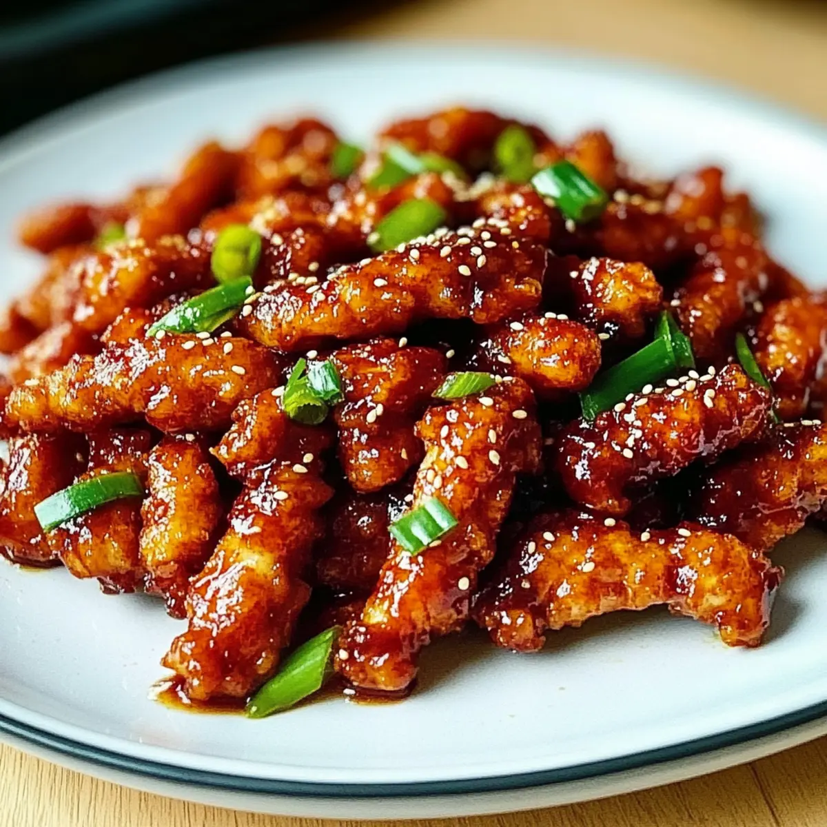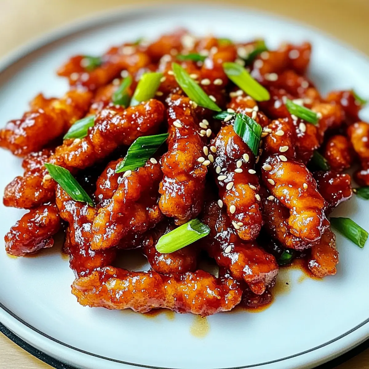 As I contemplated dinner last week, a whiff of nostalgia hit me—Indo-Chinese cuisine always reminded me of fun nights out, but who needs takeout when I can whip up something even better at home? That’s when I decided to create my own Fiery Dragon Chicken, a spicy, quick stir-fry that brings those vibrant flavors right to my kitchen. This dish not only satisfies my cravings for homemade takeout, but it’s also customizable to fit any heat level you desire. Whether you’re feeding the family on a weeknight or impressing friends at a gathering, this recipe serves up two irresistible perks: it’s easy to prepare and delivers a restaurant-quality result. Curious about how to make this fiery favorite? Let’s get cooking! Why is Dragon Chicken a Must-Try? Satisfying Flavor Explosion: Dragon Chicken brings together a medley of spices that will ignite your taste buds, making every bite a delightful experience. Quick and Easy: Perfect for busy weeknights, this recipe comes together in no time, allowing you to enjoy a homemade meal without the fuss. Ultimate Customization: Adjust the spice level to your liking, and swap chicken for tofu or veggies for a lighter or vegetarian option. Crowd Pleaser: Ideal for family dinners or entertaining friends, this dish is always a hit at the table! Serve it with sides like steamed rice or Cream Cheese Chicken for an unforgettable meal. Leftover Perfection: This dish tastes even better the next day, making it a fantastic make-ahead option for meal prep. Dragon Chicken Ingredients • Get ready to spice things up with this easy Dragon Chicken recipe! For the Batter Chicken – Boneless, skinless thighs or breasts ensure juiciness and flavor. Egg White – Binds cornstarch for a crispy coating; a flax egg can make it vegan. Cornstarch – This ingredient gives that perfect crunch when frying; potato starch is a great alternative. For the Sauce Salt and Pepper – Season the chicken well with kosher salt and freshly ground black pepper for enhanced flavor. Oil – Use vegetable or peanut oil for frying; both have a high smoke point. Sesame Oil – Infuses a nutty depth; toasted sesame oil brings even more richness. Garlic and Ginger – Freshly minced adds a vibrant touch; powder works if you’re in a hurry. Dried Chilies – Adjust the heat to your liking; fresh chilies can be used for a different kick. Ketchup – Adds a tangy sweetness to the sauce; homemade tomato sauce can be a tasty substitute. Soy Sauce – Delivers umami and saltiness; tamari offers a gluten-free option. Chili Garlic Sauce – Provides a deliciously garlicky heat; Sriracha is a great substitute. Vinegar – Rice vinegar adds needed acidity; apple cider vinegar can also work well. Sugar – Balances flavors with sweetness; consider brown sugar for extra depth. To Garnish Green Onions – Chopped fresh green onions provide color and crunch; they’re recommended for garnish. Sesame Seeds – Sprinkle for added texture and a nutty bite; feel free to omit if you prefer. Get ready to enjoy a mouthwatering homemade Dragon Chicken that brings the taste of your favorite takeout right to your kitchen! Step‑by‑Step Instructions for Dragon Chicken Step 1: Prepare the Chicken In a large bowl, combine sliced boneless chicken thighs or breasts with egg white, cornstarch, salt, and pepper. Mix thoroughly to coat all the chicken pieces. Allow it to rest for 10-15 minutes at room temperature, which helps the coating adhere better and creates a crispier texture when fried. Step 2: Fry the Chicken Heat vegetable or peanut oil in a large skillet or frying pan over medium-high heat until shimmering, about 350°F (175°C). Working in batches, carefully add the marinated chicken to the hot oil. Fry for 4-5 minutes, or until golden brown and crispy on all sides, then transfer the cooked chicken to a plate lined with paper towels to drain excess oil. Step 3: Sauté Aromatics In the same skillet, lower the heat and add a splash of sesame oil for flavor. Once the oil is heated, sauté chopped garlic, minced ginger, and dried chilies for 1-2 minutes, stirring continuously, until fragrant. The garlic should be lightly golden but not burnt, creating a delicious base for the Dragon Chicken sauce. Step 4: Create the Sauce Stir in a mixture of ketchup, soy sauce, chili garlic sauce, vinegar, and sugar into the pan with the aromatics. Increase the heat slightly and let it simmer for 2-3 minutes, stirring occasionally. The sauce will thicken; add a splash of water if it becomes too thick, ensuring it coats the chicken beautifully without being overpowering. Step 5: Combine and Serve Add the previously fried chicken back into the skillet with the sauce. Toss gently to coat each piece evenly, allowing the chicken to absorb the flavors for about 1 minute. As a finishing touch, serve your Dragon Chicken hot, garnished with sliced green onions and sesame seeds, alongside steamed rice or noodles for a complete meal. What to Serve with Fiery Dragon Chicken Elevate your Dragon Chicken experience by pairing it with delightful sides that balance its bold, spicy flavors while inviting warmth around the table. Steamed Jasmine Rice: The fragrant, fluffy texture of jasmine rice perfectly absorbs the spicy sauce, creating a comforting base that rounds out the meal. Garlic Noodles: Tossed in savory garlic and butter, these noodles offer a rich and buttery contrast to the heat of the Dragon Chicken, making each bite irresistible. Fresh Cucumber Salad: A refreshing salad with cucumbers, lime juice, and a hint of chilli provides a crunchy, cooling element that complements the dish’s spice beautifully. Vegetable Spring Rolls: Crispy on the outside and packed with fresh veggies, these spring rolls offer a satisfying crunch and are perfect for dipping in sweet chili sauce. Mango Lassi: This creamy, fruity drink cools the palate with its sweet, tangy profile, making it an ideal companion to balance the dish’s heat. Lettuce Wraps: 