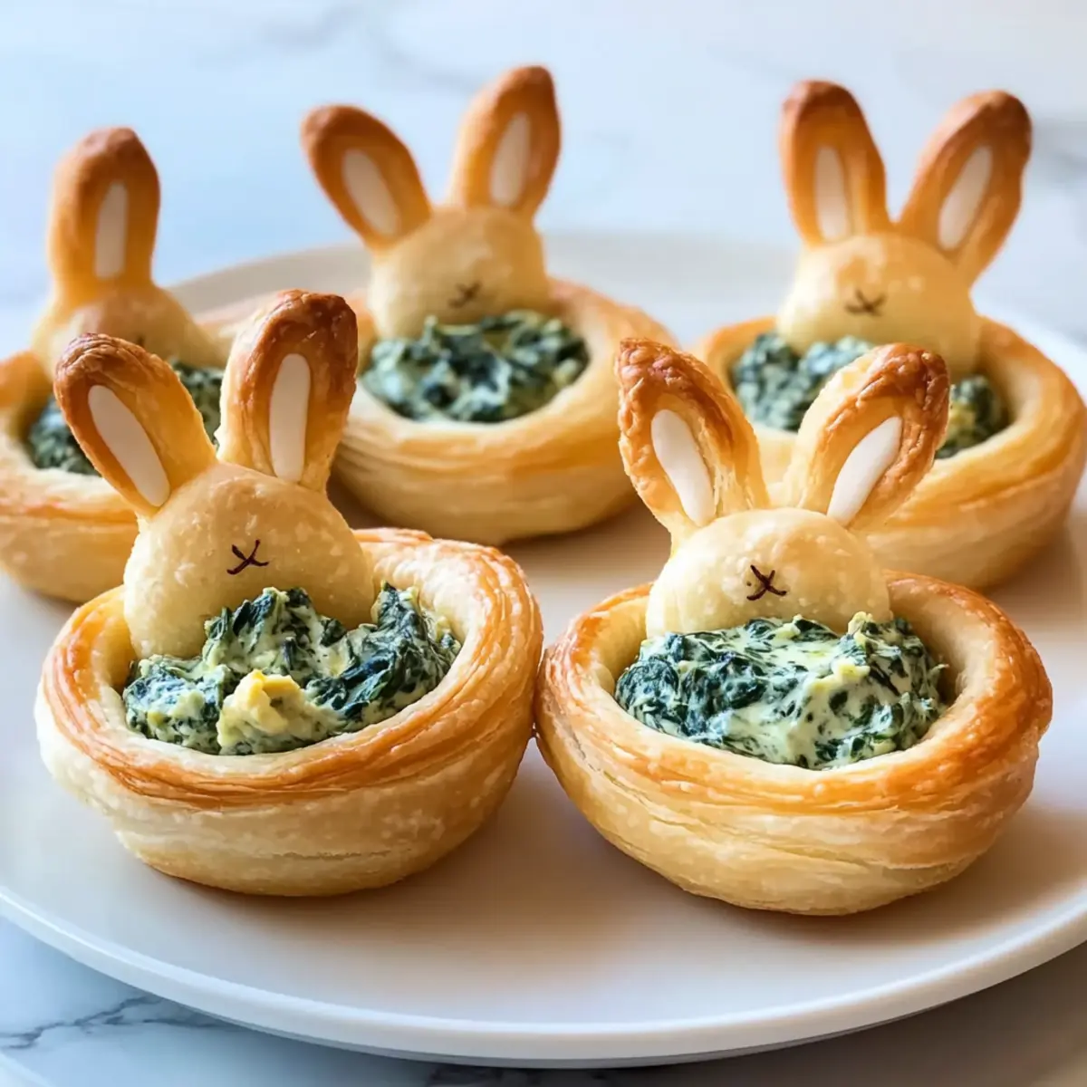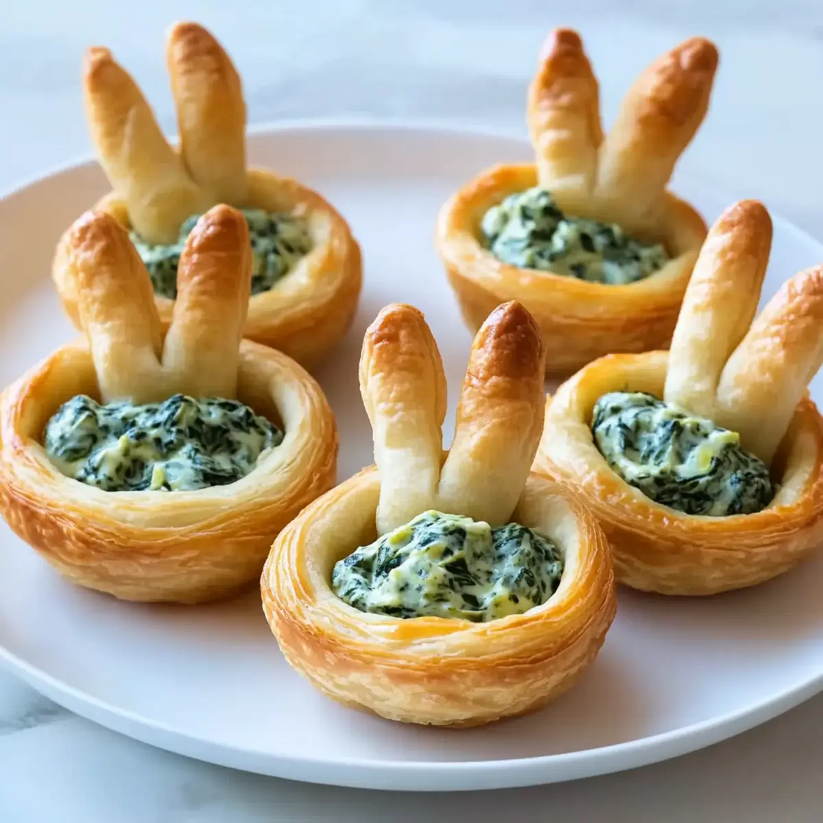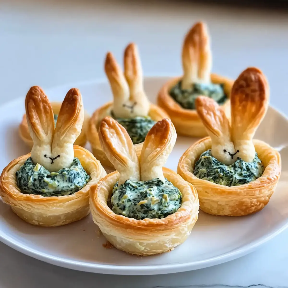 As I flipped through my recipe collection, I stumbled upon a delightful memory of spring gatherings filled with laughter and joy. The highlight? These charming Easter Bunny Crescent Bites. Combining the flaky goodness of crescent dough with a creamy spinach-artichoke filling, they are perfect for any festive celebration. Not only do these bites make me feel like a culinary rockstar—ready in just under 30 minutes—they also cater to all ages, ensuring that kids and adults alike will fight over the last one! With their adorable bunny ears peeking out, they bring a playful spirit to the table. Curious about how you can whip up a batch that will charm your guests? Let’s hop into the recipe! Why Are These Crescent Bites So Special? Quick and Easy: These Easter Bunny Crescent Bites come together in under 30 minutes—perfect for last-minute gatherings or busy weeknights. Kid-Friendly Fun: Kids will love the playful bunny shape, making these bites a delightful way to engage them in the kitchen. Vegetarian Delight: Packed with creamy spinach and artichokes, this recipe is a hit with vegetarians and anyone seeking lighter fare. Versatile Options: Feel free to switch up the filling with your favorite dips or veggies, creating a personalized treat every time! Stunning Presentation: With their cute bunny ears, these bites are not only tasty but also an eye-catching addition to any spring celebration. Serve them alongside a fresh salad or as part of a festive brunch to impress your guests! Easter Bunny Crescent Bites Ingredients For the Dough • Crescent Roll Dough – use refrigerated crescent roll dough for a flaky base that bakes to golden perfection. For the Filling • Cream Cheese – serves as the creamy anchor of the filling; substitute with vegan cream cheese for a dairy-free option. • Frozen Spinach – adds vibrant color and nutrients; be sure to squeeze out excess moisture to avoid sogginess. • Artichoke Hearts – brings tangy zest and texture; opt for canned varieties, drained and well-chopped. • Onion – offers savory depth; shallots can be used for a milder profile. • Sour Cream – introduces tanginess to the filling; Greek yogurt works as a healthy substitute. • Parmesan Cheese – contributes nutty flavor; nutritional yeast can be used for a vegan twist. • Fresh Herbs (Parsley or Chives) – enhances flavor and freshness; feel free to swap for cilantro or dill. • Garlic – essential for boosting the overall flavor; use fresh minced or garlic powder for ease. For the Bunny Ears • Scrap Dough – utilize leftover dough from cutting circles to create adorable bunny ears; roll out thinly for the best results. These whimsical Easter Bunny Crescent Bites will add joy and flavor to your spring celebrations, while being straightforward and fun to prepare! Step‑by‑Step Instructions for Easter Bunny Crescent Bites Step 1: Preheat and Prepare Begin by preheating your oven to 350°F (175°C). While the oven is warming, grab a mini-muffin tin and give it a light spray with nonstick cooking spray for easy release. Also, prepare a baking sheet by lining it with parchment paper; this will be vital for baking the adorable bunny ears later. Step 2: Shape the Dough Unroll your crescent roll dough onto a clean surface and firmly press the seams together to form flat rectangles. Use a round cutter to cut approximately 2-3 inch circles from the dough, aiming for about eight rounds total. These circles will serve as the base for your Easter Bunny Crescent Bites, providing that flaky, buttery goodness we all adore. Step 3: Create the Bunny Base Carefully place the dough circles into the prepared muffin tin, gently pressing them down to fit snugly. Use a fork to poke holes in the bottoms of each dough circle to allow steam to escape while baking. With the remaining dough scraps, cut out bunny ears, shaping them to be about 1-1.5 inches tall—these will add charm to your bites! Step 4: Bake the Ears and Cups Place the cut-out bunny ears on the parchment-lined baking sheet and bake them in the preheated oven for about 3-5 minutes or until they are just starting to turn golden. Simultaneously, bake the filled cups in the muffin tin for about 8-10 minutes, or until they are puffed and golden brown. Keep an eye on them for the perfect texture! Step 5: Fill the Bunny Cups Once baked, remove the cups from the oven and allow them to cool slightly. Carefully create a well in the center of each cup using a spoon, then fill them generously with your creamy spinach-artichoke filling. The warm cups will give a lovely contrast to the cool, flavorful filling, making each bite deliciously satisfying. Step 6: Add the Bunny Ears and Garnish Now it’s time for the finishing touches! Gently press your previously baked bunny ears into the filling of each cup, positioning them to create a fun, festive appearance. To enhance the presentation, sprinkle some fresh herbs like parsley or chives on top, giving your Easter Bunny Crescent Bites a delightful touch of color and flavor. What to Serve with Easter Bunny Crescent Bites These delightful bites are just the beginning of your festive feast, inviting an array of colorful, tasty companions to the table. Spring Salad: A refreshing mix of greens, cucumbers, and cherry tomatoes provides a crisp contrast to the creamy bites. Honey-Glazed Carrots: Sweet and tender, these carrots add vibrant color and are a lovely side for spring gatherings. Fruit Skewers: Bright, fresh fruit on skewers add sweetness and a pop of color, balancing savory flavors perfectly! Vegetable Platter: Serve an assortment of crunchy vegetables with a creamy dip for extra freshness, a true snack-time delight! Sparkling Lemonade: This light, bubbly drink enhances the festive atmosphere, perfect for both kids and adults at your gathering. Mini Quiches: Light and fluffy, these bite-sized quiches complement your crescent bites with their variety of flavors and textures. Gather these sides t