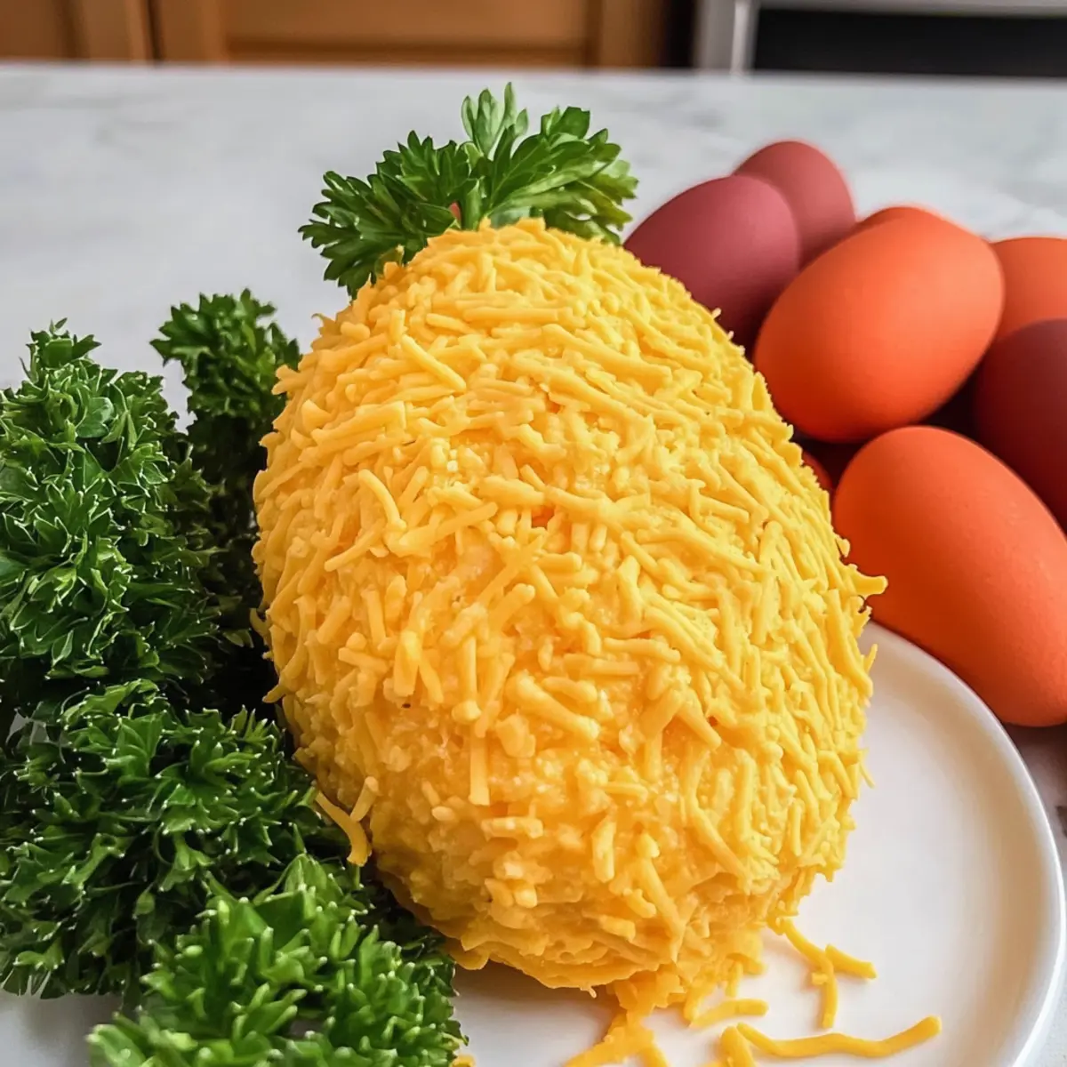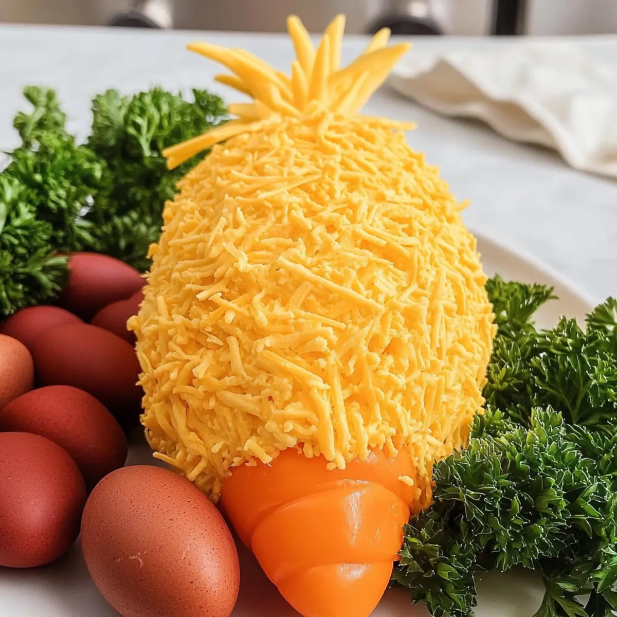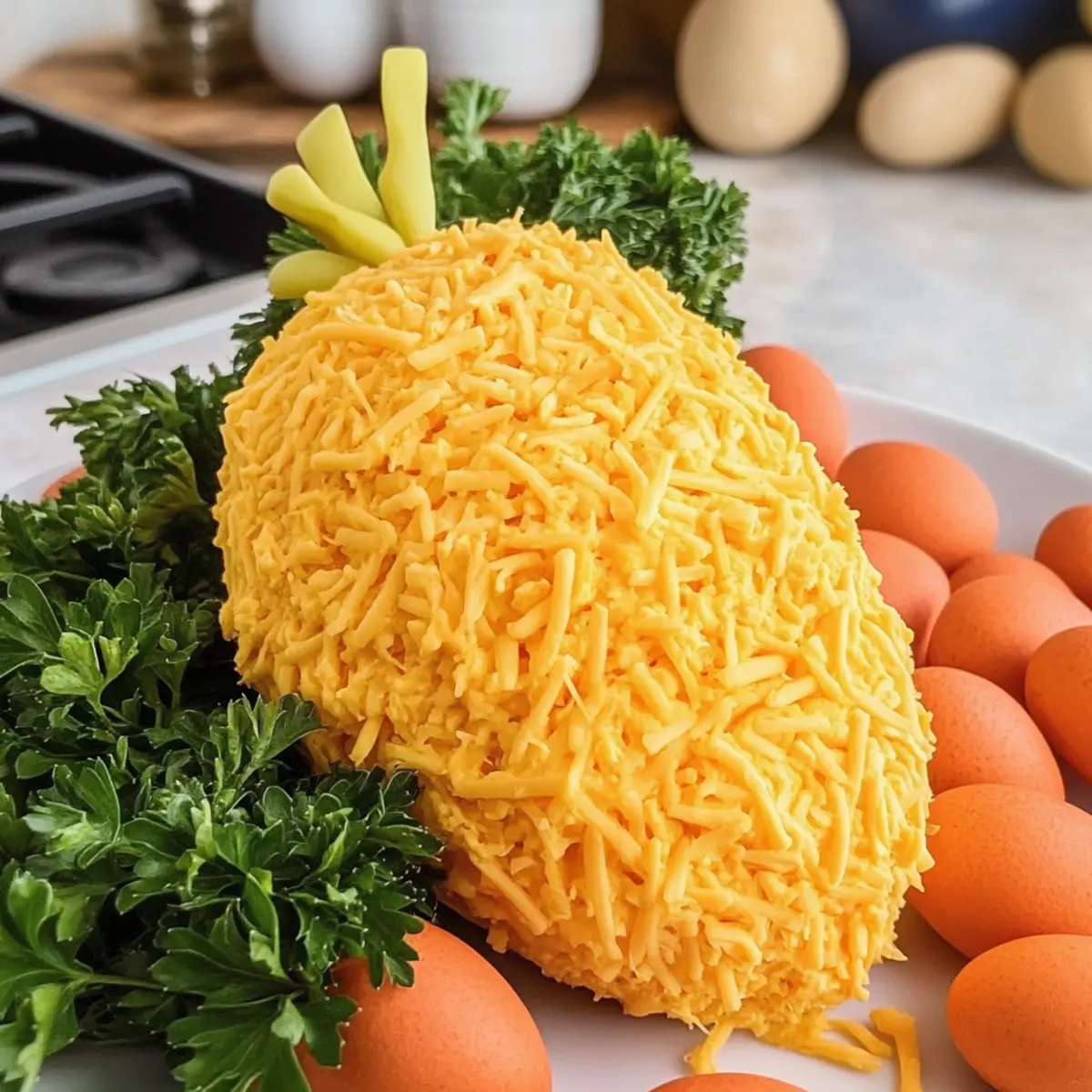 As I set out to prepare a festive spread for Easter, inspiration struck while assembling the ingredients for this delightful Easter Carrot Cheeseball. Shaped like a cheerful carrot and adorned with a vibrant coat of cheddar cheese and fresh parsley, this eye-catching appetizer is bound to be the centerpiece of your holiday gathering. Not only is this Easter Carrot Cheeseball a feast for the eyes, but it’s also a breeze to whip up, ensuring you can impress your family and friends with minimal stress. Perfect for any festive occasion, it brings a vegetarian twist to traditional appetizers, making it a guilt-free indulgence everyone will love. Are you ready to add some fun and flavor to your holiday table? Let’s dive into this creamy, crowd-pleasing recipe! Why is this cheeseball a must-try? Visual Appeal: The charming carrot shape and vibrant color make this appetizer a showstopper on any table. Quick and Simple: With minimal prep time, you can have this festive treat ready in no time, leaving you more moments to celebrate. Family-Friendly Flavor: A delightful mix of creamy cheeses and savory spices ensures everyone will find it irresistible, making it perfect for both kids and adults. Versatile Options: Customize your cheeseball with different cheeses or spices to suit your guests’ tastes, similar to how you could with a delicious Carrot Cake Cheesecake for a sweet treat! Perfect for Entertaining: Serve it with an array of snacks like crackers and fresh veggies for a fun, interactive experience that brings people together. Easter Carrot Cheeseball Ingredients For the Cheeseball • Cream Cheese – Provides the creamy base; use full-fat for the best texture. • Cheddar Cheese – Adds a rich flavor; shred fresh from a block for better results. • Green Onion – Introduces a fresh flavor; substitute with chives if preferred. • Bacon Bits – Offers a savory touch; can be replaced with vegan bacon for a vegetarian option. • Everything Bagel Seasoning – Enhances taste with a blend of herbs and garlic; swap it with homemade seasoning if you wish. • Worcestershire Sauce – Deepens flavor; omit for a fully vegetarian dish. For Decoration • Curly Parsley – Mimics carrot greens beautifully; Italian parsley can work in a pinch, but the look will differ. • Extra Cheddar Cheese – Used for coating the cheeseball; ensures a cheesy outer layer that looks delightful! This delightful combination makes preparing your Easter Carrot Cheeseball not just easy but genuinely enjoyable. It’s all about adding that festive charm to your table! Step‑by‑Step Instructions for Easter Carrot Cheeseball Step 1: Mix the Creamy Base In a mixing bowl, combine 8 ounces of softened cream cheese and 1 cup of freshly shredded cheddar cheese. Using a hand mixer or spatula, blend the cheeses until smooth and creamy, ensuring there are no lumps. This should take about 2-3 minutes. You’ll know it’s ready when the mixture is completely homogenous and easily spreadable. Step 2: Add Flavors Next, fold in ¼ cup of finely chopped green onion, ¼ cup of bacon bits, 1 tablespoon of everything bagel seasoning, and 1 teaspoon of Worcestershire sauce. Mix thoroughly until all ingredients are well incorporated and the flavors meld beautifully together. This step enhances the taste of your Easter Carrot Cheeseball, creating a deliciously savory creaminess that your guests will love. Step 3: Shape the Cheeseball Lay a large piece of plastic wrap on your countertop. Scoop the cheesy mixture onto the center of the wrap and gather the edges, shaping it into a carrot form—wider on top and narrower at the bottom. Take your time with the shaping, as this will determine the cheeseball’s final appearance. This process should take about 5 minutes, ensuring you create a nicely defined carrot shape. Step 4: Chill to Firm Up Wrap the formed cheeseball tightly in the plastic wrap and refrigerate for at least 1 hour. Chilling is essential as it helps the cheeseball firm up, making it easier to manage during the coating process. You can refrigerate it for up to 24 hours for deeper flavor infusion. When ready, the cheeseball should feel solid to the touch. Step 5: Decorate and Serve Once chilled, gently unwrap the cheeseball and place it on a decorative serving platter. Insert several sprigs of curly parsley into the top of the cheeseball to resemble a carrot’s greens. Next, roll the cheeseball in the remaining cheddar cheese to coat it fully. This final touch adds an appealing color and enhances the cheeseball’s flavor, making it ready to serve. Step 6: Pair with Snacks To finish, arrange an assortment of crackers and fresh veggie sticks around the Easter Carrot Cheeseball on the platter. This not only invites guests to dig in but also provides delightful dippers that complement the creamy texture of the cheeseball. Enjoy your creative, festive appetizer at your Easter gathering, delighting everyone with this unique treat! Storage Tips for Easter Carrot Cheeseball Fridge: Store your Easter Carrot Cheeseball in an airtight container in the refrigerator for up to 3-4 days to maintain its freshness and flavor. Freezer: If you want to save some for later, wrap the cheeseball tightly in plastic wrap and place it in an airtight container; it can be frozen for up to 2 months. Thawing: To enjoy your frozen cheeseball, transfer it to the fridge for 6-8 hours before serving for the best texture and taste. Reheating: This cheeseball is best served cold, so there’s no need to reheat; simply let it chill after thawing and then enjoy with your favorite dippers! Make Ahead Options This Easter Carrot Cheeseball is perfect for meal prep, allowing you to impress your guests while saving time on the big day! You can shape and chill the cheeseball up to 24 hours in advance, as this resting period enhances its flavor while firming it up for decoration. Simply wrap it tightly in plastic wrap after shaping, and store it in the refrige