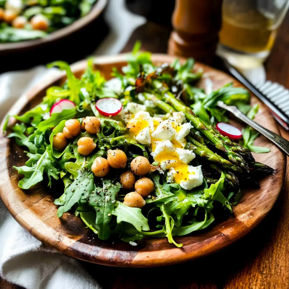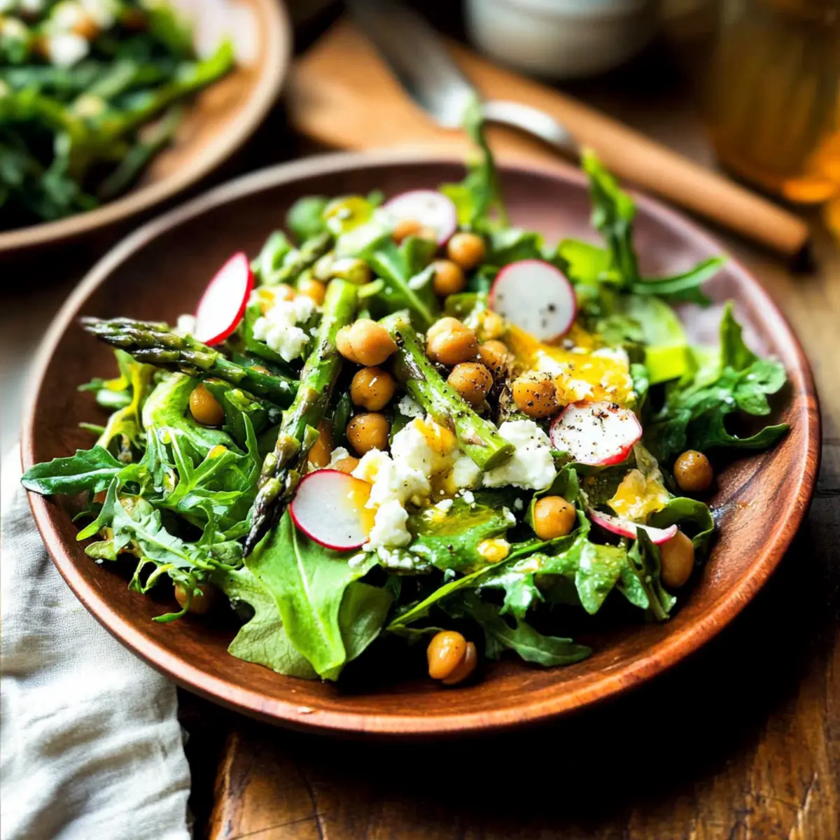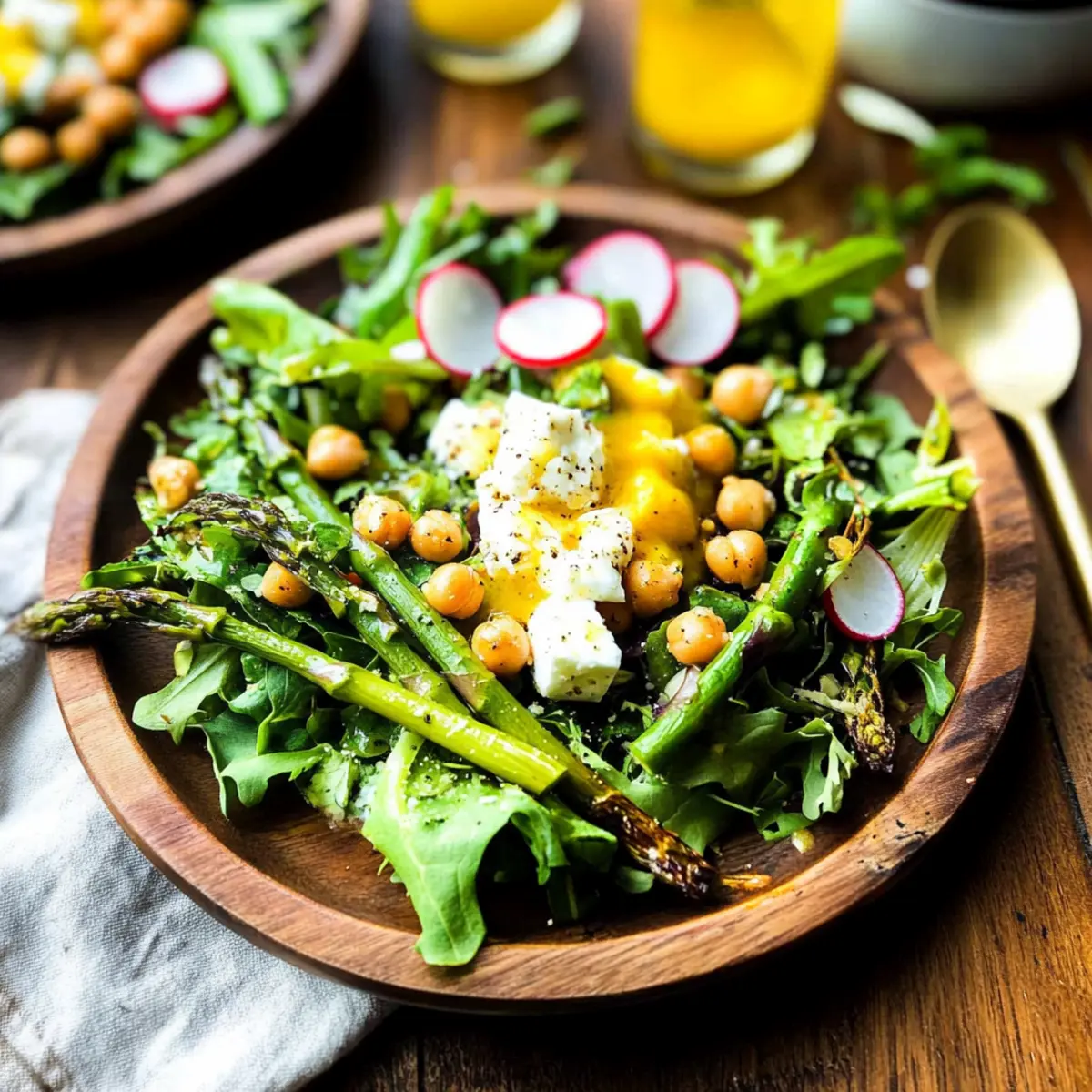 On a large platter or salad bowl, create a beautiful base by layering in the baby salad greens first. Then, add in the sliced English cucumber, crunchy radishes, fresh herbs, sautéed asparagus, and sweet peas. Sprinkle the roasted chickpeas and crumbled feta over the top, along with halved hard-boiled eggs if using. This colorful combination will make your Easy Spring Salad visually appealing.