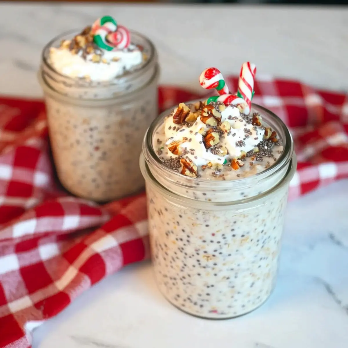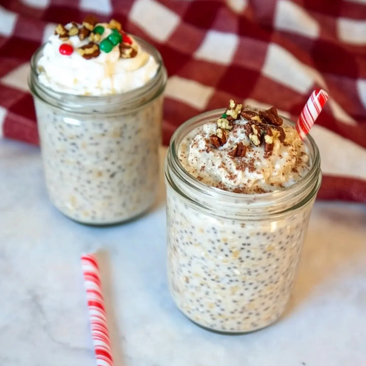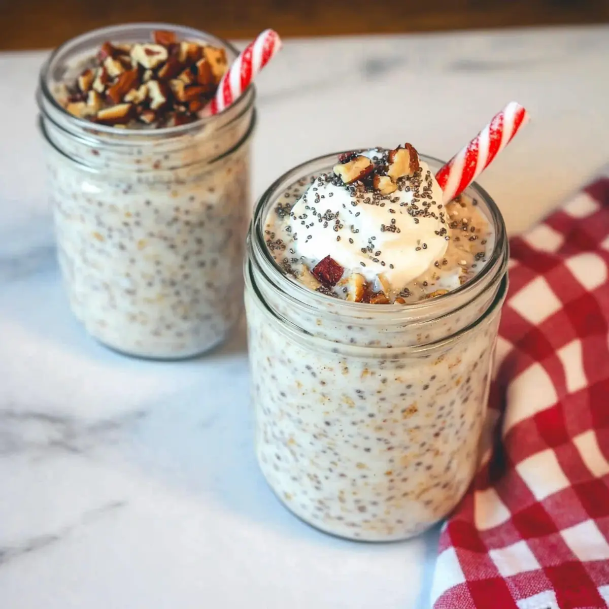 The first sip of creamy eggnog always transports me back to joyous holiday mornings, wrapped in cozy blankets and surrounded by love. With the festive season embracing us, I wanted to share my take on this comforting classic: Creamy Eggnog Overnight Oats. This easy breakfast marries the rich flavors of eggnog with the wholesome goodness of oats, creating a delightful dish that’s both indulgent and nutritious. Not only does it make your mornings a breeze—prepared the night before for that busy holiday rush—but it also serves as a crowd-pleaser for family gatherings and cozy brunches. Ready to elevate your breakfast routine with this festive twist? I can’t wait to share the details! Why Choose Eggnog Overnight Oats? Festive Flavor: Experience the joyous taste of eggnog every morning, right in your bowl. These oats capture the spirit of the holidays, making breakfast a celebration. Nutrient-Rich: Packed with protein and fiber, each serving provides longer-lasting energy to fuel your day. They’re not just delicious; they’re good for you! Time-Saving: Prepared the night before, you can simply grab and go in the morning, perfect for busy holiday schedules! Customizable: Adjust the eggnog amount to suit your sweetness preference, or swap in coconut milk for a tropical flair. The possibilities are endless! Family Favorite: This recipe is sure to impress your loved ones during holiday brunches or cozy mornings together. Perfect for creating lasting memories around the table! Elevate your breakfast with this delightful twist, and if you’re looking for other amazing breakfast ideas, check out our delicious Healthy Oatmeal Variations or learn more about crowd-pleasing Brunch Recipes. Eggnog Overnight Oats Ingredients • Dive into the festive flavors with these exciting ingredients! For the Base Old-Fashioned Oats – Essential for providing a hearty and satisfying texture that holds up overnight. Chia Seeds – Enhance nutritional value with fiber and protein; consider using flaxseeds if you prefer. Greek Yogurt – Adds creamy richness and a protein boost; feel free to swap with any yogurt, including dairy-free options. Eggnog – Infuses your oats with festive flavor; adjust the amount to suit your taste or mix with milk for less sweetness. Almond Milk (or Milk of Choice) – Balances the richness of eggnog; any milk works based on your dietary needs. For the Spices Nutmeg – Offers a warm, aromatic note; pumpkin pie spice can be a delightful alternative. Cinnamon – Adds an extra layer of warmth; it’s optional but warmly recommended for Holiday cheer! Optional Toppings Crushed Pecans – Adds a satisfying crunch and nutty flavor; perfect for texture and taste! Peppermint Candy – Sprinkle on top for a festive touch and a burst of minty freshness! Ready to whip up your Eggnog Overnight Oats? Gather these ingredients and let the magic begin! Step‑by‑Step Instructions for Eggnog Overnight Oats Step 1: Combine Ingredients In a mason jar or bowl, add old-fashioned oats, chia seeds, Greek yogurt, eggnog, almond milk, nutmeg, and cinnamon. Use a spoon to mix thoroughly, ensuring all ingredients are well incorporated. You want the oats to be evenly coated and moistened, presenting a creamy texture. This mix only takes about 5 minutes, making it a quick prep before settling down for the evening. Step 2: Transfer to Jar If you started with a bowl, carefully transfer the combined mixture into a mason jar. Ensure the jar is large enough to avoid spills, as you’ll be shaking it to mix. The jar’s tight seal will help the oats absorb liquid overnight, creating that wonderful overnight oats consistency. Secure the lid tightly to preserve freshness and flavor as the mixture rests. Step 3: Refrigerate Overnight Place the sealed jar in your refrigerator and let it chill overnight for at least 8 hours. This allows the oats and chia seeds to absorb the eggnog and almond milk fully, resulting in a creamy, thick texture. When you’re ready to serve, the mixture should look plump, with a smooth appearance, and the lovely aroma of nutmeg and cinnamon will greet you. Step 4: Add Toppings On the morning of indulging in your Eggnog Overnight Oats, take the jar out of the fridge. If desired, give it a quick stir to combine any settled ingredients. Top with crushed pecans for added crunch and sprinkle peppermint candy for a cheerful, festive flair. This final touch enhances the holiday spirit, making every spoonful a delightful treat. Step 5: Serve and Enjoy Serve chilled straight from the refrigerator for a refreshing breakfast experience. Alternatively, you can warm the oats slightly in the microwave if a cozy winter morning calls for it. Each bowl of eggnog overnight oats will deliver a creamy, festive start to your day, and you’ll appreciate the nutritious benefits wrapped in a delicious package! Eggnog Overnight Oats Variations Feel free to let your creativity shine by personalizing this delicious recipe! Add your own flair with these delightful twists. Coconut Milk: Substitute almond milk with creamy coconut milk for a tropical vibe that pairs perfectly with eggnog. Flaxseeds: Swap out chia seeds for flaxseeds to change up the texture while boosting omega-3 fatty acids. Dairy-Free: Use a plant-based yogurt instead of Greek yogurt to make this recipe completely dairy-free without sacrificing creaminess. Cranberry Swirl: Add a dollop of tangy cranberry sauce before serving to create a refreshing contrast to the sweet eggnog. Each bite will surprise your taste buds with a festive burst! Pumpkin Pie Spice: Replace nutmeg and cinnamon with pumpkin pie spice for a vibrant, flavorful twist that celebrates all things autumn. Chocolate Chips: Sprinkle dark chocolate chips on top for a touch of indulgence; the rich chocolate balances beautifully with the sweet eggnog. Extra Crunch: Top with granola or your favorite nuts for an added texture contrast; the crunchiness makes every spoonful that much mo
