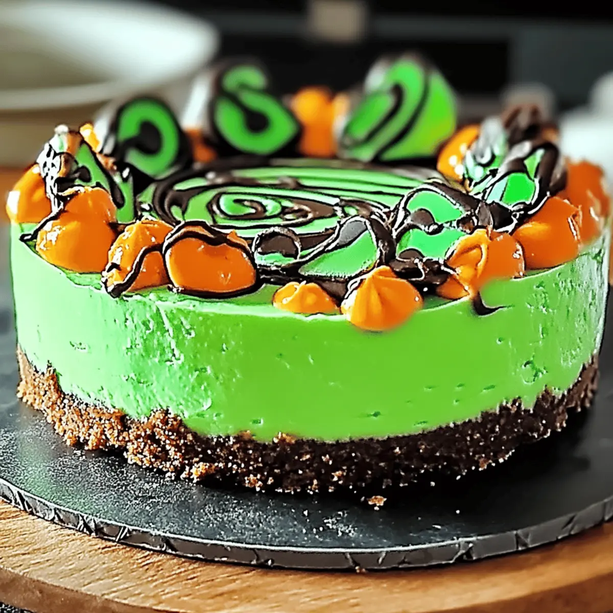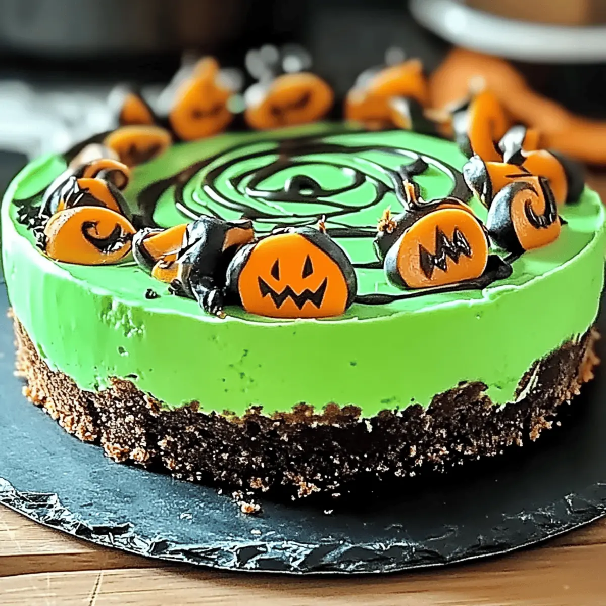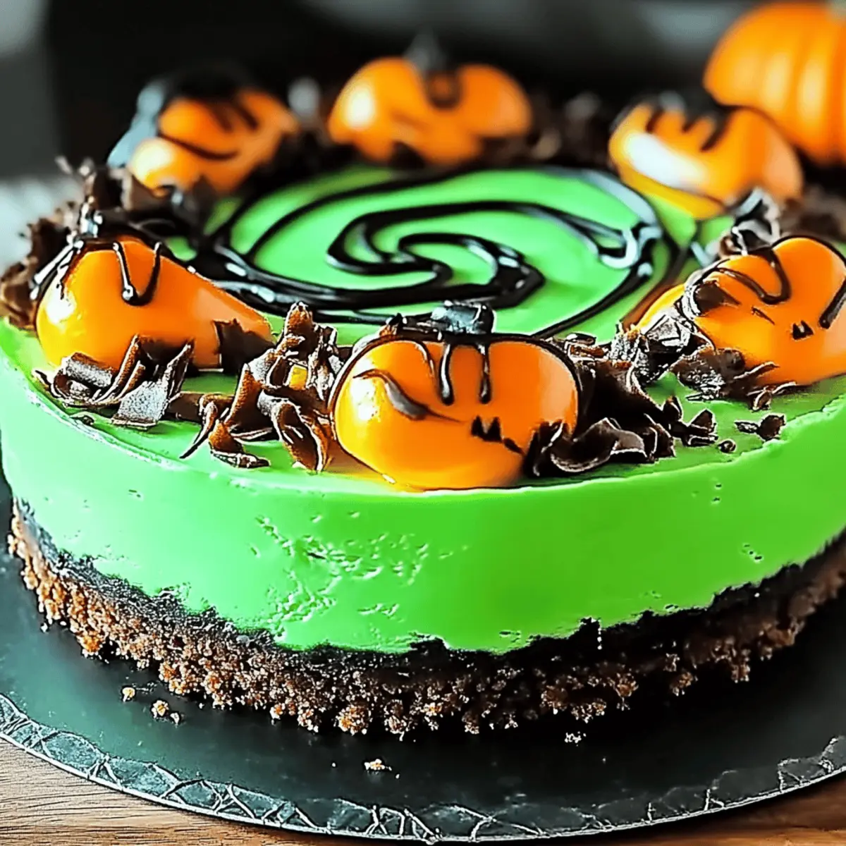 As I stirred the mixture for what would become my Witch’s Cauldron Cheesecake, the delightful aroma of buttery graham crackers and rich cream cheese filled my kitchen, instantly setting an enchanting mood. This dessert is perfect for Halloween gatherings, featuring vibrant green swirls that make it a true showstopper. Not only is this enchanting Witch’s Cauldron Cheesecake simple to make, but it’s also a crowd-pleaser that can easily accommodate dietary restrictions with a few clever substitutions. Imagine the joy on your guests’ faces as they take their first bite, captivated by its creamy texture and festive appearance. Are you ready to add a little magic to your next celebration? Why is this cheesecake a must-try? Simplicity: With straightforward instructions, this Witch’s Cauldron Cheesecake is perfect for bakers of any skill level. Visual Appeal: Its vibrant green swirls create a stunning centerpiece that will enchant your guests at any spooky gathering. Adaptability: Easily modify the ingredients for dietary needs; try using dairy-free cream cheese or gluten-free graham crackers to ensure everyone can enjoy this delight. Rich Flavor: This cheesecake delivers a luscious, creamy texture with a taste that mirrors classic cheesecakes, making each bite a moment of indulgence. Crowd-Pleasing: The combination of familiar flavors with a unique twist guarantees that this dessert will be a hit among friends and family alike. For more delicious cheesecake inspiration, don’t forget to check out my Peach Cobbler Cheesecake and Nutella Cheesecake Bars for your next gathering! Enchanting Witch’s Cauldron Cheesecake Ingredients • Dive into making the most magical dessert that will impress your guests! For the Crust • Graham Cracker Crumbs – Provides the crust base for texture and structure; gluten-free options are available for those with dietary restrictions. • Melted Butter – Helps bind the crust together; swap with coconut oil for a dairy-free choice. • Granulated Sugar – Sweetens the crust; for a more caramel-like depth, brown sugar works beautifully. For the Filling • Cream Cheese (softened) – This luscious ingredient gives creaminess and richness; consider dairy-free cream cheese for a non-dairy option. • Sour Cream – Adds tanginess and improves texture; Greek yogurt is a great alternative for thicker consistency. • Eggs – Provides structure and helps set the cheesecake; flaxseed meal or chia seeds are excellent substitutes for a vegan version. • Vanilla Extract – Adds flavor depth to the filling; using pure vanilla will enhance the overall taste significantly. For the Color and Garnish • Green Food Coloring – Essential for that vibrant, spooky appearance; opting for natural food coloring can keep it wholesome. • Mint Leaves (for garnish) – Perfect for embellishing the cheesecake and adding freshness; optional chocolate shavings or edible decorations work wonderfully too. Experience the delightful magic of this Enchanting Witch’s Cauldron Cheesecake as you bring it to life in your kitchen! Step‑by‑Step Instructions for Enchanting Witch’s Cauldron Cheesecake Step 1: Preheat the Oven Begin your magical journey by preheating your oven to 350°F (175°C). This ensures that your Enchanting Witch’s Cauldron Cheesecake bakes evenly and sets perfectly. While your oven warms up, gather your ingredients and prepare your baking space for a delightful kitchen adventure. Step 2: Prepare the Crust In a medium bowl, combine the graham cracker crumbs, melted butter, and sugar until fully blended. Press this mixture firmly into the bottom of a 9-inch springform pan to create a sturdy crust. Bake it in the preheated oven for 10 minutes, or until it turns a golden brown, then allow it to cool completely while you prepare the filling. Step 3: Make the Creamy Filling In a large mixing bowl, beat the softened cream cheese and sour cream using an electric mixer until smooth and creamy. Gradually add granulated sugar, mixing thoroughly. Then, add the eggs one at a time, blending well after each addition. Finally, stir in the vanilla extract to enhance the flavor of your Enchanting Witch’s Cauldron Cheesecake. Step 4: Color the Filling Divide your creamy filling into two separate bowls. In one bowl, gently fold in the green food coloring until you achieve your desired vibrant hue. This colorful filling will bring your cheesecake to life. Mixing the colors is the secret to creating that enchanting and spooky visual appeal! Step 5: Swirl the Fillings Together Using alternating spoonfuls, dollop both the plain and green filling into the cooled crust. Once the filling is applied, take a knife and swirl it through the batter gently to create a beautiful marbled effect. This step will result in irresistible patterns that make your Enchanting Witch’s Cauldron Cheesecake truly spectacular. Step 6: Bake the Cheesecake Place the filled springform pan in the preheated oven and bake for 55 to 60 minutes. Keep an eye out for a slight jiggle in the center as it bakes; this indicates a perfectly set cheesecake. After the baking time, turn off the oven, leaving the cheesecake inside with the door slightly ajar for 30 minutes to cool gradually and avoid cracks. Step 7: Chill the Cheesecake Remove the cheesecake from the oven and let it cool at room temperature for an additional 30 minutes. Once it’s cool, cover the pan and refrigerate the cheesecake for at least 4 hours, preferably overnight. Chilling allows the flavors to meld beautifully, making every bite of your Enchanting Witch’s Cauldron Cheesecake truly magical. Step 8: Garnish and Serve Once chilled, carefully remove the cheesecake from the springform pan. Garnish with fresh mint leaves or your choice of toppings, such as chocolate shavings or edible decorations. Slice into pieces and serve this stunning Enchanting Witch’s Cauldron Cheesecake at your next spooky celebration, delighting guests with its wh