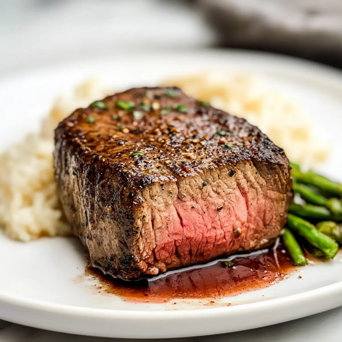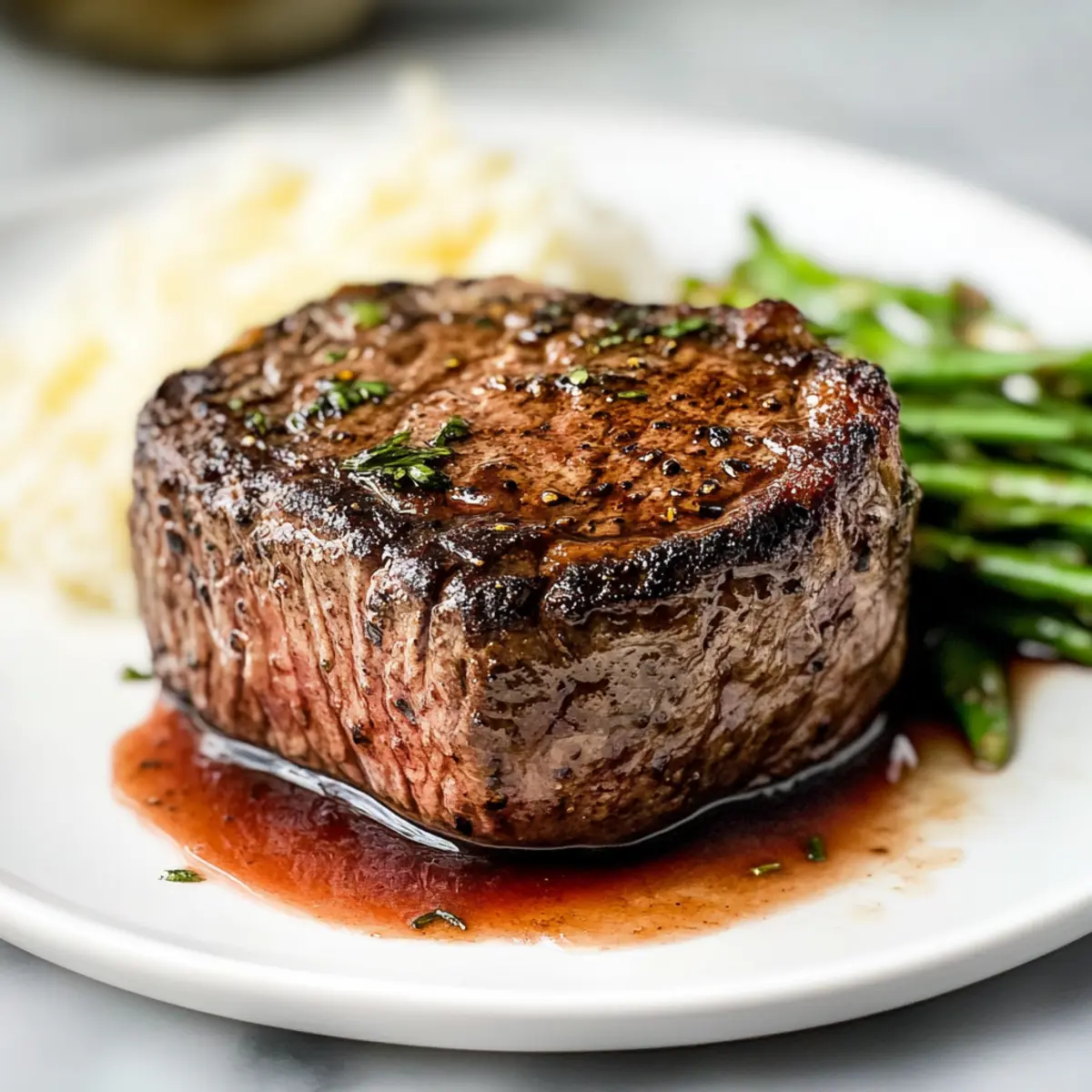 As I stood at the butcher’s counter, I couldn’t help but be drawn to the rich, marbled beauty of the filet mignon. This star ingredient is key to elevating your home dining experience to a steakhouse level that will leave everyone at the table in awe. With my simple filet mignon recipe, you’ll discover how straightforward techniques and minimal ingredients can create a comforting meal worthy of celebration. Not only is this dish quick to prepare, but it also guarantees a tender and juicy steak that makes any evening feel special. Whether you’re impressing a loved one or indulging yourself after a long week, this filet mignon is your ticket to gourmet dining at home. Ready to learn how to achieve that perfect sear? Let’s dive in! Why is Filet Mignon so Special? Unmatched Tenderness: This recipe brings out the filet mignon’s natural softness, making every bite melt in your mouth. Steakhouse Quality at Home: You’ll achieve that exquisite restaurant vibe without the hefty price tag. Impress guests or elevate date night effortlessly! Effortless Technique: Simple steps transform this luxurious cut into a masterpiece, so even novice cooks can shine. Minimal Ingredients Needed: Using just steak, salt, pepper, and butter, you’ll create a dish that’s bursting with flavor while keeping things uncomplicated. Perfect for Any Occasion: Whether it’s a holiday meal or a weeknight treat, filet mignon is versatile enough to fit any dining experience. Ready to elevate your culinary game? For additional tips on perfect side dishes, check out these ideas for garlic mashed potatoes that pair beautifully with this decadent steak! Filet Mignon Ingredients • To create the ultimate comfort food experience, gather these essential components. For the Steaks Filet Mignon Steaks (2”) – Look for well-marbled cuts for rich flavor and tenderness; these are the stars of your dish. For Seasoning Salt – Essential for enhancing the filet mignon’s natural flavors; feel free to adjust according to your taste. Black Pepper – Freshly cracked pepper adds a fragrant kick that complements the richness of the steak. For Cooking Unsalted Butter (1/4 cup) – Adds luxurious richness and moisture; olive oil can be a lighter substitute if desired. These ingredients will ensure you create a filet mignon that’s mouthwateringly tender and bursting with flavor! Step‑by‑Step Instructions for Masterful Filet Mignon Step 1: Temper the Steaks Begin by removing the filet mignon steaks from the refrigerator and allowing them to come to room temperature for 30-60 minutes. This step ensures even cooking throughout the steak and enhances its tenderness. While you wait, preheat your oven to 400°F, setting the stage for perfectly cooked filet mignon. Step 2: Preheat and Prepare Once the steaks are at room temperature, pat them dry with paper towels to promote a good sear. Generously season both sides of the filet mignon with salt and freshly cracked black pepper. This simple yet crucial step enhances the rich flavor of the meat, ensuring each bite is deliciously satisfying. Step 3: Heat the Pan In a heavy oven-safe skillet, preferably cast iron, melt 1/4 cup of unsalted butter over medium-high heat. Keep an eye on it, stirring occasionally, until the butter is hot but not burning—this should take about 4-5 minutes. The butter will foam and bubble; this indicates it’s ready for the filet mignon and will add wonderful flavor to the steaks. Step 4: Sear the Steaks Carefully place the seasoned filet mignon into the hot skillet, ensuring the steaks do not overcrowd the pan. Sear them for about 2 minutes on each side, spooning the melted butter over the steaks as they cook. You’ll know they’re perfectly seared when they develop a deep golden-brown crust—this is key to achieving delicious, restaurant-quality filet mignon at home. Step 5: Oven Finishing Once seared, immediately transfer the skillet to the preheated oven. Cook the filet mignon until the internal temperature reaches 125-130°F for a medium rare finish—this usually takes about 10 minutes, depending on the thickness. Keep an eye on the steaks with a meat thermometer, as this step will ensure they are juicy and perfectly cooked. Step 6: Rest and Serve Remove the skillet from the oven and let the filet mignon rest in the skillet for 5 minutes. This resting period allows the juices to redistribute, making the steaks incredibly tender. Just before serving, drizzle any remaining melted butter over the top of the steaks, enhancing the richness. Now, you’re ready to slice and serve this elegant dish! Variations & Substitutions for Filet Mignon Feel free to get creative with your filet mignon and make it your own; experimenting can enhance every delicious bite! Herbed Butter: Mix in herbs like thyme or rosemary with melted butter for a fragrant twist. This addition will elevate the richness and aroma, making each slice a symphony of flavors. Balsamic Glaze: Drizzle a balsamic reduction over the finished steak for a tangy contrast. The acidity pairs beautifully with the buttery texture of the filet, adding a sophisticated touch to your dish. Different Cuts: Swap filet mignon for other steaks like ribeye or sirloin. Each cut provides its own unique flavor and texture, allowing you to explore various taste profiles. Spicy Kick: Add a pinch of cayenne pepper or chili flakes to the seasoning mix for a hint of heat. This slight kick can transform your steak into a memorable experience, perfect for spice lovers. Garlic Infusion: Sauté minced garlic in the butter before adding the steaks. The garlic will infuse the butter, imparting a delightful savory depth that complements the meat wonderfully. Creamy Mushroom Sauce: Top the cooked filet mignon with a creamy mushroom sauce for an extra indulgent dimension. This savory sauce can turn your meal into a decadent feast that feels truly special. Smoky Flavor: Use smoked salt instead of regular salt for a deep, s