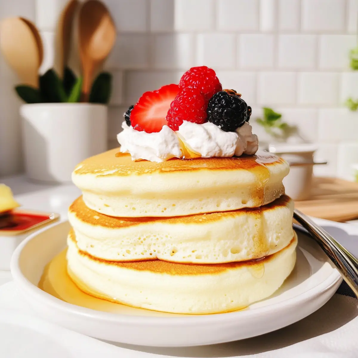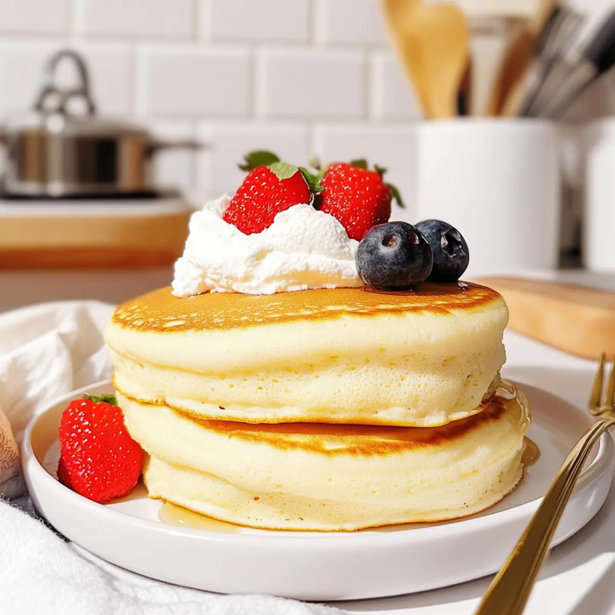 As I slid the first fluffy Japanese soufflé pancake from the skillet, I marveled at its delightful jiggle—like a soft cloud just waiting to be savored. These pancakes aren’t just a breakfast item; they hold the promise of impressing brunch guests or sweetening any day. With their airy texture and pillowy soft bite, the secret to mastering these fluffy pancakes lies in the soufflé technique, making them accessible to chefs of any skill level. Plus, they’re a quick and elegant way to elevate your morning routine or treat yourself to a cozy dessert. Ready to whip up some magic in your kitchen? Let’s get started! Why Are These Pancakes So Special? Fluffiness Beyond Compare: The soufflé technique results in pancakes that are incredibly light and airy, making each bite feel like a soft cloud. Quick and Simple: With just a few ingredients, these pancakes can be whipped up in no time, perfect for a last-minute brunch or an impressive breakfast surprise. Impress Your Guests: Their unique texture and visual appeal make these pancakes a stunning centerpiece at any brunch gathering. Versatile Delight: Serve them with a variety of toppings, from fresh fruits to creamy whipped cream, allowing for endless flavor combinations. Easy for All Skill Levels: Even if you’re new to cooking, this straightforward recipe will have you mastering it like a pro in no time! For a similar delightful experience, don’t forget to check out my Cottage Cheese Pancakes for another fluffy treat! Fluffy Japanese Soufflé Pancake Ingredients For the Batter • Eggs – Provides structure and richness; use large eggs for best results. • Milk – Adds moisture to the batter; any variety is suitable. • Vanilla Extract – Introduces sweetness and flavor; substitute with almond extract for a different taste. • Lemon Zest (optional) – Enhances flavor and reduces egginess; can be omitted or replaced with orange zest. • All-Purpose Flour – Gives the pancakes body and a slight chew; avoid using cake flour as it creates a different texture. • Baking Powder – Assists in the rise of the pancakes; essential for achieving fluffy pancakes. • White Vinegar (or Lemon Juice) – Stabilizes the egg whites when whipping; substitute with cream of tartar as needed. • Granulated Sugar – Sweetens the batter and contributes to browning; can use caster sugar for better incorporation. • Neutral Oil – For greasing the pan; prevents sticking and contributes slight moistness. Step‑by‑Step Instructions for Fluffy Japanese Soufflé Pancakes Step 1: Prepare Egg Mixtures Begin by separating the egg whites from the yolks into two separate bowls. In the yolks bowl, whisk together the milk, vanilla extract, and optional lemon zest until well combined. Sift in the all-purpose flour and baking powder, stirring gently until the mixture is smooth and free of lumps. This base will ensure the flavor and structure of your fluffy Japanese soufflé pancakes. Step 2: Make Meringue In a clean, dry bowl, add the egg whites along with the white vinegar. Using a hand mixer or stand mixer, whip the egg whites on medium speed until they become frothy, then gradually add the granulated sugar. Increase the speed to high and whip until stiff peaks form, which should take about 3-5 minutes. This meringue is key for achieving that signature lightness in your pancakes. Step 3: Combine Mixtures Gently fold about one-third of the meringue into the yolk batter using a rubber spatula; this lightens the mixture. Once incorporated, carefully fold in the remaining meringue in two additions, taking care not to deflate the bubbles you’ve created. This gentle folding ensures your fluffy Japanese soufflé pancakes maintain their airy texture during cooking. Step 4: Heat Pan Preheat a nonstick skillet or frying pan over low heat, allowing time for even cooking. Lightly grease the pan with a neutral oil using a paper towel or brush to ensure the pancakes don’t stick. Maintaining a low temperature is crucial; it helps the soufflé pancakes rise slowly and evenly without burning. Step 5: Cook Pancakes Spoon or pipe the batter into the heated skillet to form 2-3 pancake mounds, leaving space between them. Cover the skillet with a lid and cook the pancakes for about 7-8 minutes, until the bottoms turn golden and they puff up. Carefully flip the pancakes, cover again, and cook for an additional 5-6 minutes until they are fully set and jiggly. Step 6: Serve Immediately Once cooked, remove your fluffy Japanese soufflé pancakes from the skillet and serve them warm. These delightful pancakes are best enjoyed topped with whipped cream, fresh fruits, powdered sugar, or a drizzle of maple syrup. Their charming jiggly appearance and soft texture will surely impress anyone at your breakfast or brunch table! Tips for the Best Fluffy Japanese Soufflé Pancakes Room Temperature Eggs: Ensure your egg whites are at room temperature for optimal whipping. This approach guarantees the best aeration, creating fluffy pancakes. Gentle Folding: Be very gentle when folding the meringue into the yolk mixture. Overmixing can deflate the air bubbles, compromising the fluffiness of your Japanese soufflé pancakes. Low and Slow Cooking: Maintain a low stovetop temperature to allow the pancakes to rise evenly. Cooking too fast can lead to burnt outsides and raw insides. Use a Lid: Cover your skillet while cooking to trap moisture and steam, which helps the pancakes cook thoroughly while staying light and fluffy. Perfectly Cooked: Aim for a golden brown bottom before flipping. This indicates that your pancakes are well-cooked and ready to be enjoyed! Fluffy Japanese Soufflé Pancakes Variations Feel free to unleash your creativity and tweak this recipe into your very own masterpiece! Gluten-Free: Use a gluten-free flour blend instead of all-purpose flour for a fluffy alternative everyone can enjoy. Just make sure to experiment with the texture until you find the perfect mix! Match