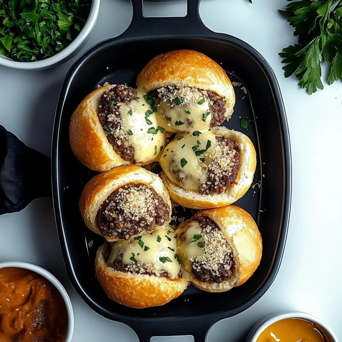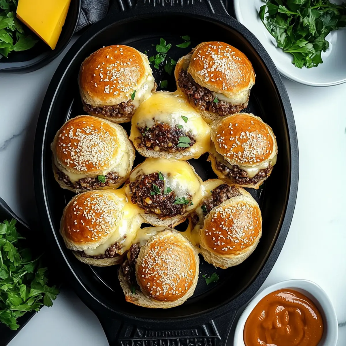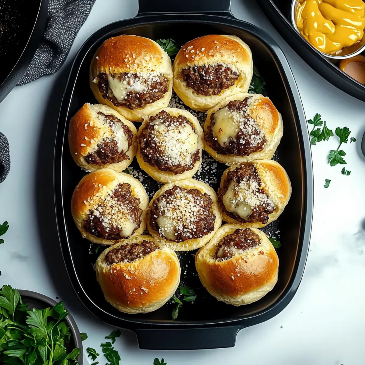 As I pulled those golden morsels from the oven, the mouthwatering aroma of Garlic Parmesan Cheeseburger Bombs filled my kitchen, teasing both my taste buds and my curious guests. These delightful bites are perfect for any gathering, offering the satisfying comfort of cheesy goodness without the fuss of a traditional meal. Made with seasoned ground beef and cheddar, all enveloped in flaky biscuit dough, they come together in just 20 minutes of prep. It’s the ideal quick and easy recipe for impressing friends or family, whether it’s game night or a cozy potluck. Ready to dive into this cheesy adventure? Trust me, you’ll want these savory bombs in your life! Why You’ll Crave These Bombs? Irresistible Flavor: Each bite of these Garlic Parmesan Cheeseburger Bombs is packed with savory goodness, thanks to the seasoned beef and melted cheese melded with a buttery garlic glaze. Quick and Easy: With just 20 minutes of prep time, you can whip these up with minimal fuss, making them the perfect last-minute appetizer for unexpected guests or a casual game night. Crowd-Pleaser: Whether you’re hosting a party or enjoy a cozy family dinner, these cheesy bites are sure to impress everyone at the table. Serve them with ranch or BBQ sauce for a delightful twist! Versatile Options: Feel free to swap out ground beef for turkey or even a plant-based alternative, and play around with cheeses like pepper jack for a kick. Comfort Food Delight: Combining two beloved indulgences, these bombs bring a tasty twist to classic comfort foods that everyone adores. They truly encapsulate the essence of home-cooked happiness! For more quick and delicious recipes, check out these Garlic Parmesan Chicken or Honey Garlic Glazed options that are sure to satisfy your cravings! Garlic Parmesan Cheeseburger Bombs Ingredients For the Bombs • Ground Beef – Provides the juicy, meaty foundation; you can substitute with ground turkey, chicken, or plant-based alternatives for a lighter option. • Salt – Enhances the overall flavors; adjust according to dietary needs. • Black Pepper – Adds mild heat and flavor depth to the filling. • Garlic Powder – Contributes an aromatic flavor that complements the fresh garlic in the glaze. • Onion Powder – Offers a sweet, aromatic undertone that perfectly balances the savory beef. • Worcestershire Sauce – Adds umami richness and tang; soy sauce or a mix of soy sauce with apple cider vinegar can work as a substitute. • Shredded Cheddar Cheese – Provides gooeyness in the filling for those cheesy moments. • Refrigerated Biscuit Dough – Acts as a quick pastry shell, ensuring a buttery, flaky exterior to the bombs. For the Topping • Melted Butter – Creates a golden finish when brushed on top of the bombs. • Minced Garlic – Freshly minced for a punch of flavor; crucial for the buttery topping. • Grated Parmesan Cheese – Sprinkled on top for a crispy, savory crust that enhances the flavor. • Fresh Parsley – Adds a touch of color and brightness as a garnish. Get ready to indulge in delicious Garlic Parmesan Cheeseburger Bombs, the kind of comfort food that invites everyone to gather around and share a tasty moment! Step‑by‑Step Instructions for Garlic Parmesan Cheeseburger Bombs Step 1: Preheat the Oven Start by preheating your oven to 375°F (190°C) and preparing for a beautifully baked batch of Garlic Parmesan Cheeseburger Bombs. Line a baking sheet with parchment paper to keep them from sticking and make for an easy clean-up. This setup ensures that your delicious bombs will have a perfectly crisp exterior. Step 2: Brown the Beef In a large skillet over medium heat, add your ground beef, breaking it apart as it cooks. Stir occasionally and let it brown for about 5-7 minutes until fully cooked. Once browned, drain any excess fat to keep your bombs from being greasy. This meaty filling will be the star of your Garlic Parmesan Cheeseburger Bombs! Step 3: Season the Filling Sprinkle in salt, black pepper, garlic powder, onion powder, and Worcestershire sauce to the cooked beef. Mix thoroughly and cook for another 1-2 minutes to fully combine the flavors. Now, add shredded cheddar cheese, stirring until melted and creamy. This ooey-gooey mixture is the heart of your savory bombs! Step 4: Prepare the Dough Take your refrigerated biscuit dough and roll each biscuit out on a lightly floured surface until about 1/4 inch thick. This will create a nice base for your filling. Now, place about 2 tablespoons of the cheesy beef mixture in the center of each circle. This step ensures that every bite of your Garlic Parmesan Cheeseburger Bombs is generously filled! Step 5: Shape the Bombs Fold the edges of the dough over the filling, pinching and sealing thoroughly to prevent any leakage during baking. Place each sealed bomb seam-side down on your prepared baking sheet. Arrange them slightly apart to allow for even baking and ensure each bomb gets that delectable golden-brown finish. Step 6: Brush with Garlic Butter In a small bowl, whisk together the melted butter and minced garlic until well combined. Using a pastry brush, generously coat the tops of each bomb with this fragrant garlic butter. This glaze not only enhances the flavor of your Garlic Parmesan Cheeseburger Bombs but also creates a beautiful, shiny finish! Step 7: Add Parmesan Topping Sprinkle a generous amount of grated Parmesan cheese over the brushed tops of the bomb. This adds a delightful crispy crust that complements the soft filling beautifully. The addition of Parmesan not only enhances the flavor but also brings a lovely texture contrast to each savory bite. Step 8: Bake to Perfection Slide the baking sheet into your preheated oven and bake for 12-15 minutes or until the bombs are golden brown and puffed up beautifully. Keep an eye on them during the last few minutes to achieve that perfect color while avoiding burning. Your kitchen will soon be filled with the irresistible aroma of Garl