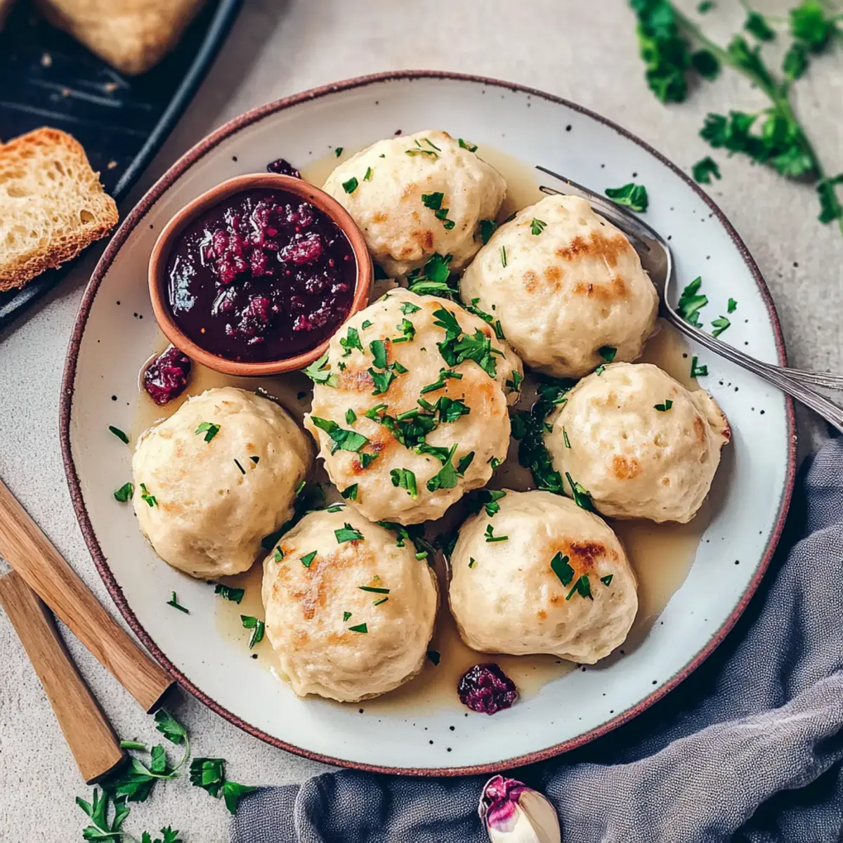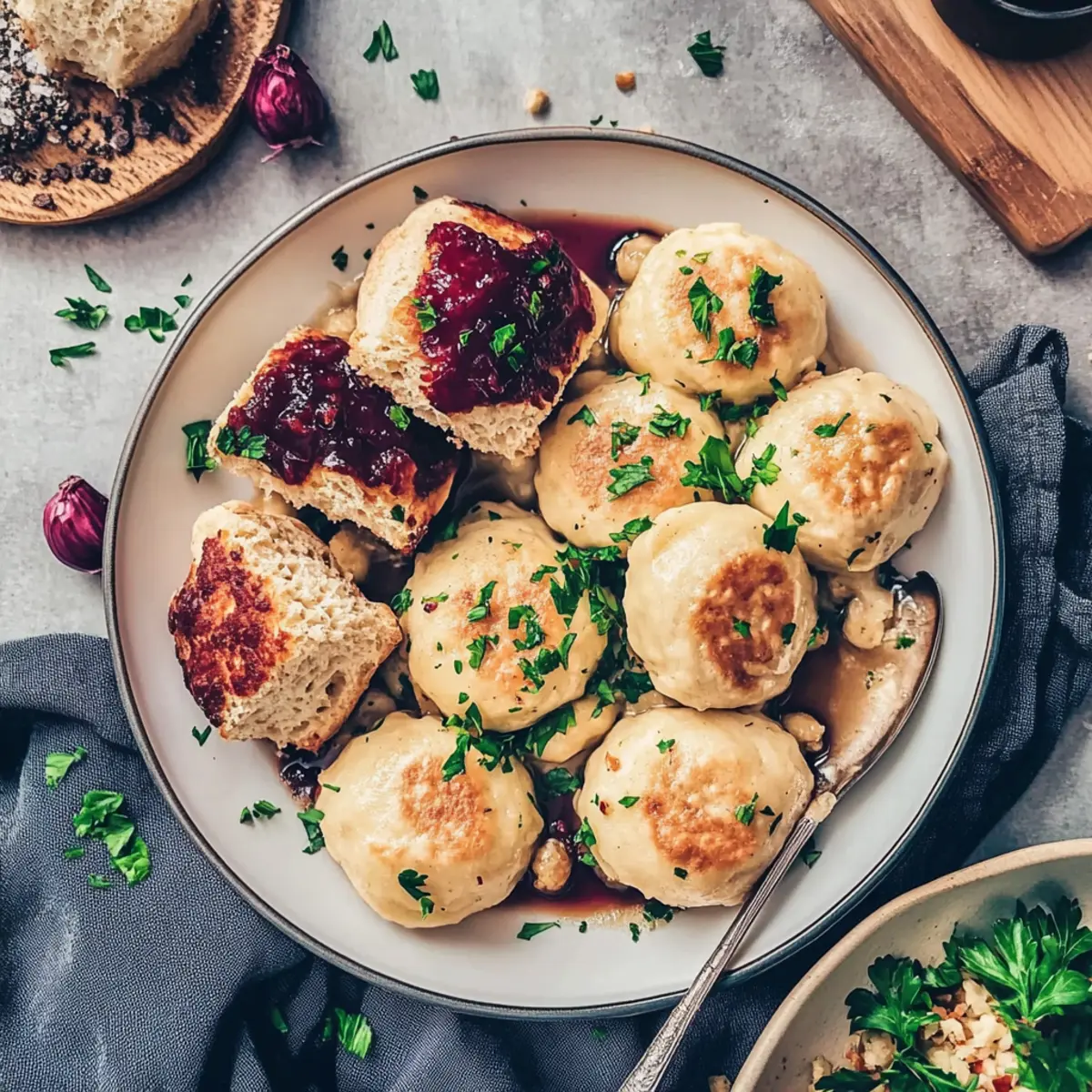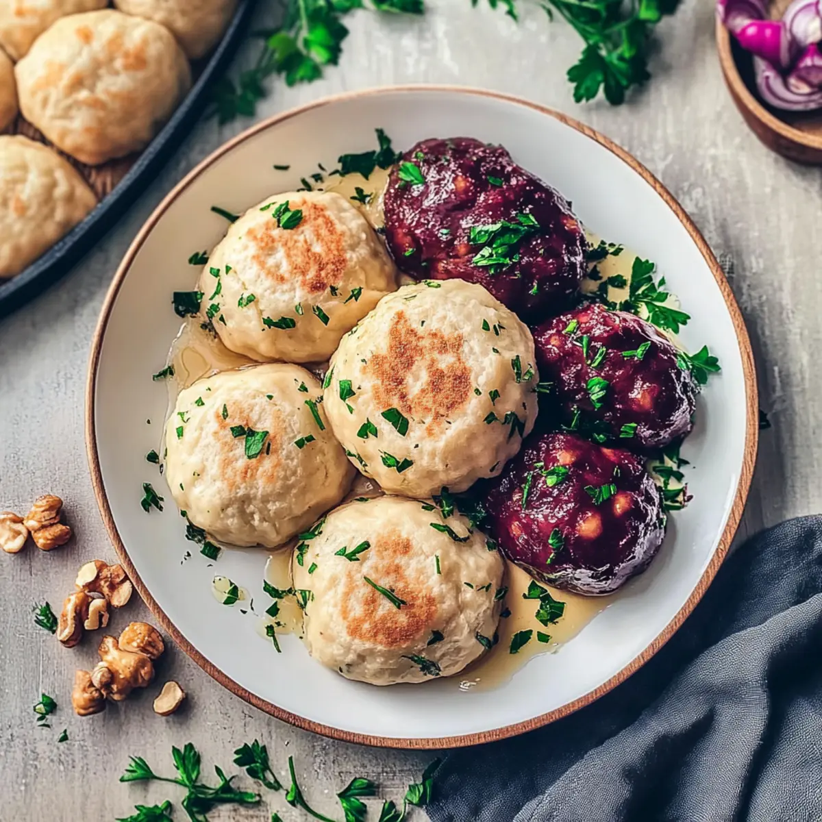 As I stood in my kitchen, the aroma of sautéed onions wafted through the air, immediately transporting me to cozy family gatherings in Germany. Today, I’m excited to share my take on a beloved tradition: Easy Vegan German Bread Dumplings, or Semmelknödel. This simple yet satisfying side dish is a stellar way to transform leftover bread into something comforting and scrumptious. Not only are these dumplings perfect for soaking up your favorite sauces, making them a fantastic companion for festive meals, but they’re also quick to prepare, ensuring you spend less time in the kitchen and more time enjoying your loved ones’ company. Curious how these delightful dumplings can elevate your next dinner? Let’s dive into the recipe! Why are German Bread Dumplings a must-try? Incredible Comfort: These Vegan German Bread Dumplings offer a warm, cozy feel that makes every meal special. Versatile Side Dish: Perfect alongside creamy vegan sauces or hearty dishes like vegan meatloaf. Waste Not, Want Not: A fantastic way to use leftover bread, turning it into something delightful. Quick and Easy: With just a few simple steps, you’ll have a crowd-pleasing side in no time. Festive Flavor: Ideal for holidays or family gatherings, bringing a taste of tradition to your table. Healthy and Nourishing: Each dumpling is low in calories while packed with nourishing ingredients, ensuring you enjoy every bite without the guilt. Check out more about how these dumplings enhance your dining experience with serving suggestions. German Bread Dumplings Ingredients For the Dumpling Mixture • Bread Rolls – 10 from the previous day; provides structure and can be substituted with stale white bread if needed. • Soy Milk – 300 ml; acts as a binding agent and moisture source (unsweetened is preferred for this Vegan German Bread Dumplings). • Vegetable Oil – 2 tsp (e.g., canola, avocado); adds moisture and helps sauté the onions. • Onion – 1 diced; contributes flavor, and shallots can be used for a sweeter taste if desired. • Parsley – ⅔ cup chopped; adds freshness and color, or replace with other herbs like chives or thyme for variety. • Salt – 1 tsp; enhances flavor, adjust according to your taste. • Nutmeg – ½ tsp ground; adds warmth, but feel free to omit for a simpler flavor profile. Step‑by‑Step Instructions for Easy Vegan German Bread Dumplings Step 1: Prepare the Bread Begin by cutting your day-old bread rolls into small, bite-sized pieces and place them in a large mixing bowl. This forms the foundation of your Vegan German Bread Dumplings. Let them sit while you gather the other ingredients, allowing them to dry out slightly for better texture. Step 2: Soak the Bread In a small saucepan, gently heat the soy milk until it is lukewarm—this should take about 1-2 minutes on low heat. Pour the warm soy milk over the bread pieces, tossing them together briefly to ensure all the bread is evenly soaked. Set the mixture aside to absorb the flavors for about 10 minutes. Step 3: Sauté the Aromatics In a frying pan, heat 2 teaspoons of vegetable oil over medium heat. Once the oil is hot, add the diced onion and sauté for about 3 minutes until translucent, stirring occasionally. Add in the chopped parsley and sauté for an additional minute, releasing the fragrant aroma that will elevate your Vegan German Bread Dumplings. Step 4: Combine Ingredients Transfer the sautéed onion and parsley to the bowl with the soaked bread. Sprinkle in 1 teaspoon of salt and ½ teaspoon of nutmeg. Using your hands, gently knead the mixture until it all comes together, forming a cohesive but slightly sticky dumpling dough. This should take about 2-3 minutes to ensure everything is well mixed. Step 5: Shape the Dumplings With wet hands to prevent sticking, shape the mixture into 8 medium-sized dumplings or smaller ones if you prefer. Place the formed dumplings on a plate, ensuring they are not touching, and set them aside while you prepare to cook them. Step 6: Cook the Dumplings Bring a large pot of salted water to a rapid boil. Once boiling, reduce the heat to a gentle simmer—this step is crucial to keep the Vegan German Bread Dumplings intact. Carefully add the dumplings to the simmering water and cook for 15-20 minutes. They are done when they float to the surface and appear puffed and tender. Step 7: Serve Warm Using a slotted spoon, carefully remove the dumplings from the pot and allow them to drain briefly. Serve your warm Vegan German Bread Dumplings immediately, paired with your favorite vegan sauces or dishes for a comforting meal that celebrates tradition and flavor. Expert Tips for Vegan German Bread Dumplings • Gentle Cooking: Ensure water simmers gently; boiling water can cause dumplings to break apart, ruining their texture. • Bread Quality: Use day-old bread for best results. Fresh bread may not hold the dumplings together as well, making them fall apart in the water. • Perfect Size: Aim for evenly sized dumplings to ensure consistent cooking. Smaller dumplings will cook faster, so keep an eye on them! • Herb Substitutions: Feel free to experiment with different herbs for flavor. Chives or thyme can add a unique twist to your Vegan German Bread Dumplings. • Pan-Frying Option: For added texture, pan-fry the dumplings after boiling until golden brown. This enhances the flavor and gives a delightful crunch. How to Store and Freeze German Bread Dumplings Fridge: Leftover Vegan German Bread Dumplings can be stored in an airtight container in the refrigerator for up to 3 days. Ensure they are cooled completely before sealing. Freezer: To freeze, place the dumplings in a single layer on a baking sheet until firm, then transfer to a freezer-safe bag. They can be stored for up to 3 months. Reheating: To reheat, thaw in the fridge overnight, then cut into slices and pan-fry until crispy for that delightful texture you’ll love. Serving: These dumplings are best enjoyed warm, so be su