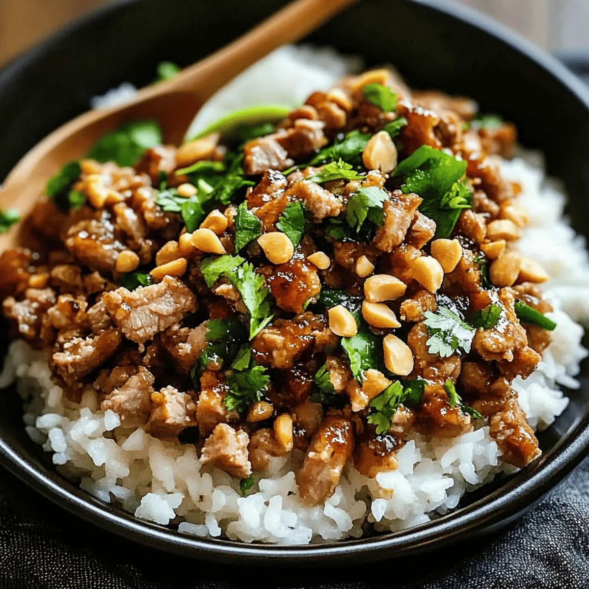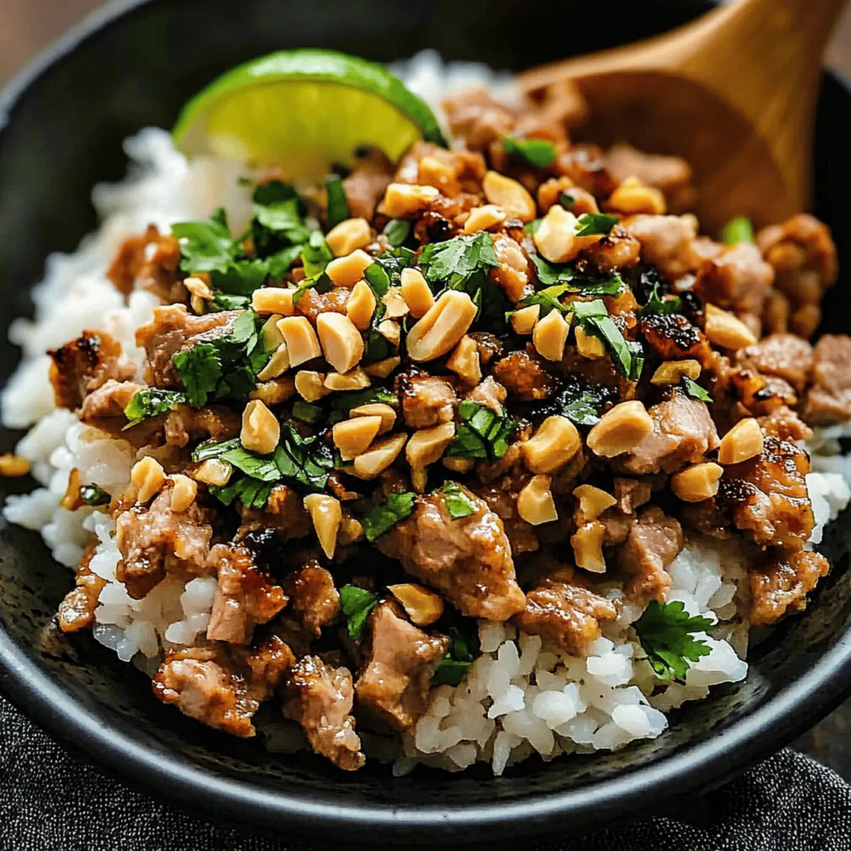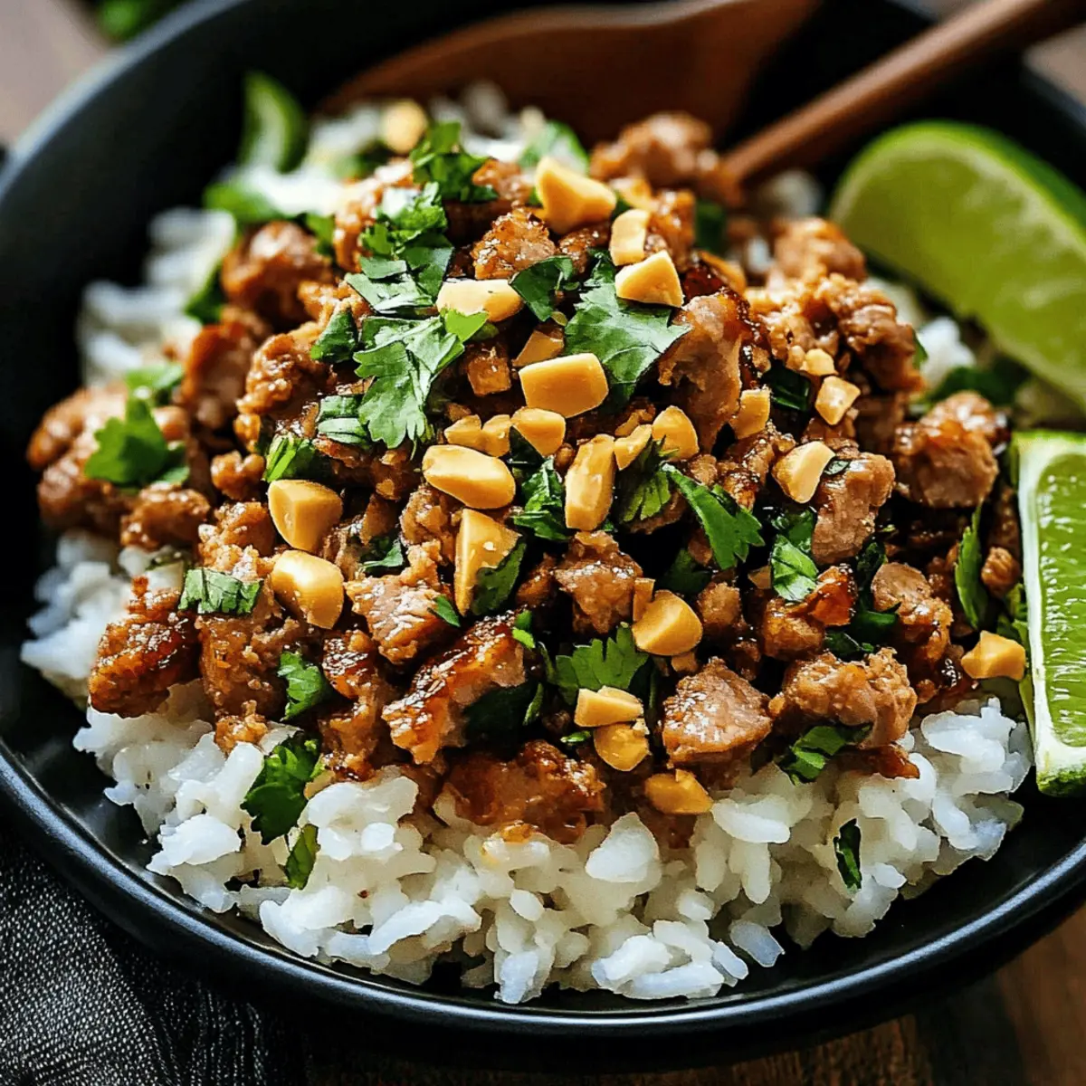 As I sliced into the vibrant lime, the kitchen instantly filled with a zesty aroma that transported me to a tropical getaway. This Quick Ginger Lime Pork with Coconut Rice is my go-to recipe for busy nights when I crave something vibrant yet effortless. In just 30 minutes, you can savor the sweet, spicy, and savory notes of this dish, thanks to the caramelized ground pork infused with fragrant ginger and garlic, all lovingly resting on a bed of creamy coconut rice. Not only is this meal prep-friendly, but it’s also easily adaptable for various proteins, ensuring everyone at the table can join in the delight. So, are you ready to bring a burst of flavor to your weeknight dinners? Why is this recipe a weeknight winner? Quick and Easy: With just 30 minutes from start to finish, you can whip up a delightful dinner that feels gourmet without the fuss. Flavor Explosion: The zingy ginger and fresh lime meld brilliantly with the caramelized pork, offering a dish that dances on your taste buds. Versatile Options: Whether you’re a meat lover or prefer plant-based, this recipe is easily adaptable—try ground chicken, turkey, or tofu! Meal Prep Friendly: Cook in bulk and store for the week, making it perfect for busy schedules. Family-Friendly Appeal: There’s something for everyone here—from the creamy coconut rice to the crunchy peanuts; it’s sure to impress the whole family. Why not pair this with a refreshing cucumber salad or include some vibrant stir-fried vegetables for a complete meal? You’ll be raving about this dish just like you do with Sticky Chicken Rice or Pasta Shrimp Spicy for a weeknight feast! Ginger Lime Pork with Coconut Rice Ingredients For the Pork Ground Pork – Provides a hearty, flavorful protein base; substitute with ground chicken, turkey, or tofu for different dietary needs. Olive Oil – Adds necessary fat for cooking; feel free to use any neutral oil if preferred. Scallions – Bring aromatic freshness; use the white parts for sautéing and reserve the green for garnish. Garlic – Infuses the dish with umami; fresh is best, but garlic powder can be a handy substitute. Fresh Ginger – Delivers warm, spicy zest; powdered ginger can work in a pinch, though it will vary in intensity. Light Brown Sugar – Balances flavors with a touch of sweetness; coconut sugar can also offer a deeper taste. Lime Juice – Brightens the dish with acidity; fresh lime juice is preferred for the best flavor. Sriracha – Adds the desired spiciness; adjust the amount to match your heat preference—omit for a milder dish. Fine Sea Salt and Freshly Ground Black Pepper – Essential to enhance all flavors throughout the dish. For the Coconut Rice Coconut Rice – The luscious base that complements the pork beautifully; swap for cauliflower rice for a lower-carb option if desired. Chopped Peanuts – Add a delightful crunch; toasted sesame seeds can be a nut-free alternative. Fresh Herbs (Cilantro, Mint, Thai Basil) – Brighten the dish with contrasting aromas; choose your favorite for garnishing. Extra Lime Wedges – A finishing touch to enhance each bite with zesty freshness. Step‑by‑Step Instructions for Ginger Lime Pork with Coconut Rice Step 1: Cook the Coconut Rice Begin by preparing the coconut rice according to package instructions. Typically, you will need to combine rice with coconut milk and a pinch of salt in a pot. Bring it to a boil over medium heat, then reduce to low and cover, letting it simmer for about 15-20 minutes until tender and creamy. Keep covered until you’re ready to serve this Ginger Lime Pork dish. Step 2: Sauté the Aromatics In a large sauté pan, heat 1 tablespoon of olive oil over medium-high heat until shimmering. Add the white parts of the chopped scallions, minced garlic, and grated ginger. Sauté these aromatics for 1-2 minutes until they become fragrant and slightly softened, stirring frequently. This step infuses your oil with delightful flavors that will enhance the ginger lime pork. Step 3: Cook the Ground Pork Add 1 pound of ground pork to the hot pan, breaking it up with a wooden spoon. Cook for about 4-5 minutes, stirring occasionally, until the pork is browned and no longer pink. Ensure you allow it to caramelize slightly on the bottom, which adds a rich flavor to the dish. Step 4: Add Sauce Ingredients Next, mix in 2 tablespoons of light brown sugar, 2 tablespoons of freshly squeezed lime juice, and the desired amount of sriracha for heat. Stir well to combine everything, then increase the heat slightly and allow the mixture to cook undisturbed for 2 minutes. This enables the pork to caramelize nicely, developing a rich, sticky glaze. Step 5: Season and Adjust Flavors After the pork has caramelized, taste and season with fine sea salt and freshly ground black pepper to your liking. If you prefer more heat, feel free to add a splash more sriracha. Once seasoned to your satisfaction, remove the pan from the heat and prepare to serve this delicious Ginger Lime Pork over the coconut rice. Step 6: Serve and Garnish To serve, scoop a generous portion of creamy coconut rice onto each plate and top with the ginger lime pork mixture. Garnish your dish with the green parts of scallions, a sprinkle of chopped peanuts for crunch, and a handful of fresh herbs like cilantro or mint. Finish with lime wedges for a burst of fresh acidity, creating a vibrant presentation. Expert Tips for Perfect Ginger Lime Pork High Heat Cooking: Make sure to cook over medium-high heat to achieve the best caramelization for the pork. This enhances the flavor and texture. Don’t Overcrowd: Avoid overcrowding the pan while cooking the pork, as this can prevent proper browning and lead to steaming instead of sautéing. Tasty Adjustments: Always taste the dish before serving. Depending on your preference, you might want to add a little extra lime juice or sriracha for the perfect balance in your Ginger Lime Pork. Prep Ahead: Preparing your garlic and ginger in adva