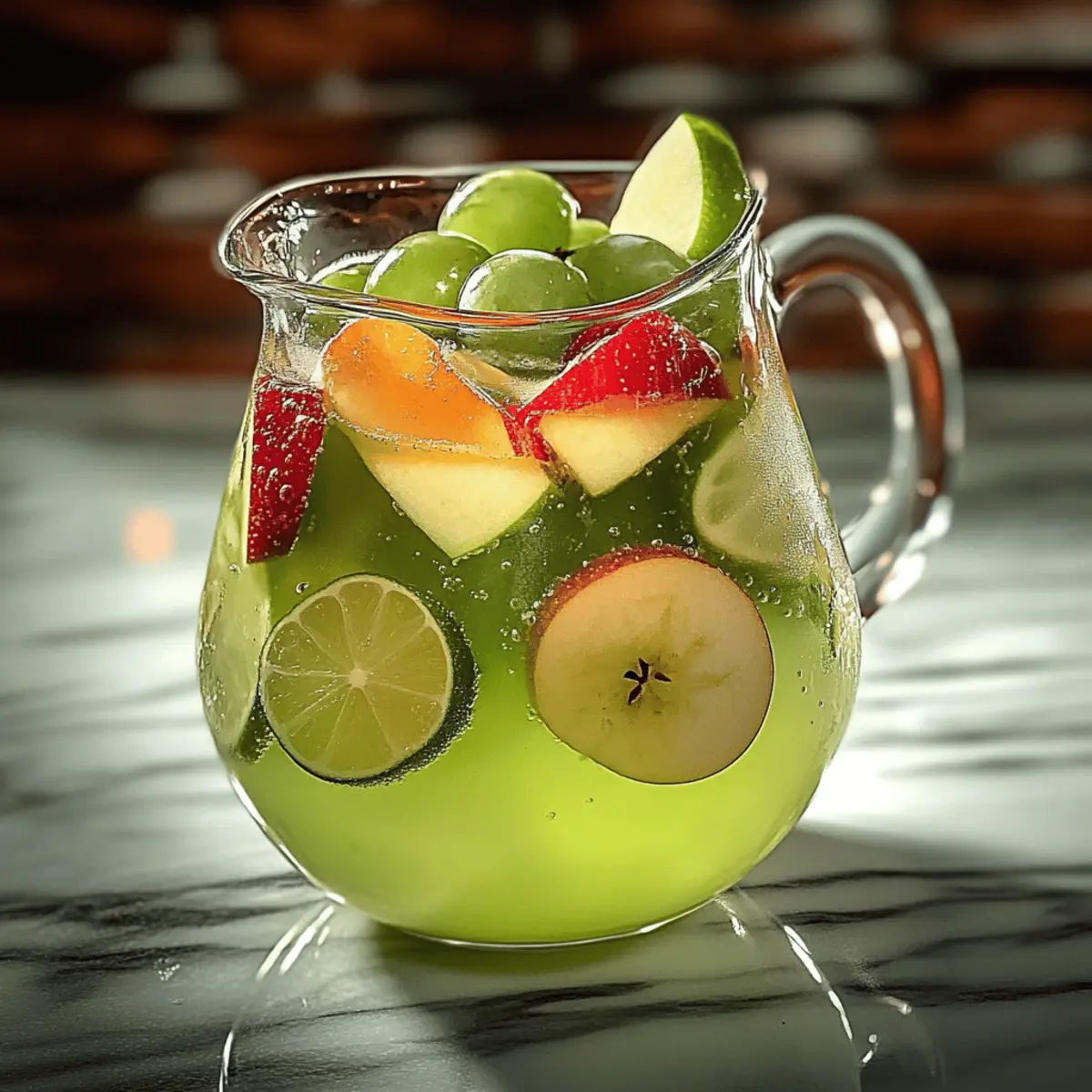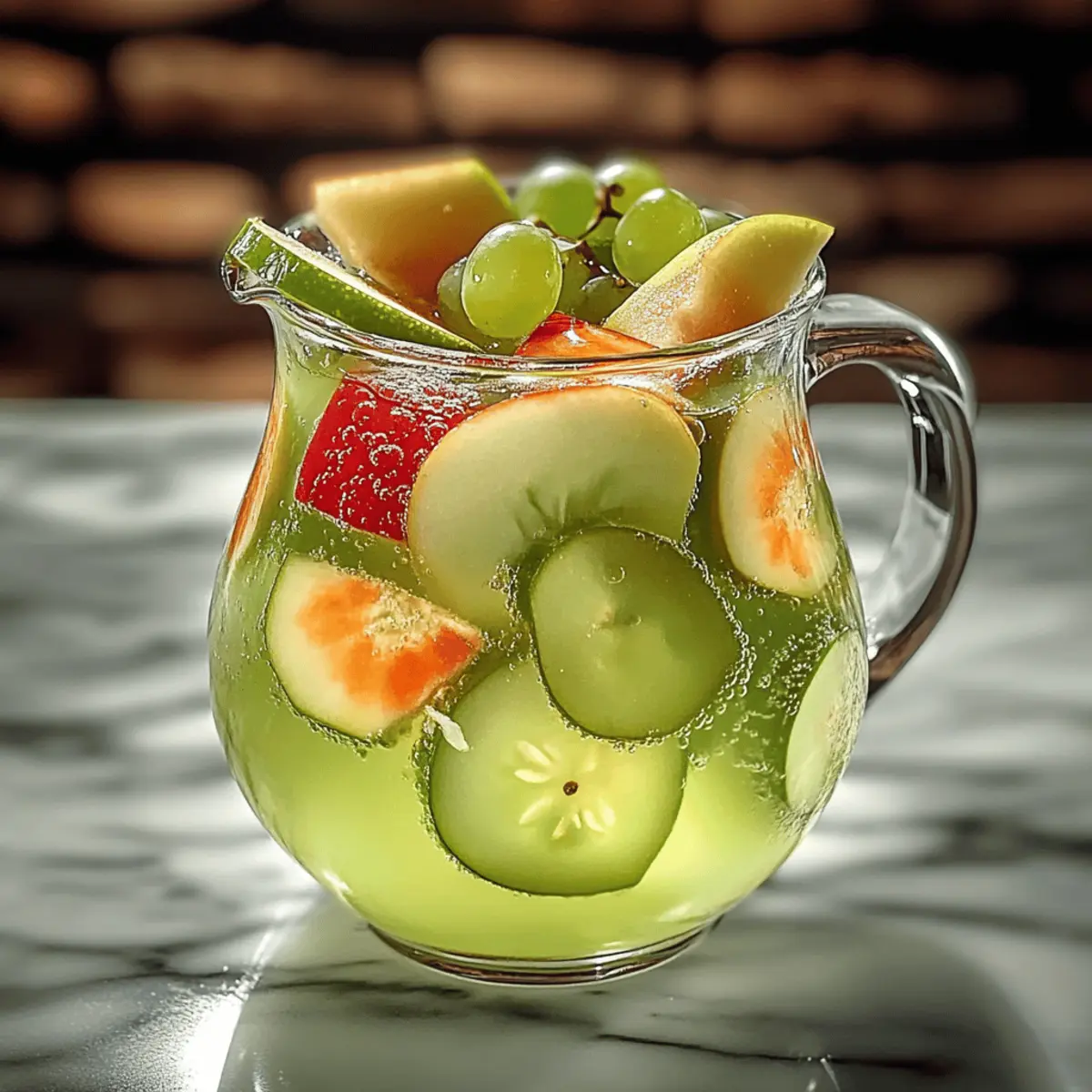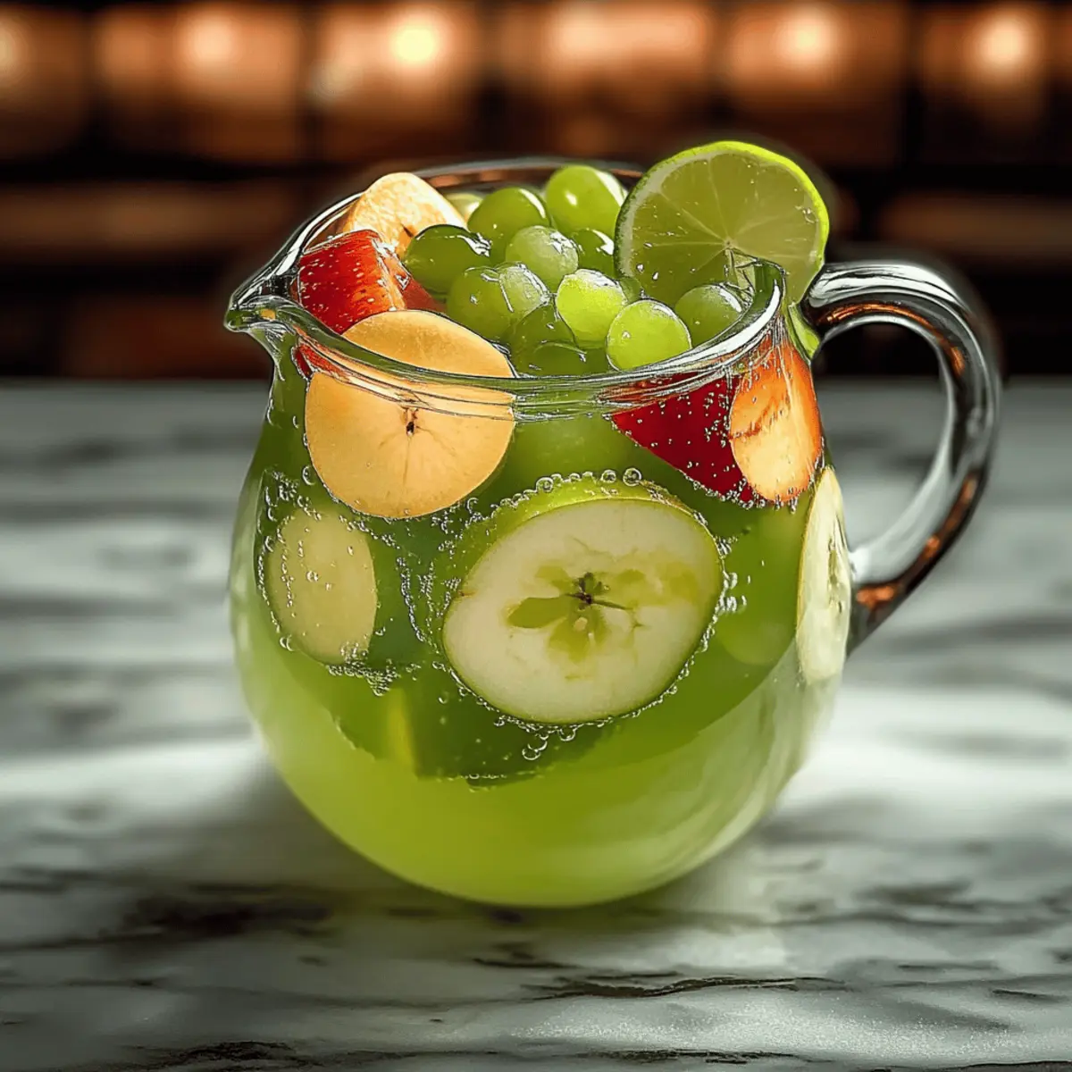 “Can you hear the fizz? It’s the sound of refreshing summer afternoons and laughter shared with friends. My Green Apple Sangria has a twist that combines the crispness of vibrant green apples with the subtle warmth of dry white wine and a splash of brandy. Whether you’re planning a casual brunch or a lively barbecue, this easy-to-prepare cocktail will elevate any gathering. Plus, the customizable sweetness means you can tailor it to everyone’s taste. With each sip, you’ll discover a flawless balance of sweet and tart that’s simply irresistible. Curious about how to make this delightful concoction that feels like a mini celebration in a glass?” Why is Green Apple Sangria Perfect? Refreshing and lively, this Green Apple Sangria is your ticket to vibrant gatherings! Customizable sweetness allows you to adjust it according to your preference, ensuring everyone enjoys their perfect sip. Simple preparation means you can whip it up in no time, leaving you more moments to socialize. Ideal for any occasion, from brunch to summer barbecues, it complements light snacks beautifully, like cheese and crackers. If you love this, try pairing it with Crock Pot Ham for a delightful meal extension! Green Apple Sangria Ingredients • Here’s what you need for a refreshing Green Apple Sangria! For the Sangria • 750 ml bottle of dry white wine – Use Sauvignon Blanc or Pinot Grigio for the best flavor. • 2 green apples (Granny Smith or Honeycrisp) – Adds a crisp texture and tart profile; any firm, tart apple can substitute. • 1/2 cup green grapes – Provide natural sweetness; feel free to substitute with other grapes or omit if desired. • 1/4 cup apple brandy (or regular brandy) – Introduces depth; switch to a different flavored liqueur for a twist. • 1/4 cup orange liqueur (like Cointreau or Triple Sec) – Adds a citrusy sweetness; optional but enhances the flavor considerably. • 1/4 cup simple syrup (or to taste) – Adjusts sweetness to your liking; alternatives include agave syrup or honey. • 1 lime, thinly sliced – A zesty kick that brightens the drink; lemon can be used instead for a different twist. • 1 lemon, thinly sliced – Enhances the fresh, citrus flavor. • 1 liter of sparkling water or club soda – Infuses the sangria with fizz; swap with flavored sparkling water for a fun variation. • Ice, for serving – Crucial for chilling the drink and keeping it refreshingly cold. Optional Garnishes • Mint sprigs – Elevate the aroma and aesthetics of your drink. • Apple slices – Serve as a delightful visual touch; add more for extra flair. • Lime wedges – A customizable touch perfect for each glass. Each element comes together to create a delightful Green Apple Sangria that will be the star of your next gathering! Step‑by‑Step Instructions for Green Apple Sangria Step 1: Wash and Prepare Produce Begin by washing all fresh produce thoroughly under cool water to remove any dirt or residue. Core the two green apples of your choice—Granny Smith or Honeycrisp are great options. Chop them into uniform 1/2-inch to 1-inch cubes, ensuring they’re bite-sized for easy serving later on. This preparation will release their flavors once mixed into your Green Apple Sangria. Step 2: Slice the Citrus Next, halve the 1/2 cup of green grapes and prepare the citrus. Thinly slice the lime and lemon, taking care to remove any seeds you may encounter. Each slice should be delicate, enhancing the presentation of your Green Apple Sangria while contributing a zesty kick. These citrus slices will balance the sweetness of the apples and grapes beautifully. Step 3: Combine the Fruit In a large pitcher, combine the chopped apples, halved grapes, lime slices, and lemon slices. This step is crucial as it allows the flavors to mingle before adding the liquids. Use a large wooden spoon to gently mix the fruits, ensuring an even distribution throughout for a delightful flavor profile in your Green Apple Sangria. Step 4: Add the Wine and Spirits Now, pour in the entire 750 ml bottle of dry white wine over the fruit mixture. Choose a quality Sauvignon Blanc or Pinot Grigio for best results. Next, add 1/4 cup of apple brandy and 1/4 cup of orange liqueur, if using, for a delicious depth of flavor. Stir gently to combine all the ingredients, allowing each component to flavor the mix. Step 5: Adjust the Sweetness Taste the mixture for sweetness and adjust with 1/4 cup of simple syrup, adding more or less according to your preferences. This is the perfect opportunity to personalize your Green Apple Sangria! Once satisfied, cover the pitcher and refrigerate for at least 2 hours or preferably overnight, allowing the flavors to meld beautifully. Step 6: Add Fizz Before Serving When you’re ready to serve, remove the sangria from the fridge. Just before pouring, gently stir in 1 liter of sparkling water or club soda to add a refreshing fizz. The effervescence lifts the drink, making it perfect for any celebration. Make sure not to stir too vigorously, as you want to maintain that delightful sparkle. Step 7: Serve with Ice Fill each glass with ice to keep your Green Apple Sangria perfectly chilled. This is essential, especially on a warm day! Ensure the glasses are ready for pouring so that your guests can enjoy the drink at its optimum temperature right away. Step 8: Pour and Garnish Pour the sangria into the prepared glasses, making sure to include some of the luscious fruit pieces in each pour. For the finishing touch, feel free to garnish each glass with mint sprigs, additional apple slices, or lime wedges, enhancing both flavor and visual appeal. Step 9: Enjoy! Serve the Green Apple Sangria immediately and let the celebration begin! Each sip should offer a refreshing mix of sweet and tart flavors, making it a delightful drink for any occasion. Enjoy the blend of vibrant ingredients that you’ve expertly combined! Tips for the Best Green Apple Sangria Chill Time Matters: Allow yo