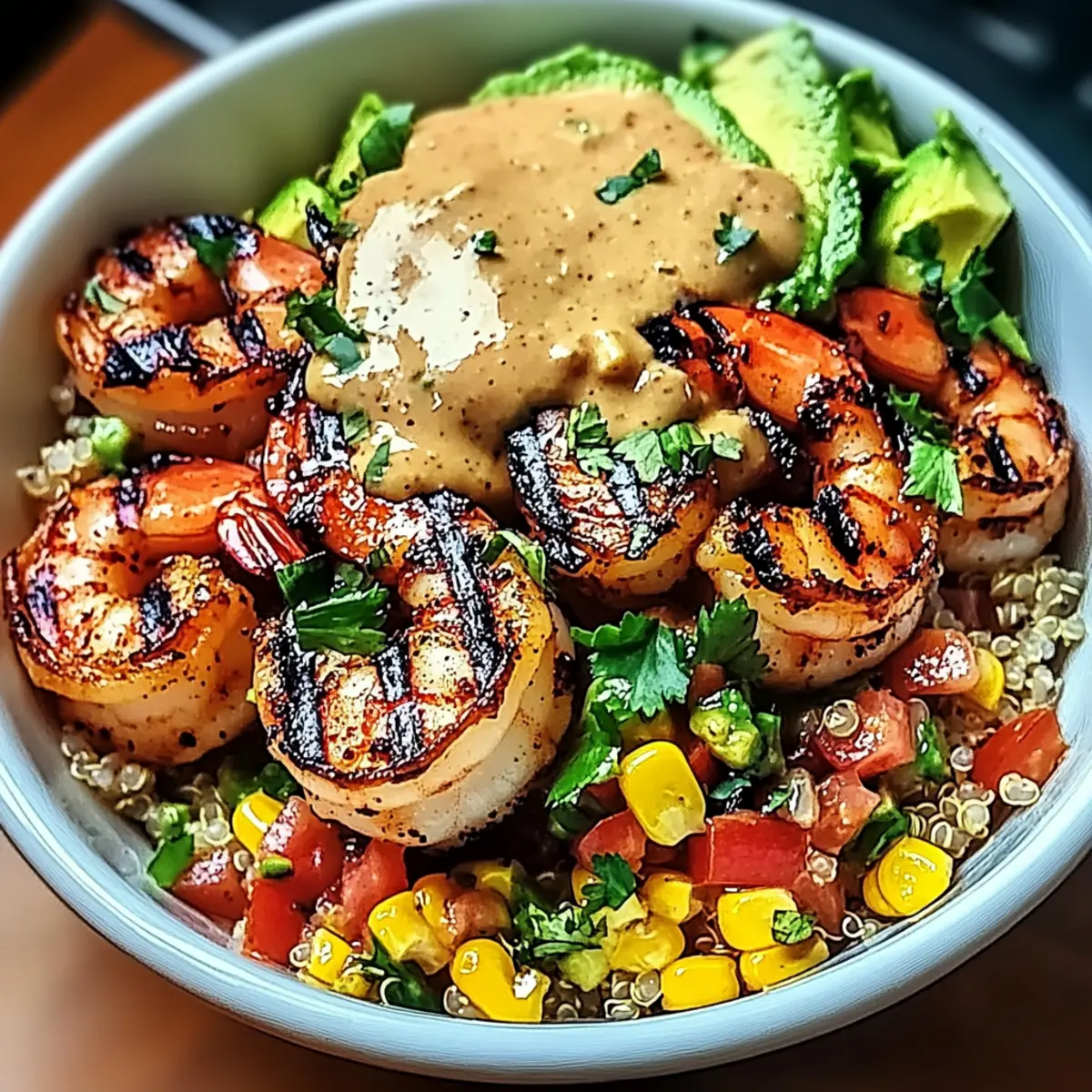 As I mixed the spices for my quick dinner, I could already feel the warm sun on my skin, conjuring memories of summer barbecues filled with laughter and cheer. This Quick Grilled Shrimp Bowl with Avocado and Zesty Corn Salsa is my go-to recipe for those hectic evenings when I still crave something fresh and vibrant. With just 30 minutes of prep time, this healthy, customizable meal not only satisfies my taste buds but also doubles as a meal prep champion, perfect for lunch the next day. Whether you choose succulent shrimp, tender chicken, or even hearty tofu, this bowl is sure to become a family favorite. Curious about what surprise flavors await you in this tasty creation? Why is this Grilled Shrimp Bowl irresistible? Quick and Easy: This recipe whips up in just 30 minutes, making it perfect for busy weeknights and last-minute dinner plans. Customizable Goodness: Whether you’re in the mood for shrimp, chicken, or tofu, this dish accommodates your preferences with ease. Healthy Ingredients: Packed with protein, healthy fats, and vibrant veggies, you’ll feel good about serving this meal to your loved ones. Meal Prep Friendly: The components hold up well in the fridge, allowing you to prepare them in advance for flavorful lunches throughout the week. Flavor Explosion: With the smoky spices and zesty corn salsa paired with creamy avocado, each bite is a delightful journey for your taste buds! For more delicious recipes, try these Shrimp Tacos Mango or Cajun Pasta Shrimp. Grilled Shrimp Bowl Ingredients For the Shrimp Shrimp – Fresh or frozen, these protein-packed beauties are the star of your bowl; substitute with chicken or tofu for versatility. Olive Oil – This will tenderize and add flavor to the shrimp during marination. Smoked Paprika – Adds a deep, smoky flavor; switch to regular paprika for a milder touch. Cumin – Introduces warmth and earthiness; it’s optional if you prefer a lighter spice. Chili Powder – Infuses heat; adjust according to your spice tolerance. Garlic Powder – Enhances the overall flavor; use fresh garlic cloves for a more robust taste. Lime Juice – Brightens up the dish; can be substituted with lemon juice for a tart twist. Salt and Pepper – Essential for seasoning; don’t skip this for well-balanced flavors. For the Corn Salsa Corn – Fresh or frozen, this sweet addition brings texture to your salsa. Red Bell Pepper – Adds crunch and a pop of sweetness; feel free to swap with other bell peppers if desired. Green Onions – Offers a fresh bite; red onion works as a great alternative. Cilantro – A fresh herb that enhances the salsa; leave it out if you’re not a fan. For the Creamy Sauce Mayo (or Greek Yogurt) – Acts as the creamy base; Greek yogurt is a healthier option. Hot Sauce – For those who crave an extra kick! Water – Use to adjust the sauce’s consistency to your liking. These Grilled Shrimp Bowl with Avocado and Zesty Corn Salsa ingredients create a colorful and delicious meal that the whole family will love! Step‑by‑Step Instructions for Grilled Shrimp Bowl with Avocado and Zesty Corn Salsa Step 1: Marinate Shrimp In a medium bowl, combine olive oil, smoked paprika, cumin, chili powder, garlic powder, lime juice, salt, and pepper to create a flavorful marinade. Add the shrimp and toss until they are evenly coated. Allow the shrimp to marinate for 15–20 minutes at room temperature while you prep the other ingredients, infusing them with savory goodness. Step 2: Prepare Corn Salsa In a separate bowl, mix together the corn, diced red bell pepper, chopped green onions, cilantro, lime juice, and a pinch of salt. Stir until all ingredients are evenly distributed. Place the corn salsa in the refrigerator to chill and allow the flavors to meld together, which should take about 10–15 minutes. Step 3: Prepare Avocado Mash While the corn salsa chills, take 1-2 ripe avocados and cut them in half. Scoop the flesh into a bowl and mash with a fork until you reach a creamy consistency. Stir in lime juice, salt, and pepper to taste. Keep the avocado mash aside to ensure its freshness for the Grilled Shrimp Bowl. Step 4: Make Creamy Sauce In a mixing bowl, whisk together mayo or Greek yogurt, lime juice, hot sauce, garlic powder, smoked paprika, and a sprinkle of salt. Adjust the sauce’s thickness by adding a little water if needed, achieving a smooth and creamy consistency. Set this delicious creamy sauce aside to drizzle over your bowl later. Step 5: Grill Shrimp Preheat your grill to medium-high heat, aiming for around 400°F (200°C). Once hot, place the marinated shrimp on the grill grates. Grill for 2–3 minutes per side, ensuring they turn pink and slightly charred. Keep an eye on them to avoid overcooking, as shrimp cook quickly and should be juicy and tender. Step 6: Assemble Bowl Start by layering your choice of cooked rice or quinoa in a bowl. Next, add a generous scoop of corn salsa on one side, followed by a dollop of your creamy avocado mash. Top the bowl with grilled shrimp and drizzle the creamy sauce over everything, finishing off with a sprinkle of fresh cilantro for a vibrant touch. Grilled Shrimp Bowl Variations & Substitutions Feel free to explore these delightful variations to make the Grilled Shrimp Bowl with Avocado and Zesty Corn Salsa your own! Protein Swap: Replace shrimp with chicken for a different flavor or tofu for a vegetarian option. It opens up a world of flavor; grilled chicken adds a juicy twist, while tofu provides a satisfying plant-based alternative. Vegetable Boost: Add black beans or diced tomatoes for more nutrition. This extra step not only enhances the color but also packs your bowl with additional fiber, creating a hearty meal. Grain Alternatives: Substitute white rice with quinoa or brown rice for a heartier base. Not only will you add more nutrients, but the distinct flavors of these grains complement the shrimp beautifully. Spice Level: Adjust chili powder or add cayenne for addit