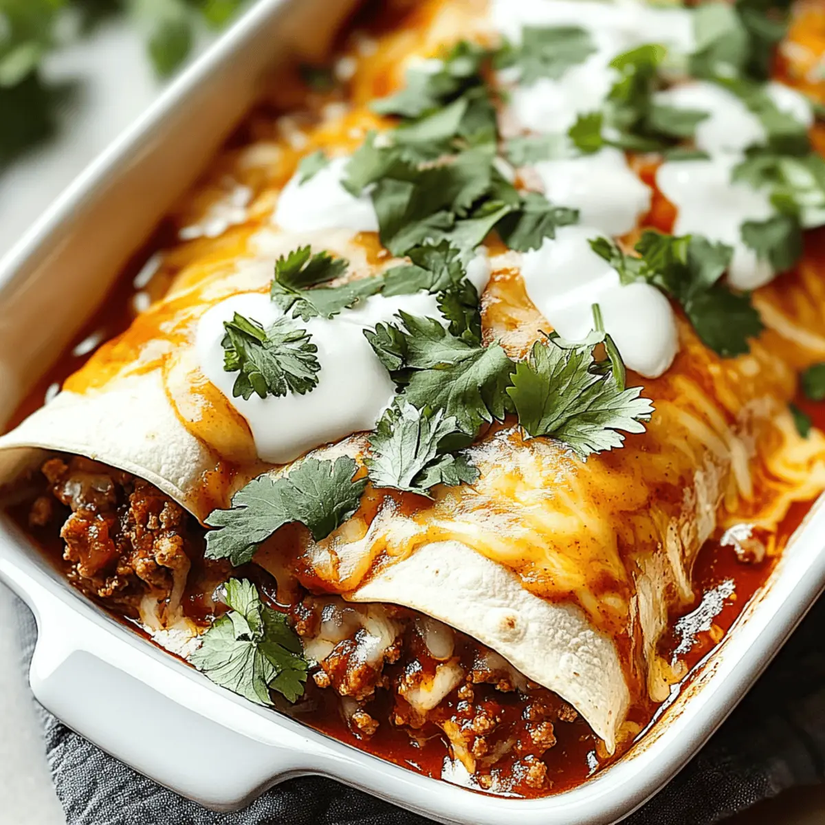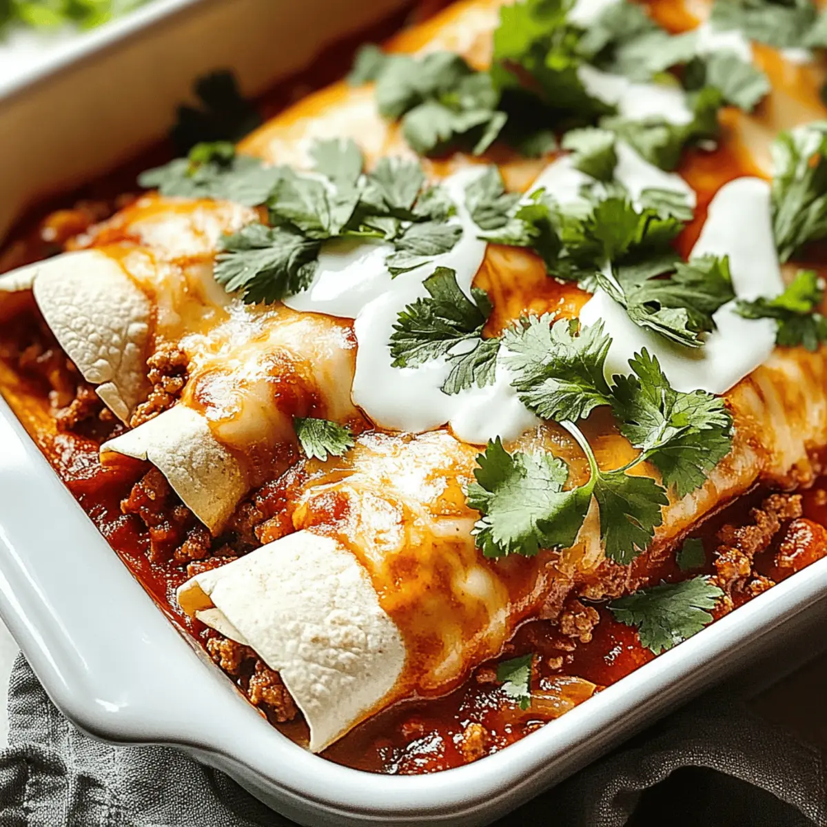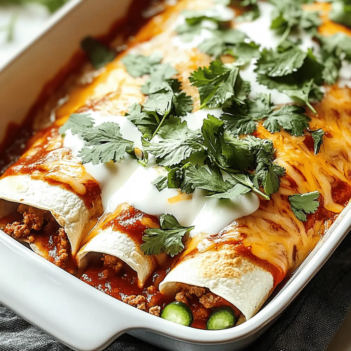 The kitchen was filled with the warm, inviting aroma of melting cheese and seasoned meat, a scent that beckoned everyone to gather around the dinner table. Today, I’m excited to share my simple yet satisfying Easy Ground Beef Enchiladas, perfect for transforming any ordinary weeknight into a delightful culinary experience. This recipe not only promises easy prep but also delivers a comforting meal that even the busiest home chefs can whip up in no time. With tender tortillas cradling juicy beef and zesty sauce, these enchiladas are the ultimate crowd-pleaser, ready to bring smiles and laughter to your next family gathering or cozy evening at home. Are you ready to embark on this delicious flavor adventure? Why Choose Ground Beef Enchiladas? Comforting, these enchiladas boast a hearty blend of flavors that will warm your soul and satisfy your cravings. Versatile by nature, feel free to swap in shredded chicken or lentils to suit your dietary needs. Quick and easy, this dish comes together in just a few steps, making it perfect for busy weeknights. Crowd-pleasing goodness means everyone at the table will be asking for seconds! Pair them with a side of Mexican rice or fresh salad for a complete meal that will remind you of a festive gathering, just like a family feast! Ground Beef Enchiladas Ingredients For the Filling Ground Beef – The star of this dish, delivering rich flavor; you can also use shredded chicken, turkey, or lentils for variation. Onions – These add sweetness and aroma; opt for yellow or white onions to enhance the taste. Garlic – Fresh minced garlic elevates the flavor profile; don’t skip this essential ingredient! Cumin – This spice brings warmth; adjust the amount according to your heat preference. Chili Powder – Adds depth and a touch of spice; feel free to increase if you enjoy a kick! For the Enchiladas Tortillas – The foundation of your enchiladas; lightly frying them helps prevent sogginess. Enchilada Sauce – This adds moisture and tang; choose store-bought for convenience, or make it from scratch if you prefer. Shredded Cheese – Provides a creamy topping; cheddar or a blend of cheeses works wonderfully for extra flavor. Enjoy crafting your delicious Ground Beef Enchiladas with these simple ingredients! Step‑by‑Step Instructions for Ground Beef Enchiladas Step 1: Preheat and Prepare Begin by preheating your oven to 375°F (190°C) while you gather all the ingredients for the Ground Beef Enchiladas. This ensures a hot environment for baking later. Prepare a greased baking dish to hold your enchiladas, and have a skillet ready for cooking the beef and onions. Step 2: Brown the Meat and Onions In your skillet over medium heat, add the ground beef and diced onions. Cook for about 5-7 minutes, stirring occasionally, until the beef is browned and the onions are translucent. This combination will release a wonderful aroma that sets the stage for your enchiladas. Drain any excess grease to keep your filling light and appetizing. Step 3: Add Flavorful Ingredients Next, stir in the minced garlic, cumin, and chili powder into the beef mixture. Continue to cook for an additional minute, allowing the spices to bloom and the garlic to become fragrant. You’ll start to notice the irresistible scent filling your kitchen as the spices mix beautifully with the beef. Step 4: Assemble the Enchiladas On a clean surface, spoon a generous portion of the beef mixture into each tortilla. Roll them tightly, ensuring the seam is facing down as you place each enchilada in your greased baking dish. This process should be done carefully to prevent any spillage, keeping all that delicious filling secure. Step 5: Top with Sauce and Cheese Once all the tortillas are rolled and arranged, pour enchilada sauce evenly over the top. Be generous! Sprinkle a healthy amount of shredded cheese across the surface, knowing it will melt beautifully during baking and create a delightful, gooey layer on top of your enchiladas. Step 6: Bake to Perfection Place the baking dish in your preheated oven and let the Ground Beef Enchiladas bake uncovered for 20-25 minutes. You’ll know they’re ready when the cheese is bubbly and golden brown, and the sauce is bubbling around the edges. This step creates a beautiful crust that’s both inviting and delicious! Step 7: Serve and Enjoy Once out of the oven, let the enchiladas cool for a few minutes before serving. Garnish with optional toppings like chopped cilantro or sliced jalapeños for an extra kick. This comforting dish is perfect for sharing and capturing the warmth of home-cooked meals, making every bite a delightful experience! Make Ahead Options These Easy Ground Beef Enchiladas are perfect for meal prep enthusiasts! You can assemble the enchiladas up to 24 hours in advance by preparing them in a greased baking dish, covering tightly with plastic wrap or aluminum foil to maintain their moisture. Additionally, the filling can be cooked and refrigerated for up to 3 days before assembly to save even more time. When you’re ready to bake, simply remove the cover and pop them in the preheated oven at 375°F (190°C) for 25-30 minutes, ensuring they reach a bubbly, golden-brown state. With these make-ahead strategies, you’ll enjoy a delicious, home-cooked meal with minimal effort on busy weeknights! Ground Beef Enchiladas Variations Feel free to make these enchiladas your own with delightful substitutions and twists that will enhance the flavors and meet your dietary preferences! Chicken or Turkey: Swap out the ground beef for shredded chicken or turkey for a lighter, yet equally flavorful option. You’ll love how the flavors meld with the enchilada sauce! Vegetarian Delight: Replace the meat with lentils or black beans to create a satisfying vegetarian version. So hearty and packed with protein, these enchiladas will be a hit with everyone at the table. Extra Veggies: Add diced bell peppers, zucchini, or corn to the beef mixture for more 