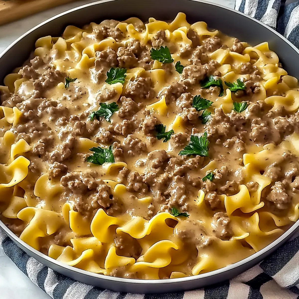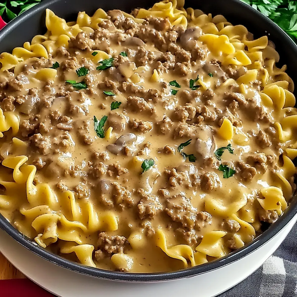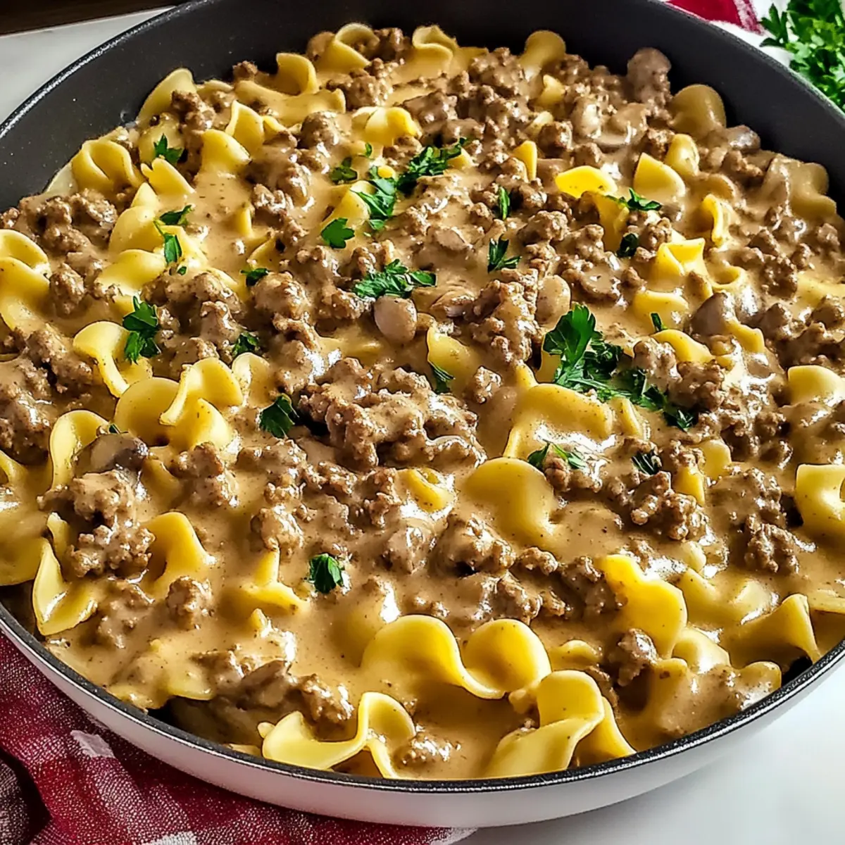 “Every time I hear the sizzle of ground beef hitting a hot skillet, I’m transported back to carefree family dinners filled with laughter and love. This Homemade Hamburger Helper Beef Stroganoff captures that delicious nostalgia and serves it up in a wonderfully quick and easy one-pan meal. Ready in under 30 minutes, it’s perfect for busy weeknights without sacrificing flavor or comfort. The rich, creamy sauce envelops tender beef and perfectly cooked egg pasta, transforming ordinary evenings into delightful culinary moments. Plus, it’s unbelievably customizable—switch to turkey for a lean twist or toss in your favorite veggies for a fresh take. Ready to bring that cozy feeling back to your table? Let’s dive into the joyful world of beef stroganoff!” Why is this beef stroganoff a must-try? Comforting Flavor: This cozy dish is reminiscent of nostalgic family dinners, bringing warmth and satisfaction to your table in just 30 minutes. One-Pan Wonder: With everything cooked in one skillet, cleanup becomes a breeze, making it ideal for busy weeknights. Customizable Delight: Whether you prefer beef, turkey, or a veggie-packed version, this recipe allows for endless variations to suit every palate and dietary need. Kid-Approved: Even picky eaters will absolutely love the creamy texture and rich taste, making it a guaranteed crowd-pleaser. Balanced Meal: With protein and carbs perfectly combined, this dish is not only delicious but also gives your family a nourishing option packed with goodness. If you’re looking for more quick meal ideas, be sure to check out our Cheesy Beef Chimichangas or Shredded Beef Enchiladas for additional comforting dishes! Hamburger Helper Beef Stroganoff Ingredients Whether you’re craving a comforting family meal or simply a quick and easy dinner, the ingredients for this Hamburger Helper Beef Stroganoff are here to guide you! For the Beef • Ground Beef – Use 80/20 for optimal flavor or 90/10 for a leaner option. • Salt – Adjust to taste to enhance overall flavors. • Black Pepper – Freshly ground provides the best flavor and warmth. For the Flavor Base • Garlic Powder – Adds depth; feel free to substitute fresh garlic for a bolder taste. • Onion Powder – Contributes sweetness and aroma; use less if switching to fresh onions. • Paprika – Adds warmth and pops of color; smoked paprika elevates flavor. For the Sauce • Cornstarch – Thickens the sauce; flour can be an alternative if preferred. • Beef Broth – Creates a robust umami sauce base; consider low-sodium options. • Milk – Provides the creamy texture; half-and-half offers a richer alternative. • Worcestershire Sauce – Adds savory depth; soy sauce acts as a gluten-free substitute. • Cream of Mushroom Soup – Creates a creamy base; homemade or vegan options are great for dietary needs. • Sour Cream – Delivers a tangy richness; Greek yogurt serves as a healthy substitute. For the Pasta • Egg Pasta – The base of the dish; choose gluten-free pasta if needed. Those are your core ingredients, ready to whip up a delicious Hamburger Helper Beef Stroganoff that’s bound to become an instant family favorite! Step‑by‑Step Instructions for Homemade Hamburger Helper Beef Stroganoff Step 1: Brown the Ground Beef In a large skillet, heat a drizzle of oil over medium-high heat. Add 1 pound of ground beef, breaking it into small chunks with a spatula. Cook for 5-7 minutes, stirring occasionally, until the beef is browned and fully cooked, with no pink remaining. This step develops the deep flavors that make your Hamburger Helper Beef Stroganoff delicious. Step 2: Season the Meat Once the ground beef is cooked, reduce the heat to medium and season it with salt, black pepper, garlic powder, and onion powder. Sauté the mixture for about 1 minute, allowing the seasonings to become fragrant. This aromatic blend will create a savory foundation for your stroganoff. Step 3: Thicken the Mixture Sprinkle a tablespoon of cornstarch evenly over the seasoned beef in the skillet. Stir well for about 30 seconds to coat the meat, which will help thicken the sauce later. The cornstarch will ensure a creamy texture in your Homemade Hamburger Helper Beef Stroganoff. Step 4: Prepare the Sauce Base Remove the browned beef from the skillet and set it aside. To the same skillet, pour in 2 cups of beef broth, 1 cup of milk, and 1 tablespoon of Worcestershire sauce. Increase the heat to medium-high and bring the mixture to a gentle boil, stirring occasionally to incorporate all the flavors. Step 5: Cook the Pasta Once the sauce is boiling, add in 8 ounces of egg pasta and give it a good stir. Cover the skillet and reduce the heat to low, letting it simmer for about 8 minutes, or until the pasta is cooked al dente. Stir occasionally to prevent sticking and ensure that each piece is coated with the sauce. Step 6: Combine All Ingredients After the pasta has cooked, return the beef to the skillet. Add in a can of cream of mushroom soup and ½ cup of sour cream, stirring everything together until fully combined. This step will transform your ingredients into a luscious, creamy mixture that epitomizes Homemade Hamburger Helper Beef Stroganoff. Step 7: Finish Cooking Stir in a teaspoon of paprika for an extra pop of flavor and vibrant color. Let the mixture simmer for another 2-3 minutes, allowing all the ingredients to meld together beautifully. Once heated through, remove the skillet from the heat and let it rest briefly before serving to enhance the flavors. How to Store and Freeze Hamburger Helper Beef Stroganoff Fridge: Store leftover Hamburger Helper Beef Stroganoff in an airtight container for up to 4 days. Ensure it’s cooled completely before refrigerating to maintain quality. Freezer: Freeze portions in airtight containers or freezer bags for up to 2 months. For best results, label them with the date for easy tracking. Reheating: Thaw frozen stroganoff overnight in the fridge. Rehea