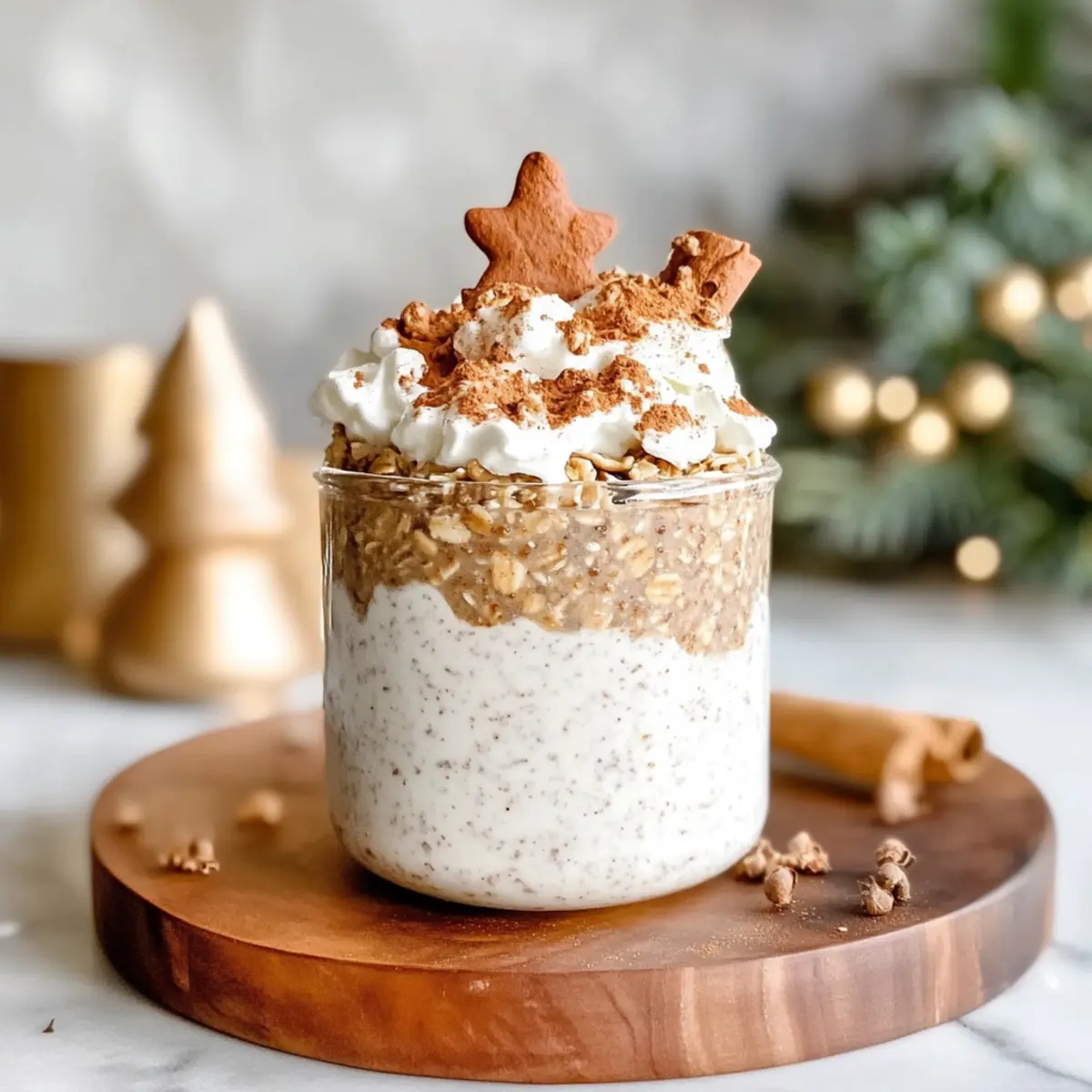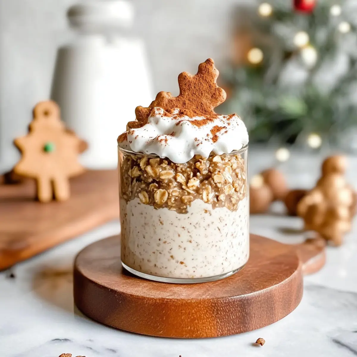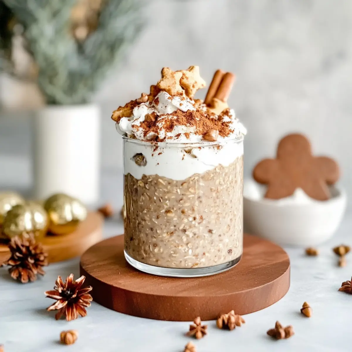 In the morning, open the container and take a moment to appreciate the delightful aroma. Layer the creamy oats into jars or cups, adding a dollop of plant-based yogurt in between for extra creaminess. This layering not only enhances texture but also elevates the indulgent feel of your High Protein Gingerbread Overnight Oats, making each bite a little piece of holiday magic.