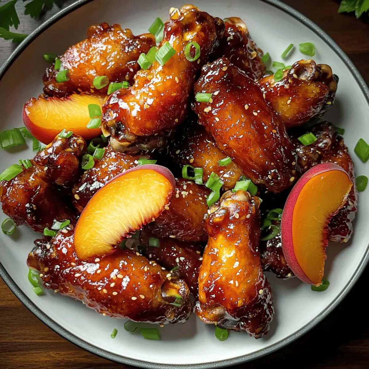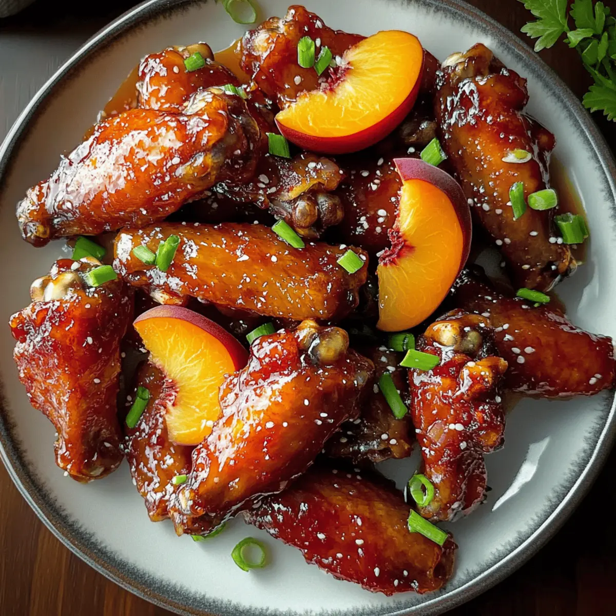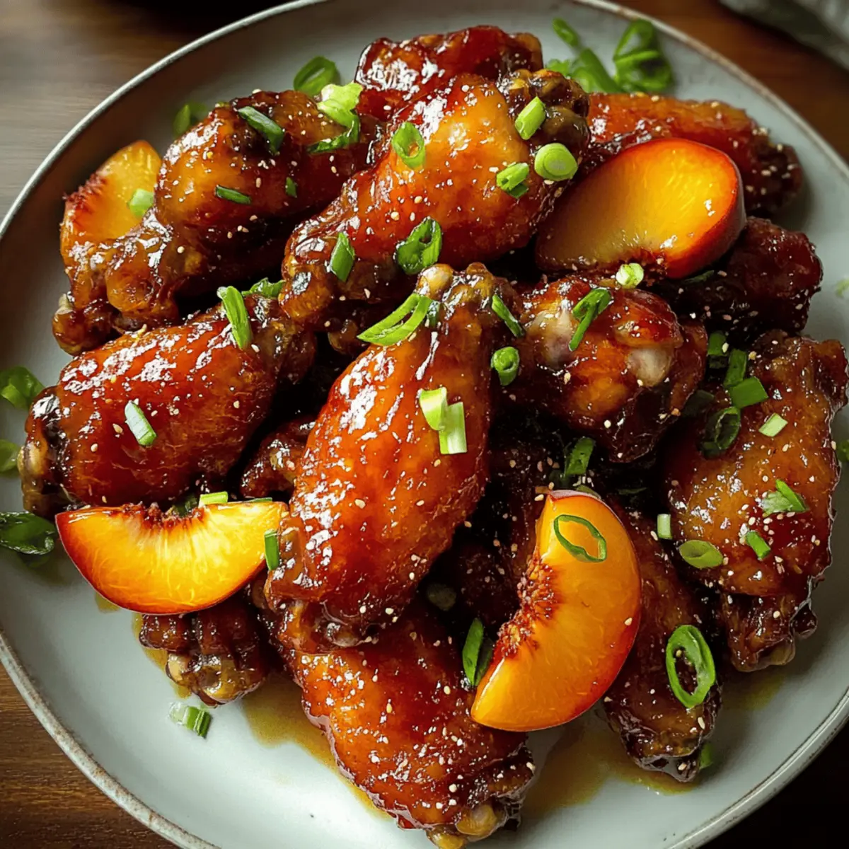 The sizzle of chicken wings in the oven brought a wave of nostalgia as I reminisced about summer cookouts and game day gatherings. That’s where my latest obsession, Hot Honey Peach Wings, comes in—a fusion of sweet and spicy that transforms simple ingredients into a mouthwatering feast. Baked to perfection at 400°F, these wings are coated in a sticky glaze made from peach preserves and honey, with just the right kick from hot sauce. Not only are they incredibly easy to make, but they also promise to be the star of your next gathering. Whether you’re tailgating or simply craving comfort food, these scrumptious wings are ready to elevate your experience. Ready to dive into a world of flavorful fun? Let’s get cooking! Why Choose Hot Honey Peach Wings? Irresistible Flavor Fusion: The perfect blend of sweet peach preserves and spicy hot sauce creates a unique taste that dances on your palate. Effortless Cooking: With just a few simple ingredients and easy-to-follow steps, these wings are a breeze to prepare, making them perfect for busy weeknights or last-minute gatherings. Crowd Pleaser: Whether serving at a game day party or a summer barbecue, you’ll find these wings quickly disappearing from the platter, leaving your guests wanting more. Versatile Choices: Experiment with different preserves, like apricot or mango, to customize the flavor to your liking, ensuring everyone can enjoy the dish. Healthier Alternative: Baked rather than fried, these wings offer a guilt-free indulgence without sacrificing flavor, making them a go-to option for health-conscious foodies. Pair them with refreshing sides like coleslaw or a cool dressing, and you’re set for an unforgettable meal! Enjoy the sticky goodness that is Cajun Honey Butter Salmon next time for another delicious twist! Hot Honey Peach Wings Ingredients For the Wings • Chicken Wings – The heart of this dish, providing tender meat with a crispy bite. • Olive Oil – This helps grease the rack for crispiness when baking. For the Glaze • Peach Preserves – Adds sweet, fruity flavor; swap with apricot preserves if needed. • Honey – Works as a natural sweetener and helps thicken the glaze for a sticky finish. • Soy Sauce – Brings umami depth that enhances the overall flavor profile. • Apple Cider Vinegar – Adds acidity to balance out the sweetness in the wings. • Hot Sauce – Adjust this to control the heat level according to your preferences. • Garlic Powder – Provides a savory kick without being overpowering. • Onion Powder – Contributes subtle sweetness and depth to the glaze. • Salt – Essential for seasoning and enhancing the flavors. • Black Pepper – Adds a touch of warmth to the overall flavor. Optional Garnishes • Fresh Peaches – Slices add a burst of freshness and color to your wings. • Green Onions – Sprinkle for a pop of color and an extra layer of flavor. These Hot Honey Peach Wings are a delightful way to liven up any game day with their sweet and heat balance! Enjoy! Step‑by‑Step Instructions for Hot Honey Peach Wings Step 1: Preheat the Oven Begin by preheating your oven to 400°F (200°C). Line a baking sheet with aluminum foil and place a greased wire rack on top. This setup allows for air circulation around the Hot Honey Peach Wings, ensuring they turn out crispy all around. Make sure the rack is well-oiled to prevent sticking. Step 2: Prepare the Glaze In a mixing bowl, combine peach preserves, honey, soy sauce, apple cider vinegar, hot sauce, garlic powder, onion powder, salt, and black pepper. Stir the mixture until it’s well blended and smooth, creating a velvety glaze that will coat the wings beautifully. Set aside half of the glaze for later use. Step 3: Coat the Wings Take your chicken wings and place them in a large bowl. Pour half of the prepared glaze over the wings, making sure they are evenly coated. For the best flavor, let the wings marinate for about 15 minutes at room temperature, allowing the flavors to penetrate the meat deeply. Step 4: Bake the Wings Arrange the marinated wings on the greased wire rack in a single layer, ensuring they aren’t crowded. Bake in the preheated oven for 35–45 minutes, flipping the wings halfway through. Look for a crispy, golden-brown exterior and an internal temperature of at least 165°F to ensure they are fully cooked. Step 5: Thicken the Glaze While the wings are baking, take the reserved glaze and pour it into a saucepan. Heat over medium heat for about 5–7 minutes, stirring occasionally, until it thickens slightly and becomes syrupy. This concentrated glaze will enhance the flavor and stickiness when coated on the wings. Step 6: Glaze the Wings Once the wings are perfectly crispy and cooked through, remove them from the oven. Carefully transfer the hot wings into a mixing bowl and pour the thickened glaze over them. Toss them gently until each wing is beautifully coated in the sticky, sweet glaze, ready for serving. Step 7: Rest and Garnish Let the glazed wings rest for a few minutes to allow the sauce to adhere. If desired, add a sprinkle of fresh peach slices and chopped green onions for a bright garnish. These vibrant toppings will not only enhance presentation but also add a refreshing touch to your Hot Honey Peach Wings. Expert Tips for Hot Honey Peach Wings • Thaw Properly: Ensure your chicken wings are fully thawed if using frozen ones; this ensures even cooking and sauce adherence. • Customize Heat: Adjust the amount of hot sauce in the glaze to achieve your preferred spice level—more for heat lovers, less for a milder experience. • Crispy Perfection: Flip the wings halfway through baking for an even crispiness; this little step can make a big difference in texture. • Thickened Glaze: Don’t skip the step of thickening the reserved glaze—this enhances the stickiness and makes every bite of Hot Honey Peach Wings delectably delicious. • Serve Strategically: Pair these wings with cool dip