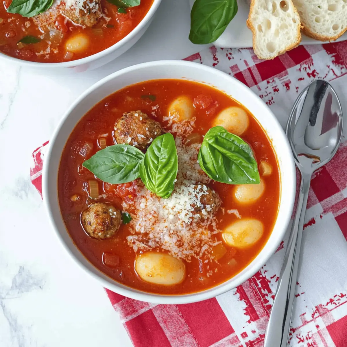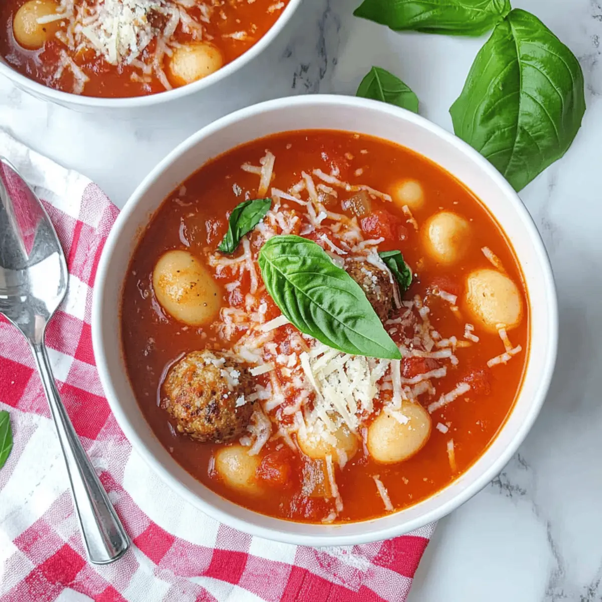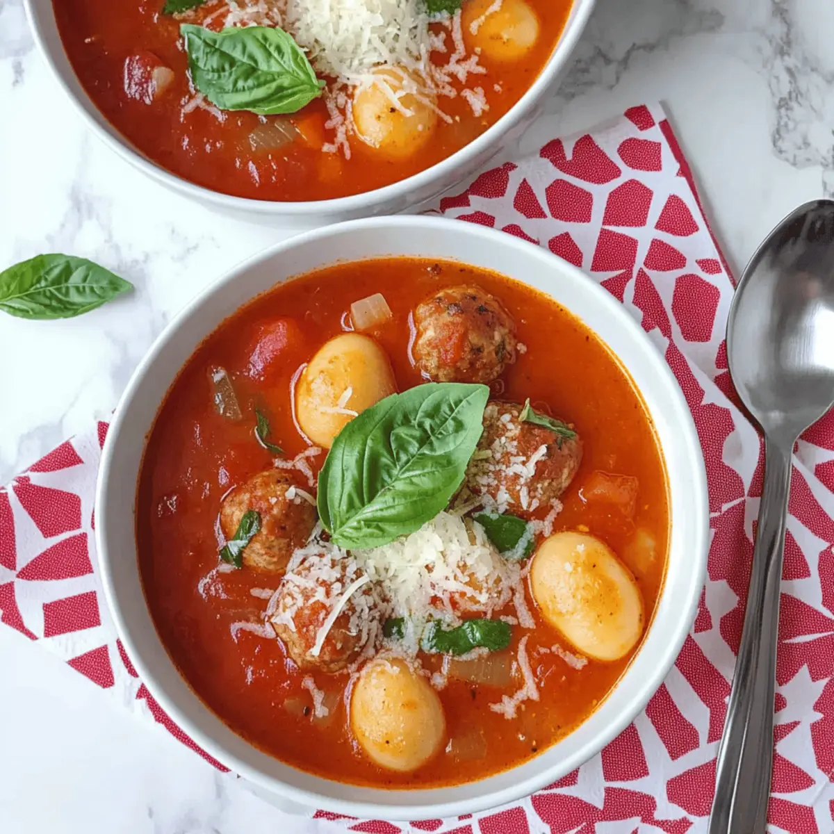 As the chilly breeze of autumn dances through the trees, nothing warms the heart quite like a steaming bowl of comforting soup. This Easy Slow Cooker Italian Meatball & Gnocchi Soup is my go-to recipe for those busy evenings when the family craves a hearty meal without the fuss. With tender meatballs and soft gnocchi simmered in a rich, flavorful broth, it strikes the perfect balance between indulgence and wholesome nourishment. Plus, it’s wonderfully versatile—you can swap the meatballs for turkey or plant-based alternatives depending on your dietary needs. Not only is this dish a family-friendly choice that even picky eaters will adore, but it’s also an easy, slow cooker meal that allows you more time to relax after a long day. Ready to dive into a bowl of this Italian-inspired comfort? Let’s get cooking! Why is This Soup a Must-Try? Comforting, hearty meal: This Italian Meatballs & Gnocchi Soup envelops you in warmth with every spoonful, ensuring a cozy evening. Minimal Prep: Just toss the ingredients into the slow cooker and let it work its magic—ideal for busy families! Flavorful Variety: You can easily customize the recipe to suit your taste—try using Teriyaki Turkey Meatballs for a twist! Nutritional Boost: Packed with vegetables and protein, it’s not only filling but also nourishing. Crowd-Pleaser: Even picky eaters can’t resist this combination of tender meatballs and soft gnocchi in a rich tomato broth. Experience true comfort this autumn with a steaming bowl of this delightful soup! Italian Meatball & Gnocchi Soup Ingredients • Get ready for comfort in a bowl! For the Meatballs Ground Beef or Turkey – These provide essential protein; turkey is a leaner option. Breadcrumbs – Helps bind the meatballs together; gluten-free breadcrumbs can be used for dietary needs. Egg – Acts as a binder; replace with a flax egg for a vegan option. Parmesan Cheese – Adds flavor; optional for gluten-free or vegan versions. Italian Seasoning – Brings that classic Italian flair; feel free to adjust based on preference. For the Soup Base Canned Tomatoes (2 cans, 400g each) – Form the rich broth’s base; opting for crushed tomatoes gives a thicker texture. Vegetables (Carrots, Celery, Onions) – Adds nutrients and depth; use whatever you have on hand for versatility. Vegetable or Chicken Stock – Enhances the soup’s flavor; low sodium versions are smart for controlling salt. For the Gnocchi Gnocchi – Soft, pillowy goodness that acts as the star in this dish; both fresh or frozen work wonders. Garnishes Fresh Basil – Sprinkle on top for added visual appeal and freshness. Parmesan Cheese (for garnish) – Elevates the dish’s flavors; sprinkle it generously before serving. Ready to savor the comforting embrace of this Italian Meatball & Gnocchi Soup? Let’s bring these simple ingredients together for a meal that’s sure to delight! Step‑by‑Step Instructions for Easy Slow Cooker Italian Meatball & Gnocchi Soup Step 1: Combine Ingredients In your slow cooker, begin by adding the ground meatballs, canned tomatoes, and any chopped vegetables like carrots and celery. Pour in enough chicken or vegetable broth to cover the mixture well. Stir gently to combine the ingredients evenly, ensuring the broth is well mixed with the tomatoes and vegetables. This forms the hearty base for your Italian Meatballs & Gnocchi Soup. Step 2: Cook Low and Slow Set your slow cooker to low and cover it with the lid. Allow the soup to cook for 4 to 5 hours, which lets the flavors meld beautifully. Check occasionally and ensure the meatballs are cooked through and the vegetables are tender. You’ll know it’s ready when you can easily bite into a meatball and see the vibrant color of the soup. Step 3: Add Gnocchi About 30 minutes before serving, gently add the gnocchi to the slow cooker. Stir the gnocchi into the bubbling soup, allowing them to soften and cook without becoming mushy. This is when your Easy Slow Cooker Italian Meatball & Gnocchi Soup comes together, and the aroma will start to fill your kitchen with comforting, mouthwatering scents. Step 4: Serve and Garnish Once the gnocchi have cooked through and the soup is bubbling, it’s time to serve! Ladle the steaming soup into bowls, ensuring each serving gets a good mix of meatballs, gnocchi, and broth. Top each bowl with a sprinkle of grated Parmesan cheese and fresh basil for an extra touch of flavor and color. Enjoy your hearty meal! What to Serve with Easy Slow Cooker Italian Meatball & Gnocchi Soup As the rich aromas fill your home, it’s delightful to think about what delicious sides can accompany this comforting bowl of goodness. Crusty Bread: Perfect for soaking up the flavorful broth, crusty bread adds a satisfying crunch and is a classic companion. Garlic Toast: The buttery, garlicky goodness pairs beautifully with the soup, adding a touch of crunch and flavor. Fresh Salad: A light arugula or spinach salad with a tangy vinaigrette can provide a refreshing contrast to the hearty soup. Roasted Vegetables: Tossed with olive oil and herbs, roasted seasonal vegetables not only enhance the nutritional value but also add a wonderful depth of flavor. Parmesan Cheese: A sprinkle on top before serving enhances every bite and elevates the dish’s classic Italian flavors. Wine Pairing: A glass of Chianti complements the tomato base wonderfully, making it perfect for a cozy night in. Trying different pairings can elevate your meal to new heights, making dinner a truly special occasion! How to Store and Freeze Italian Meatballs & Gnocchi Soup Fridge: Store leftover Italian Meatballs & Gnocchi Soup in an airtight container for up to 2 days. This will keep the flavors fresh while allowing for easy reheating later. Freezer: To freeze, allow the soup to cool completely, then transfer it to freezer-safe containers. It can be frozen for up to 3 months. Thaw overnight in the fridge before reheating. Reheating: Reheat your soup thorou