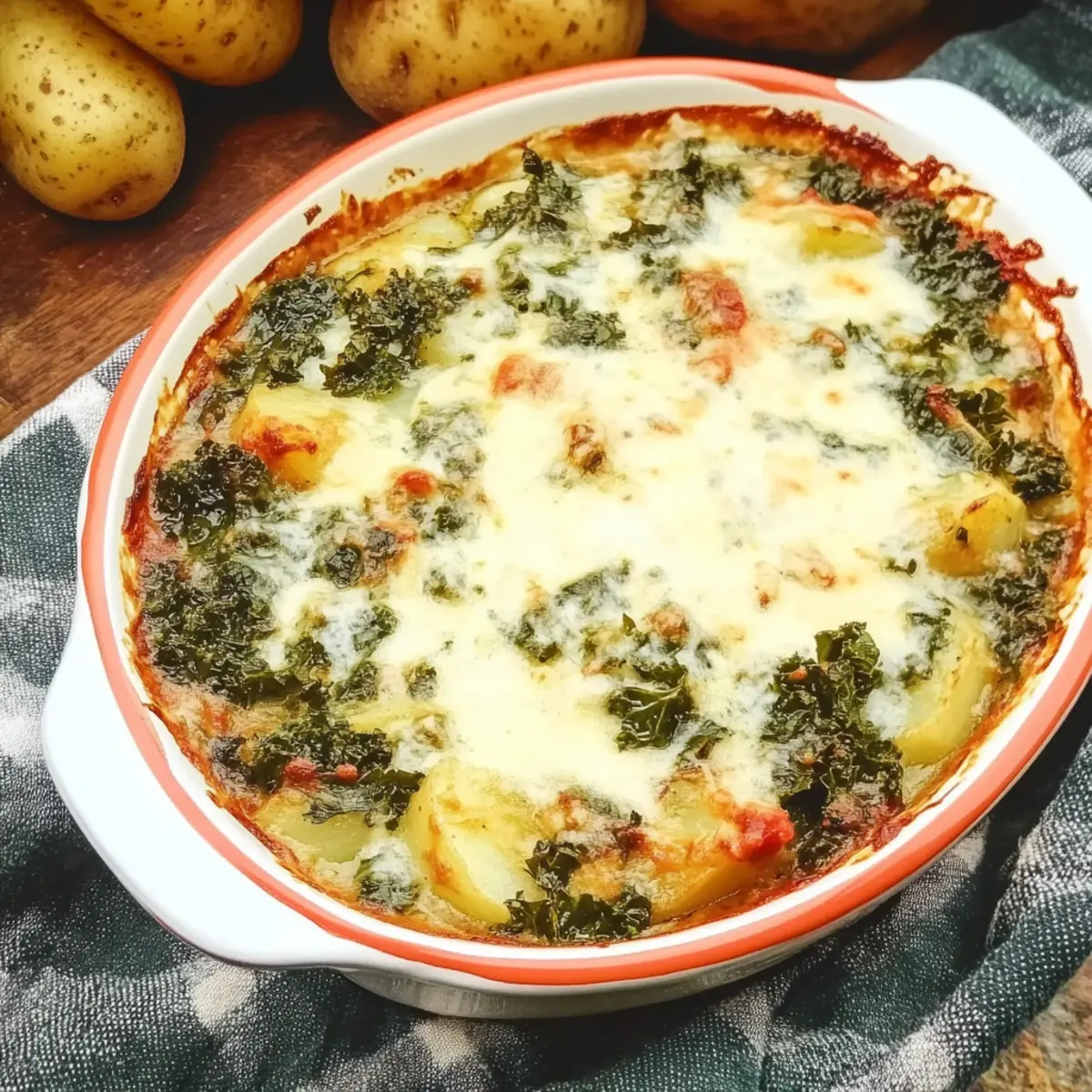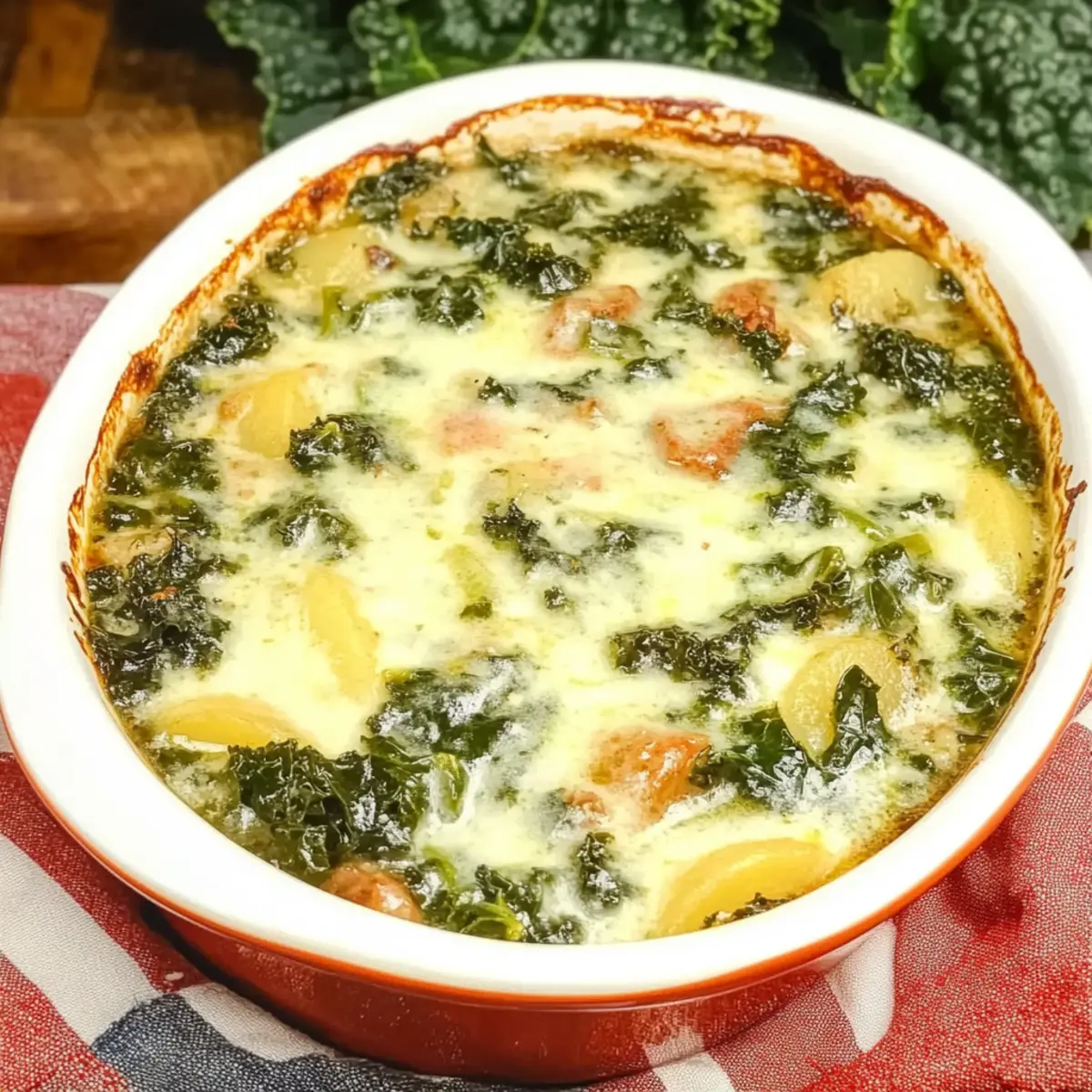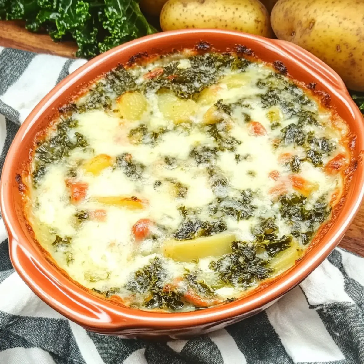 As the first whispers of autumn chill fill the air, I find myself yearning for a dish that embodies warmth and comfort. Enter the Hearty Italian Zuppa Toscana Casserole, a delightful embrace of spicy sausage, tender potatoes, and colorful kale that transforms any ordinary evening into a culinary experience. This one-pot wonder not only comes together in a snap, but its creamy, rich texture makes it a surefire family favorite that can be enjoyed all week long. With its mouthwatering aroma wafting through the kitchen, you’ll feel the cozy comfort of traditional Italian home cooking wrap around you like a warm hug. Curious to see how you can whip up this comforting delight in your own kitchen? Why is This Casserole So Irresistible? Hearty Comfort: This Italian Zuppa Toscana Casserole effortlessly combines comfort and flavor, making it the ultimate dish for chilly nights. One-Pot Wonder: Enjoy the simplicity of a one-pot meal that minimizes cleanup time, allowing you to focus on what matters most—delicious food and family. Quick & Easy: Perfect for busy weeknights, this recipe comes together in under an hour without compromising on taste or heartiness. Flavorful Variations: Mix it up with plant-based sausage or vibrant veggies like carrots for a personalized twist on this classic dish without losing its comforting essence. Family Favorite: With its creamy texture and robust flavors, this casserole is sure to become a staple in your household, drawing everyone together around the table. Pair it with crusty bread or a refreshing salad for a complete meal—just like you would with my delicious Italian Meatballs Savory or Cauliflower Broccoli Casserole. Enjoy! Italian Zuppa Toscana Casserole Ingredients For the Casserole Italian Sausage – Provides savory flavor and protein; use spicy chorizo or mild breakfast sausage for a twist. Onion – Adds sweetness and depth to the base flavor; shallots offer a milder taste if desired. Garlic – Enhances overall flavor with aromatic qualities; fresh minced garlic is always best. Low-Sodium Chicken Broth – Acts as the liquid base giving moisture and flavor; substitute vegetable broth for a vegetarian option. Heavy Cream – Creates a rich, creamy texture; half-and-half is a lighter alternative. Russet Potatoes – Adds heartiness and absorbs flavors; Yukon Gold potatoes give a smoother texture. Kale – Provides freshness and color, along with essential nutrients; Spinach works beautifully if you prefer. Dried Thyme – Enhances flavor with herbal notes; Italian seasoning can be a convenient alternative. Red Pepper Flakes – Introduces a spicy kick; omit if you want a milder casserole. Step‑by‑Step Instructions for Italian Zuppa Toscana Casserole Step 1: Cook Sausage In a large pot over medium-high heat, crumble and brown 1 pound of Italian sausage for 5–7 minutes, stirring frequently until it’s nicely browned and cooked through. You want it to have a bit of a crispy texture without any pink remaining. This will form the flavor base for your Italian Zuppa Toscana Casserole. Step 2: Sauté Aromatics Add one diced onion to the pot and sauté for 3–4 minutes, allowing it to soften and turn translucent. Then, stir in 3 minced cloves of garlic and continue to sauté for an additional minute until fragrant. The combination of sausage, onion, and garlic will create a mouthwatering aroma that fills your kitchen. Step 3: Simmer Broth Pour in 4 cups of low-sodium chicken broth and bring the mixture to a gentle simmer. Once simmering, add 2 cups of cubed russet potatoes, cooking for 12–15 minutes until the potatoes are fork-tender. The broth should be bubbling lightly, creating a rich and flavorful base for your casserole. Step 4: Combine Ingredients Reduce the heat and stir in 1 cup of heavy cream and 4 cups of chopped kale. Allow the mixture to simmer for another 5 minutes until the kale wilts and brightens in color. This step adds creaminess and a vibrant freshness to your Italian Zuppa Toscana Casserole, making it even more appealing. Step 5: Season & Serve Season the casserole with 1 teaspoon of dried thyme, ½ teaspoon of red pepper flakes, salt, and pepper to taste. Adjust the flavors to your preference, then serve hot in bowls, garnishing with freshly grated parmesan if desired. This hearty dish, with its creamy texture and delicious flavors, will surely warm your heart and home. Expert Tips for Italian Zuppa Toscana Casserole Sautéing Sausage Well: Cooking the sausage until it’s nicely browned deepens the flavor, adding that lovely savory richness essential for your Italian Zuppa Toscana Casserole. Mind the Thickness: If the casserole turns out too thick, simply add more broth to reach your desired consistency. If too thin, let it simmer longer until it thickens. Use a Dutch Oven: For even cooking and easy stove-to-oven transfer, use a Dutch oven, ensuring every ingredient melds beautifully in this one-pot meal. Layers of Flavor: Enhance the depth of flavor by letting the mixture simmer longer once you’ve added the cream and kale; this melds the ingredients perfectly. Try Your Own Twist: Feel free to experiment! Adding other veggies or swapping out the sausage creates delightful variations while maintaining the comforting essence of the casserole. How to Store and Freeze Italian Zuppa Toscana Casserole Fridge: Store leftovers in an airtight container for up to 4 days, ensuring the casserole stays fresh and tasty for your next meal. Freezer: Freeze the casserole in an airtight container for up to 3 months. Label and date the container for easy identification later. Reheating: Reheat gently on the stovetop or microwave, adding a splash of chicken broth or cream if needed to restore its creamy consistency. Make-Ahead: You can prepare the casserole ahead of time. Allow flavors to meld overnight and simply reheat for an even richer taste whenever you’re ready to enjoy this hearty Italian Zuppa Toscana Casserole. Italian Zuppa Toscana 