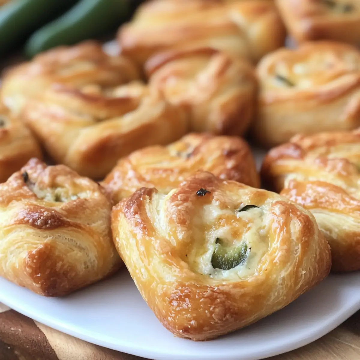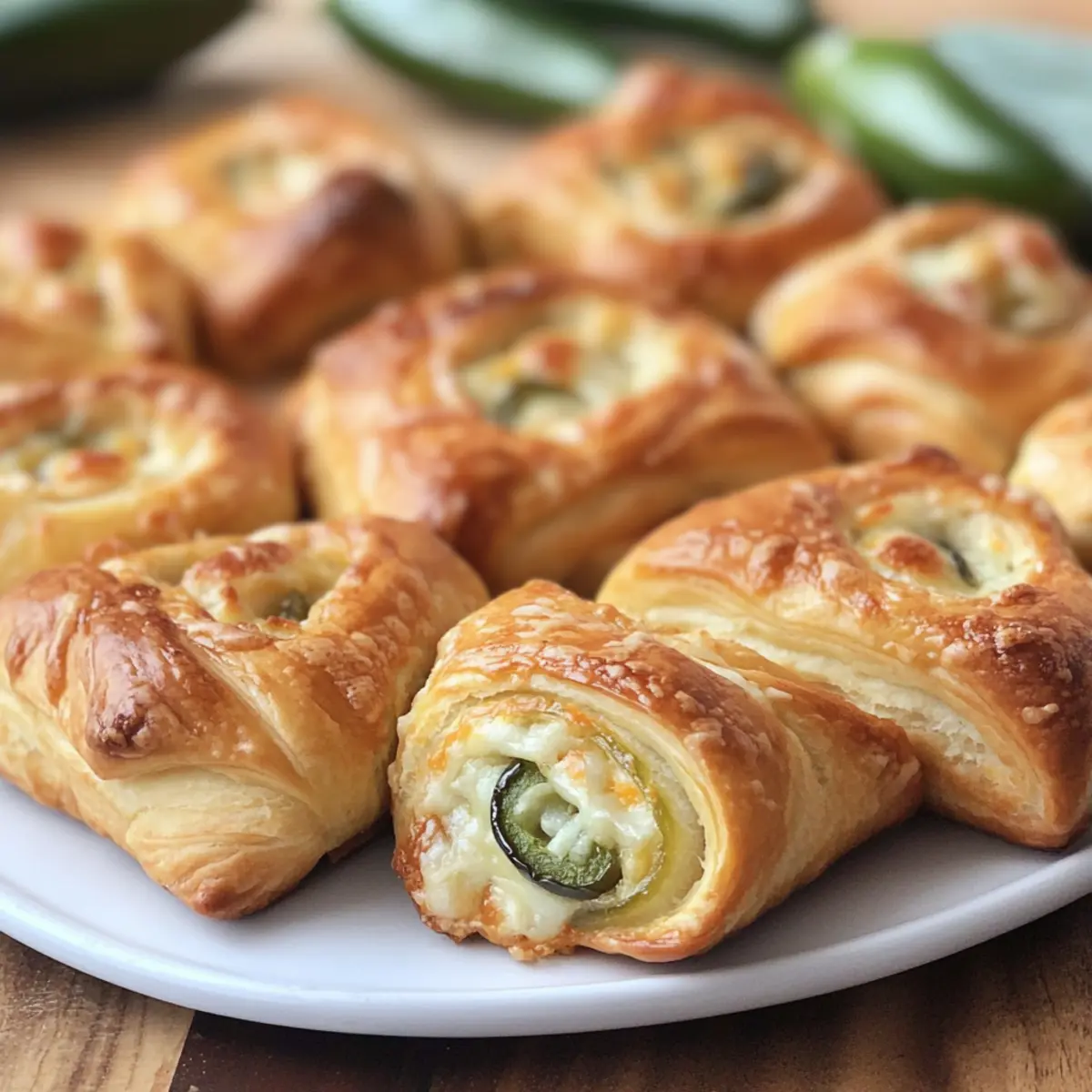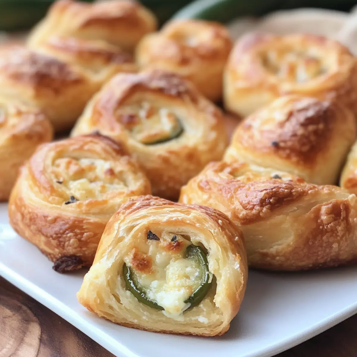 As I walked through the bustling local market, the fiery scent of jalapeños caught my attention, igniting memories of laughter and good times shared over game day snacks. Today, I’m excited to share my recipe for Jalapeno Popper Crescent Rolls, a delightful twist on a classic favorite that’s sure to steal the show at your next gathering. With just six simple ingredients, these rolls are not only a quick and easy way to whip up a crowd-pleaser, but they also combine a buttery, flaky exterior with a creamy, spicy filling that keeps you coming back for more. Whether you’re hosting a party or just want to spice up your weeknight dinners, these Jalapeno Popper Crescent Rolls will be your go-to for satisfying cravings and impressing your friends. Ready to dive into this tasty treat? Let’s roll! Why Are These Rolls a Must-Try? Simplicity reigns supreme with just six ingredients needed for this recipe, making it accessible for cooks of all skill levels. Versatile and adaptable, feel free to swap in your favorite cheeses or even add bacon for an umami twist. Crowd-Pleasing at any gathering, these rolls offer a satisfying crunch and creamy filling that everyone will love. Perfect for Game Day, you can prepare the filling ahead of time, allowing for quick assembly right before baking. Serve them warm with ranch or guacamole for dipping, and watch as they disappear faster than you can say “delicious!” Jalapeno Popper Crescent Rolls Ingredients • Get ready to create magic in the kitchen with just six simple ingredients! For the Filling Cabot Pepper Jack Cheese – Adds an irresistible spicy kick; feel free to substitute with your preferred cheese. Cream Cheese – Brings creaminess and helps balance the heat; no substitutes recommended for the perfect texture. Diced Jalapenos – Offers that signature bold flavor; fresh jalapenos deliver even more heat if you’re feeling adventurous. Salt – Elevates all the flavors; you can adjust or reduce it based on dietary preferences. For the Rolls Crescent Roll Dough – Creates a buttery, flaky exterior; use this dough for the best texture (pizza dough may change taste). Butter – Brushed on top for a golden, rich finish; olive oil works as a dairy-free alternative. Garlic Powder – Infuses a delightful aroma; fresh garlic is lovely but should be cooked before adding. Whip up these scrumptious Jalapeno Popper Crescent Rolls and transform your next gathering into a flavorful fiesta! Step‑by‑Step Instructions for Jalapeno Popper Crescent Rolls Step 1: Preheat your Oven Start by preheating your oven to 375°F (190°C). This ensures that your Jalapeno Popper Crescent Rolls cook evenly and develop that delicious golden-brown exterior. While the oven heats up, gather all your ingredients and equipment, such as a mixing bowl and a greased 9×13 inch baking dish, to keep everything organized and accessible. Step 2: Prepare the Filling In a mixing bowl, shred the Cabot Pepper Jack Cheese and combine it with softened cream cheese, diced jalapeños, and salt. Use a spatula to mix everything together until the ingredients are well combined and creamy, creating a flavorful filling that perfectly encapsulates that spicy goodness. Set the mixture aside as you prepare the dough. Step 3: Roll Out the Dough Unroll both cans of crescent roll dough on a clean surface or cutting board. Carefully seal the seams to create one large rectangle, ensuring no gaps allow the filling to leak out during baking. The flatter surface will help hold the cheesy jalapeño mixture evenly, leading to a better experience in every bite of your Jalapeno Popper Crescent Rolls. Step 4: Spread the Filling Take the creamy jalapeño filling and spread it evenly over the prepared crescent roll dough. Make sure to cover the entire surface, leaving a small border around the edges. This allows the rolls to seal properly when rolling them up. The vibrant flavors of the filling should be enticing, inviting you to proceed to the next step. Step 5: Roll and Slice the Dough Starting from the short side of the rectangle, tightly roll the dough around the filling into a log shape. Once fully rolled, slice the log into eight equal portions to create a total of 16 pieces. Be sure to keep the slices uniform for even baking, ensuring each of your Jalapeno Popper Crescent Rolls are equally delicious and golden brown. Step 6: Arrange the Rolls Carefully place the sliced rolls in the greased 9×13 inch baking dish, making sure they have a little space between them to allow for expansion while baking. The arrangement should be snug but not overcrowded, enabling each roll to achieve that perfect golden finish and enhancing their appetizing look. Step 7: Brush with Butter Mixture In a small bowl, combine melted butter and garlic powder. Using a pastry brush, generously brush this mixture over the tops of the rolls, helping them develop a rich, crispy crust as they bake. This flavorful topping will add a delightful aroma and extra flavor to your Jalapeno Popper Crescent Rolls, making them irresistible. Step 8: Bake to Perfection Place the baking dish in the preheated oven and bake for 28-30 minutes, or until the rolls are golden brown and bubbly. Keep an eye on them during the last few minutes of baking; the enticing aroma will let you know they’re getting close! Once out of the oven, allow them to cool slightly before serving for the best texture. Expert Tips for Jalapeno Popper Crescent Rolls Seal the Dough: Ensure crescent roll seams are well sealed before baking to avoid any filling leakage. This step is crucial for presenting perfect rolls. Crispier Texture: For a crunchier exterior, bake the rolls on a lined baking sheet instead of in a casserole dish, checking for doneness earlier. Storage Solutions: Store leftover Jalapeno Popper Crescent Rolls in an airtight container in the refrigerator for up to 5 days, and reheat them in an air fryer or oven to maintain texture. Variations Allowed: Don’t 